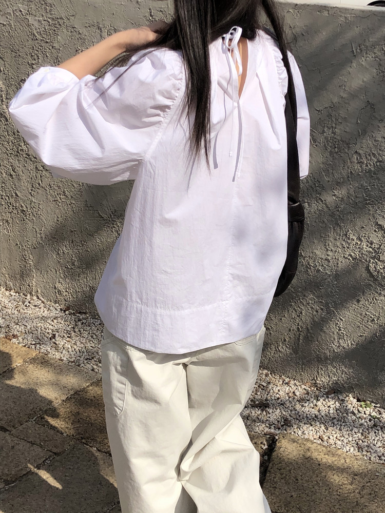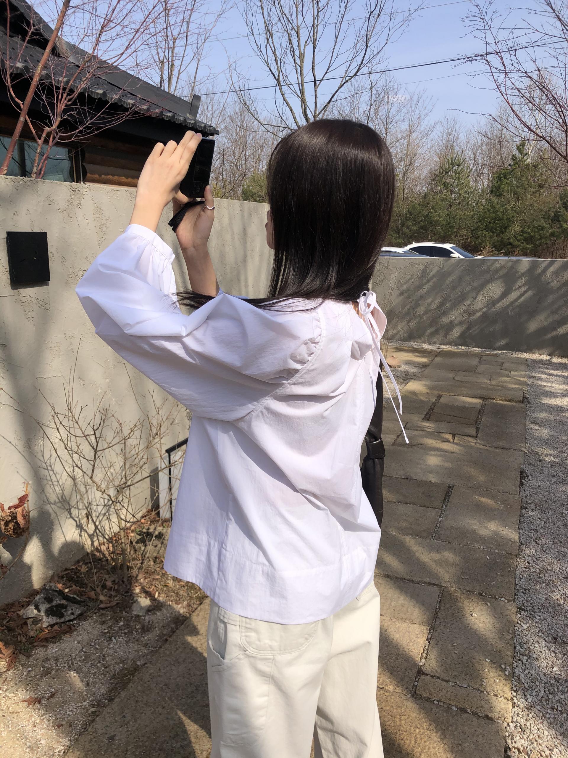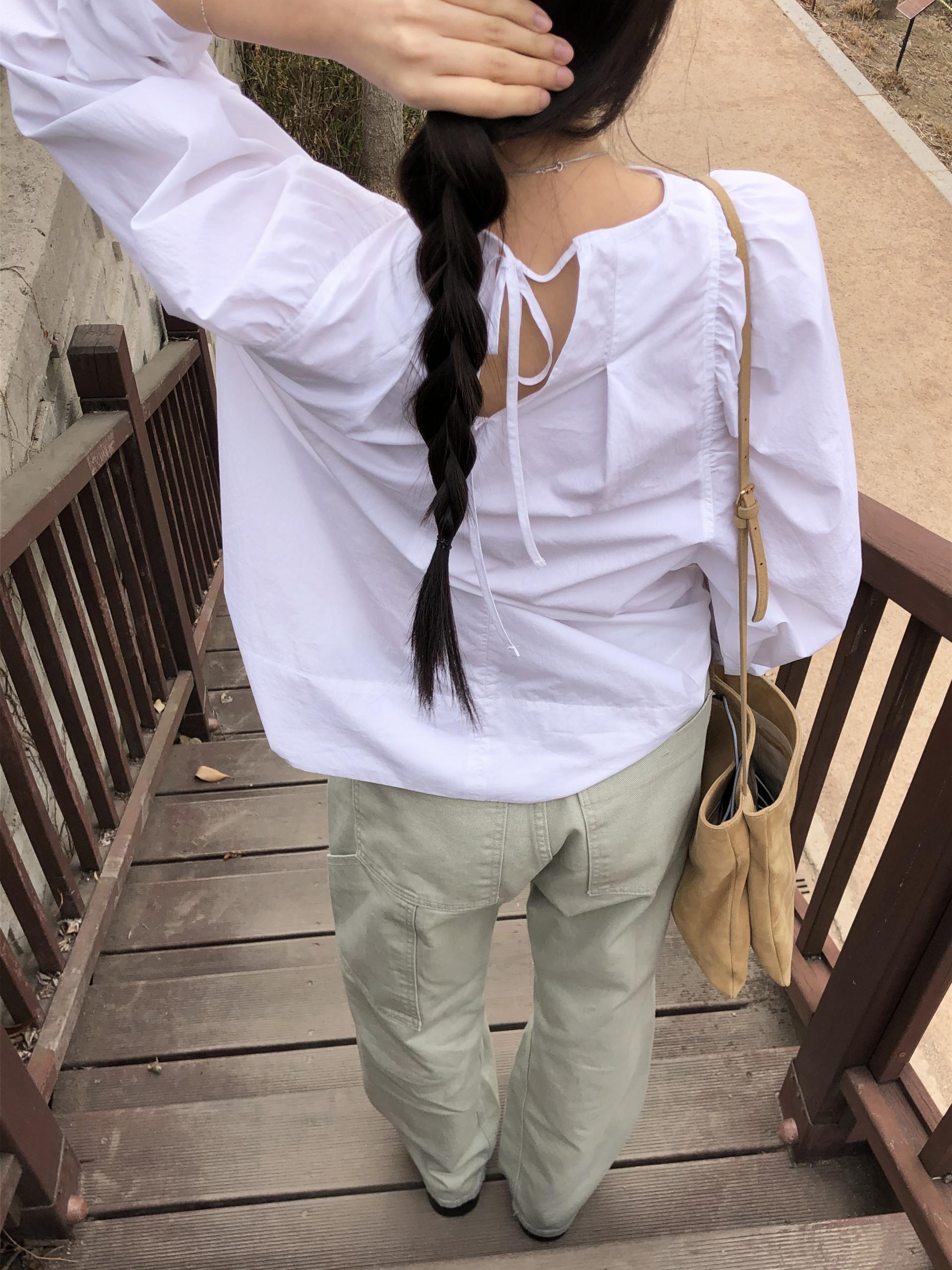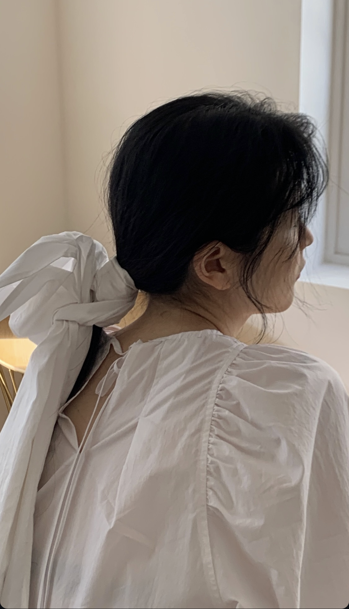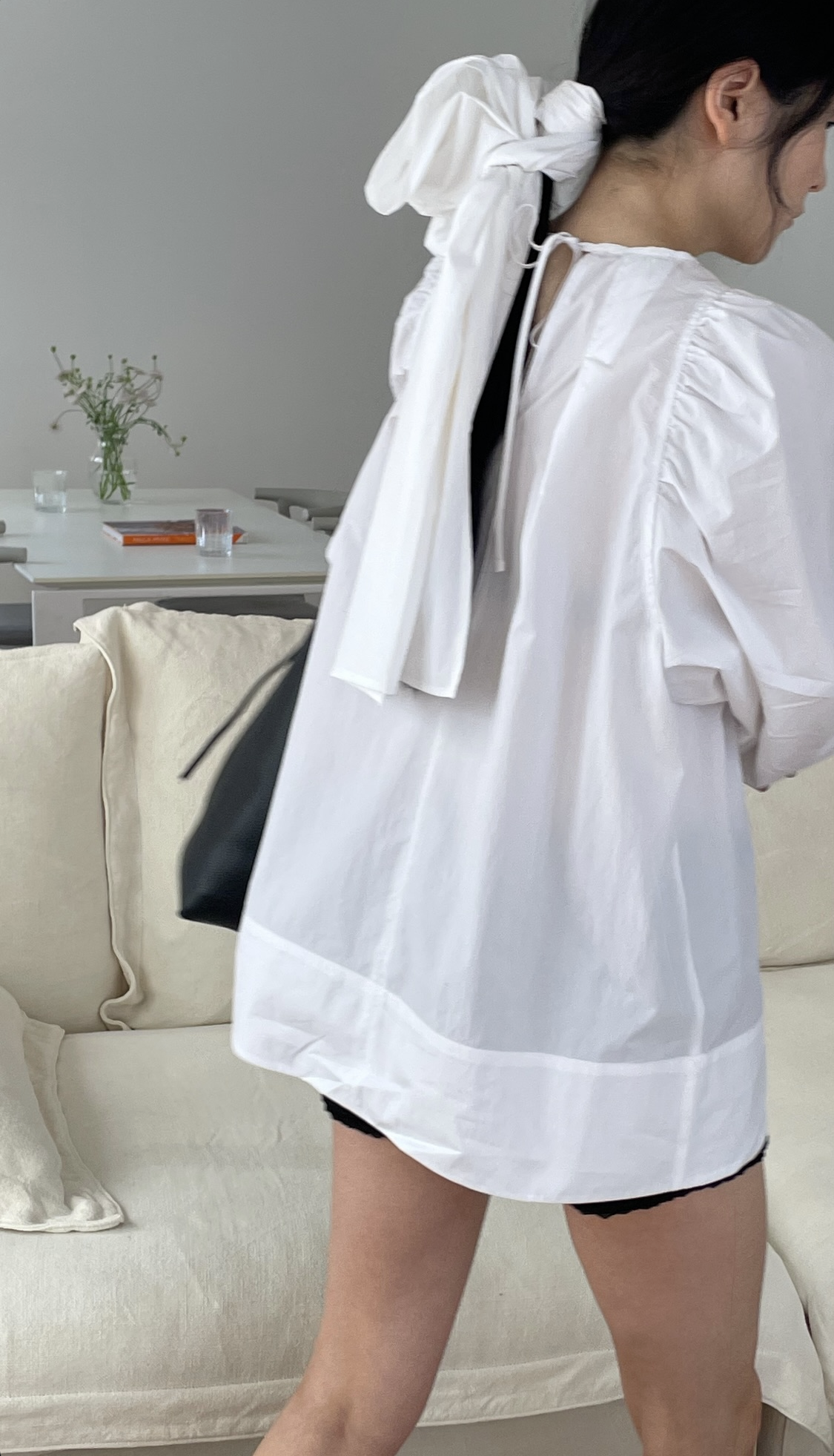 실루엣 자체가 풍성하기 때문에 짧은 팬츠와 깔끔하게 연출해도, 데님에 툭 입어줘도 신경 쓴 티가 나요. 뒤를 묶는 리본 디테일 덕분에 뒷모습까지 예쁩니다.