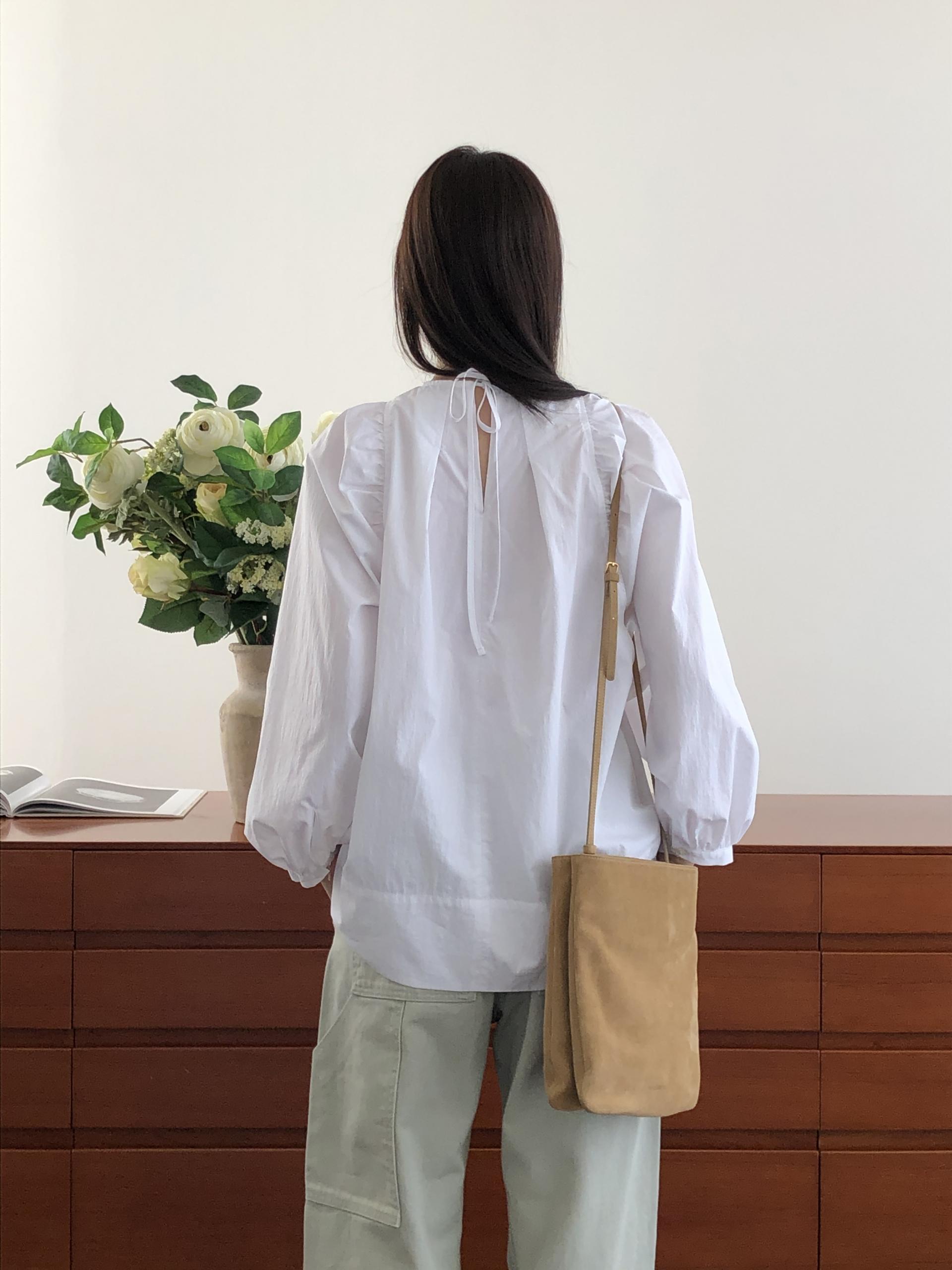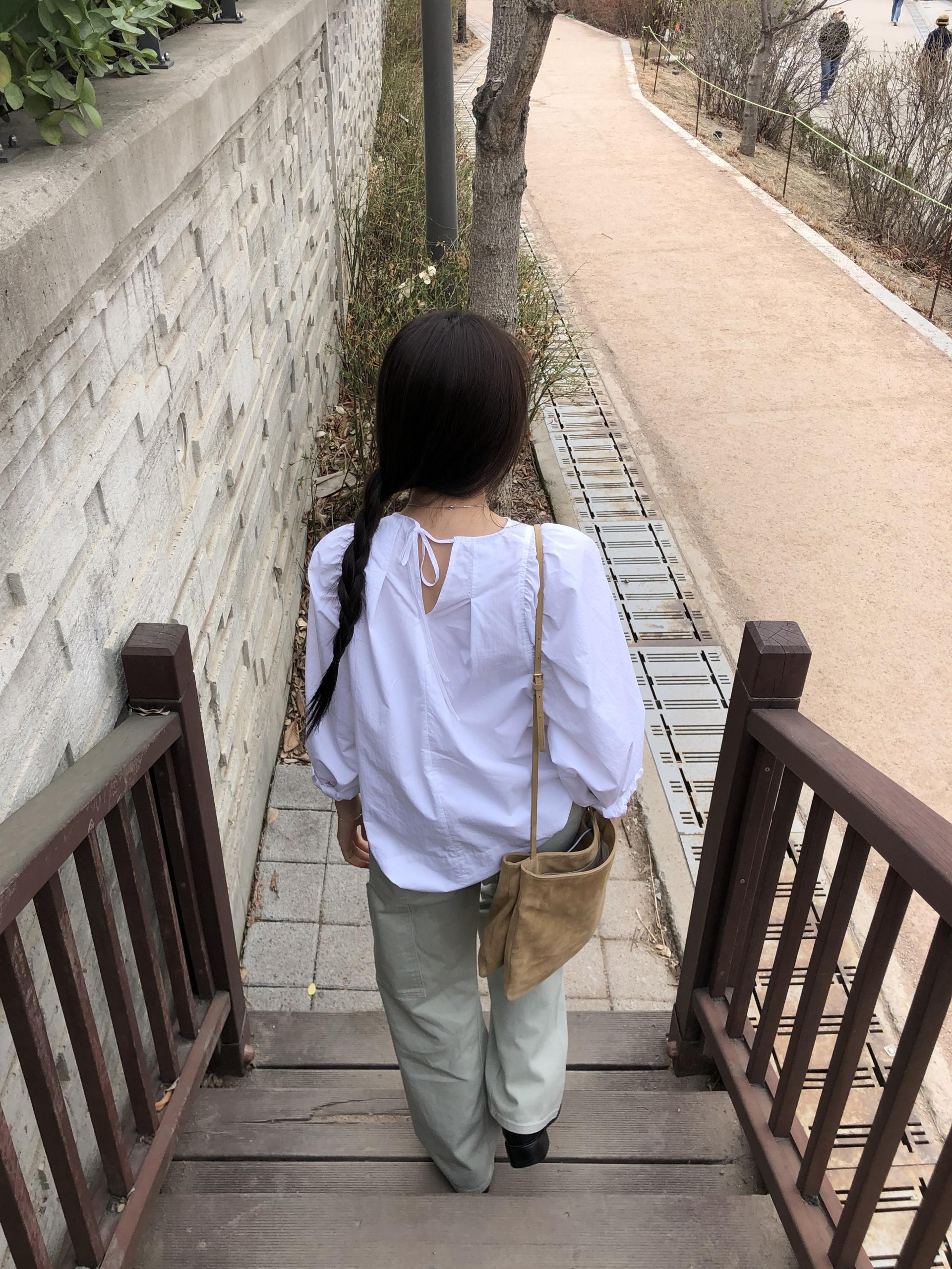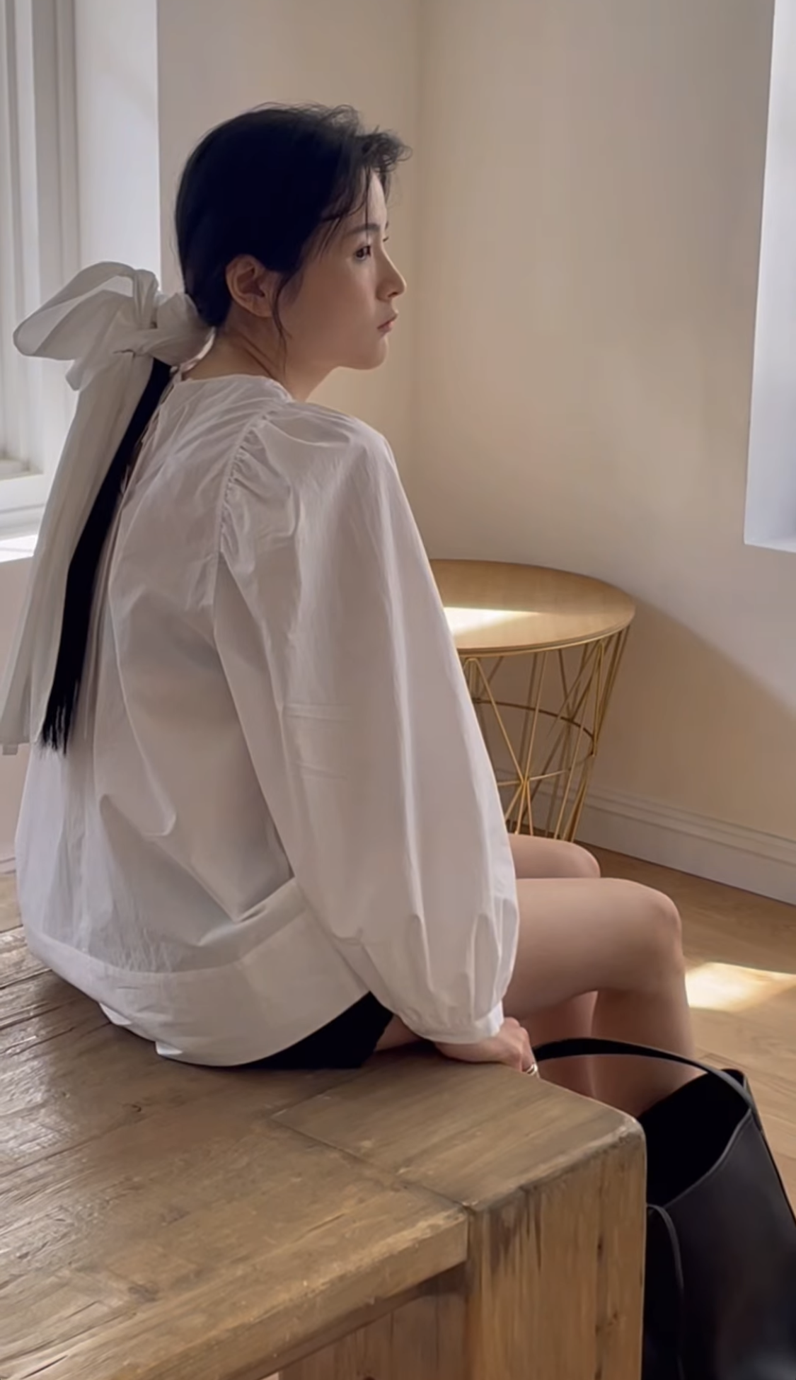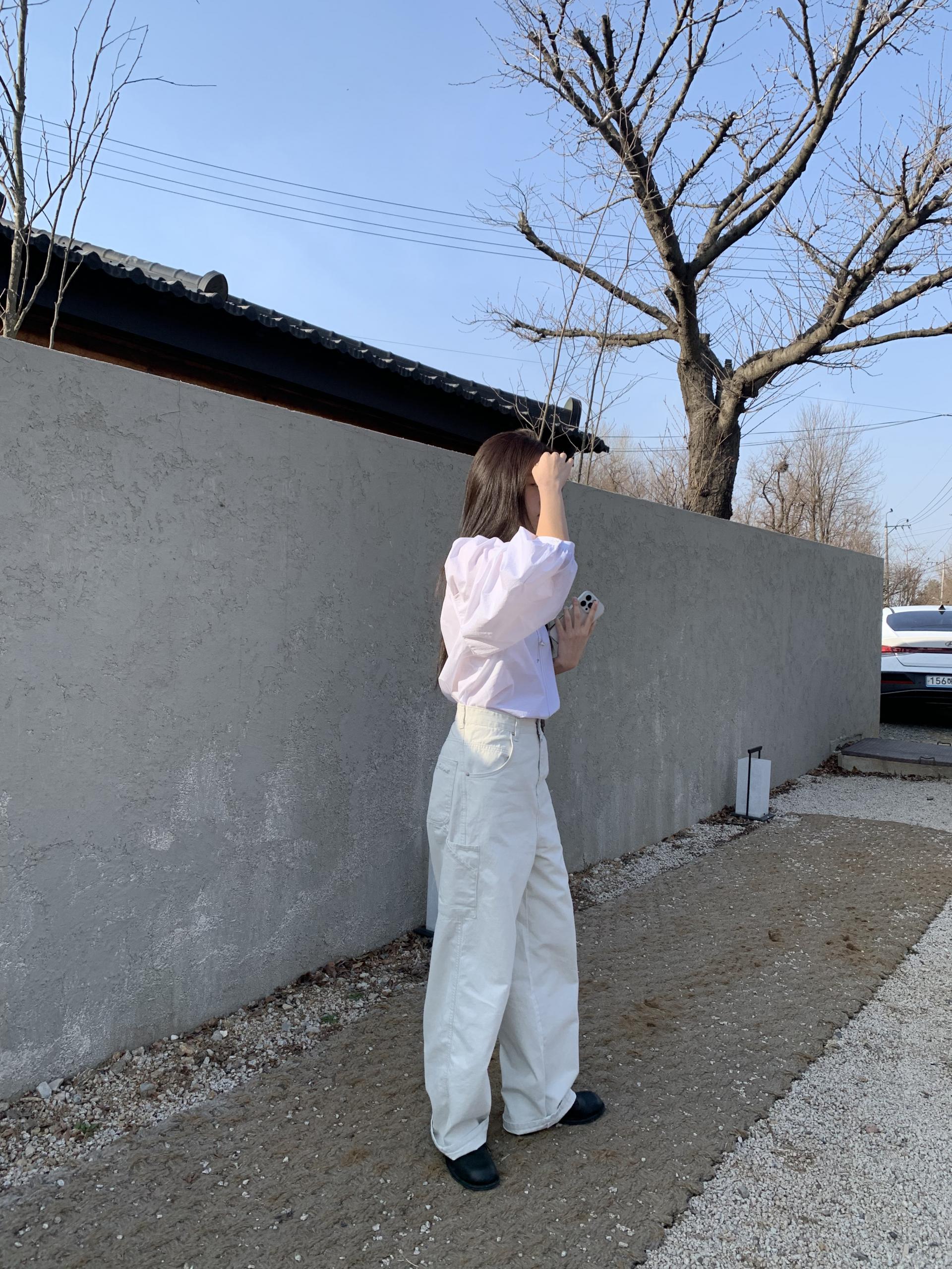 실루엣 자체가 풍성하기 때문에 짧은 팬츠와 깔끔하게 연출해도, 데님에 툭 입어줘도 신경 쓴 티가 나요. 뒤를 묶는 리본 디테일 덕분에 뒷모습까지 예쁩니다.