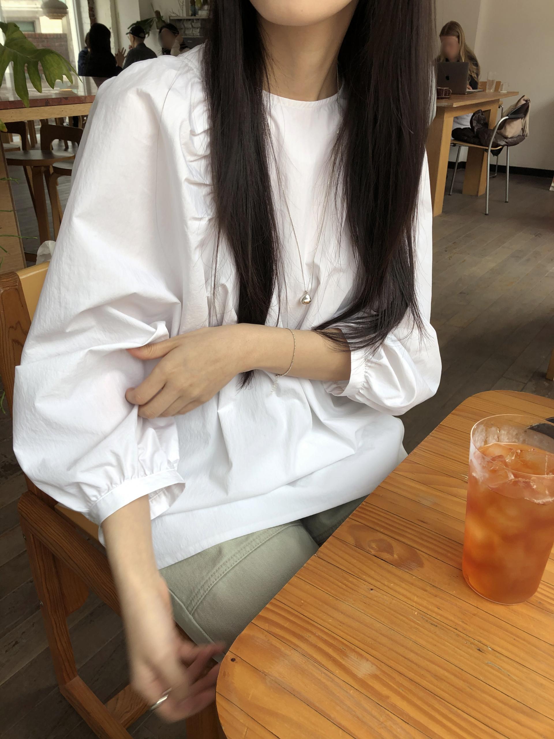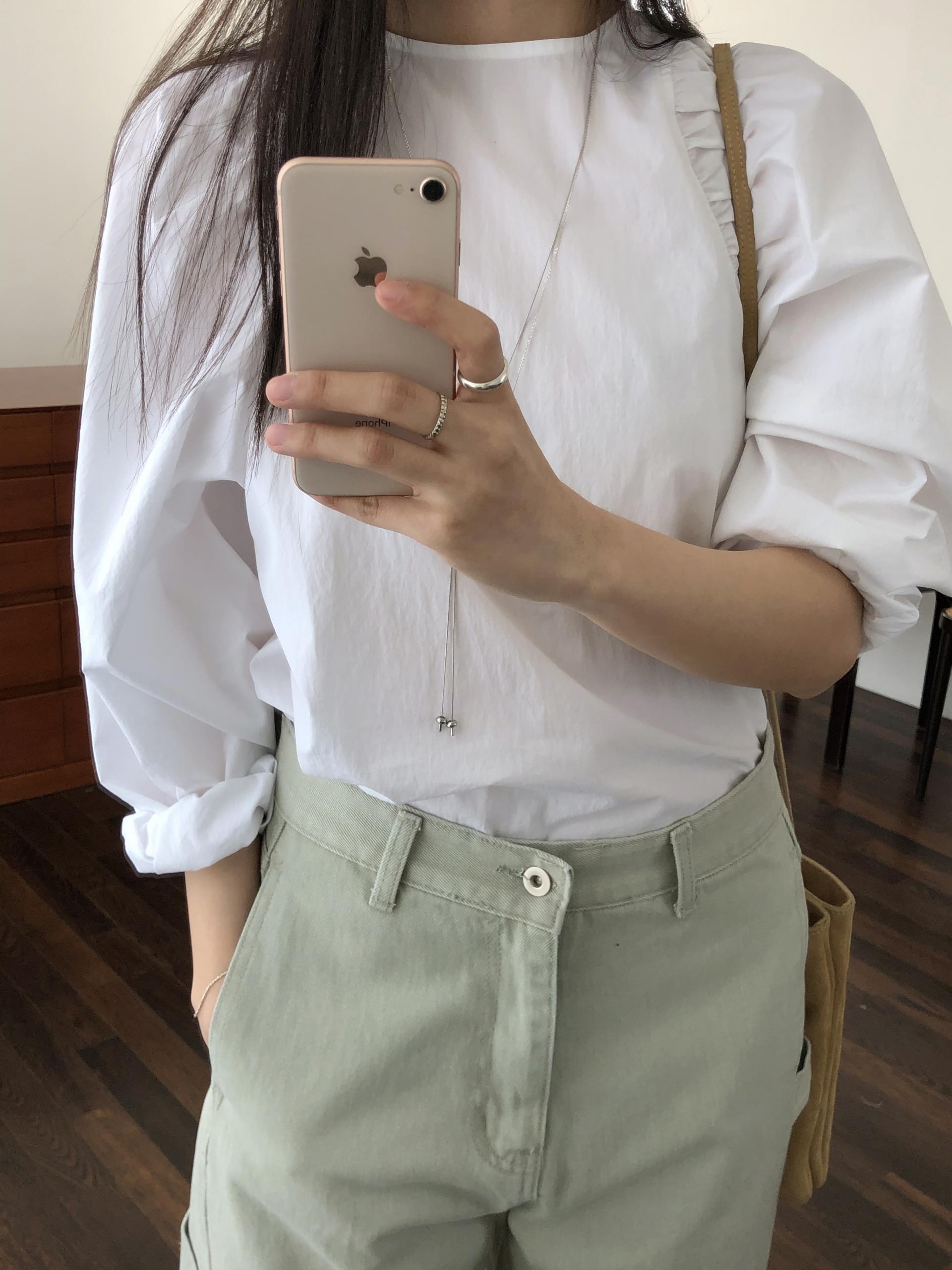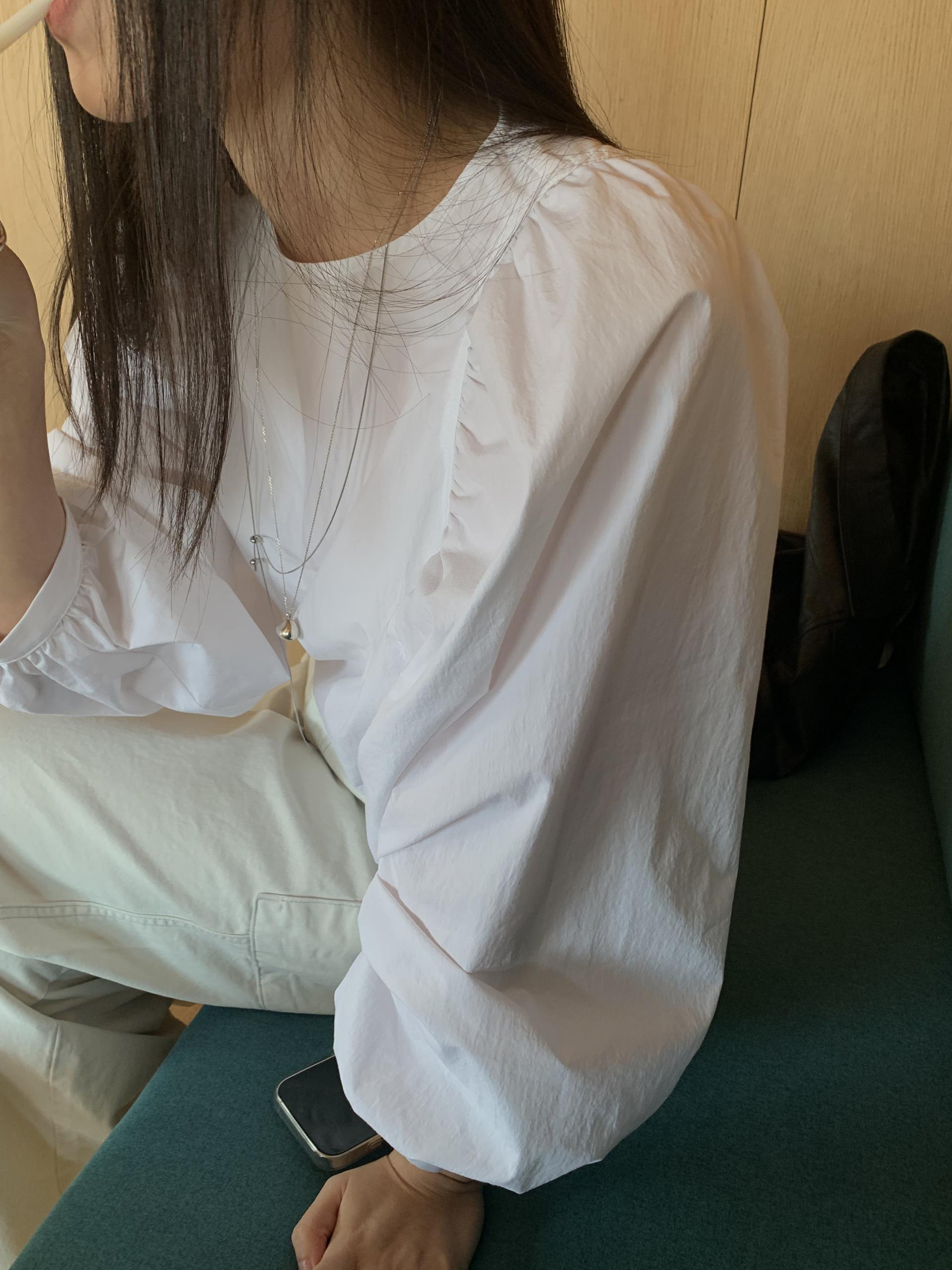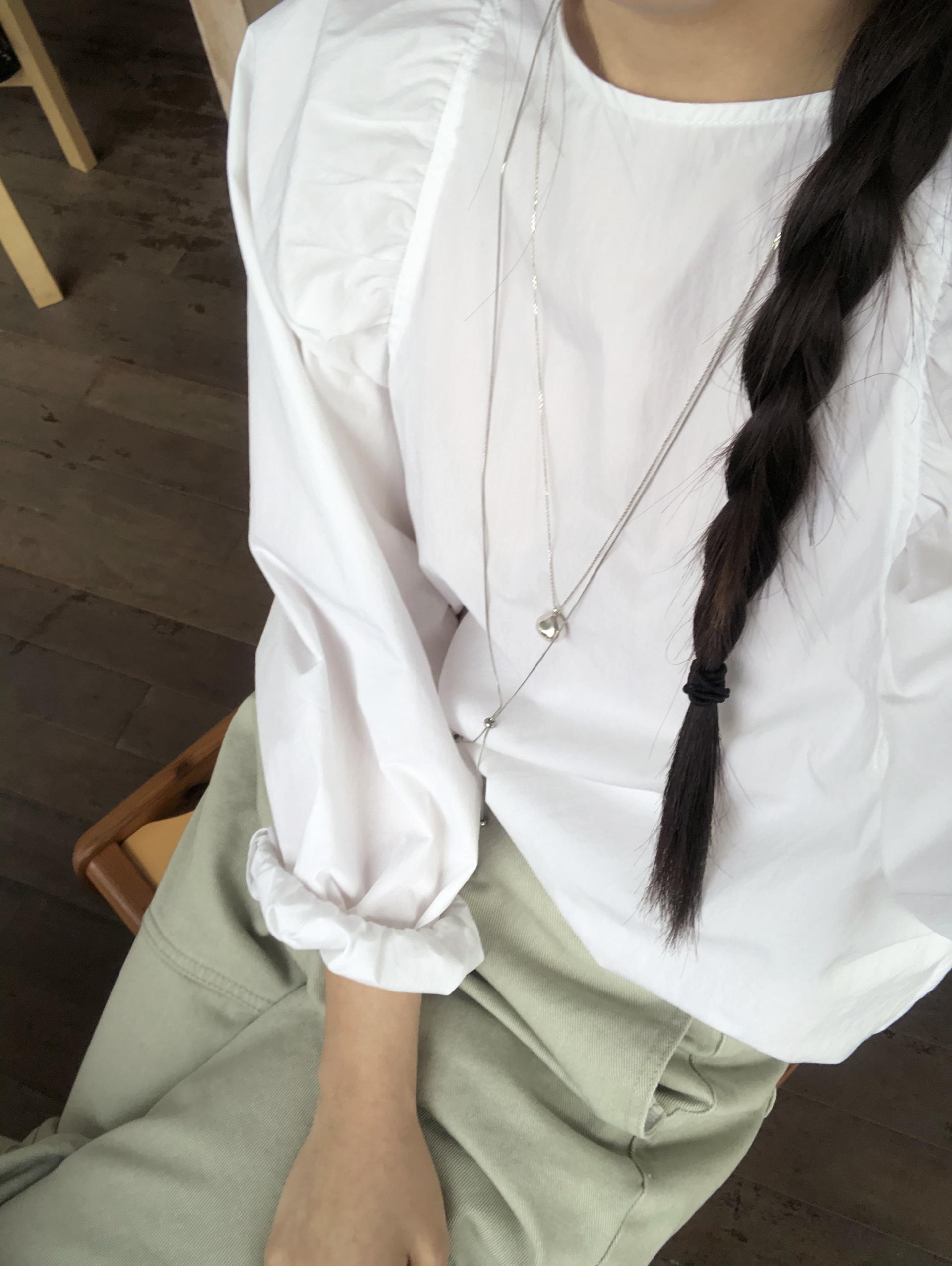 잔잔한 셔링과 봉긋한 퍼프 소매가 눈에 띄는 러브 볼륨 블라우스입니다.