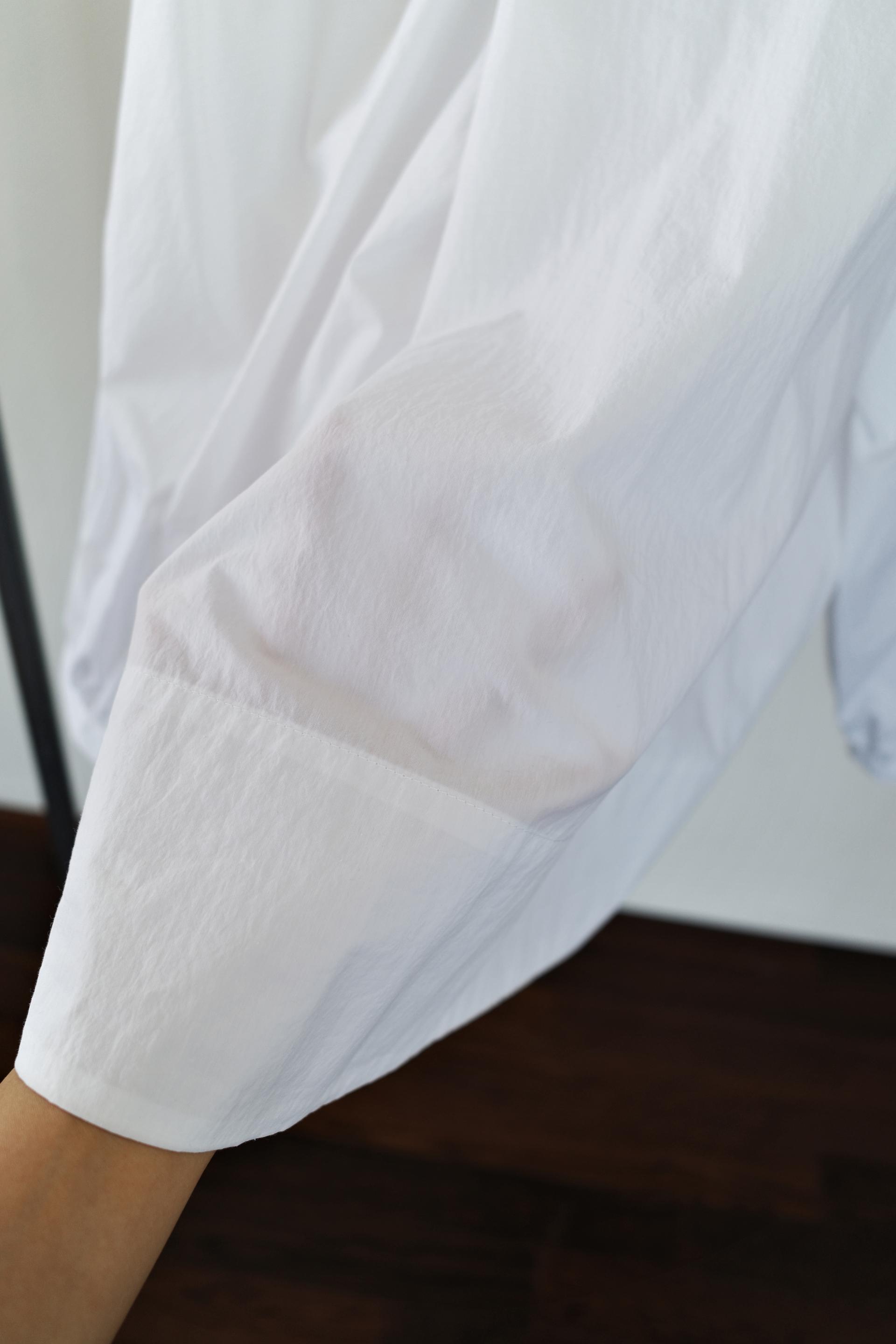 암홀이 안쪽으로 깊게 들어온 디자인이 독특하게 다가옵니다. 암홀이 안쪽으로 들어와 있지만 넓고 깊어 전혀 불편하지 않고, 덕분에 볼륨감있는 소매 디자인이 더욱 돋보여요.