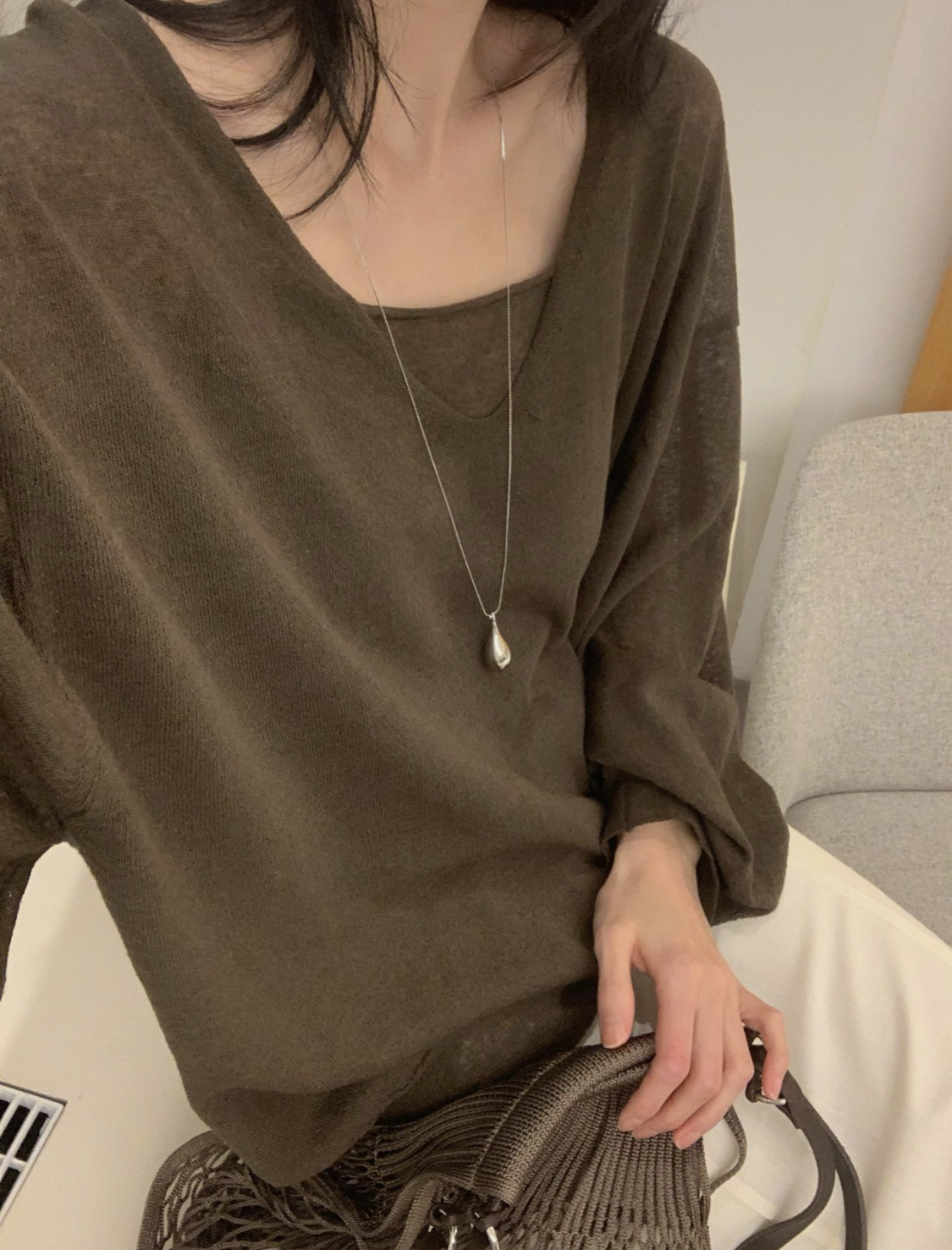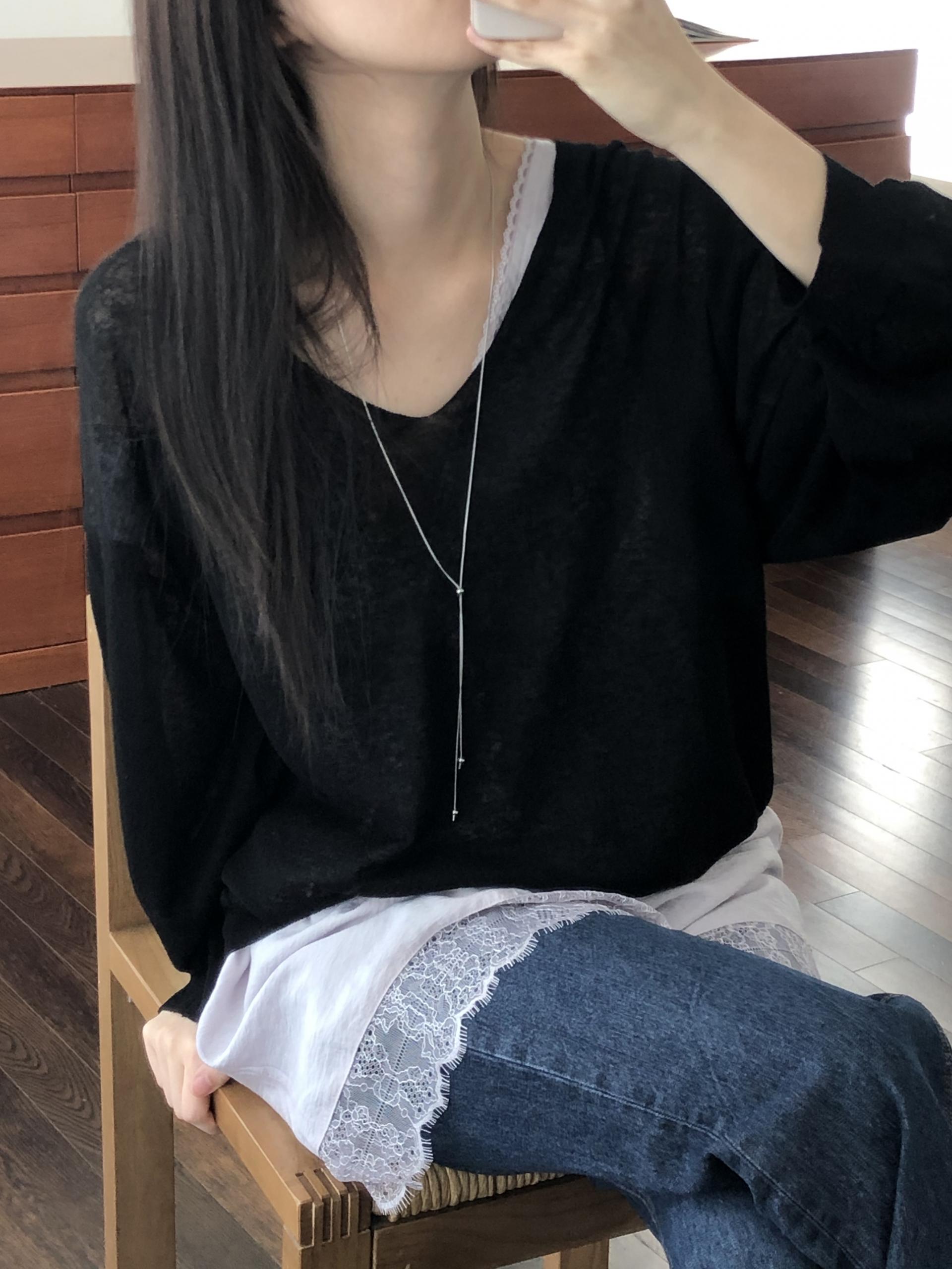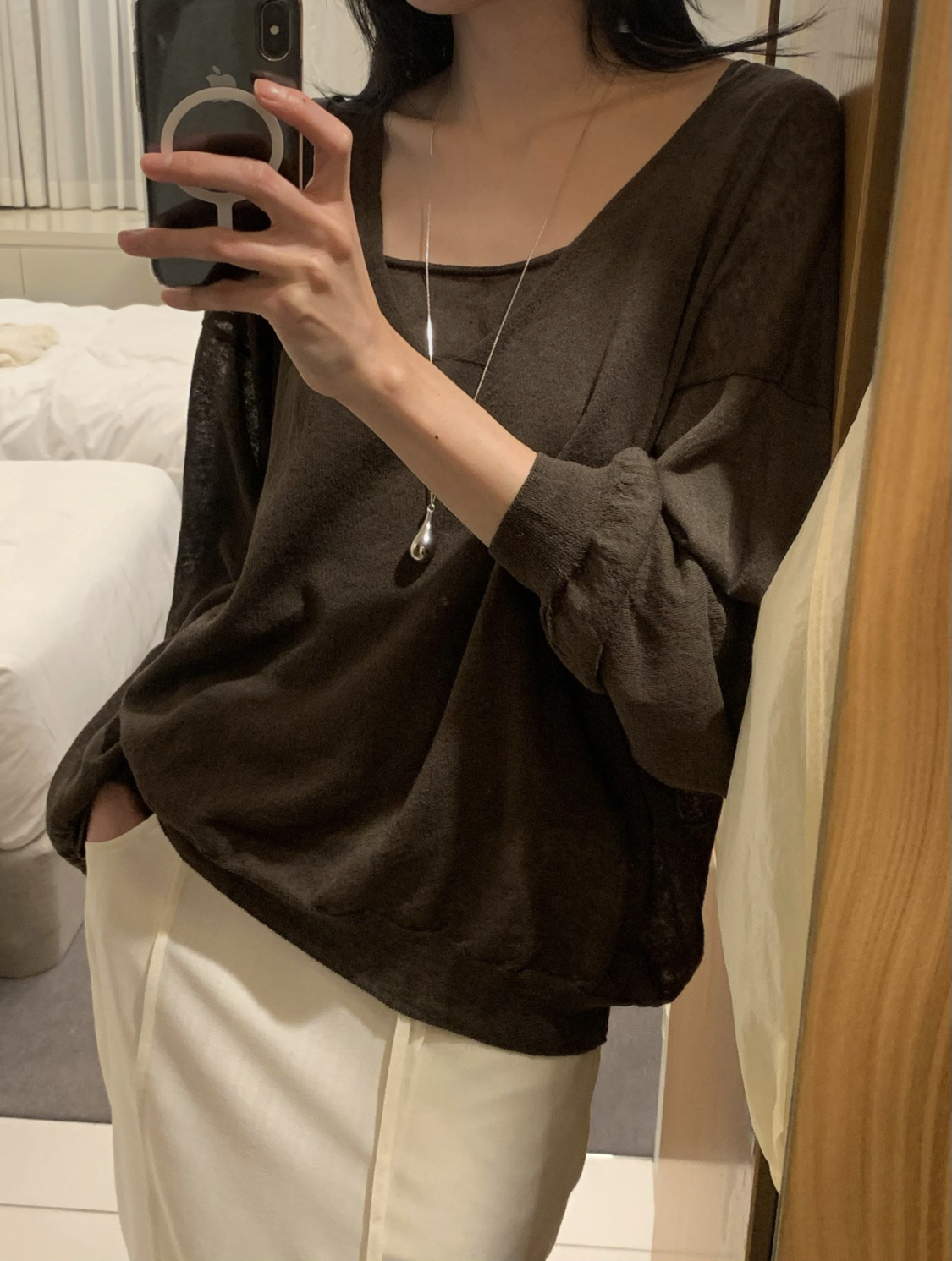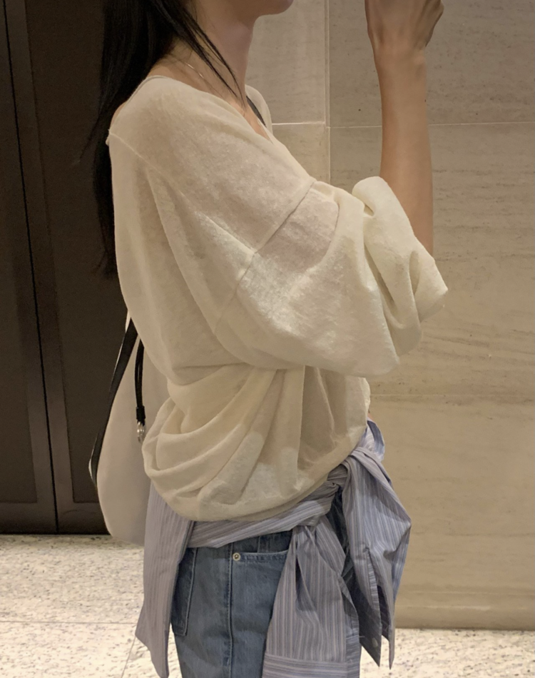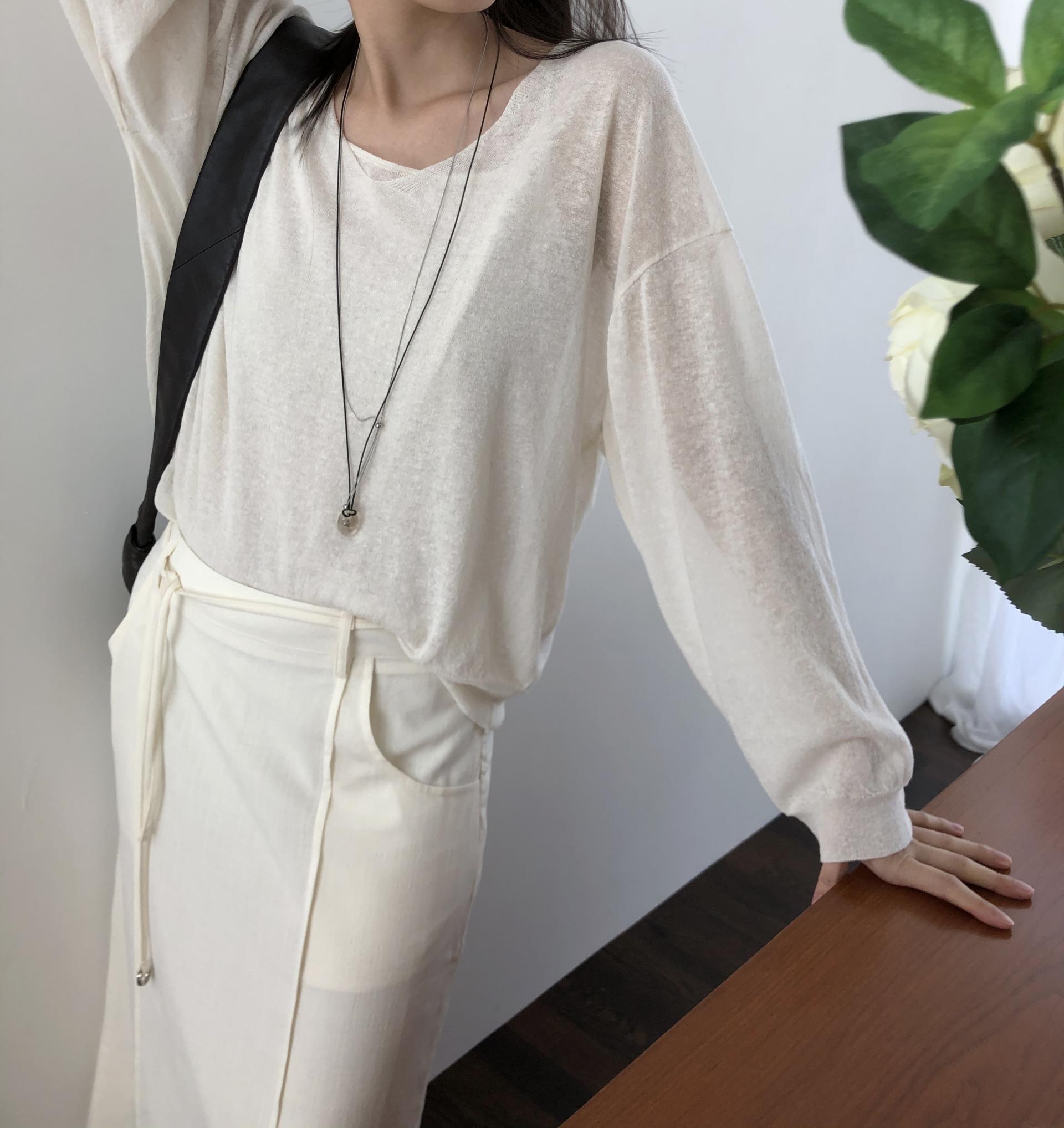 니트 / 어깨 63 가슴 61 암홀 27 소매기장 48 소매단면 10 밑단 40.5 총장 57