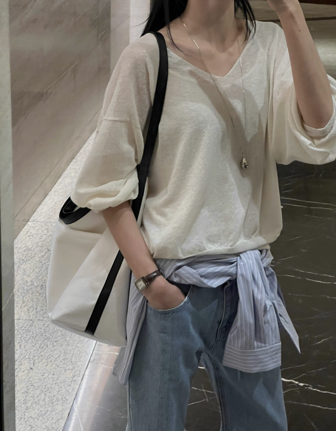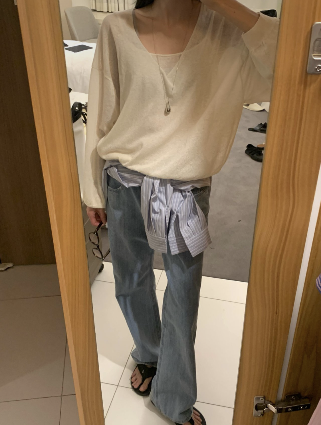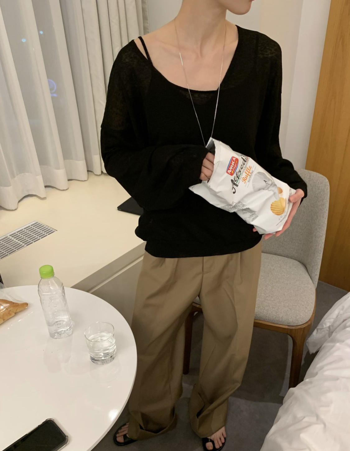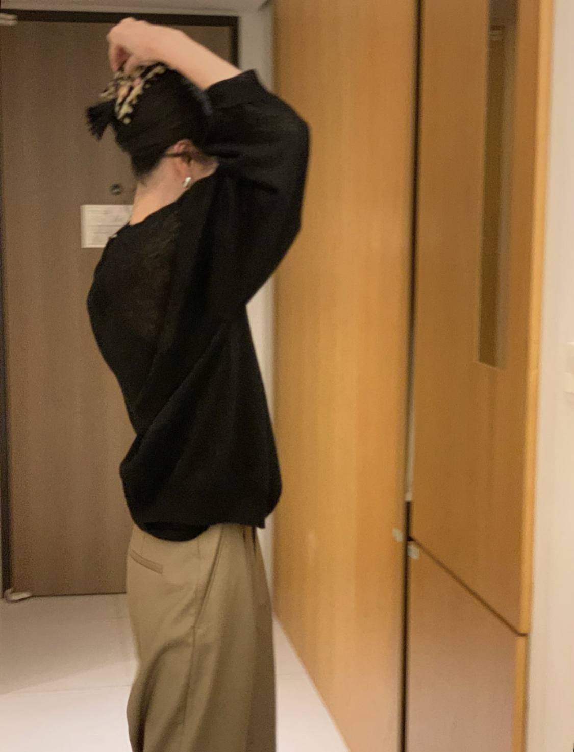 - 레깅스, 니트, 얇은 원단의 티 등 한번의 착용으로도 늘어남이 생기는 의류는 교환 및 반품이 불가합니다.