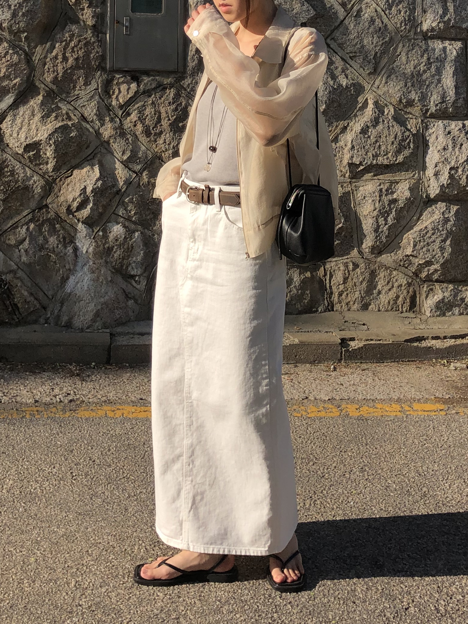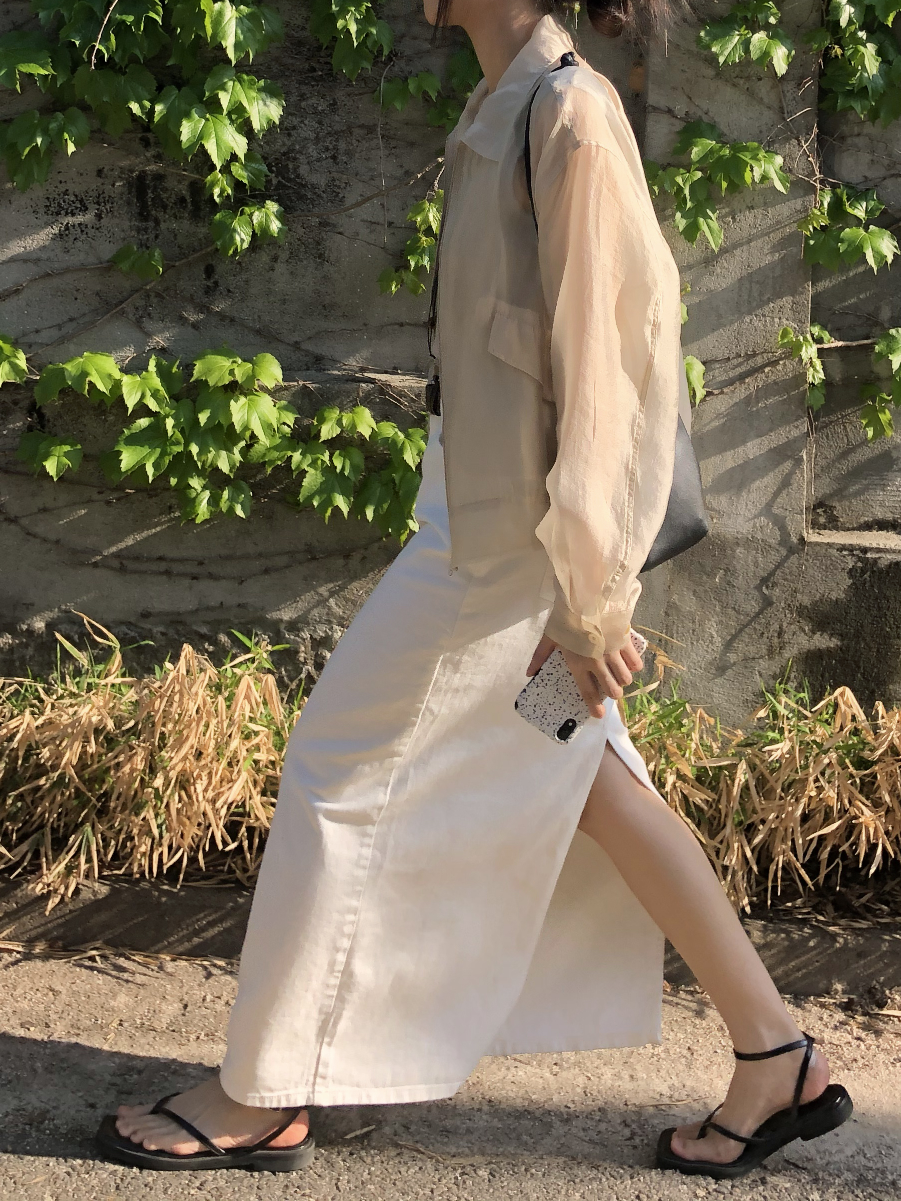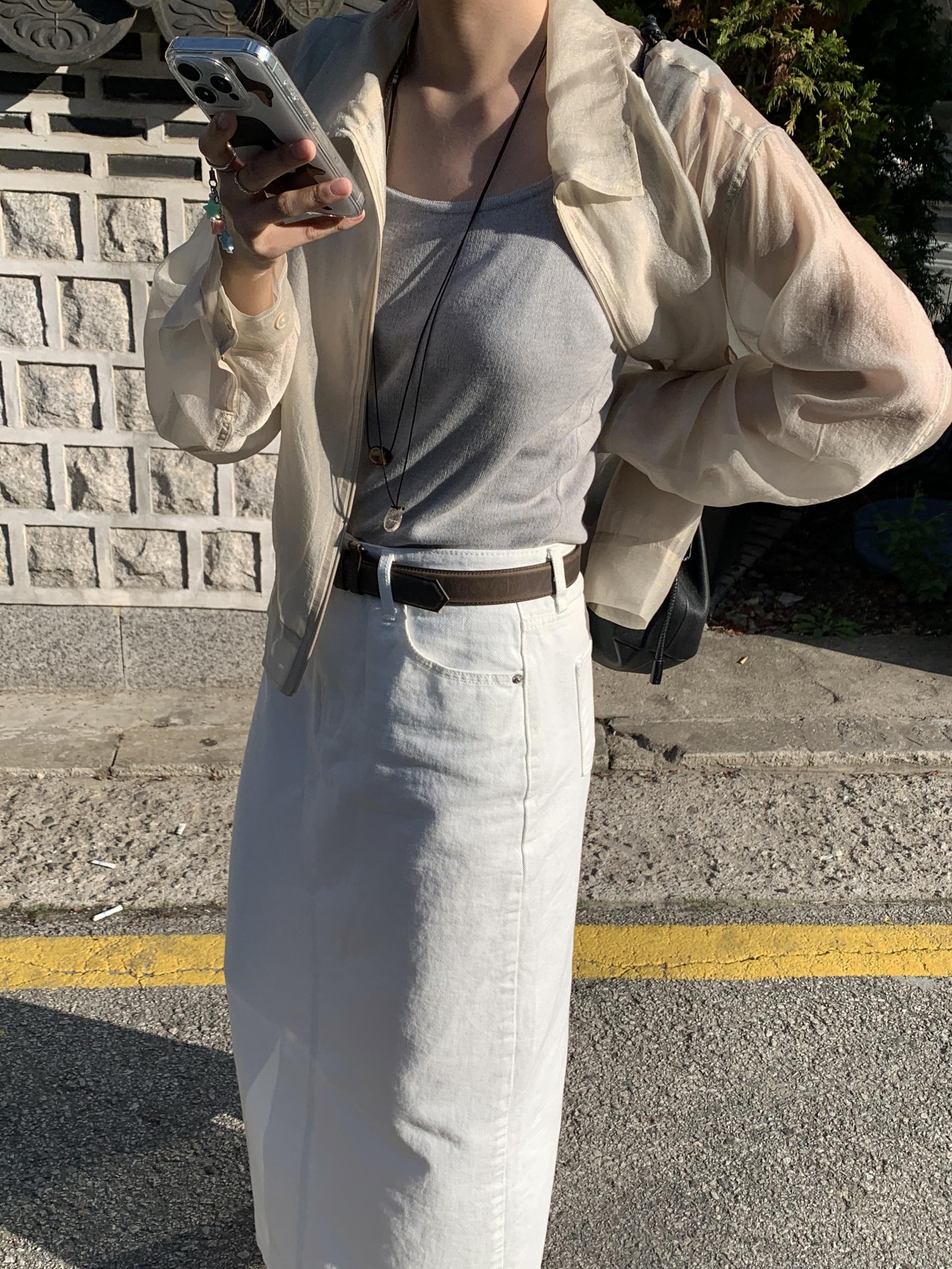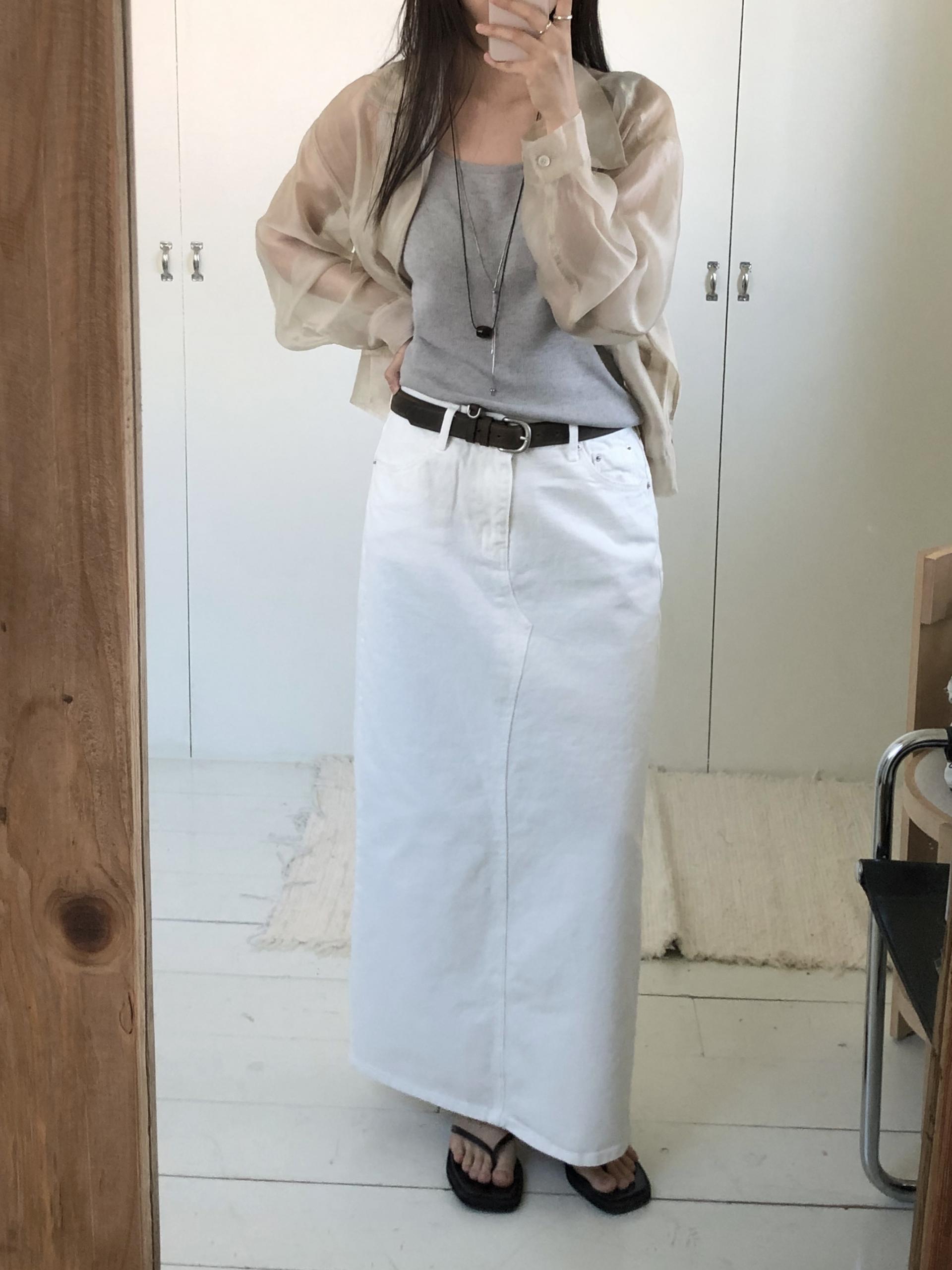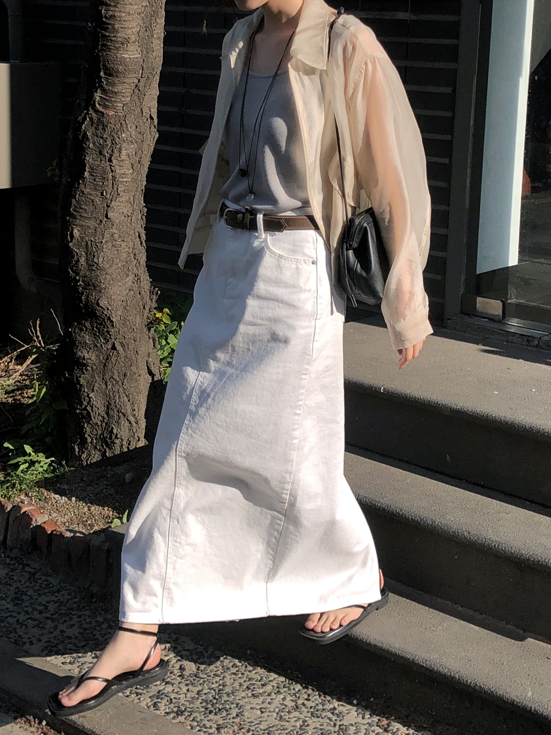깨끗한 아이보리 컬러라 맥시한 기장이어도 답답하게 느껴지지 않고, 오히려 룩을 더 시원한 이미지로 만들어줍니다.