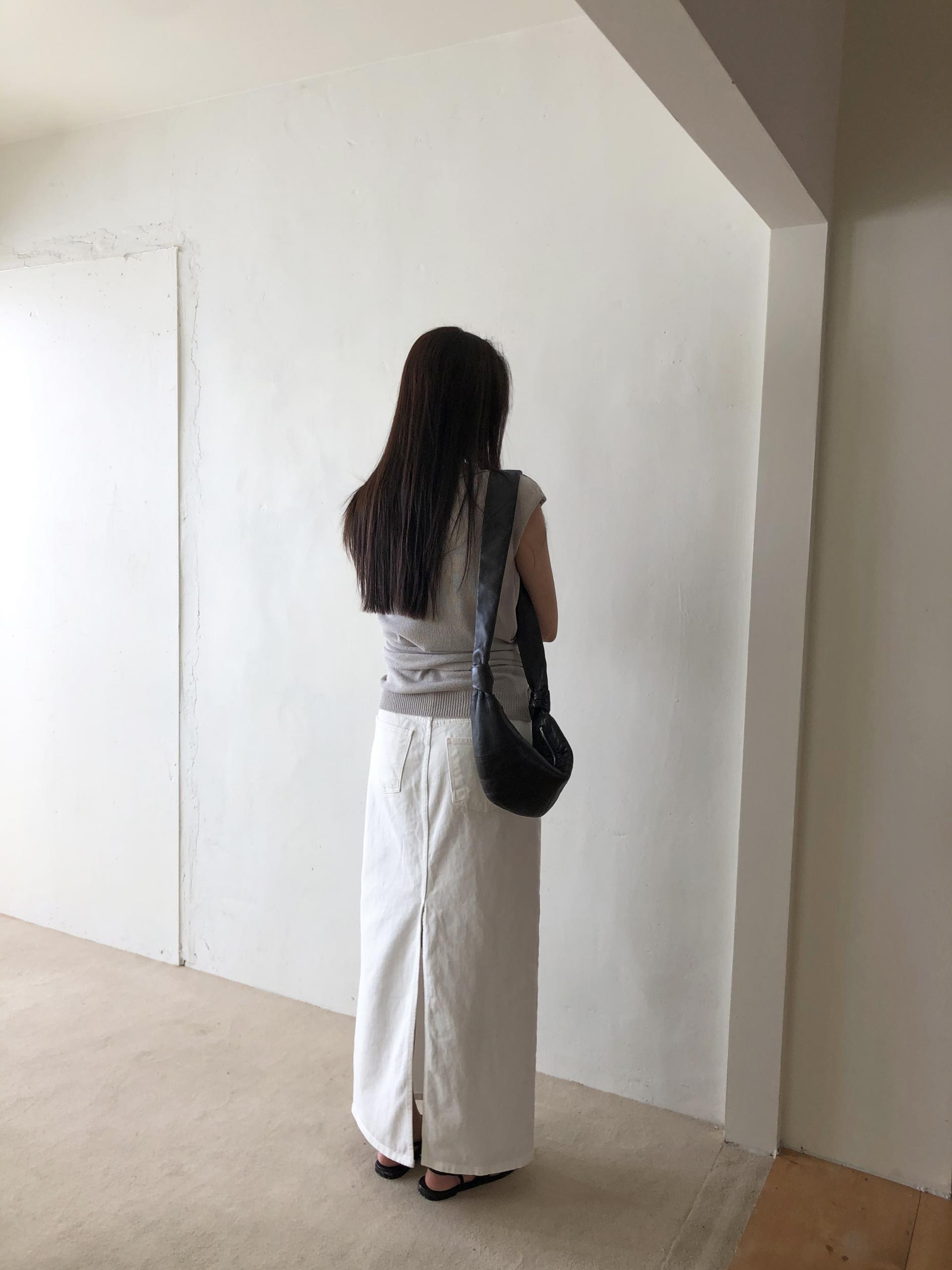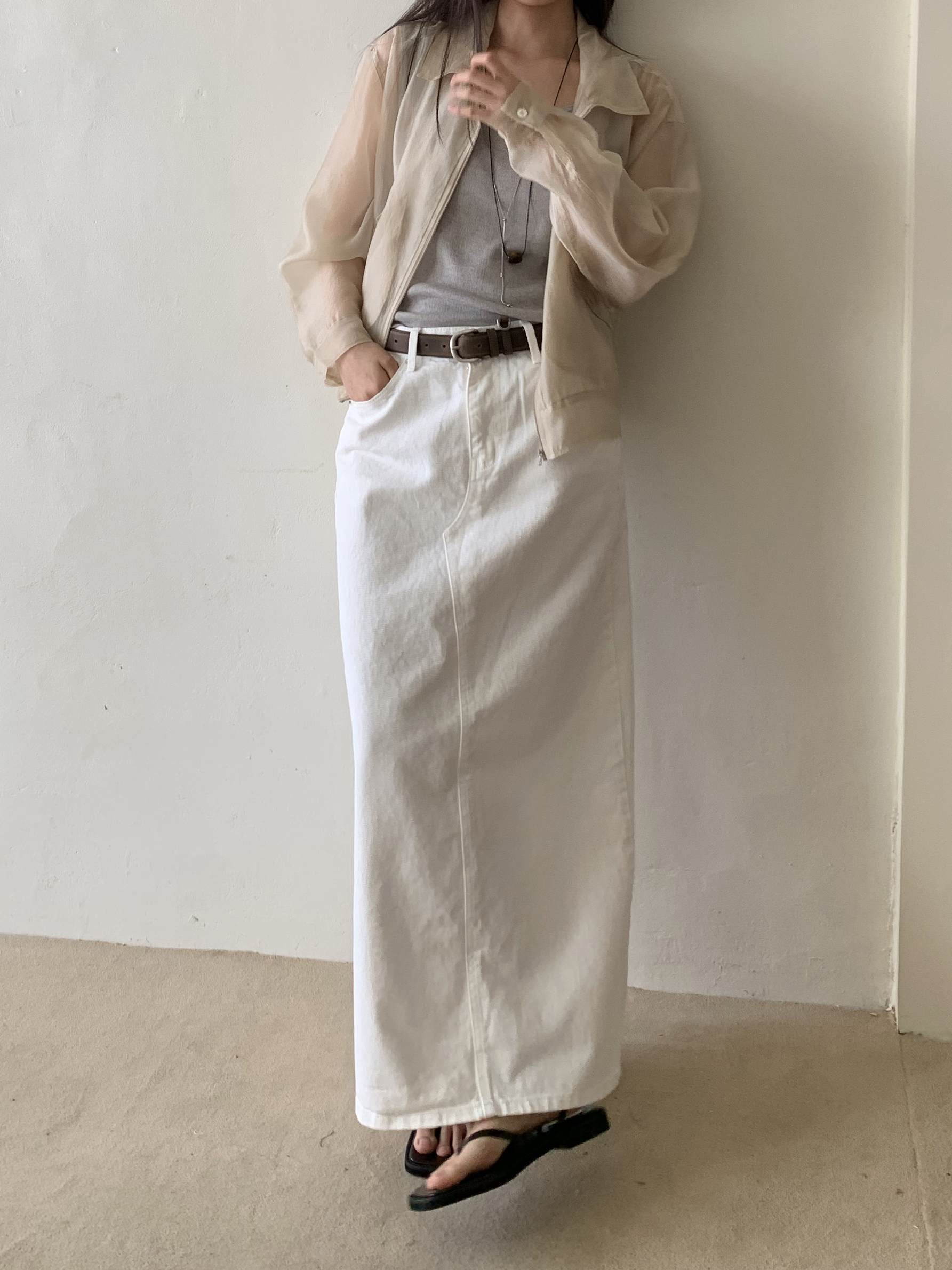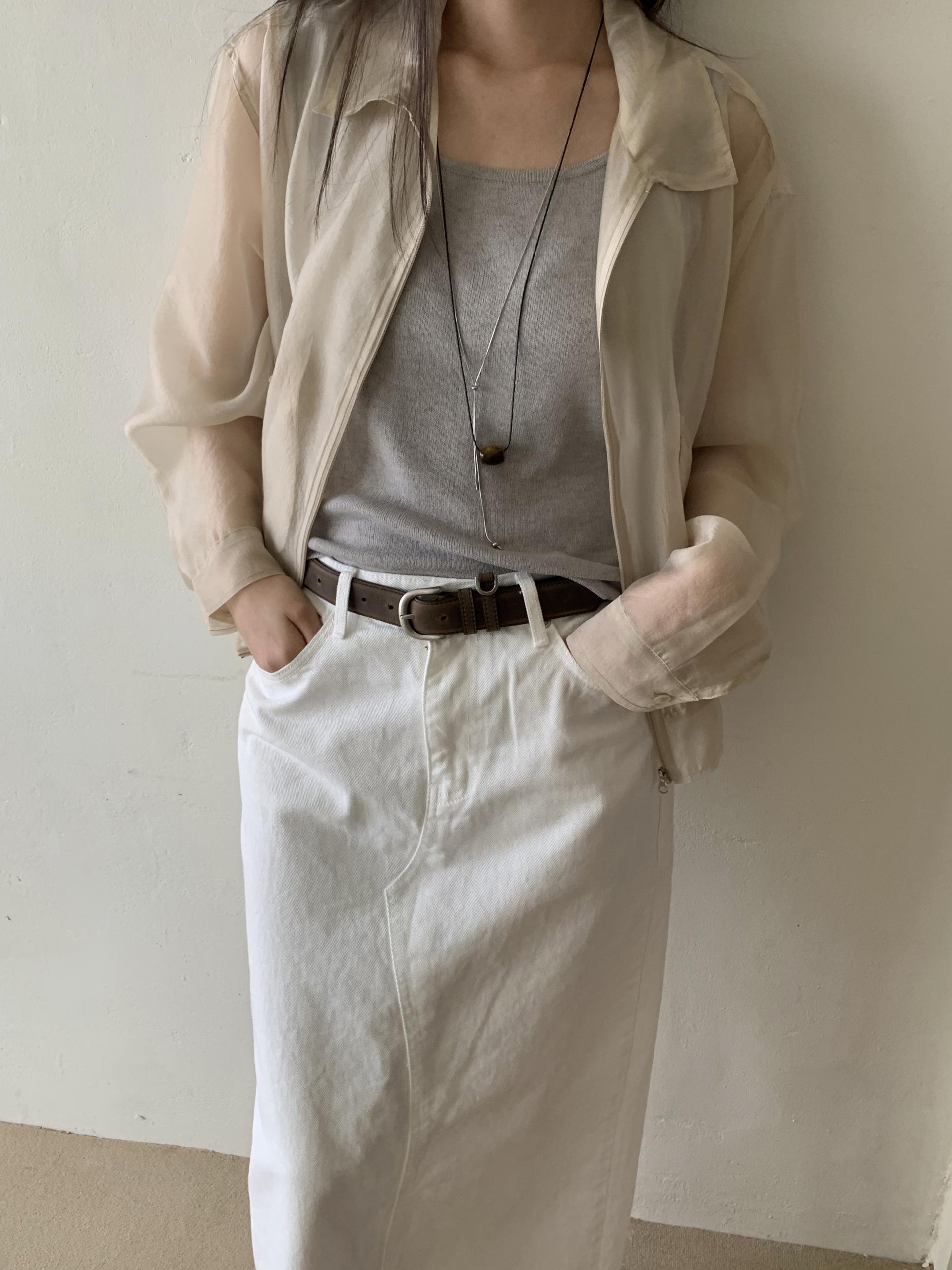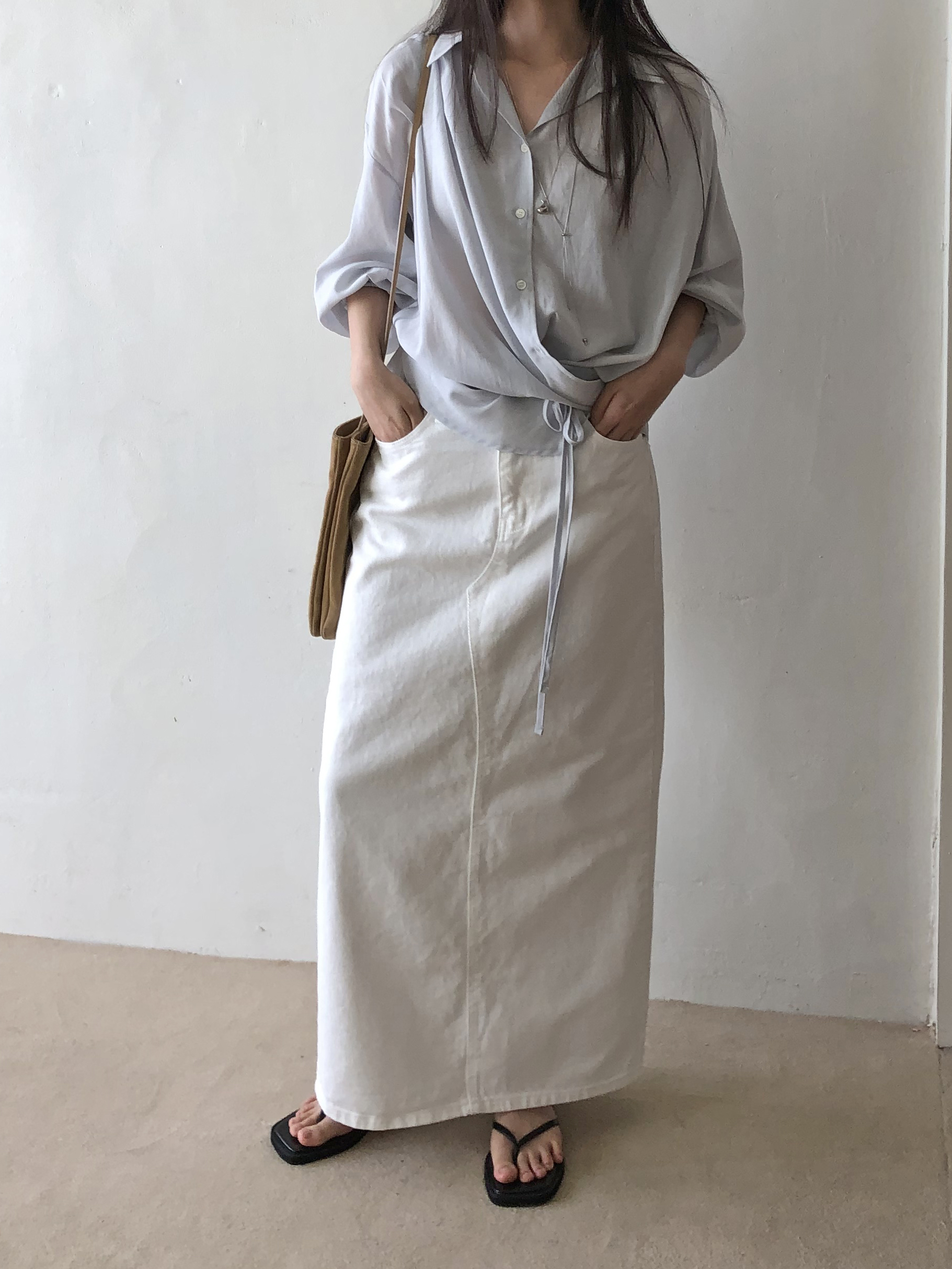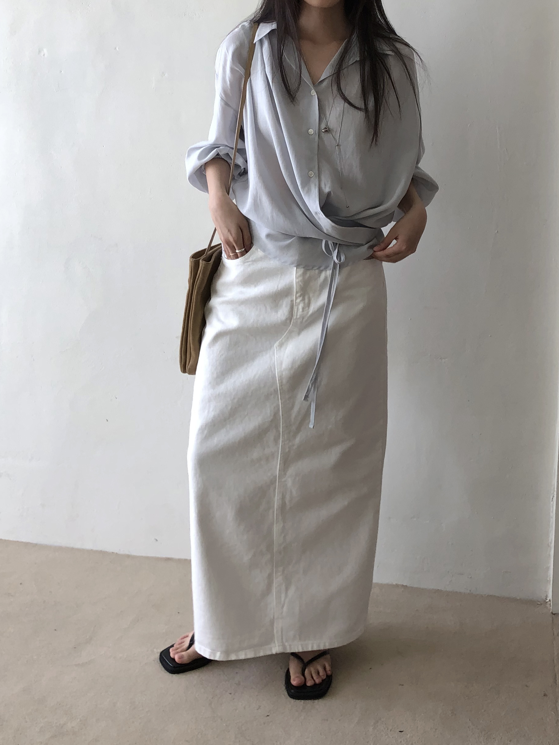 깨끗한 아이보리 컬러라 맥시한 기장이어도 답답하게 느껴지지 않고, 오히려 룩을 더 시원한 이미지로 만들어줍니다.