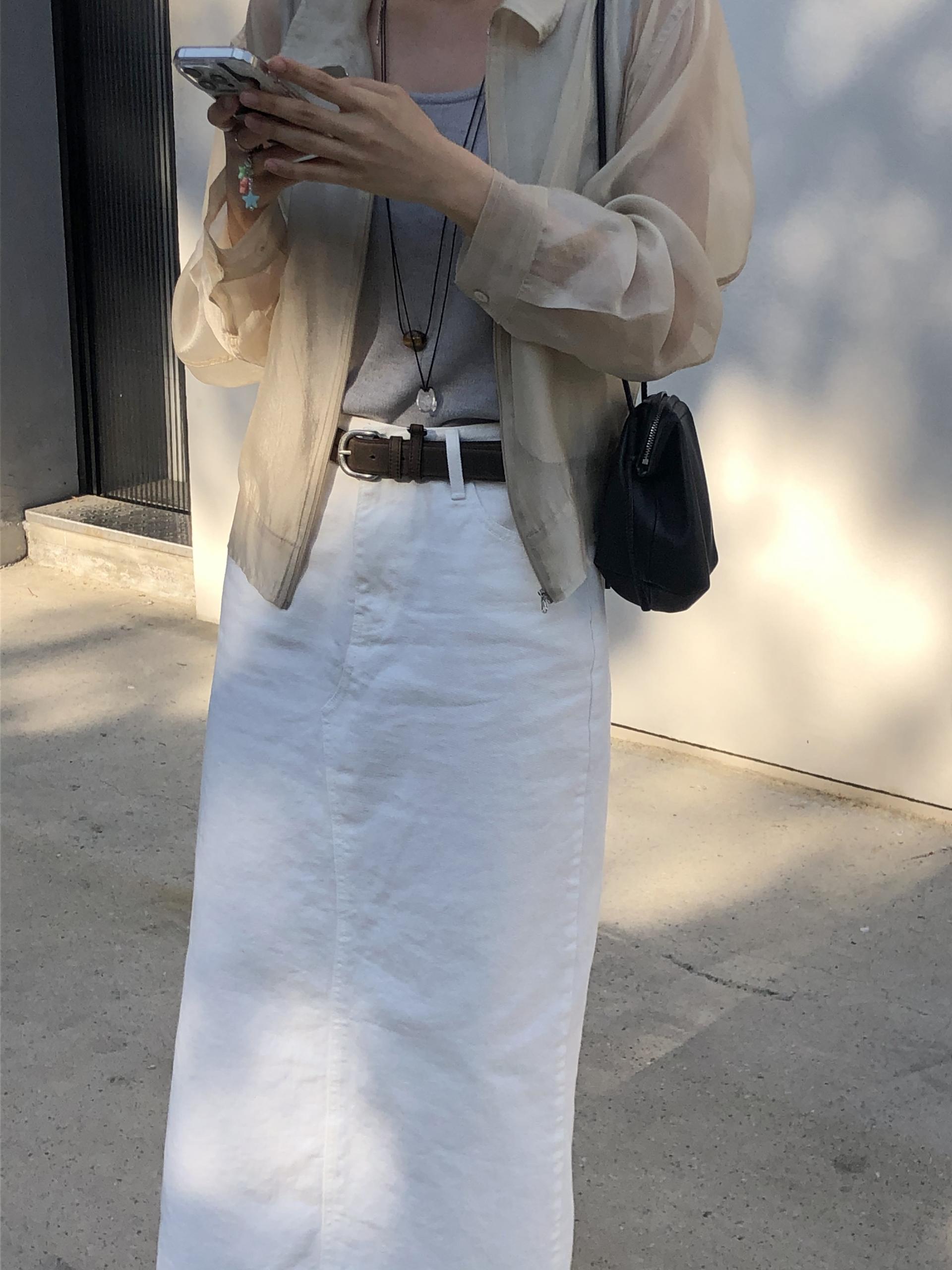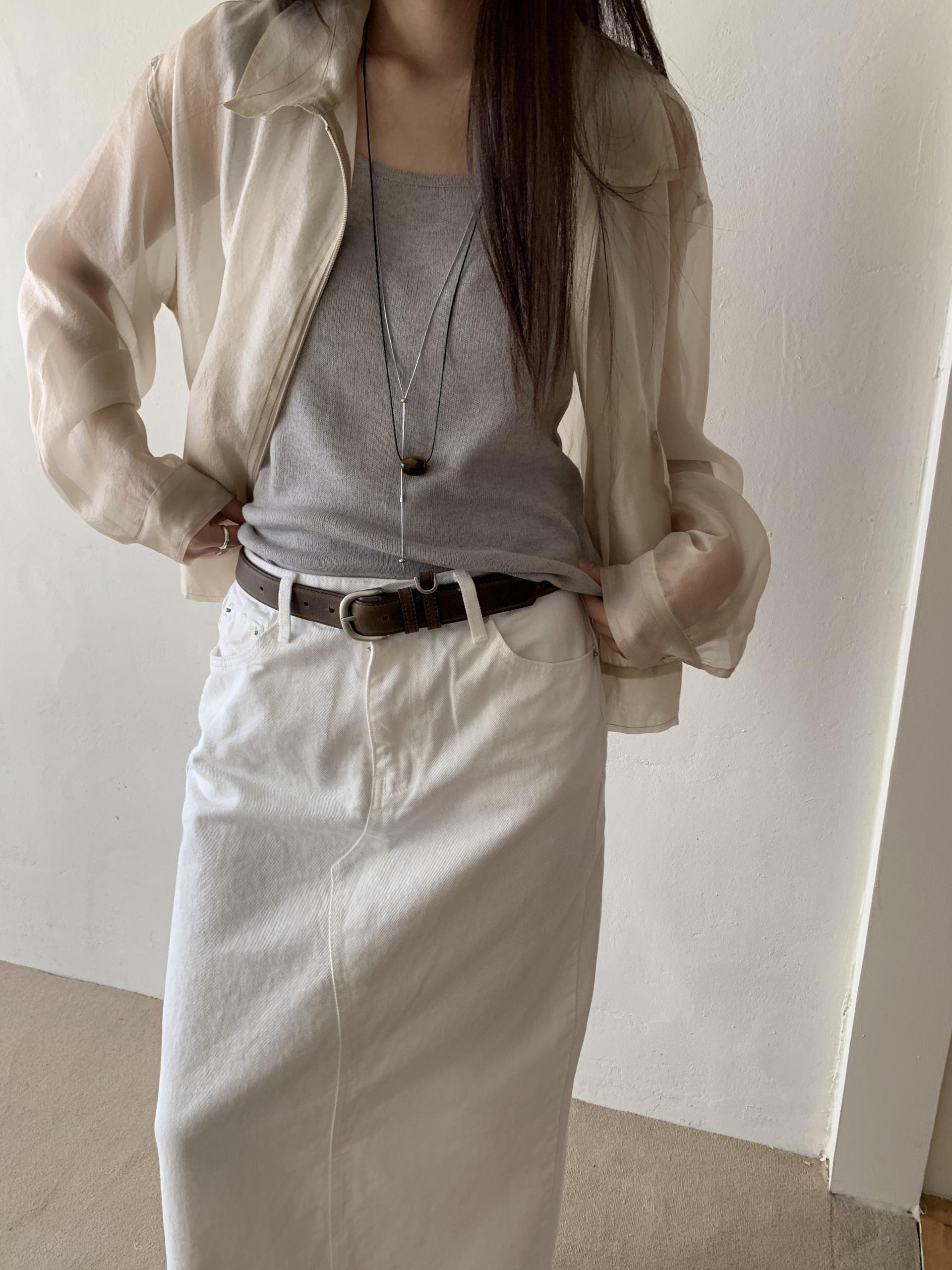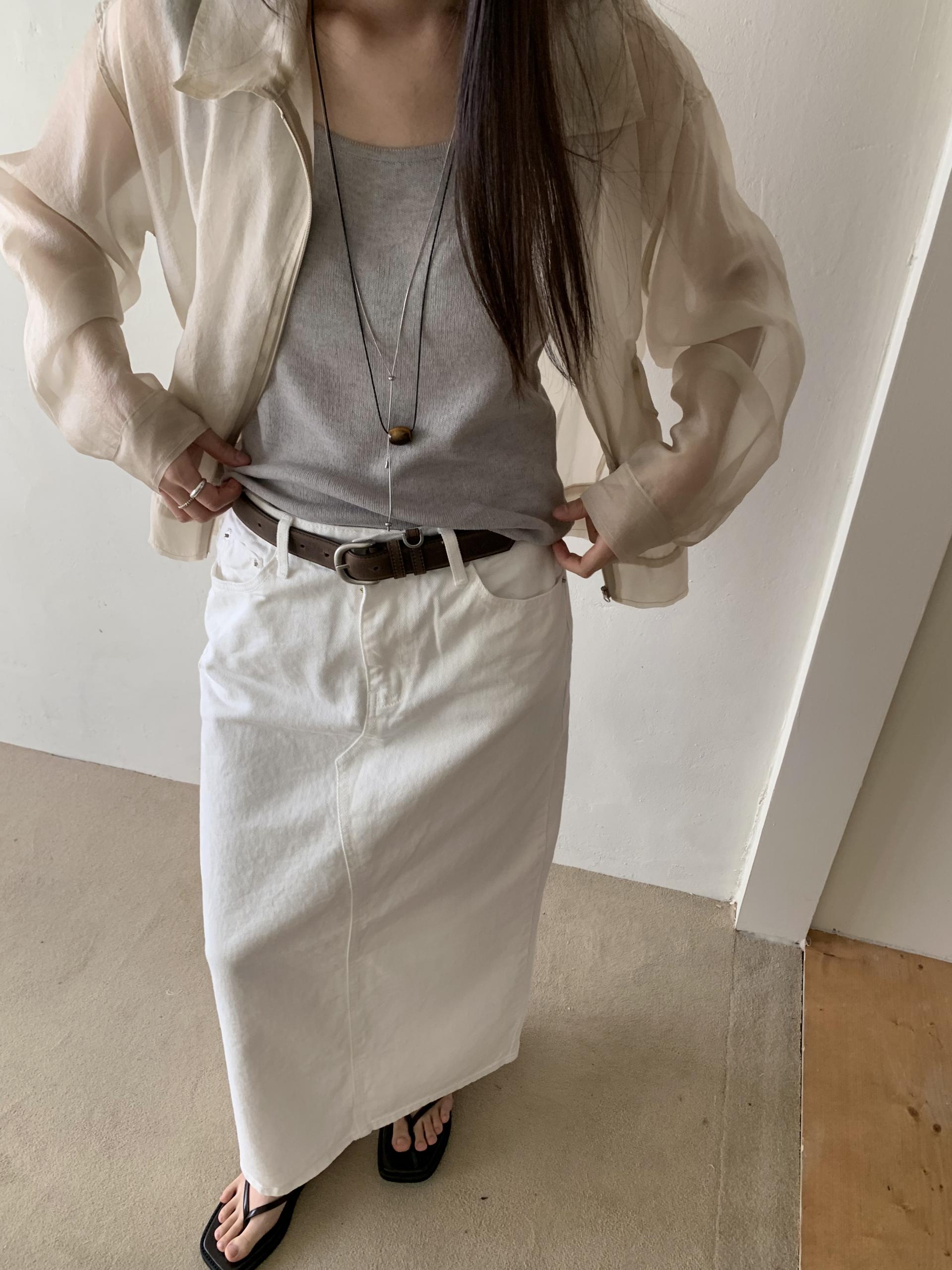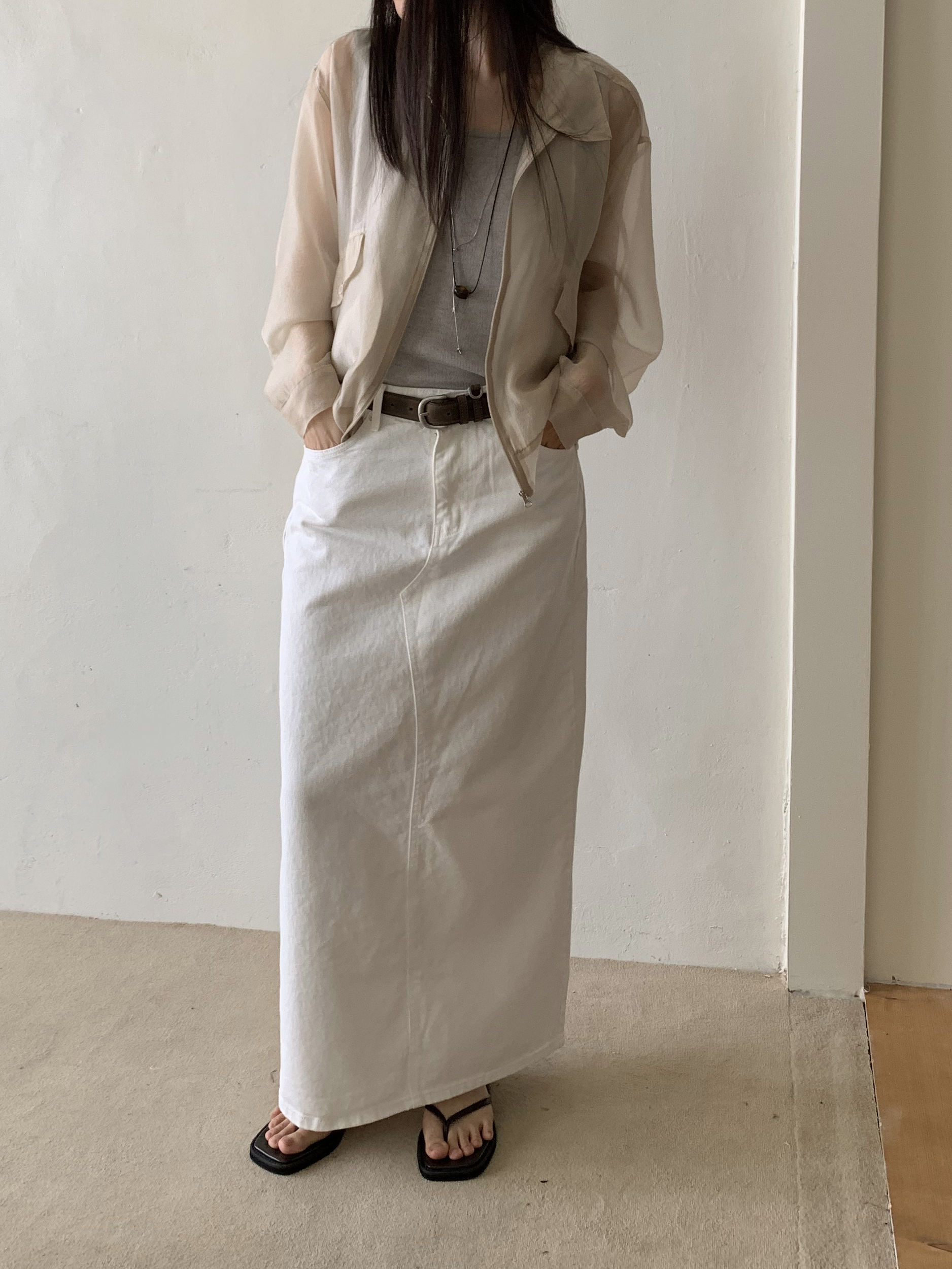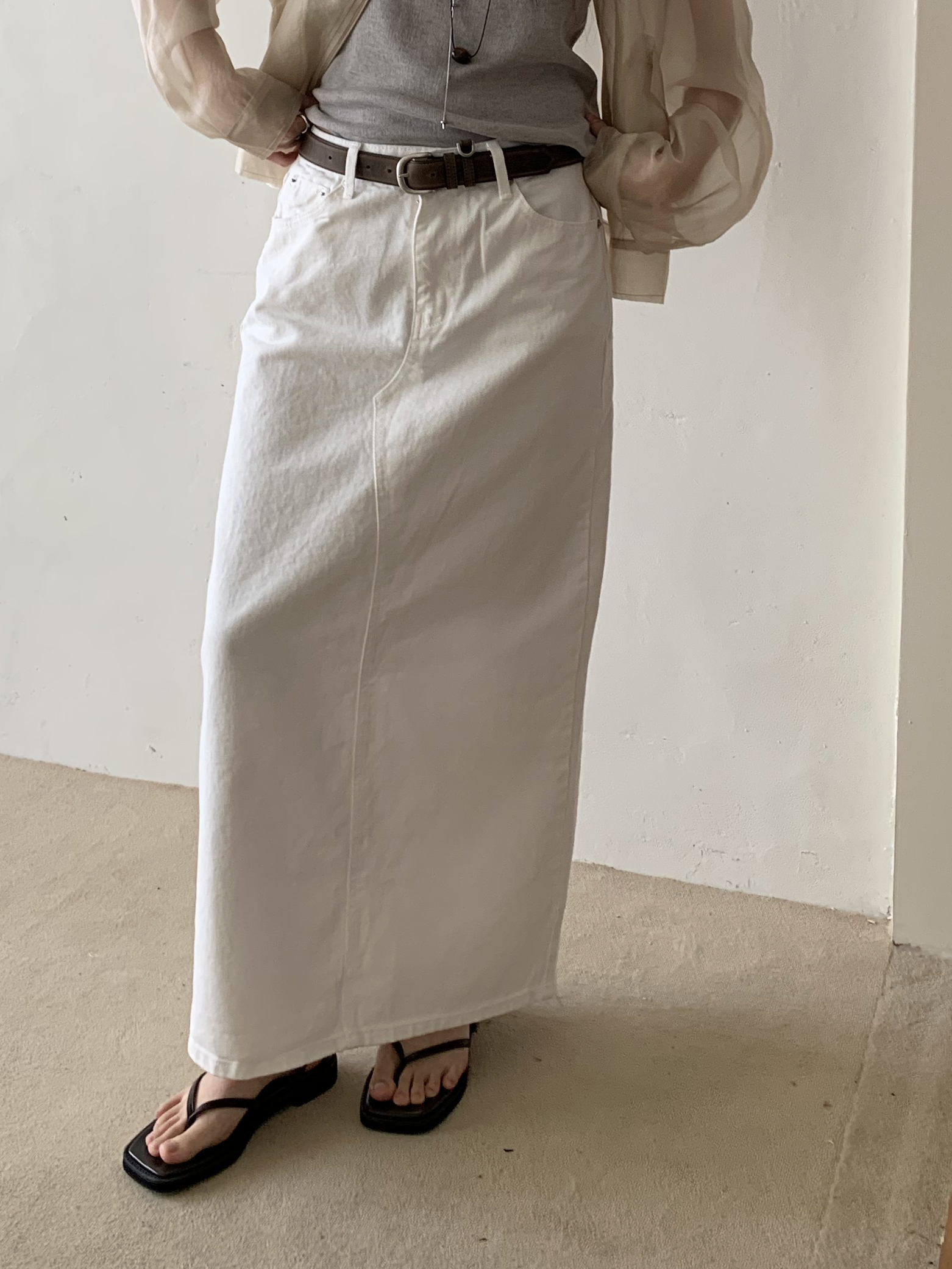 깨끗한 아이보리 컬러라 맥시한 기장이어도 답답하게 느껴지지 않고, 오히려 룩을 더 시원한 이미지로 만들어줍니다.