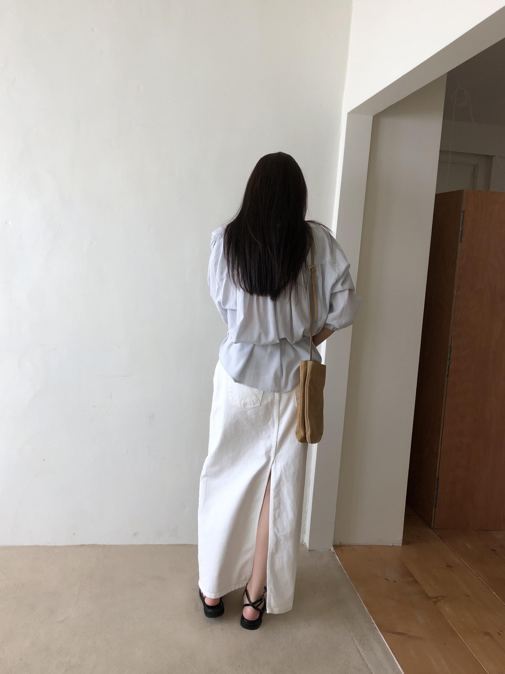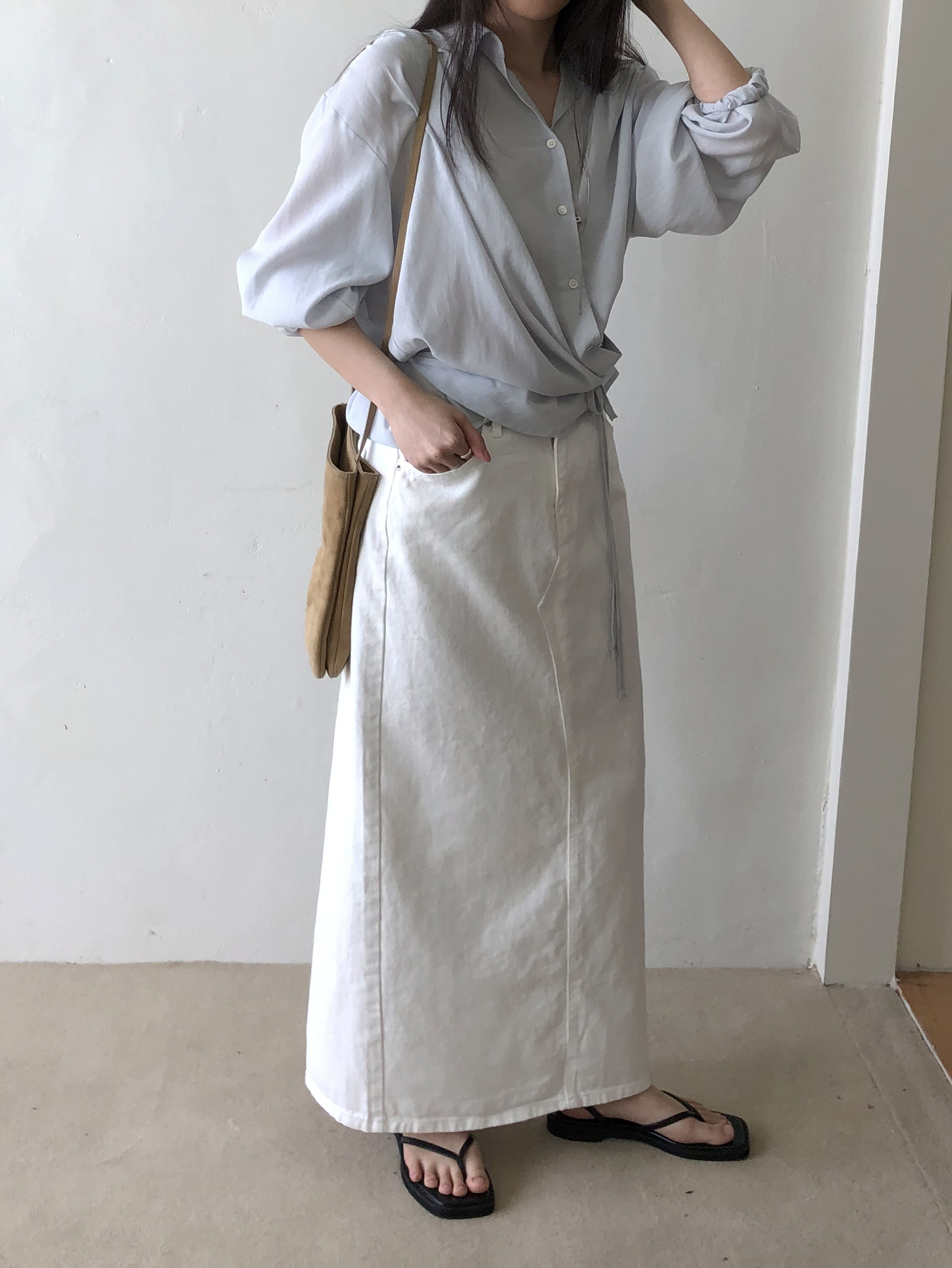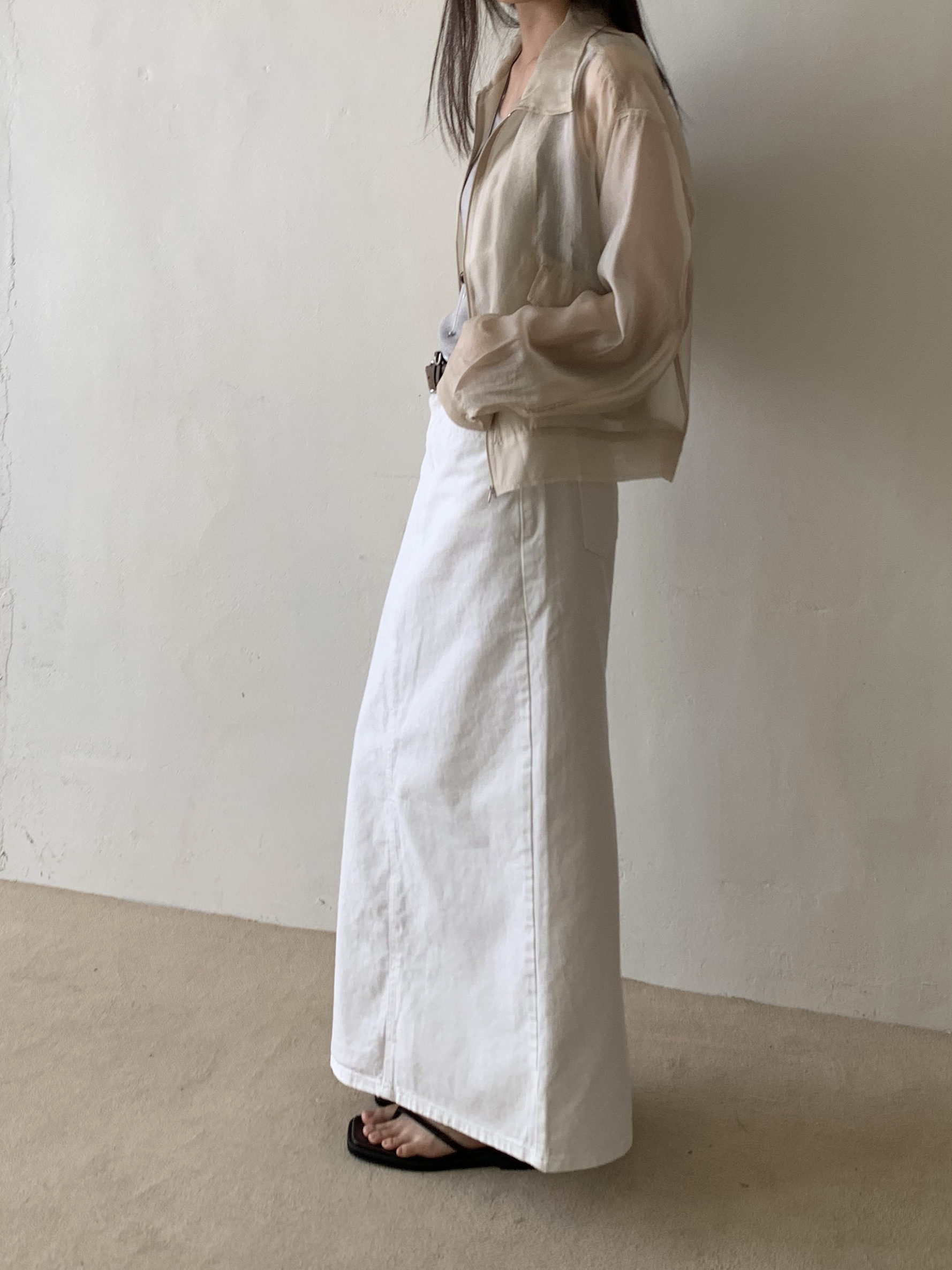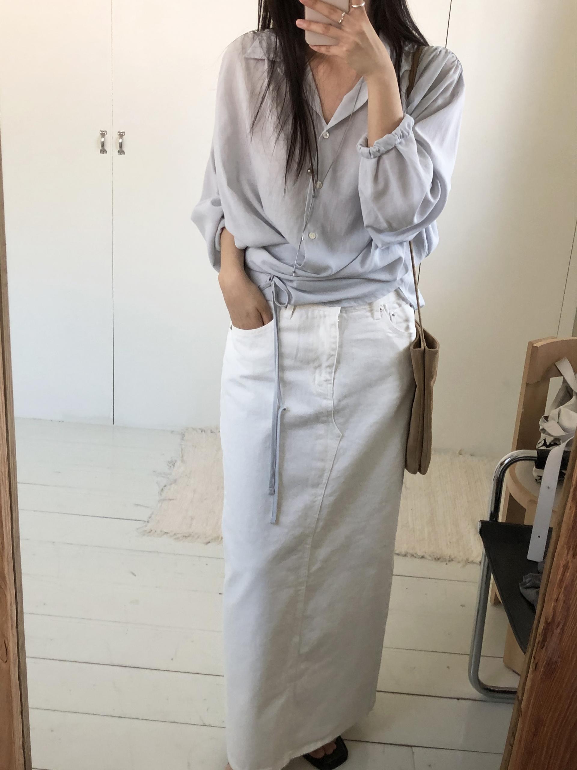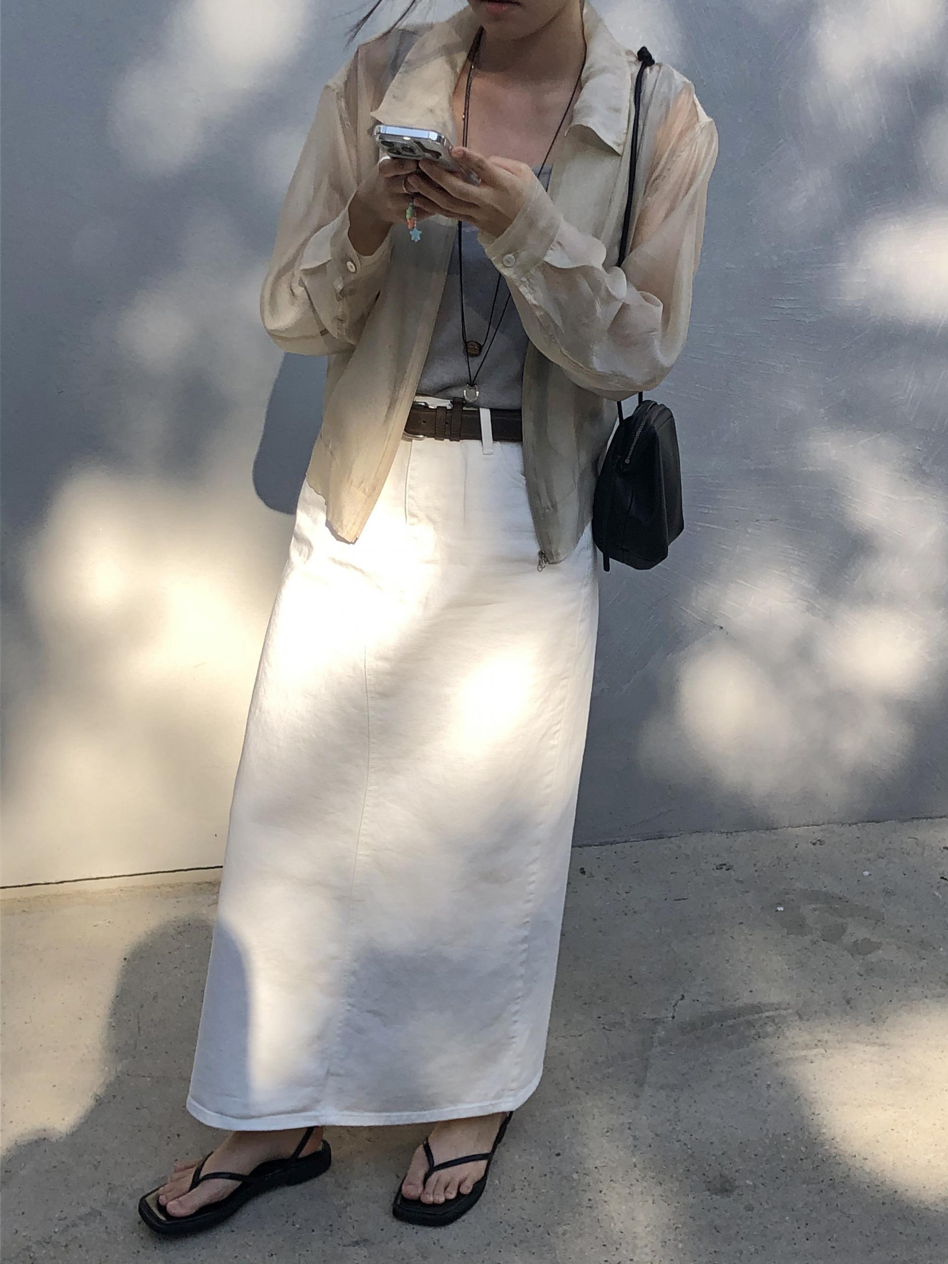 깨끗한 아이보리 컬러라 맥시한 기장이어도 답답하게 느껴지지 않고, 오히려 룩을 더 시원한 이미지로 만들어줍니다.