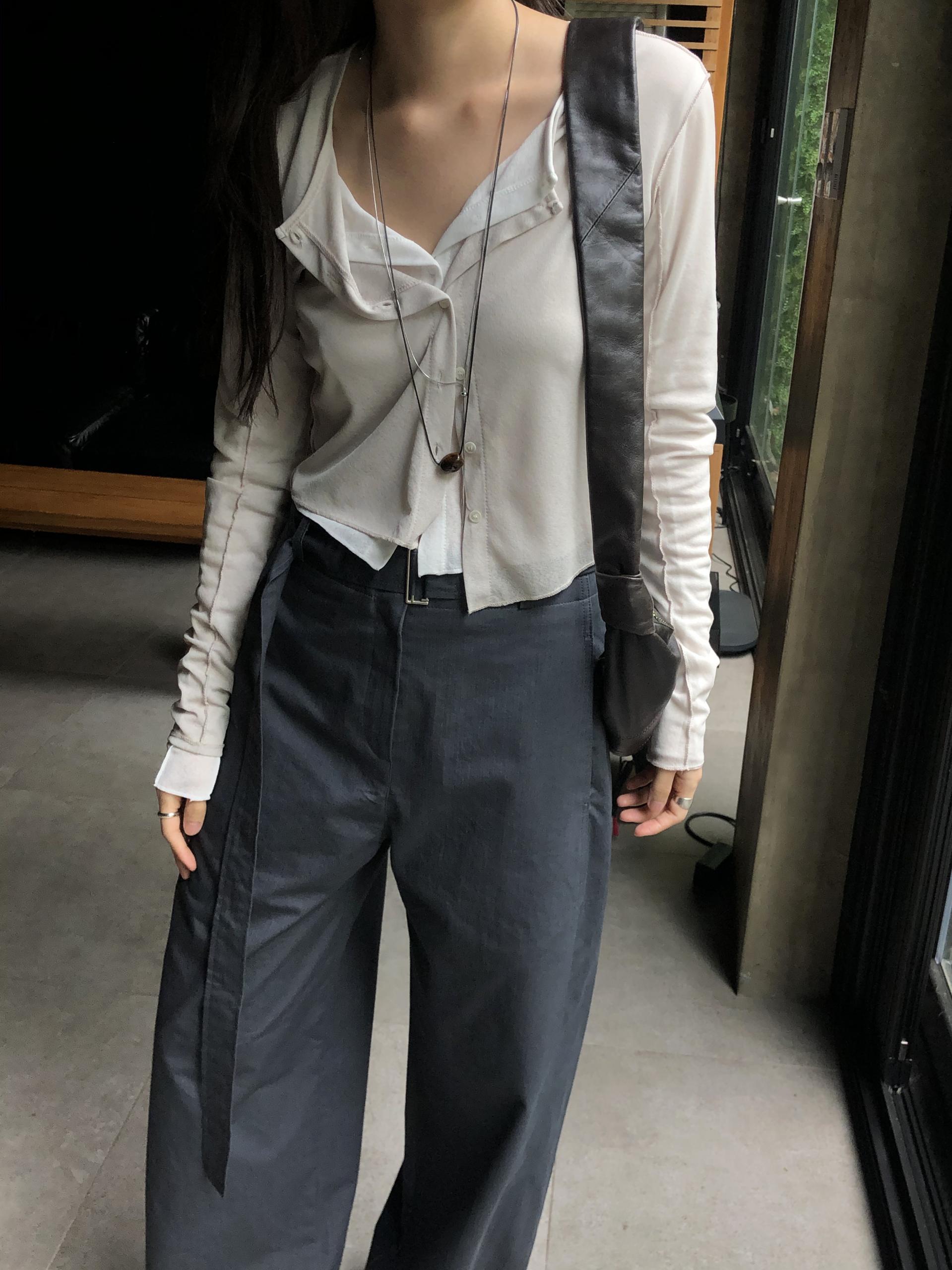 겉으로 노출된 봉제선은 은은한 디테일을 더해주며, 특히 소매 중간의 절개선이 입체감을 더해 단조로움을 덜어냈어요. 얇고 시스루한 원단과 오버로크 봉제선의 합도 재밌고요.