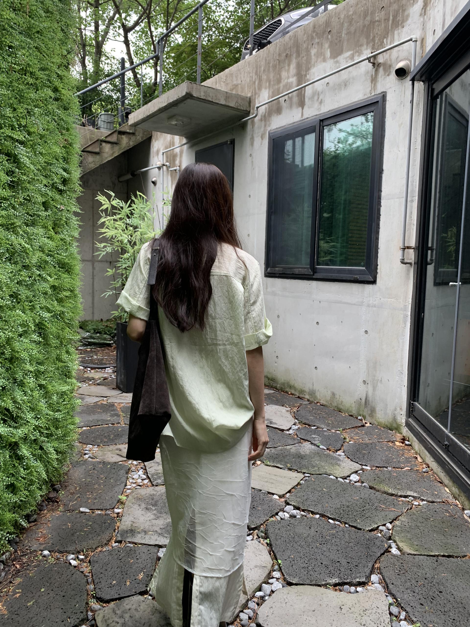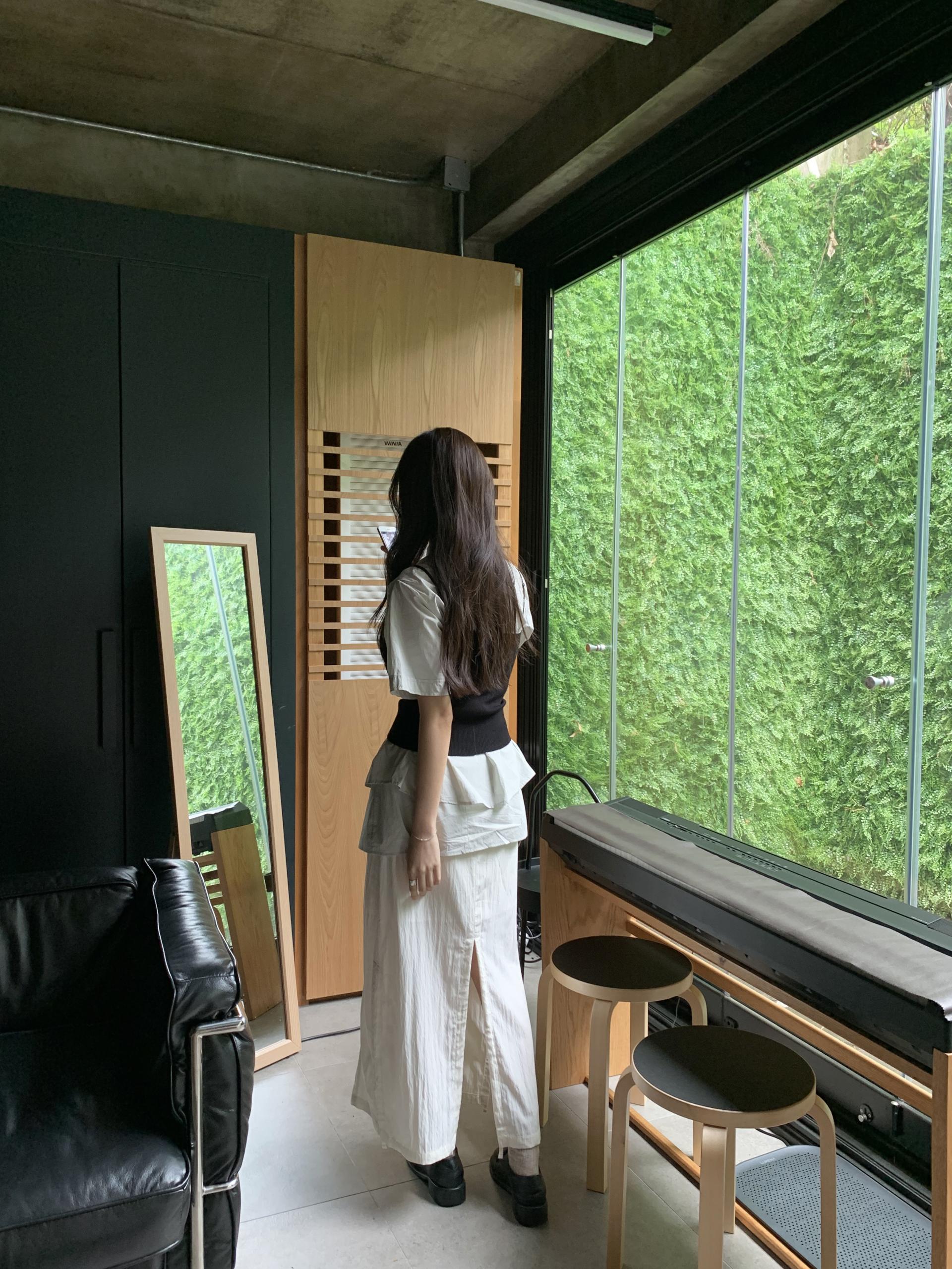 조임없이 플랫하게 연출하면 걸을 때 트임이 더욱 돋보이며, 촉촉한 소재감이 잘 살아납니다. 스트링을 조였을 때는 길이감도 어느정도 조절이 가능하고 보다 트렌디한 무드로 입어집니다. 베이직한 탑에 스커트로 포인트를 주고 싶다면 이 스타일을 선택해주시면 좋아요.