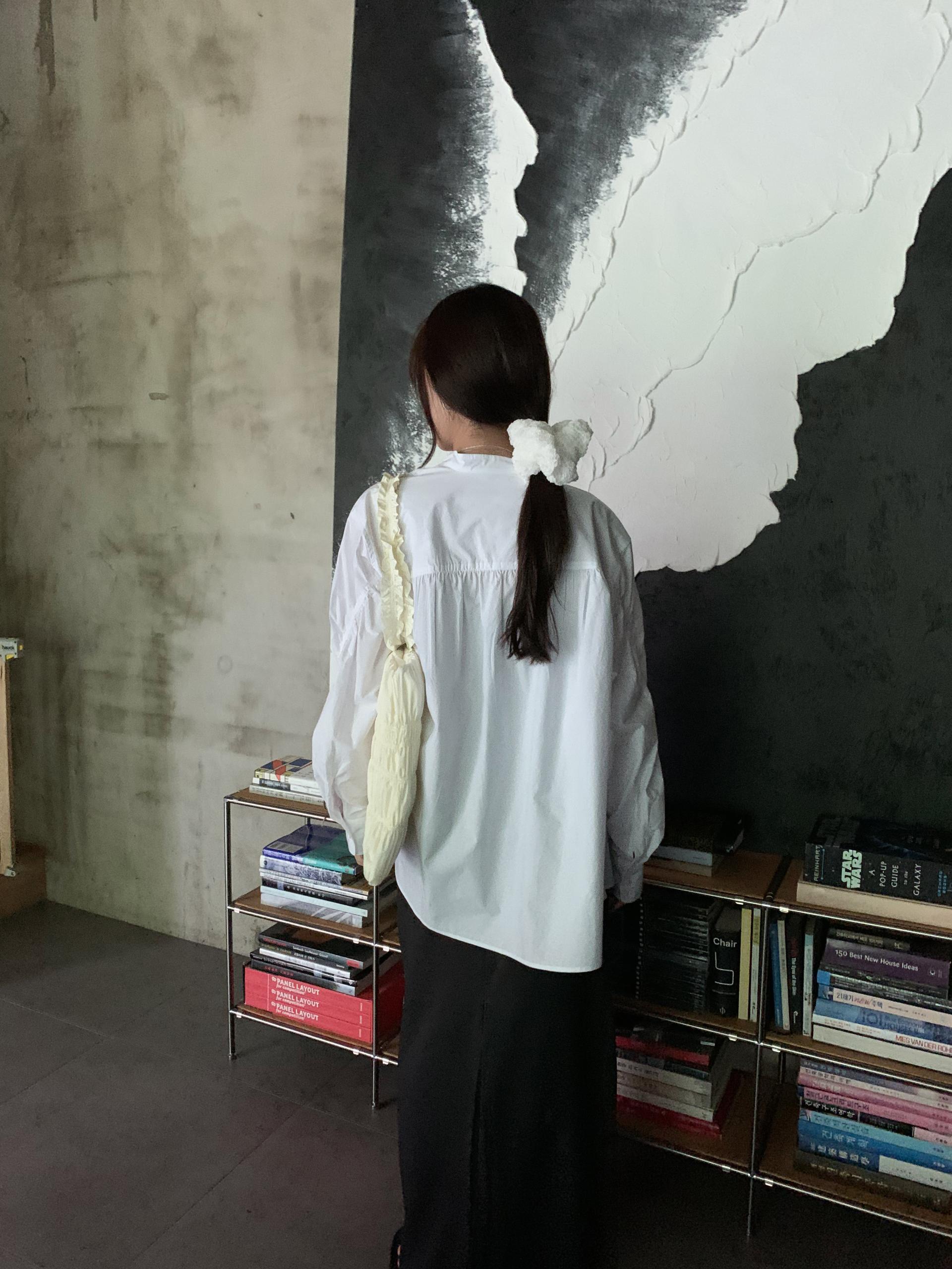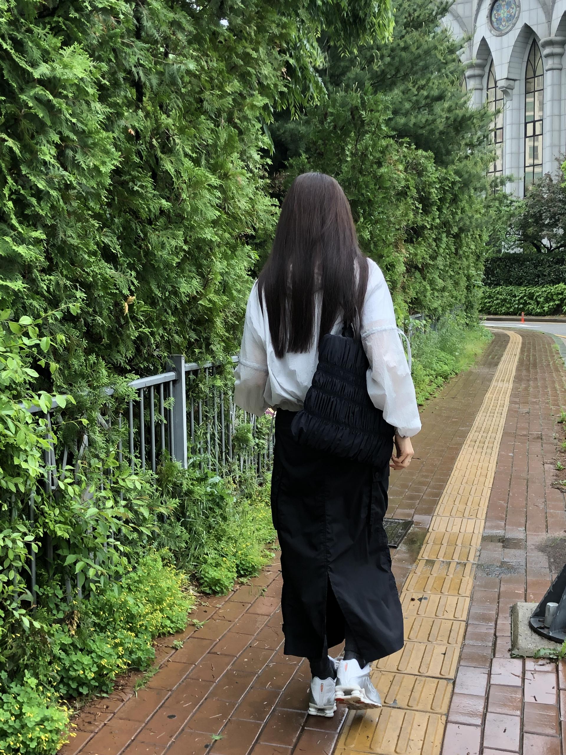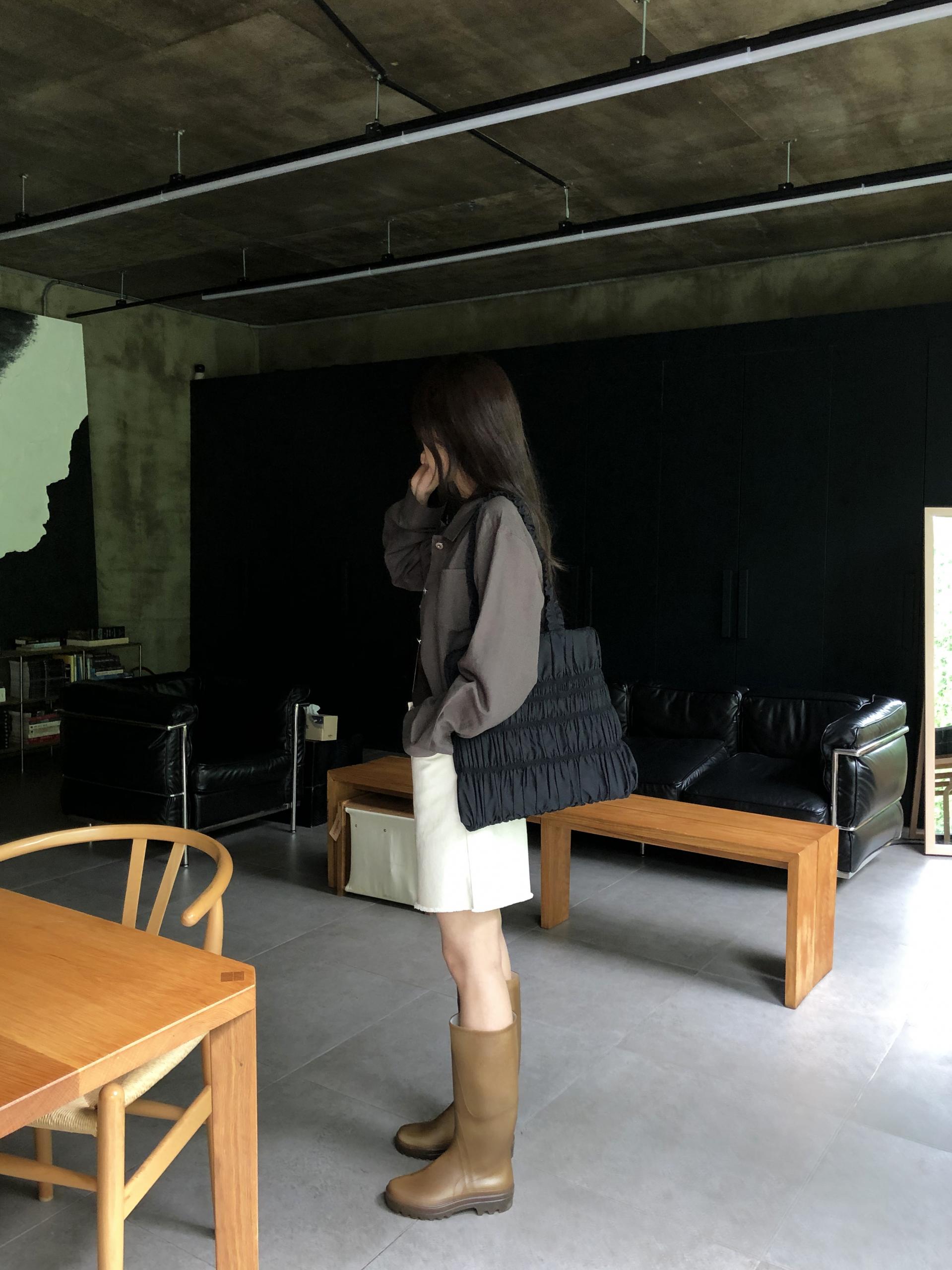 어깨끈은 프릴로 디자인되어 본판의 스모크가 주는 무드를 이어갑니다. 전체적으로 사랑스러운 무드를 지녔어요. 여름에 특히 가볍게 입고 백으로 은은하게 포인트 주기 좋으실 거예요. 디테일이 돋보이는 백이라 깔끔한 룩과 함께하면 베스트입니다.