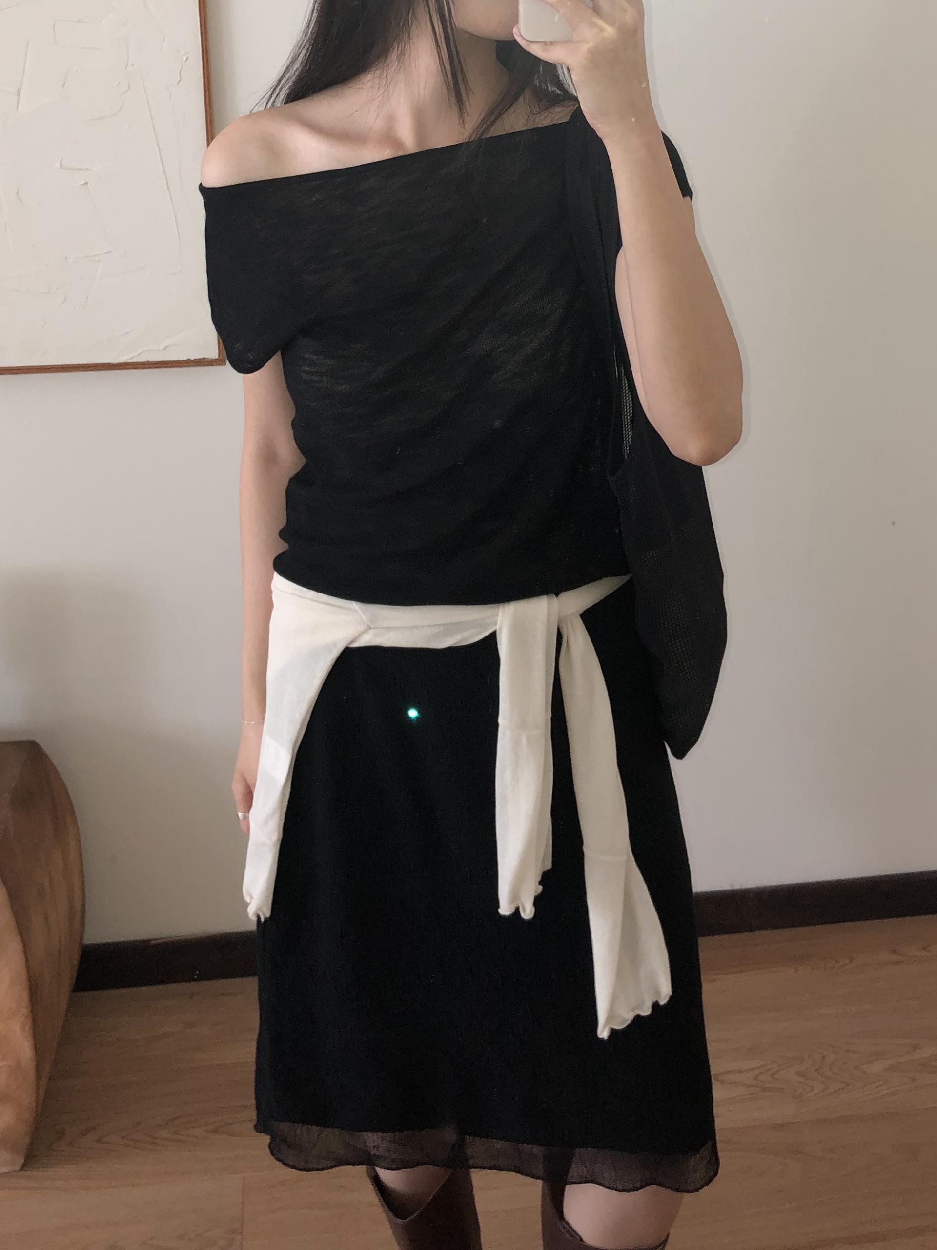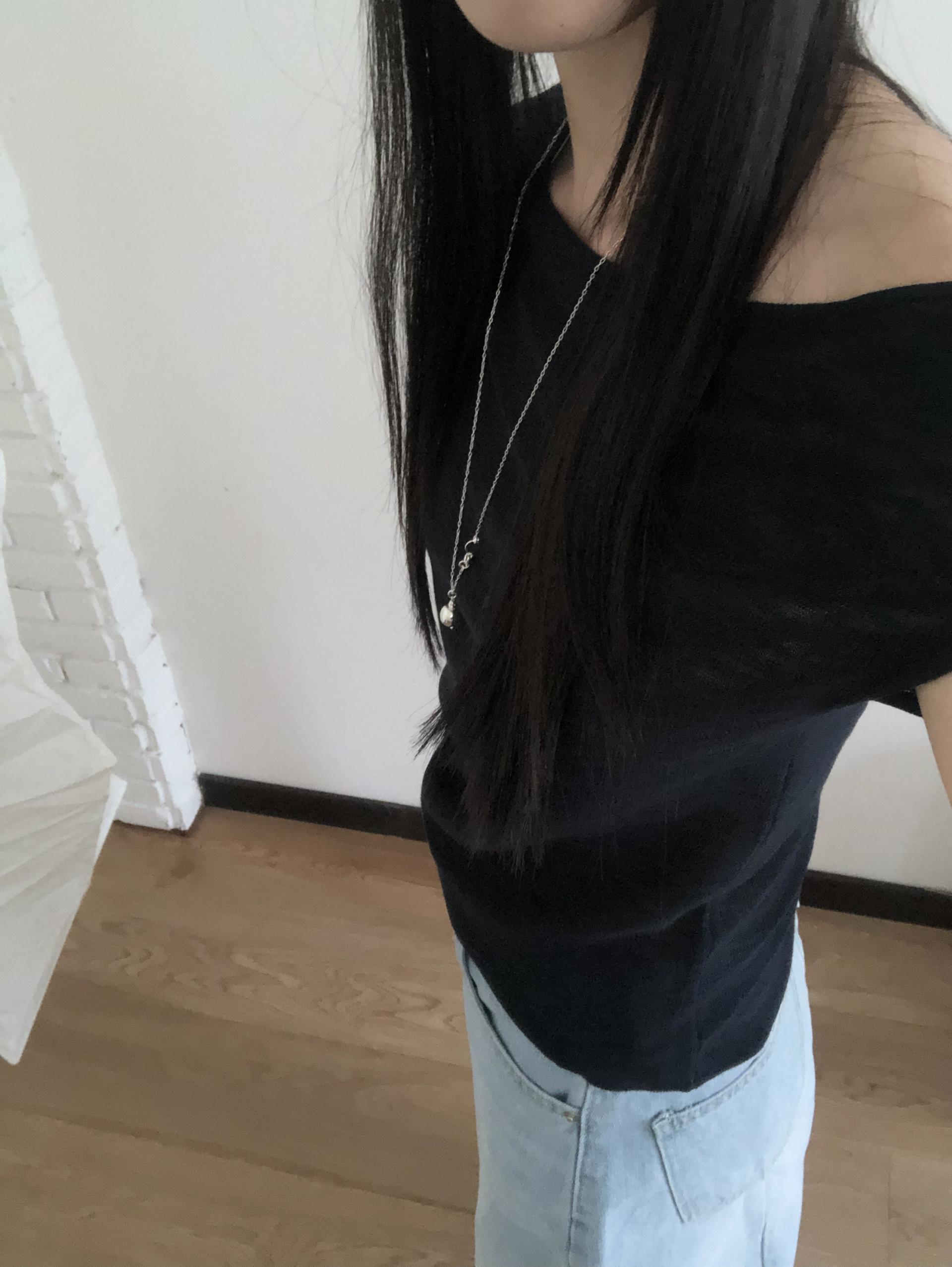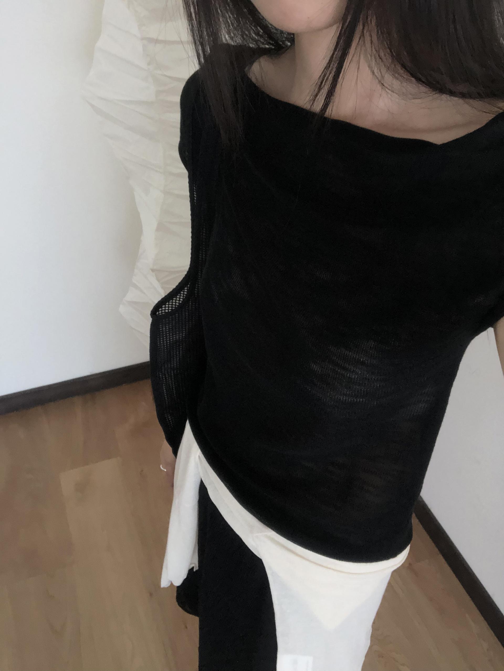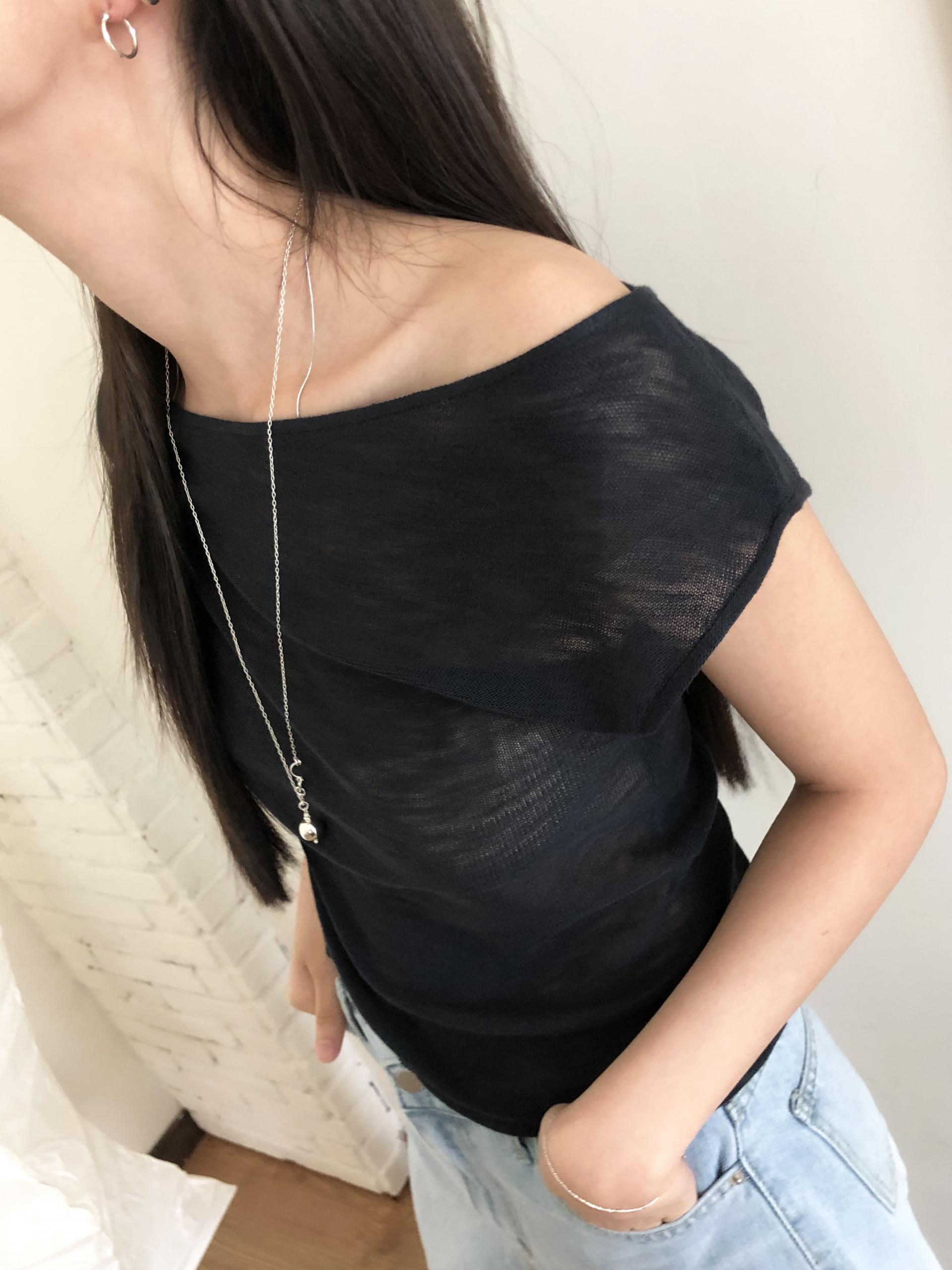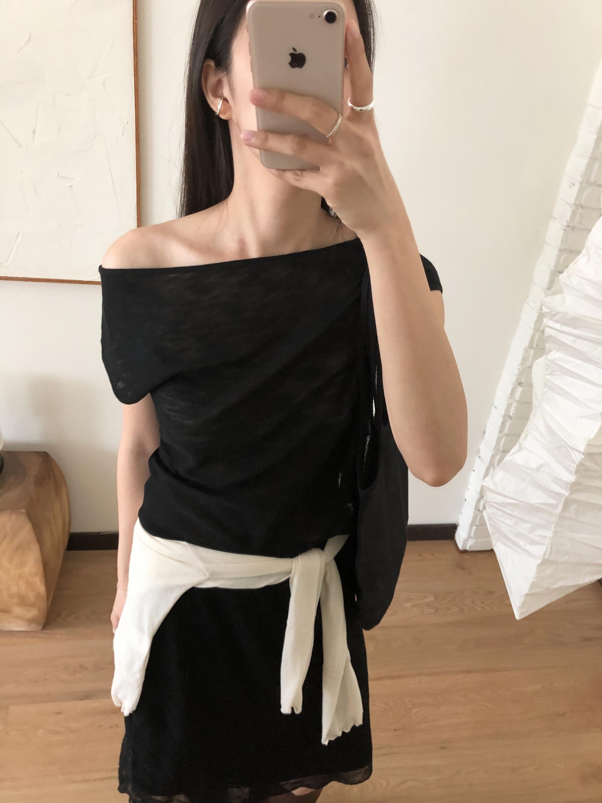 * 얇고 드라이한 촉감의 니트 소재로 제작된 썸머 오프숄더 니트입니다. 어깨 라인이 언발란스로 디자인되어 한쪽 어깨를 내려 착용하는 타입입니다. 세 컬러 모두 비침이 있는 편입니다. 스킨톤의 이너 착용을 추천드립니다 !