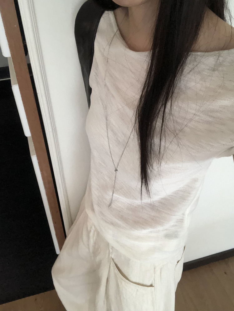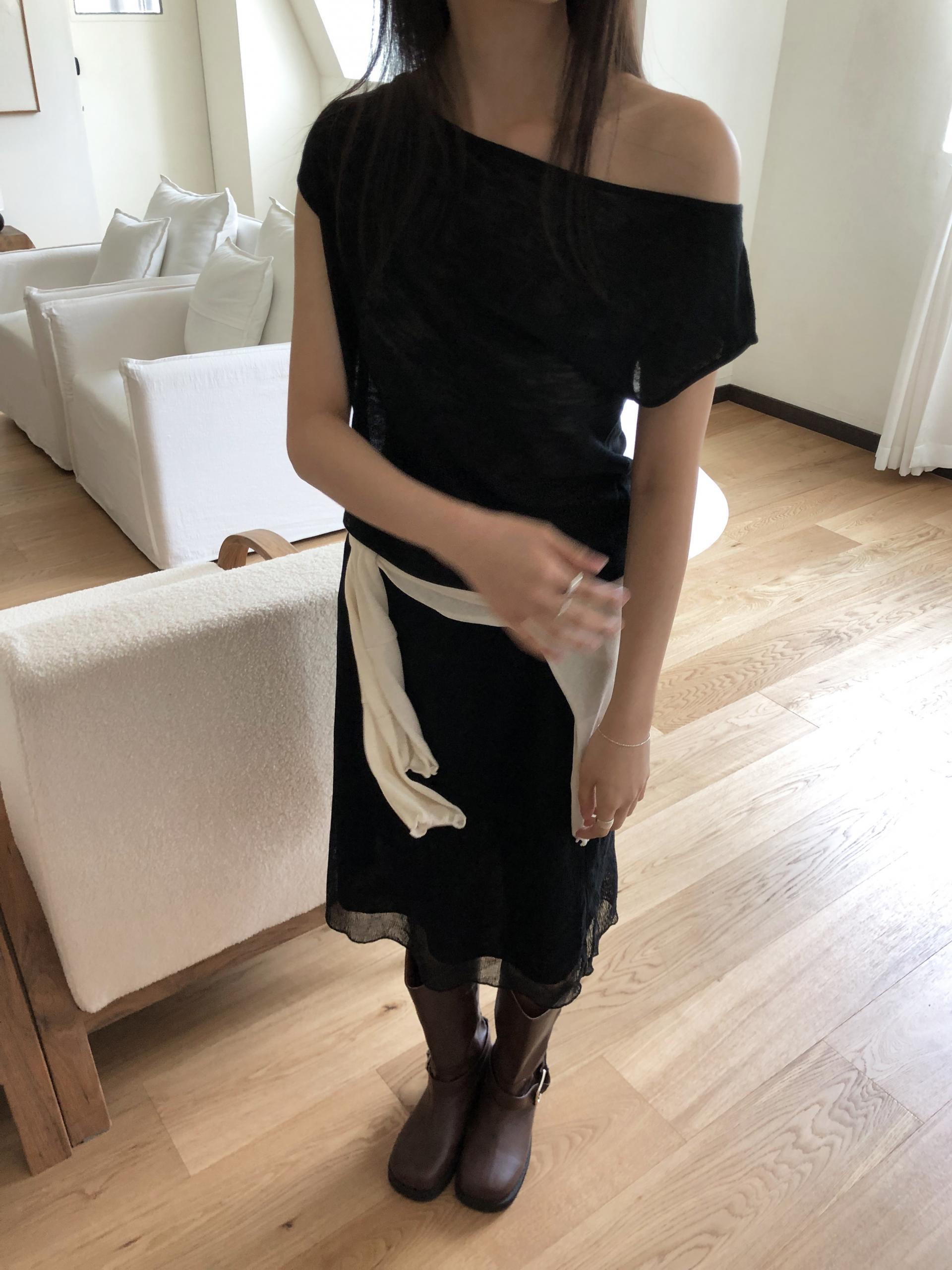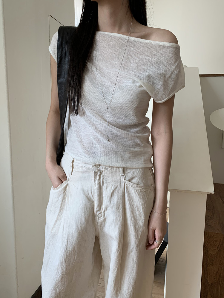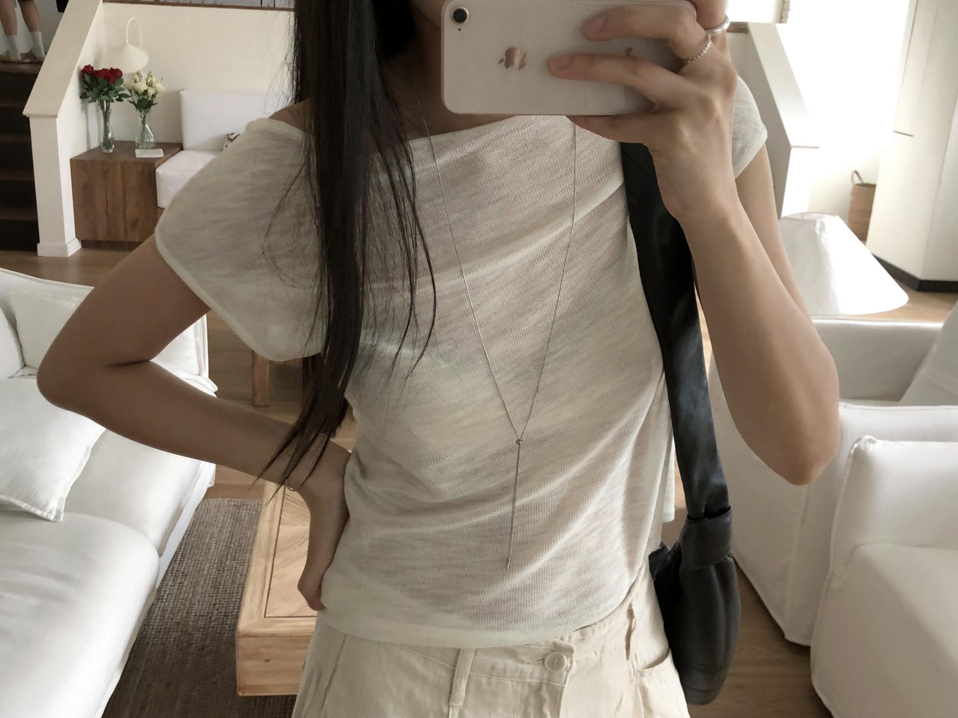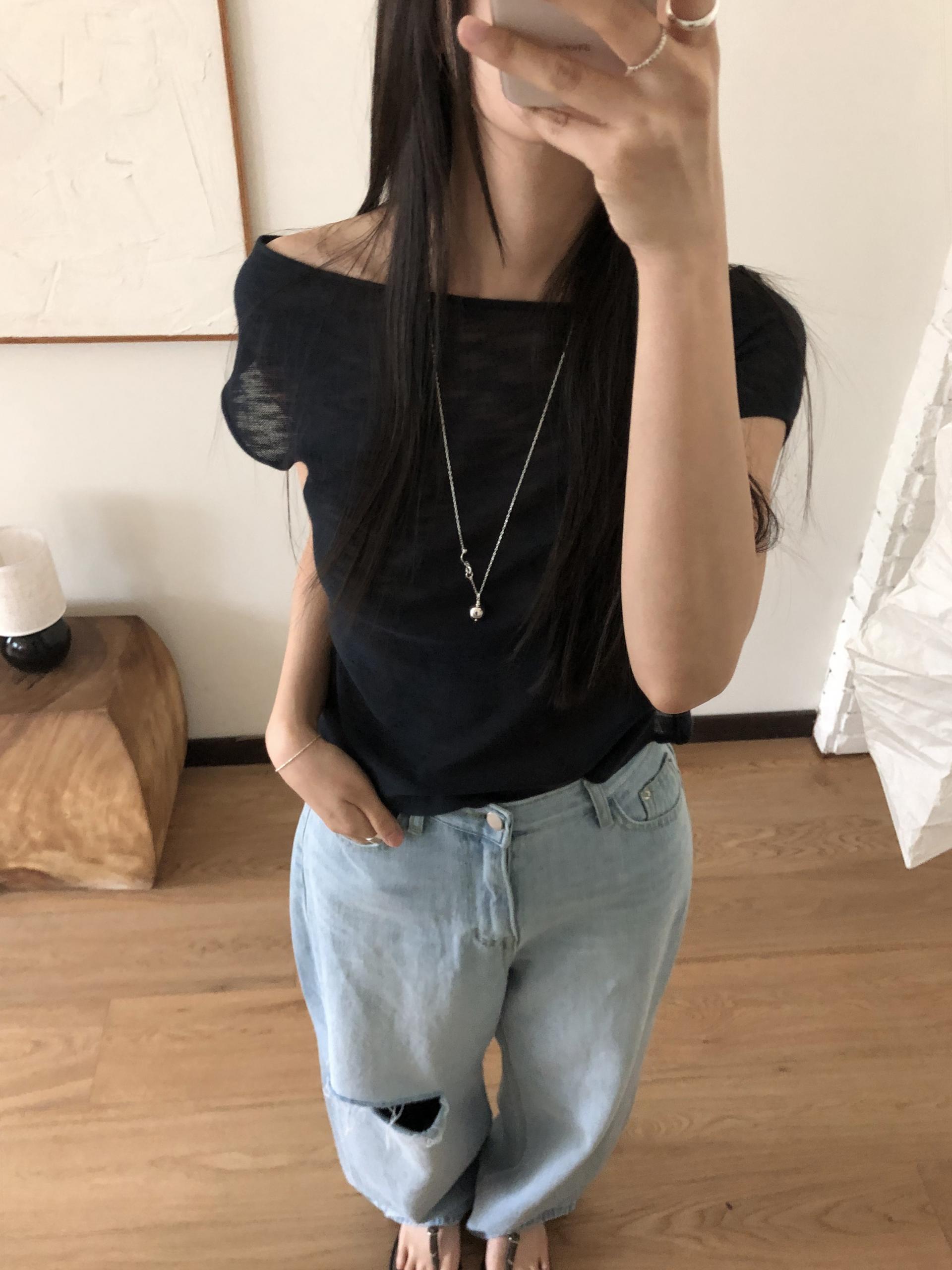 * 얇고 드라이한 촉감의 니트 소재로 제작된 썸머 오프숄더 니트입니다. 어깨 라인이 언발란스로 디자인되어 한쪽 어깨를 내려 착용하는 타입입니다. 세 컬러 모두 비침이 있는 편입니다. 스킨톤의 이너 착용을 추천드립니다 !