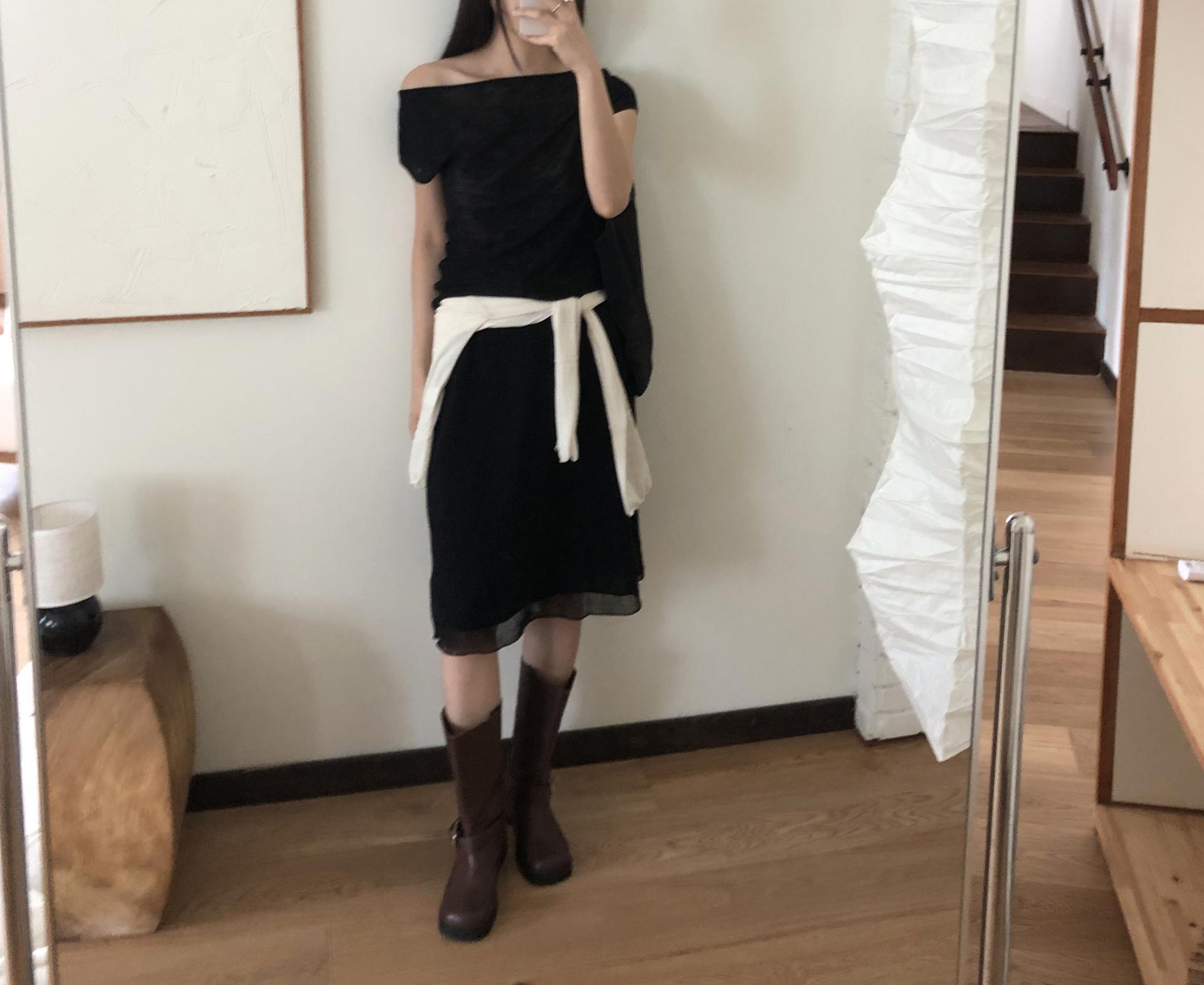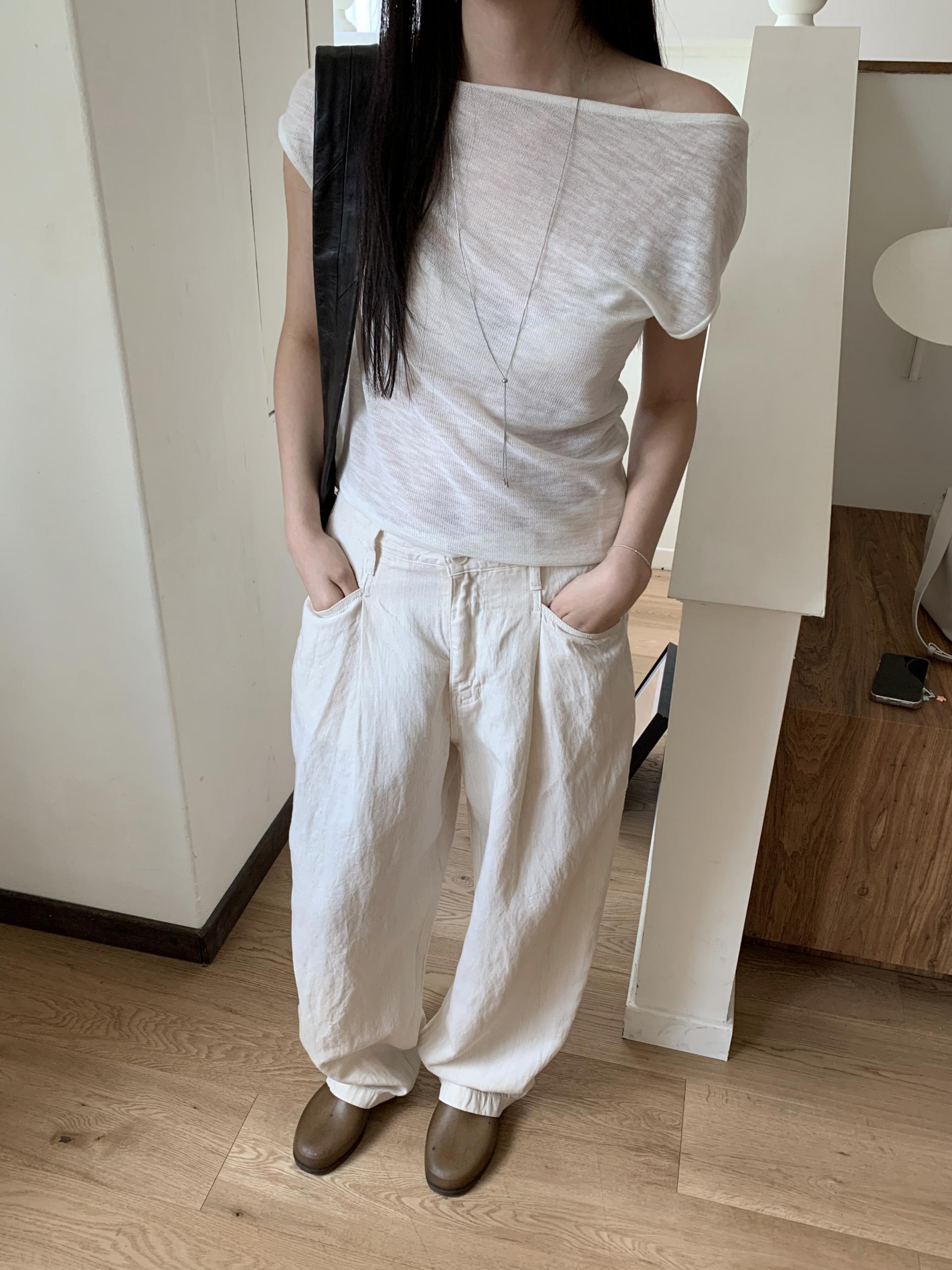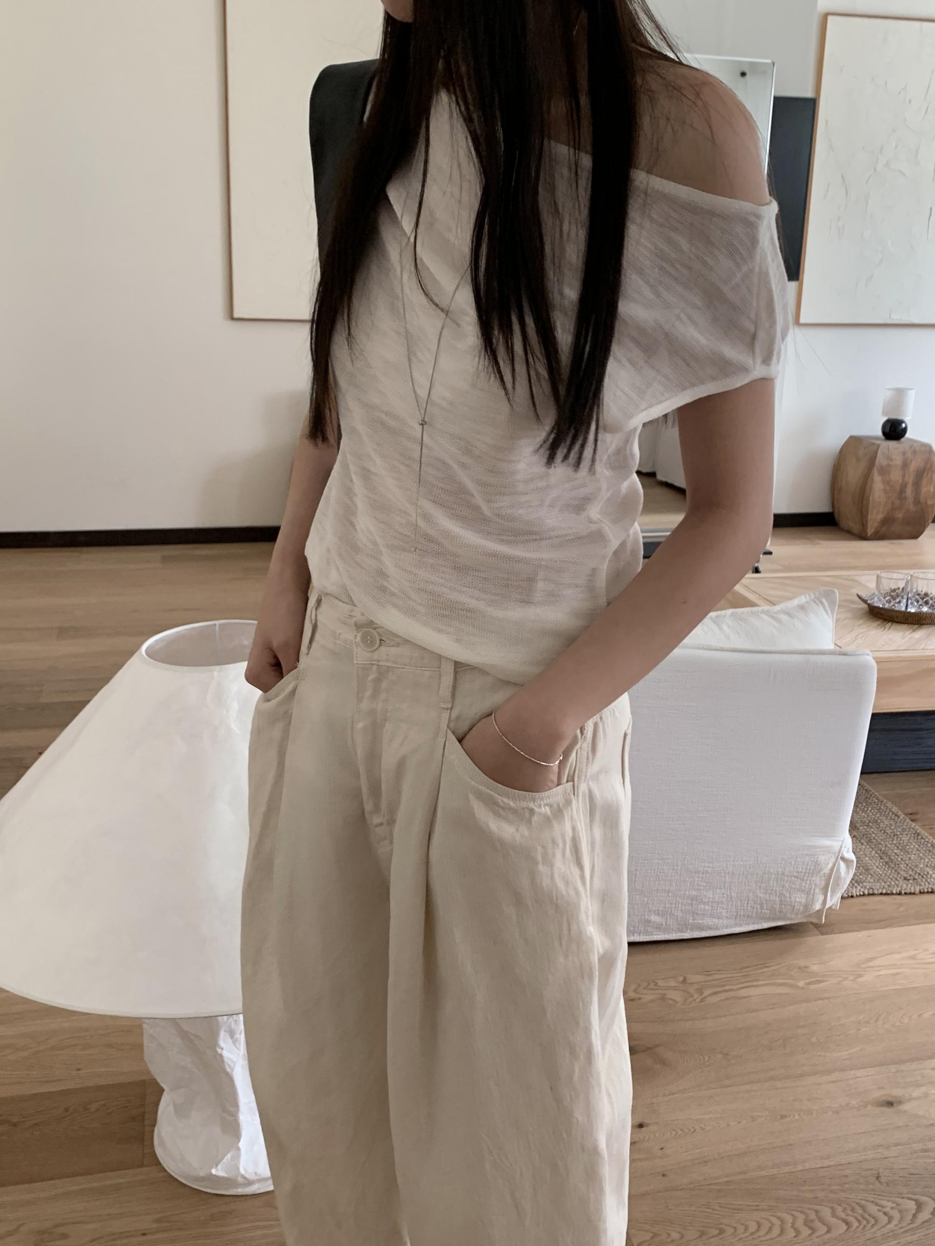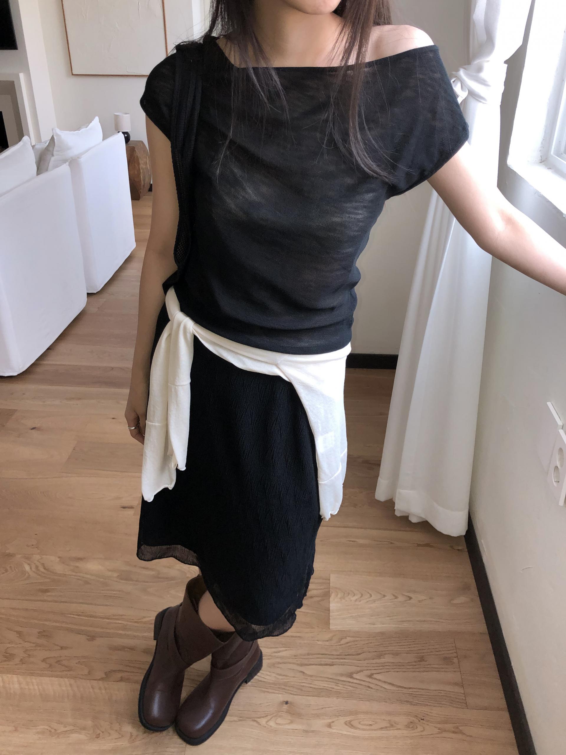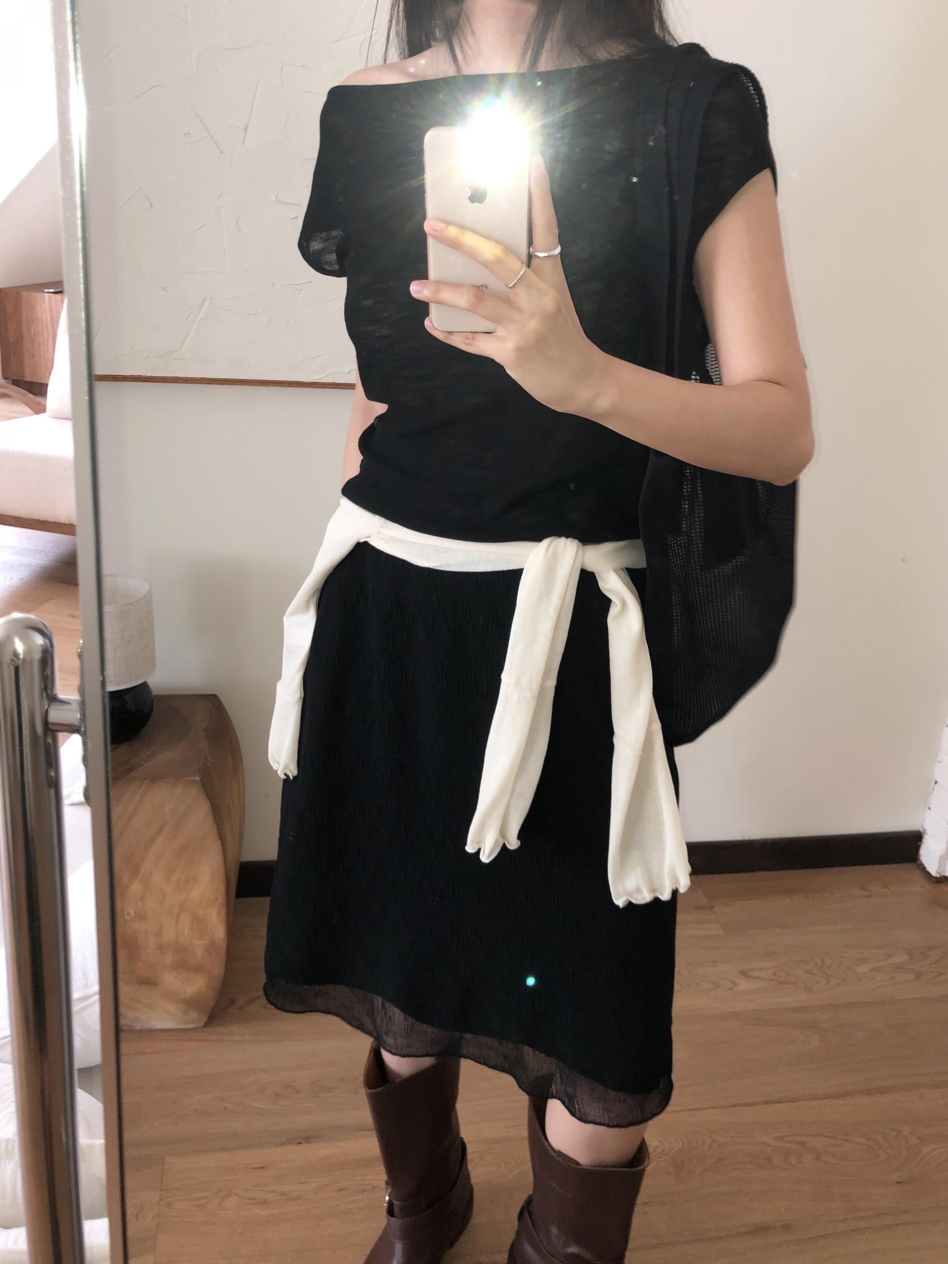 * 얇고 드라이한 촉감의 니트 소재로 제작된 썸머 오프숄더 니트입니다. 어깨 라인이 언발란스로 디자인되어 한쪽 어깨를 내려 착용하는 타입입니다. 세 컬러 모두 비침이 있는 편입니다. 스킨톤의 이너 착용을 추천드립니다 !
