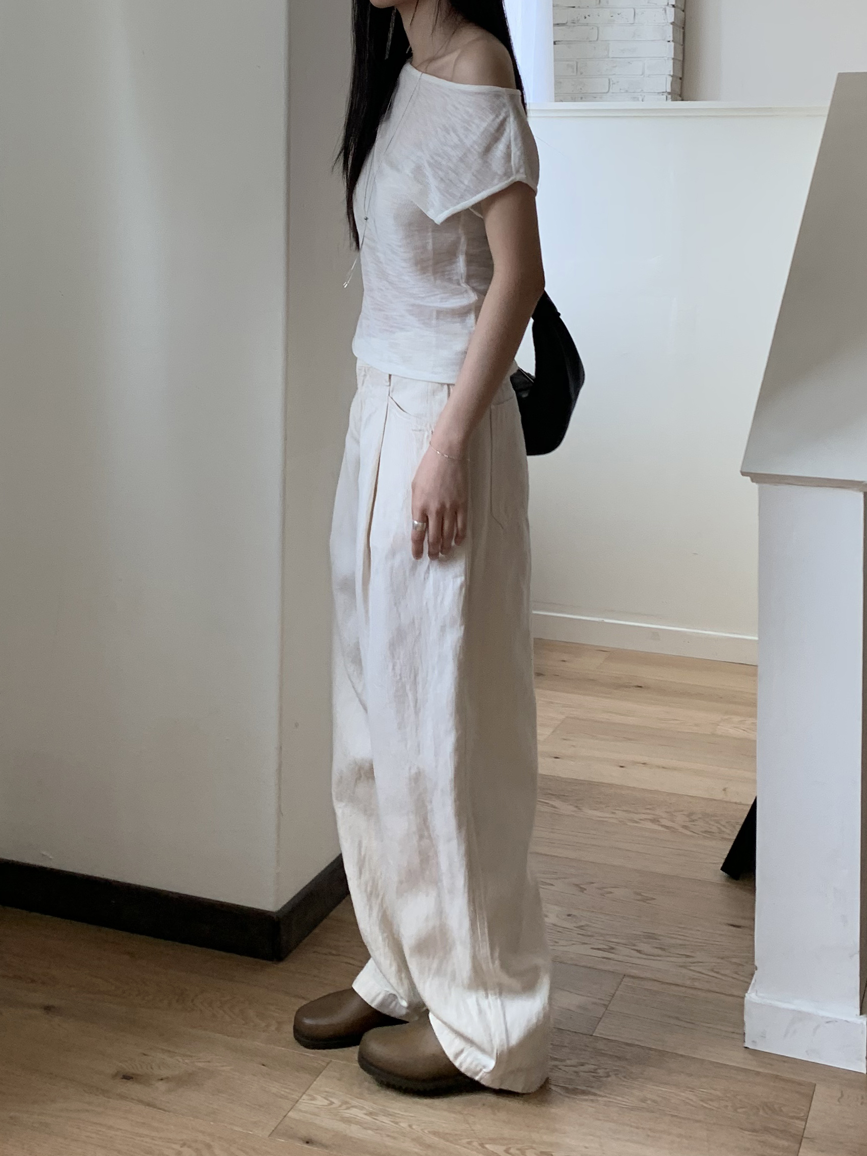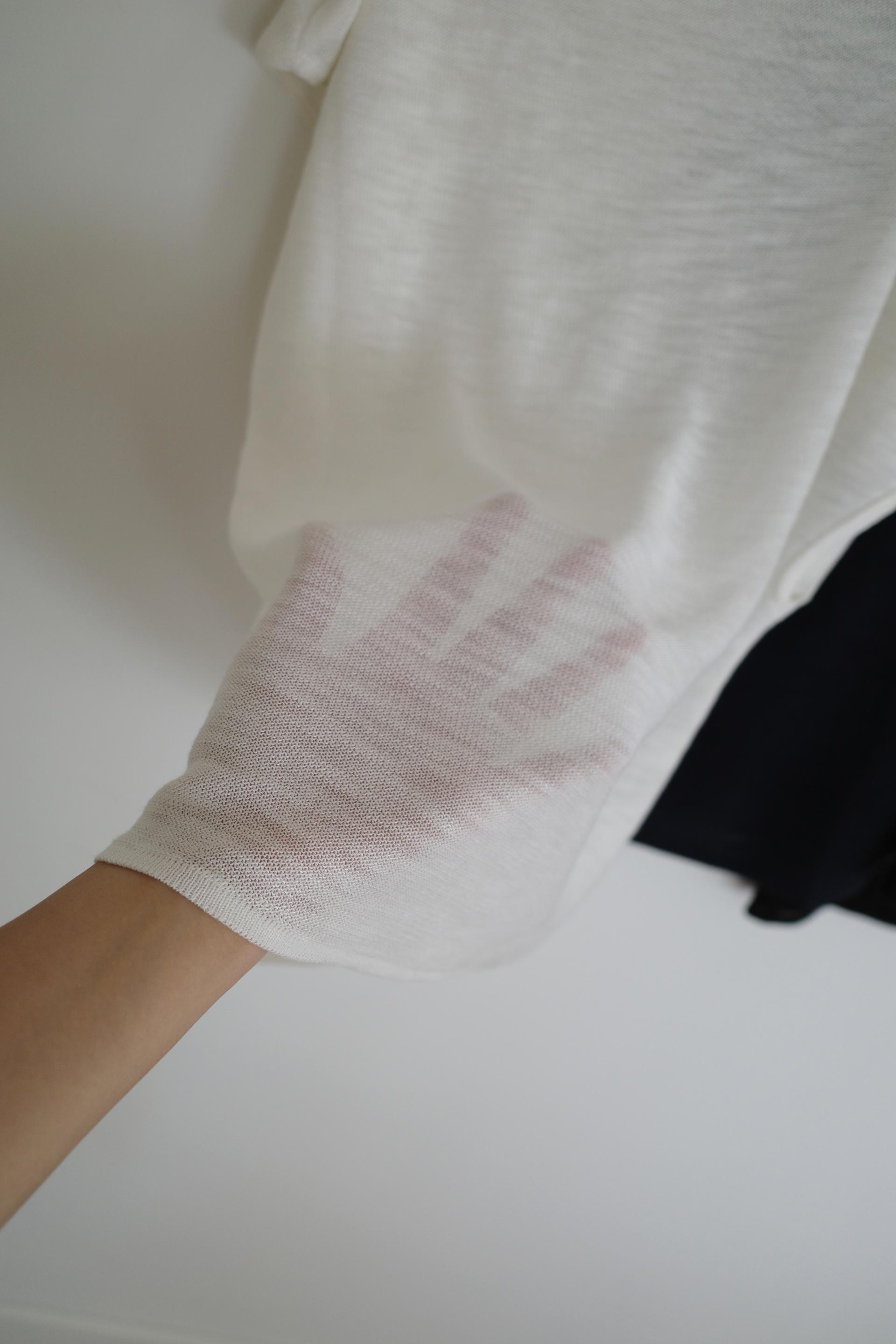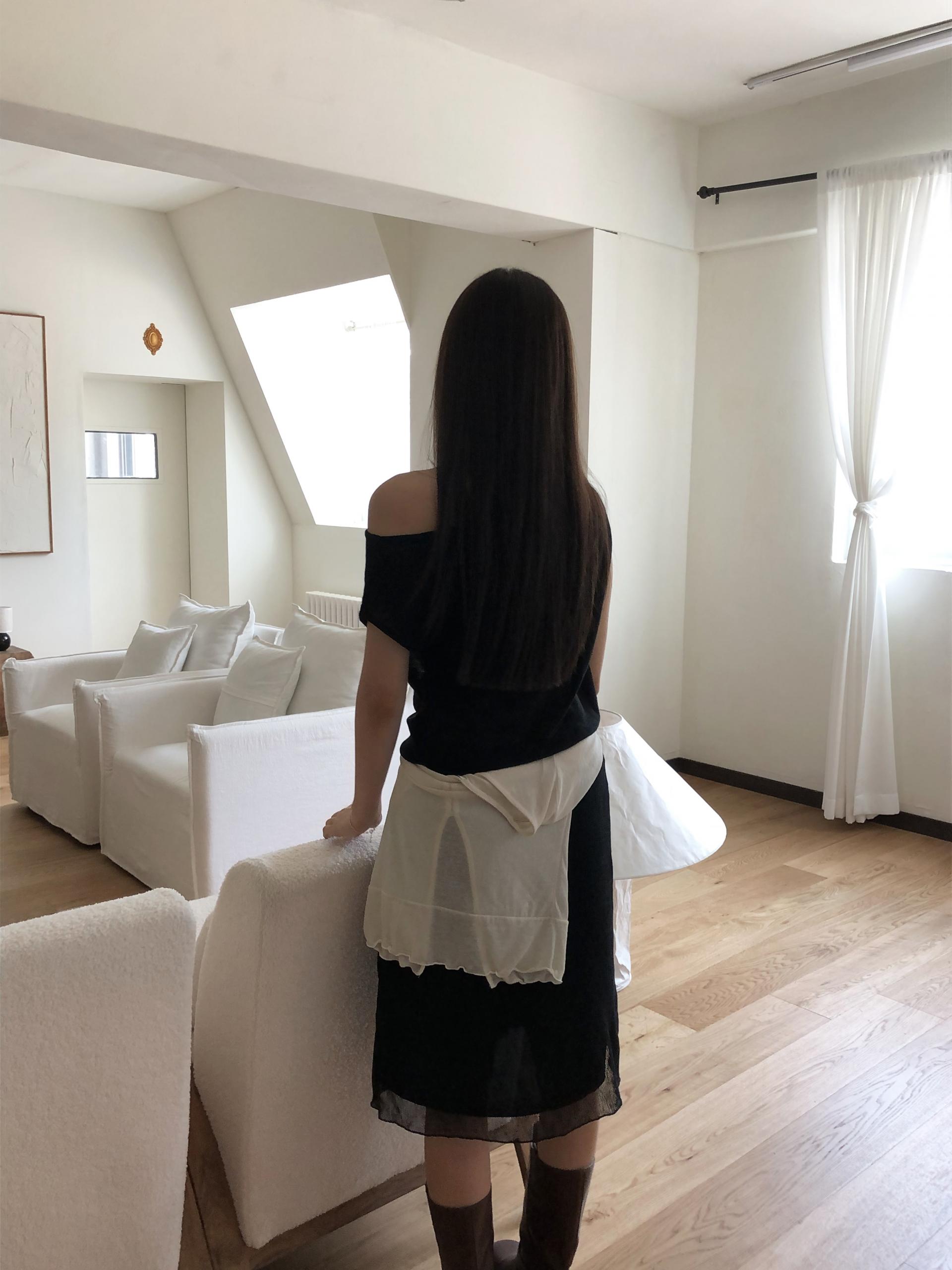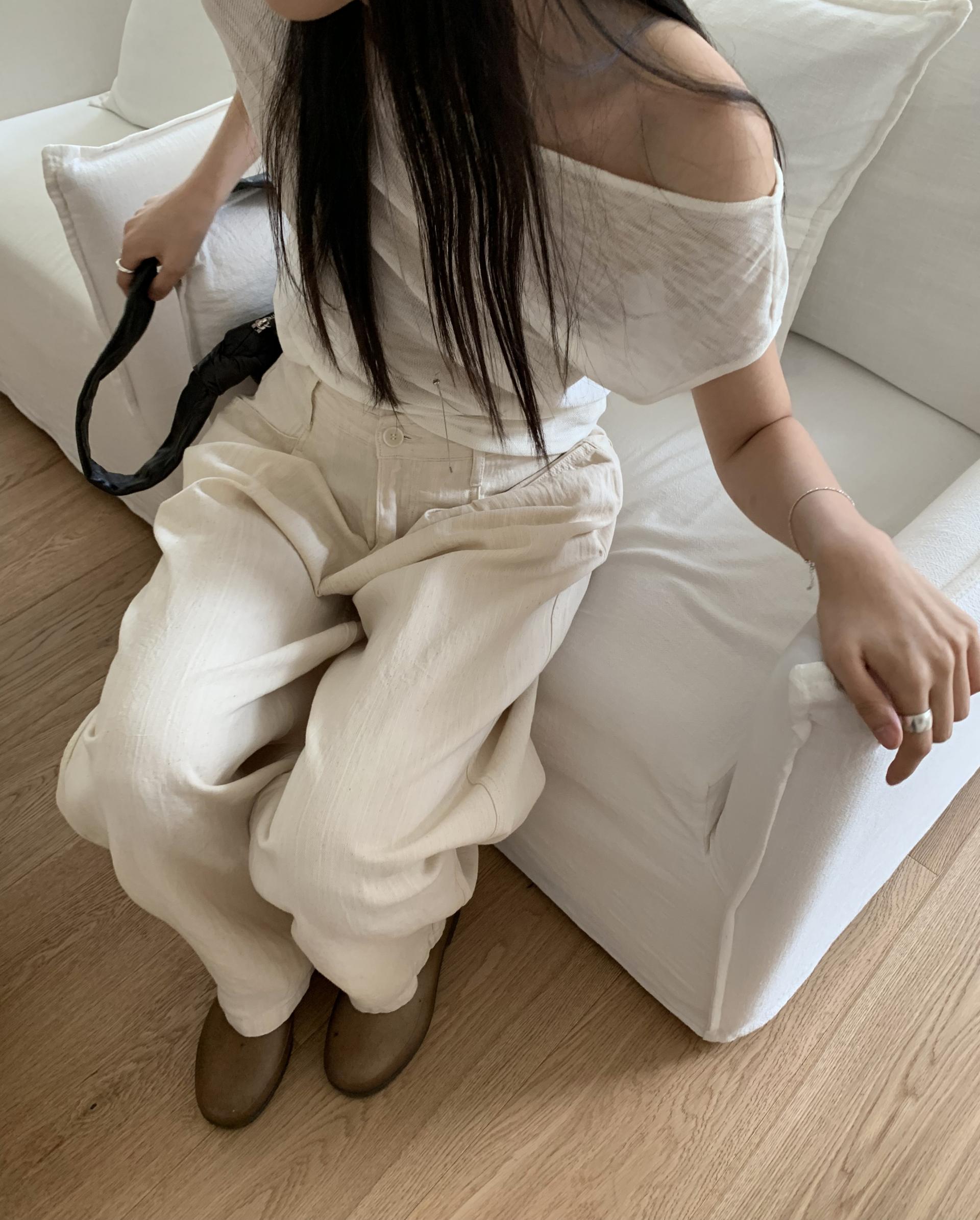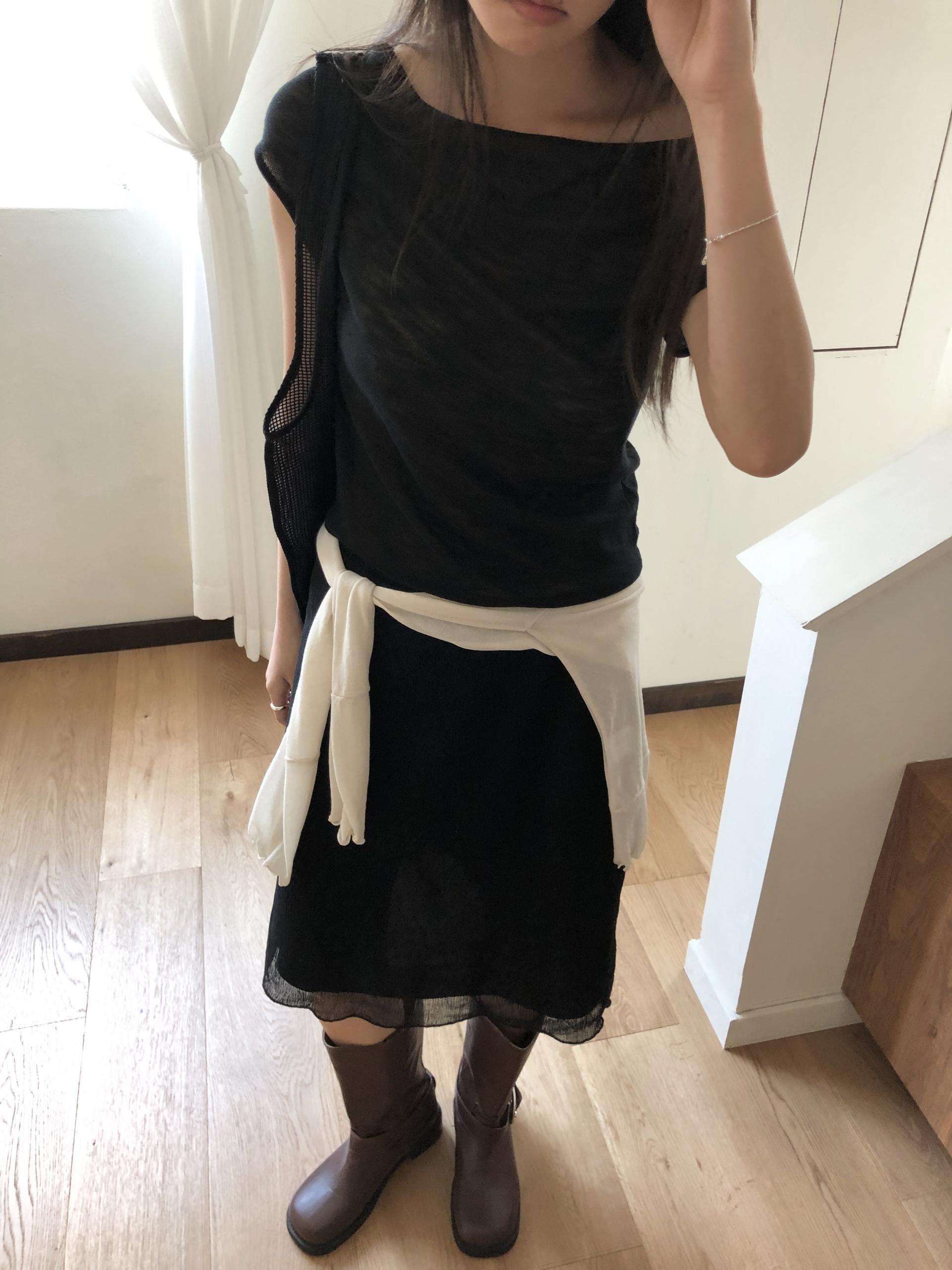 * 얇고 드라이한 촉감의 니트 소재로 제작된 썸머 오프숄더 니트입니다. 어깨 라인이 언발란스로 디자인되어 한쪽 어깨를 내려 착용하는 타입입니다. 세 컬러 모두 비침이 있는 편입니다. 스킨톤의 이너 착용을 추천드립니다 !