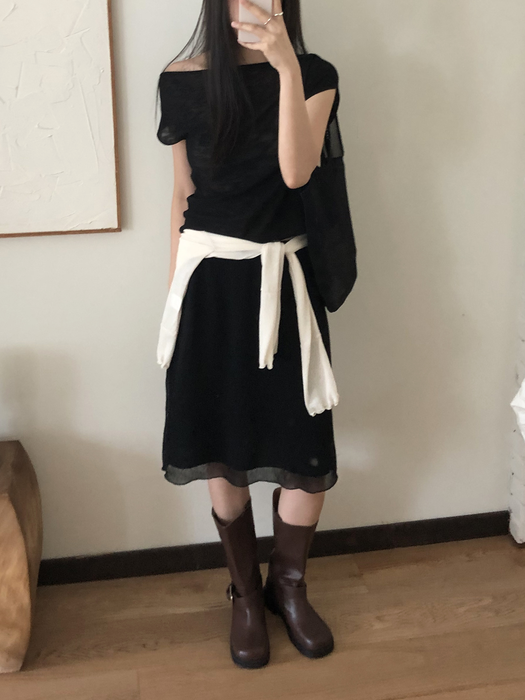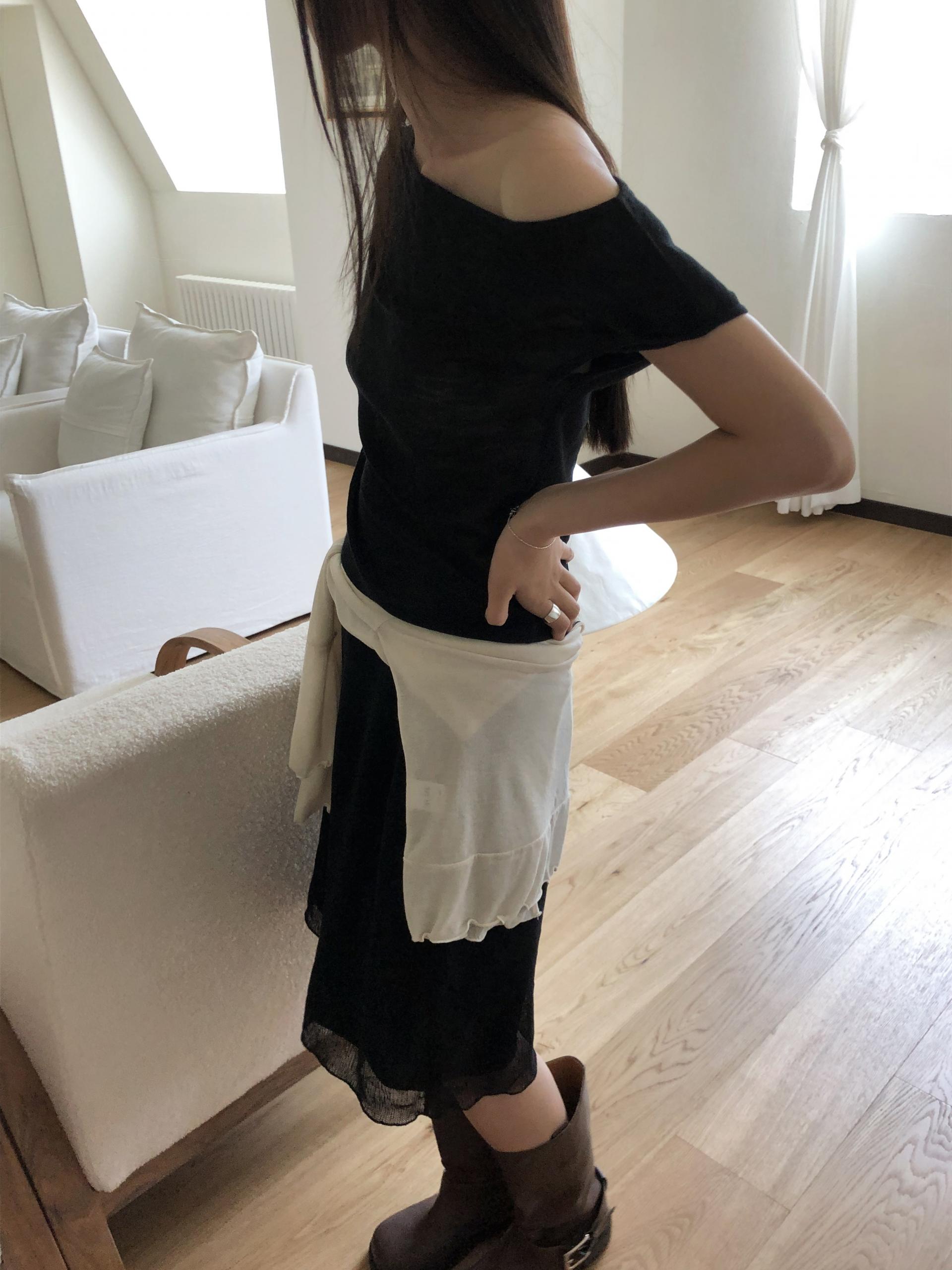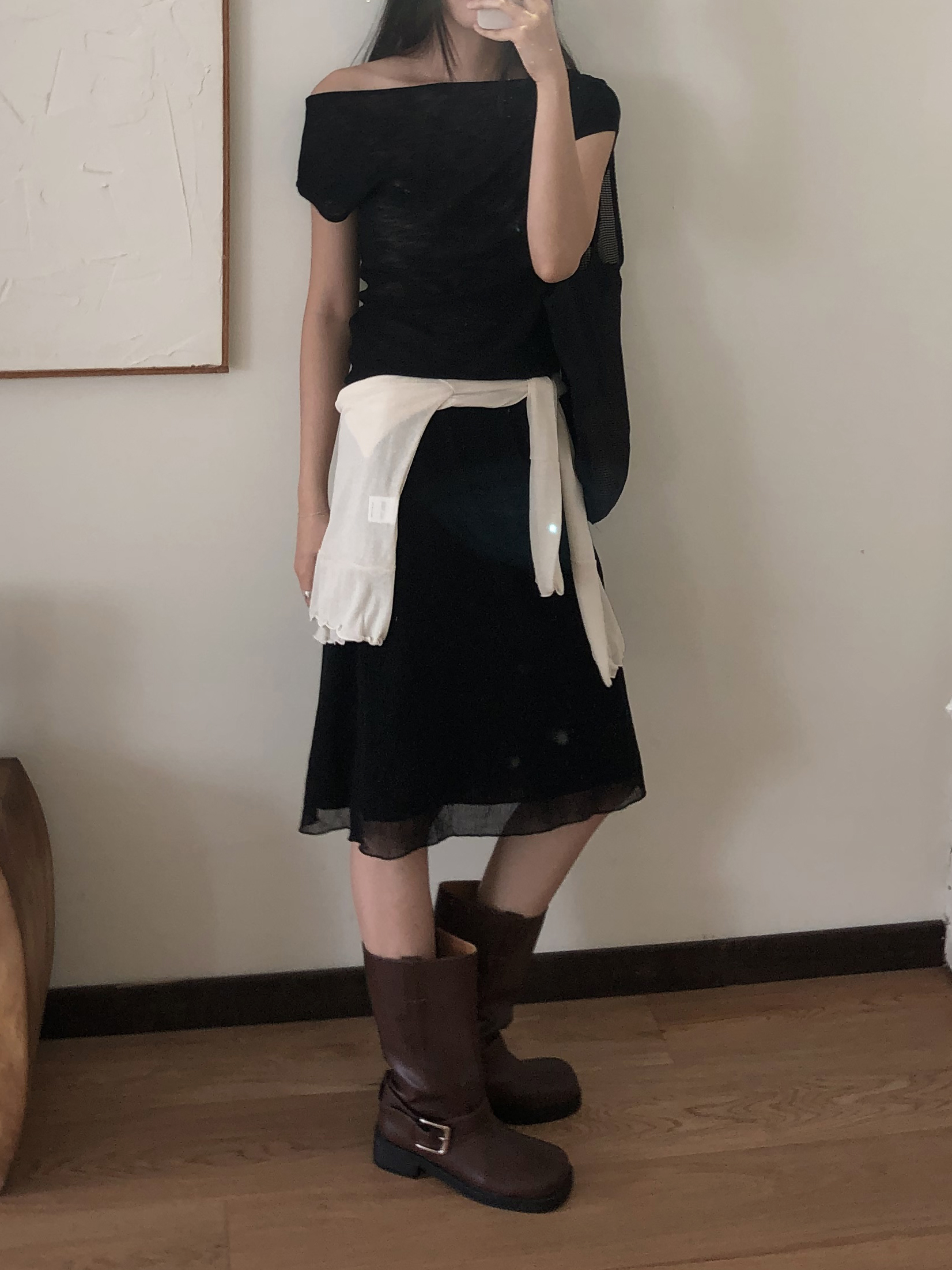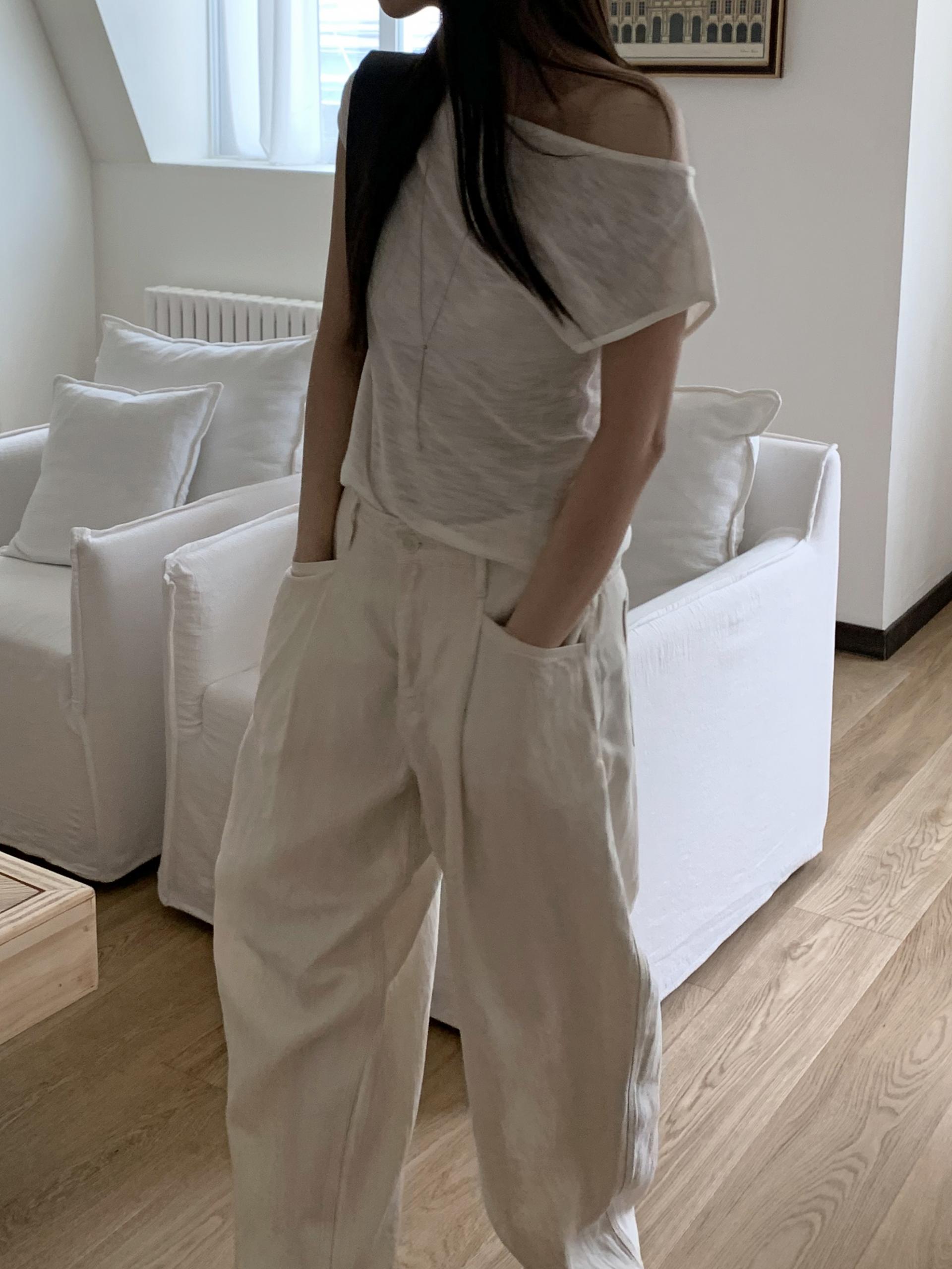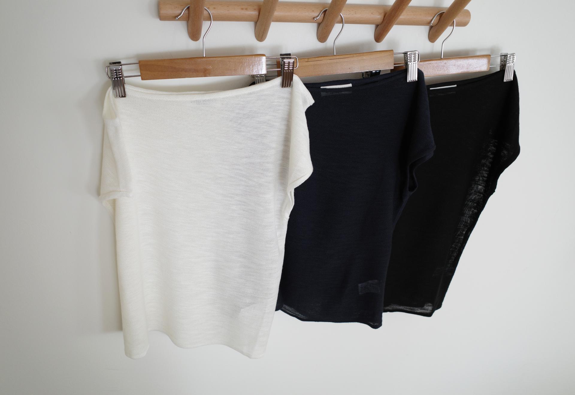 * 얇고 드라이한 촉감의 니트 소재로 제작된 썸머 오프숄더 니트입니다. 어깨 라인이 언발란스로 디자인되어 한쪽 어깨를 내려 착용하는 타입입니다. 세 컬러 모두 비침이 있는 편입니다. 스킨톤의 이너 착용을 추천드립니다 !