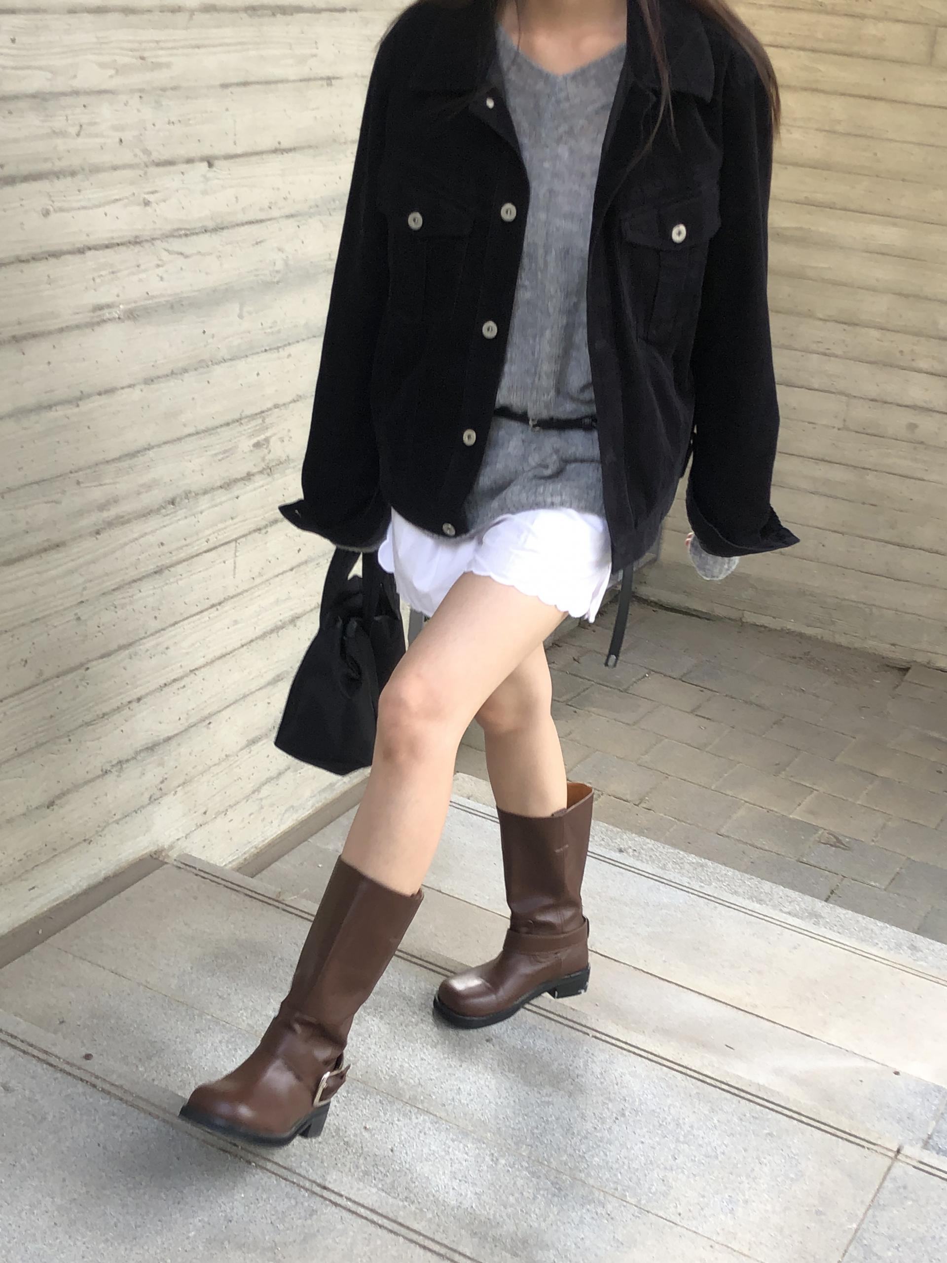 꽈배기 모양의 니팅과 볼드한 브이넥라인이 포인트가 됩니다. 소매와 전체적인 기장도 길이감이 있어 단정한 느낌보다는 내추럴하고 수수한 느낌으로 스타일링하기 좋습니다.