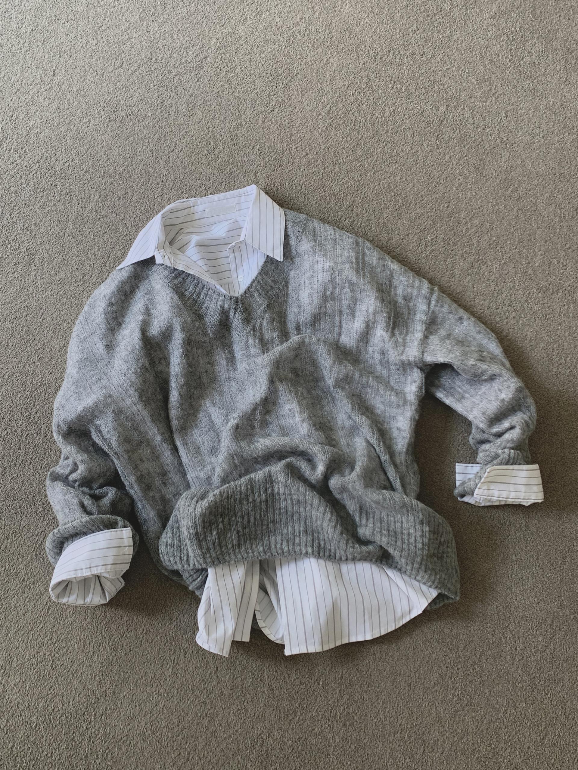오버한 핏이라 단독은 물론 셔츠나 얇은 티셔츠를 안쪽에 레이어드 하기에도 좋아요. 니트 자체가 가벼워서 레이어드해도 무겁거나 하지 않아 좋더라구요. !