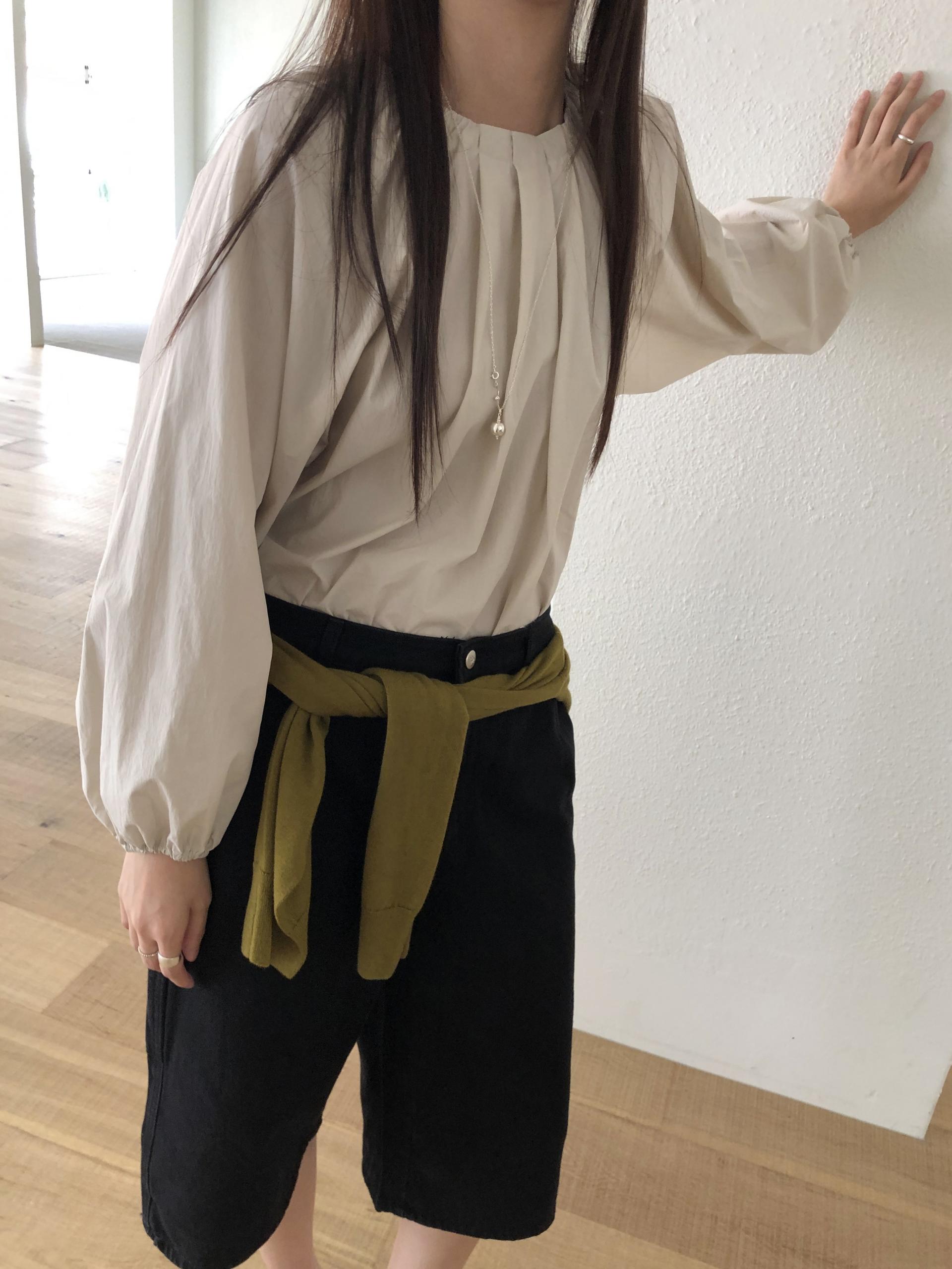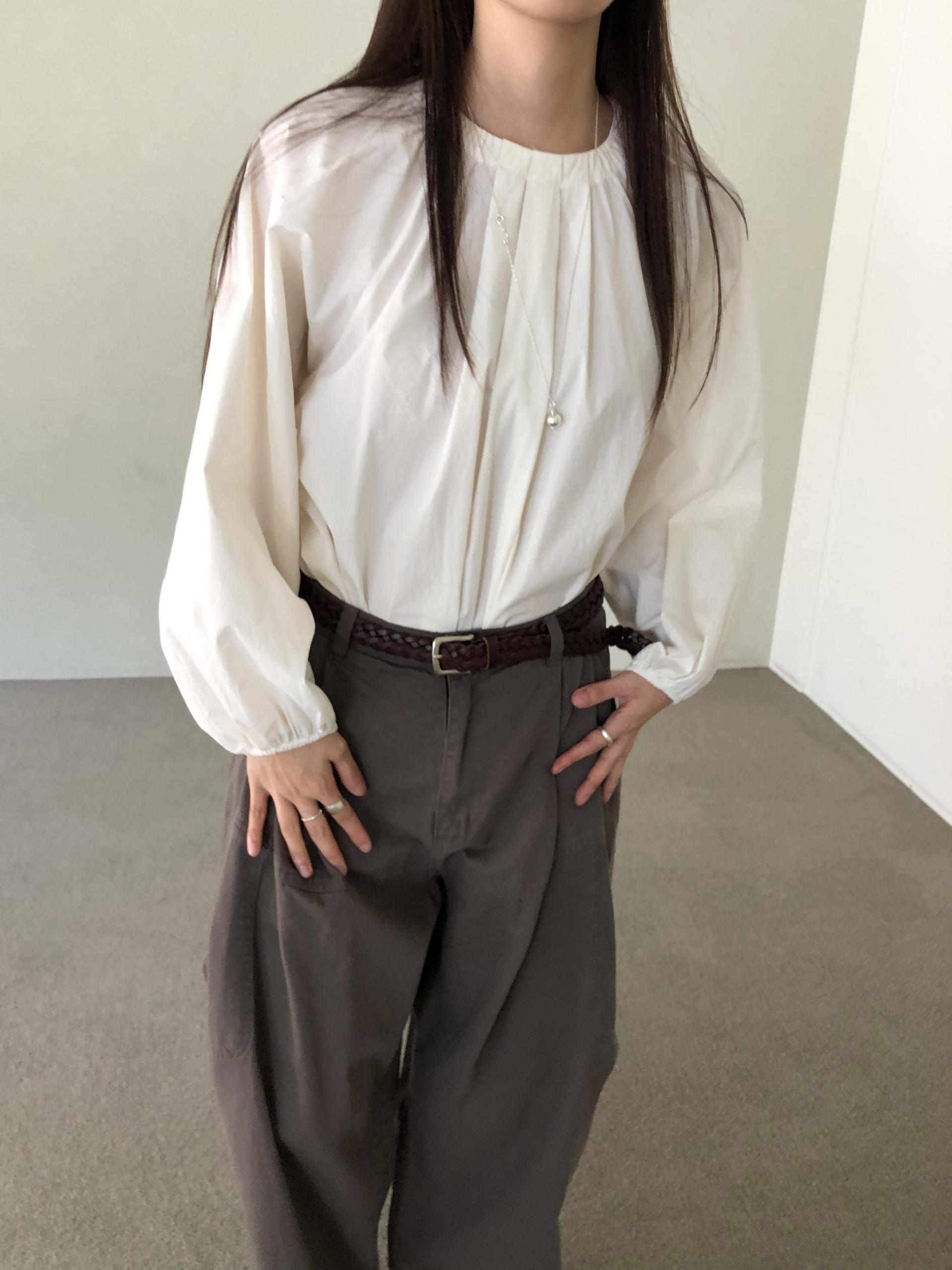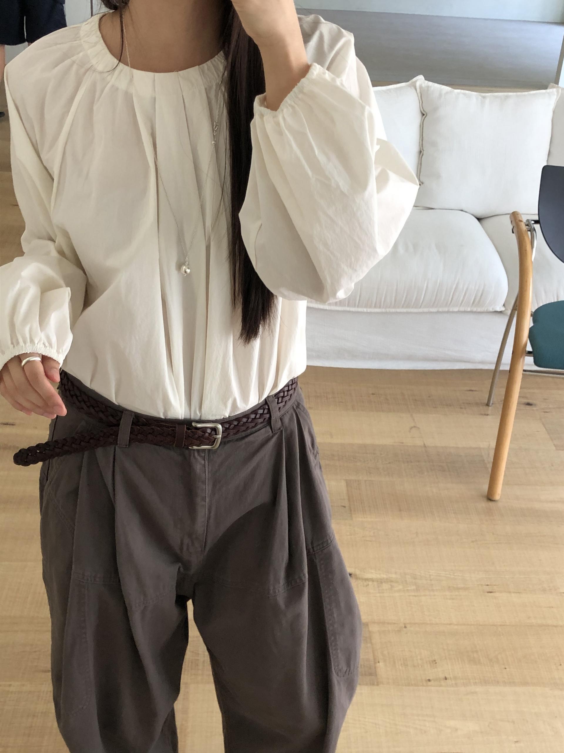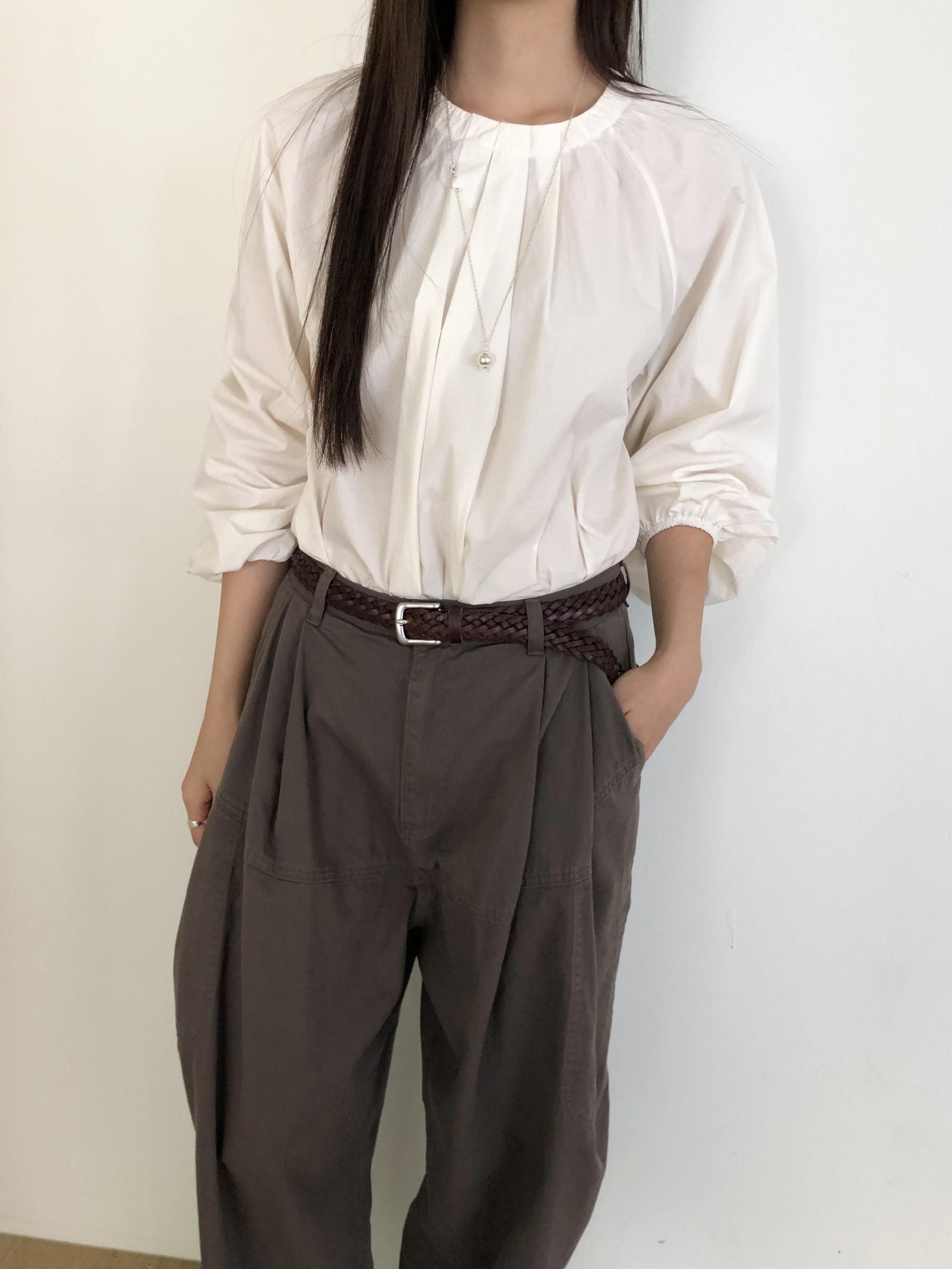 넥라인을 따라 잡힌 디테일에서부터 전체적으로 볼륨감있는 실루엣이 이어집니다. 잔잔한 주름이 잡힌 넥의 가운데 부분을 따라 핀턱을 잡았어요.