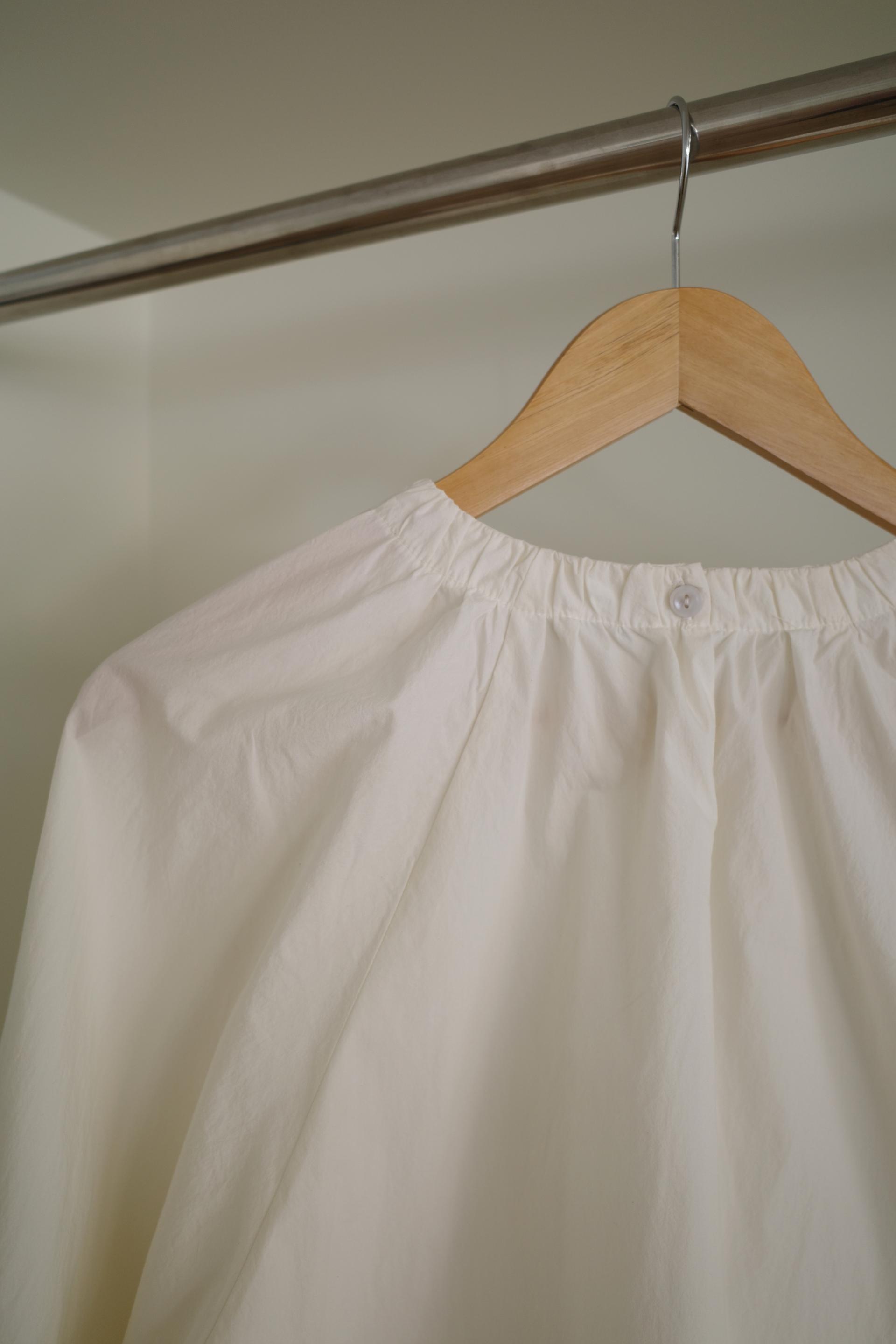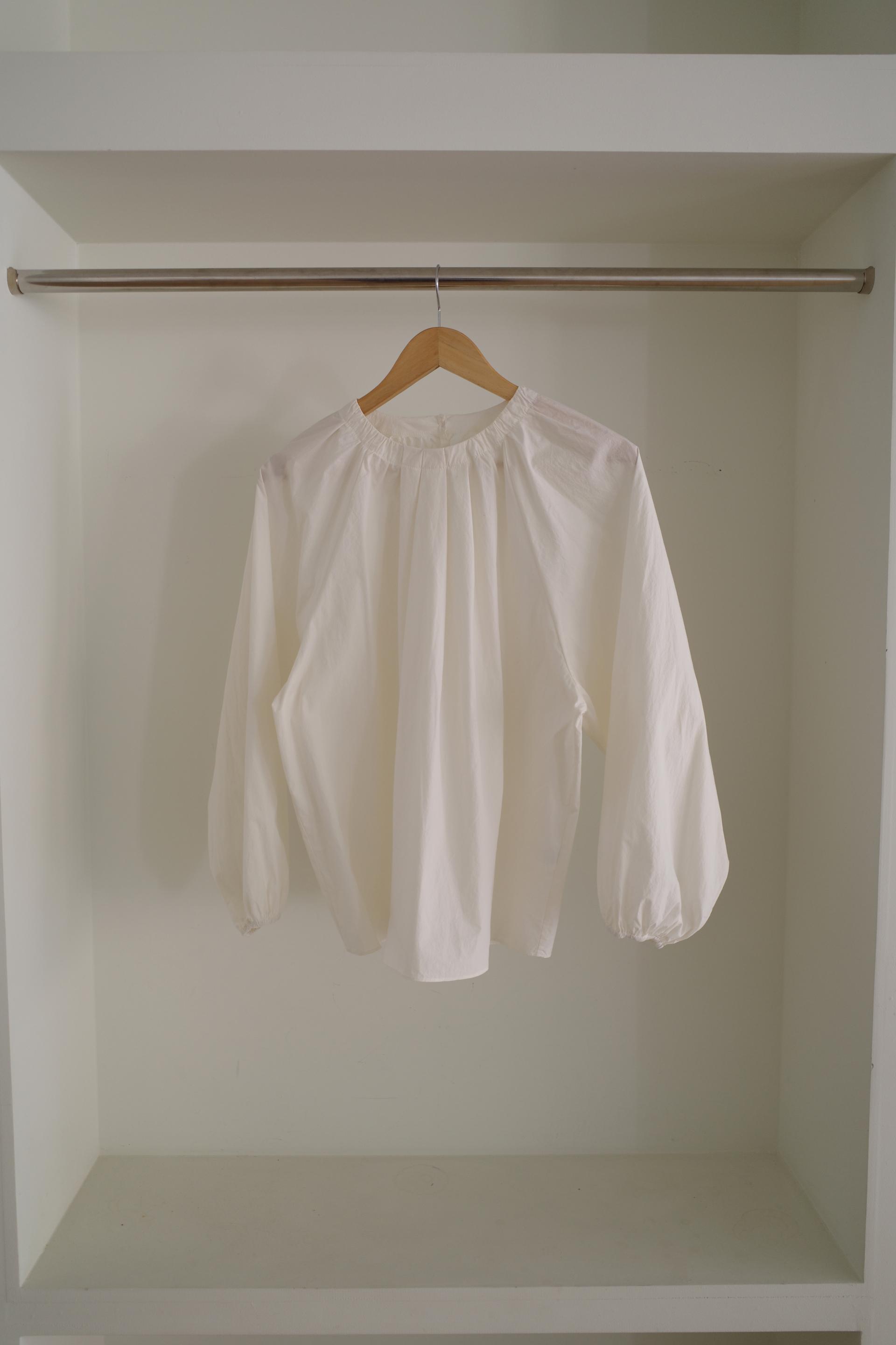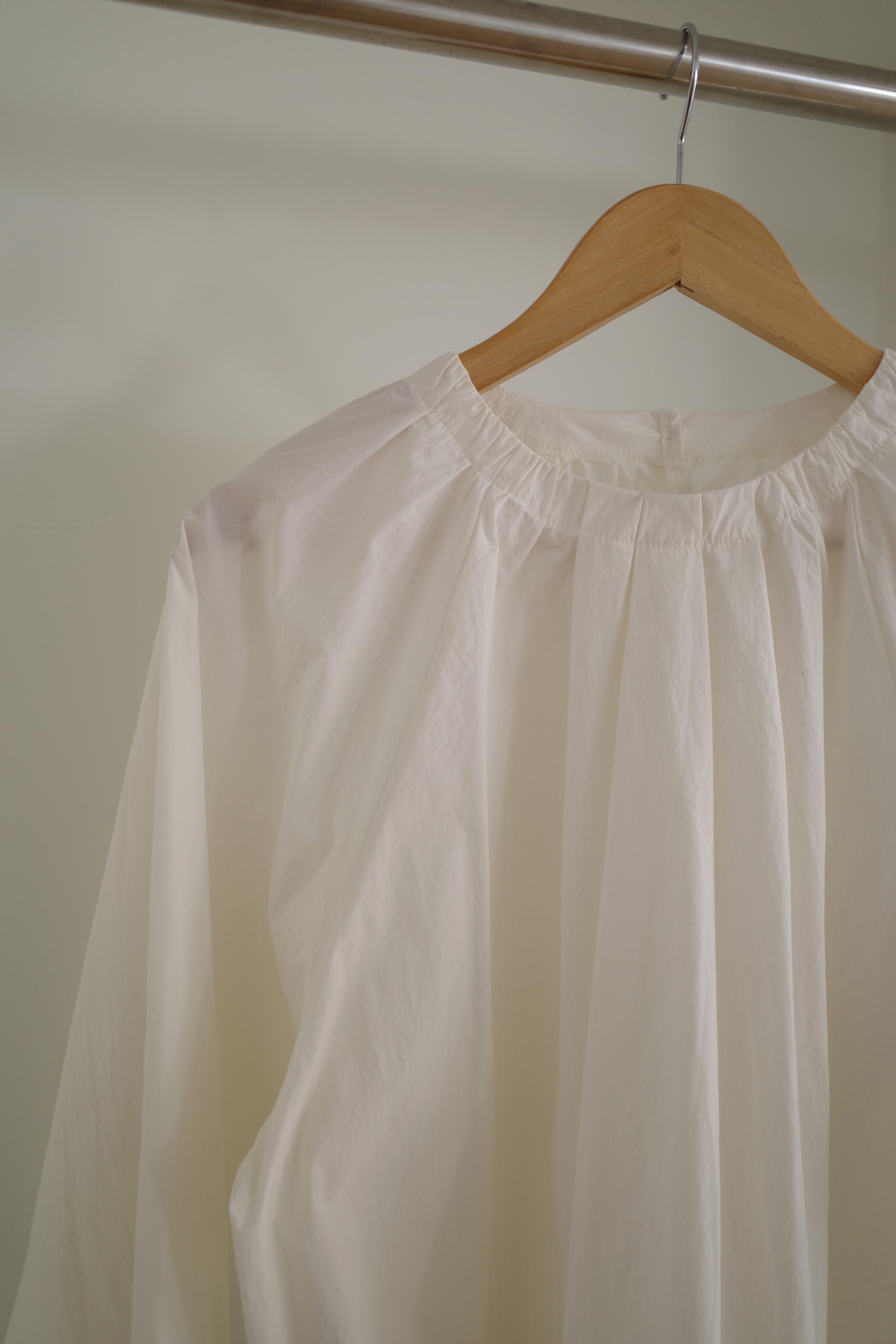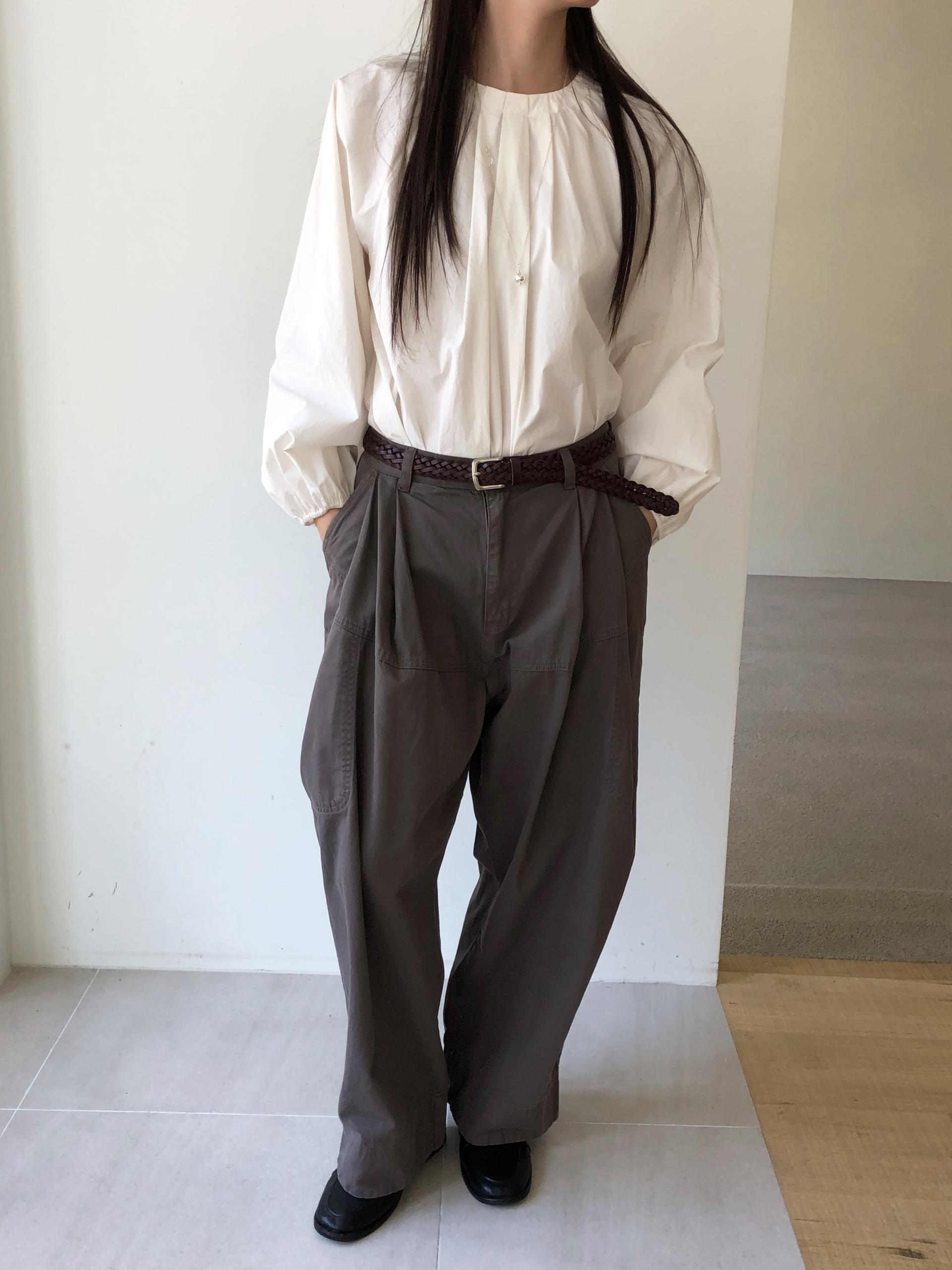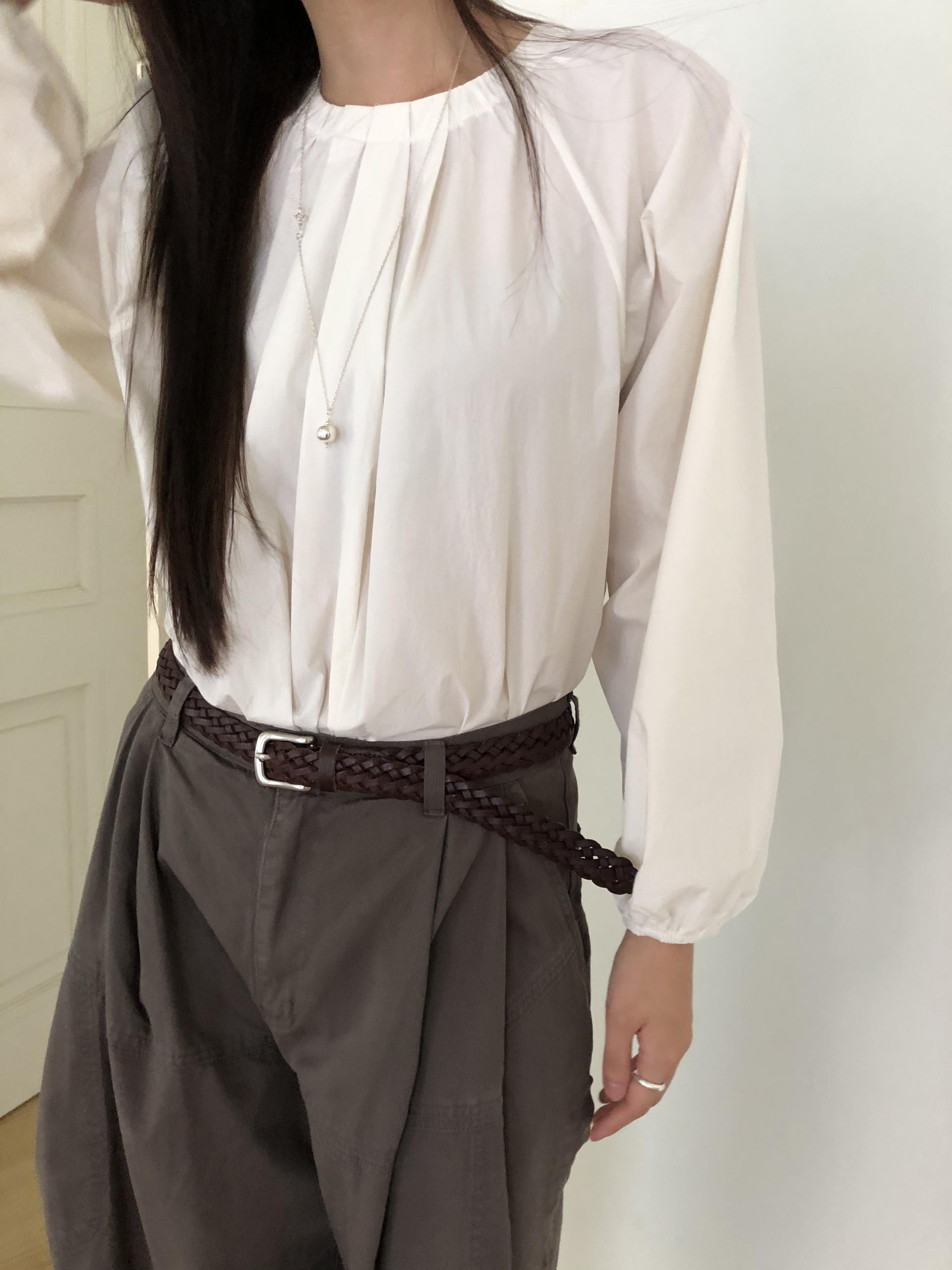 넥라인을 따라 잡힌 디테일에서부터 전체적으로 볼륨감있는 실루엣이 이어집니다. 잔잔한 주름이 잡힌 넥의 가운데 부분을 따라 핀턱을 잡았어요.