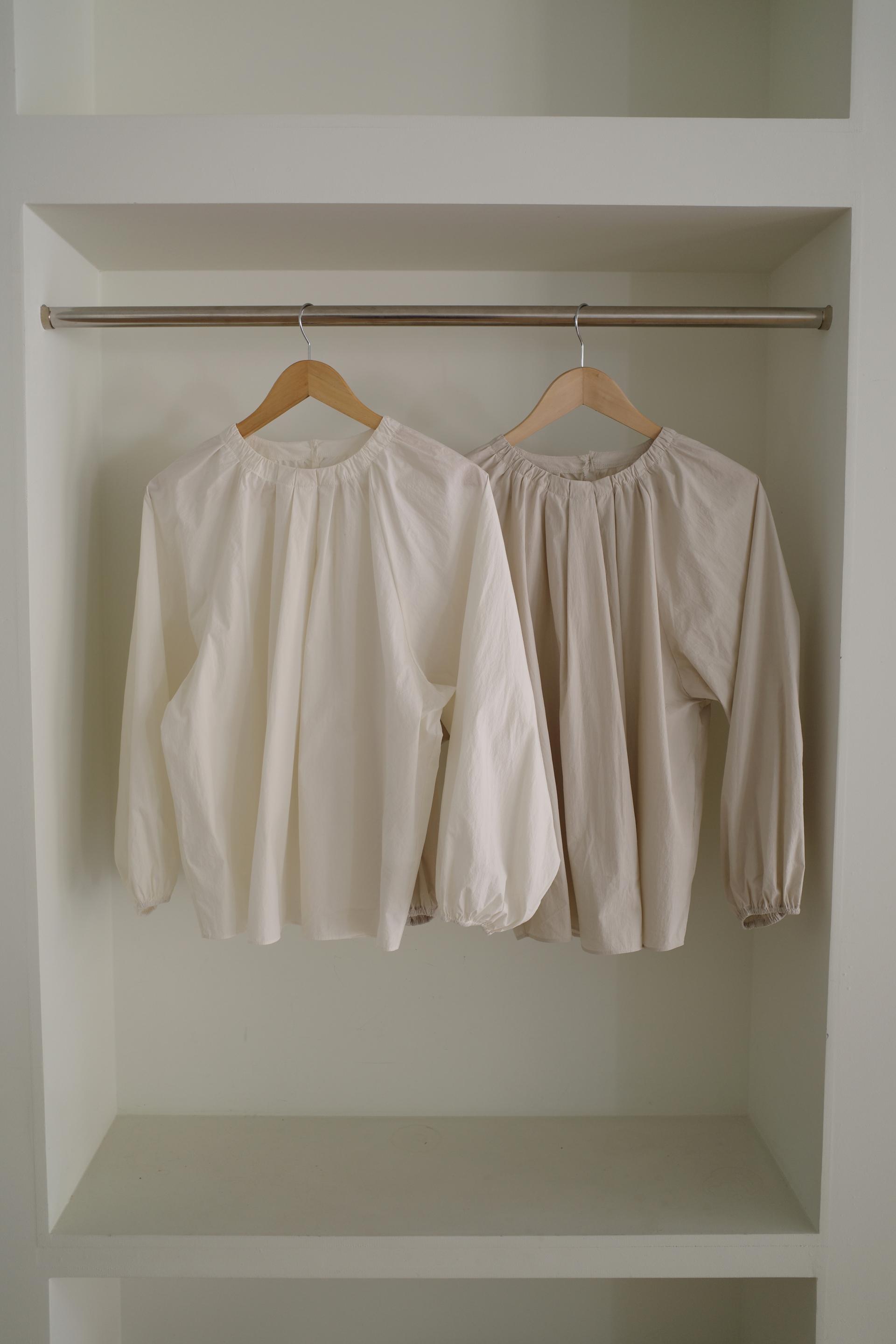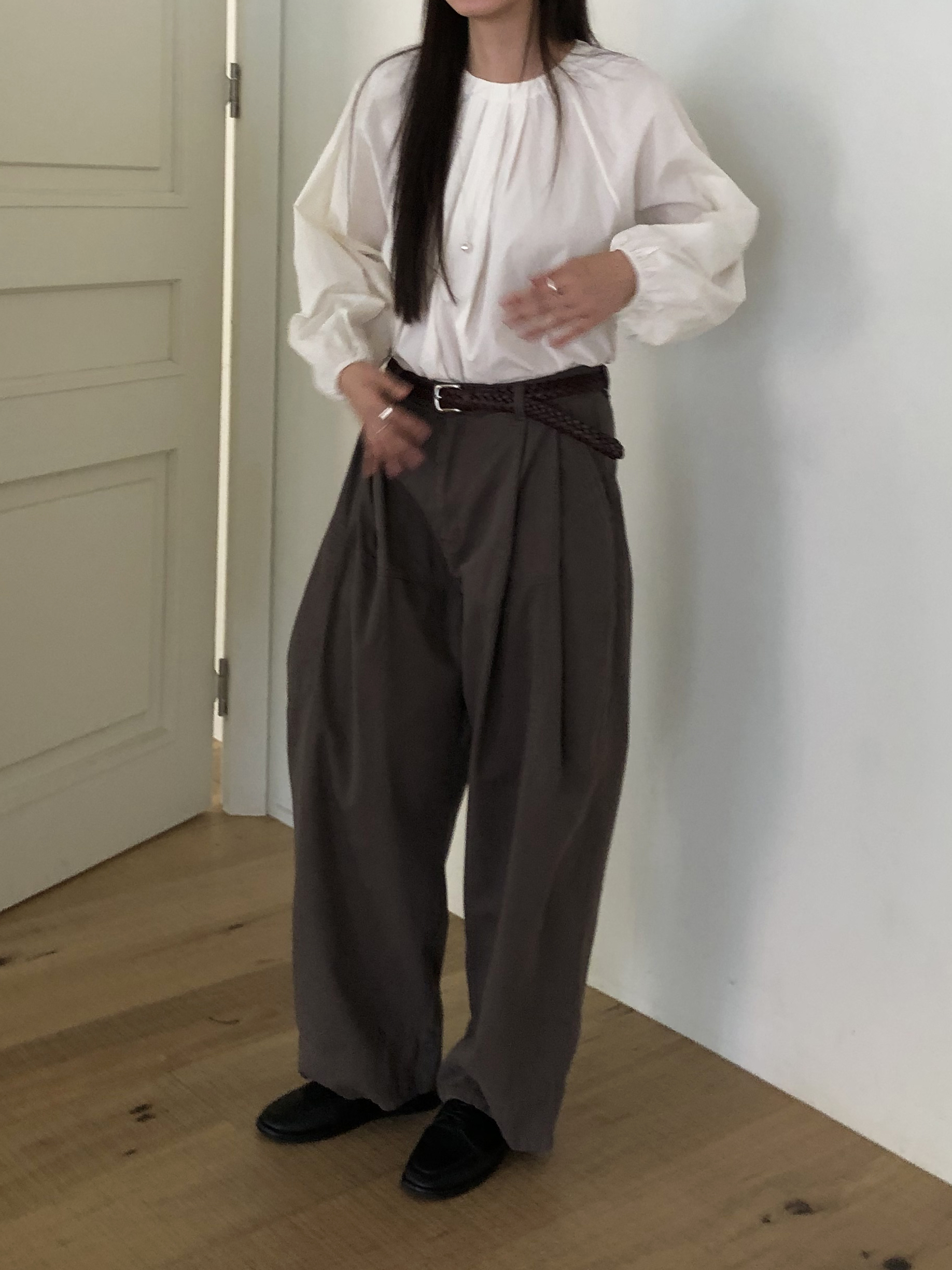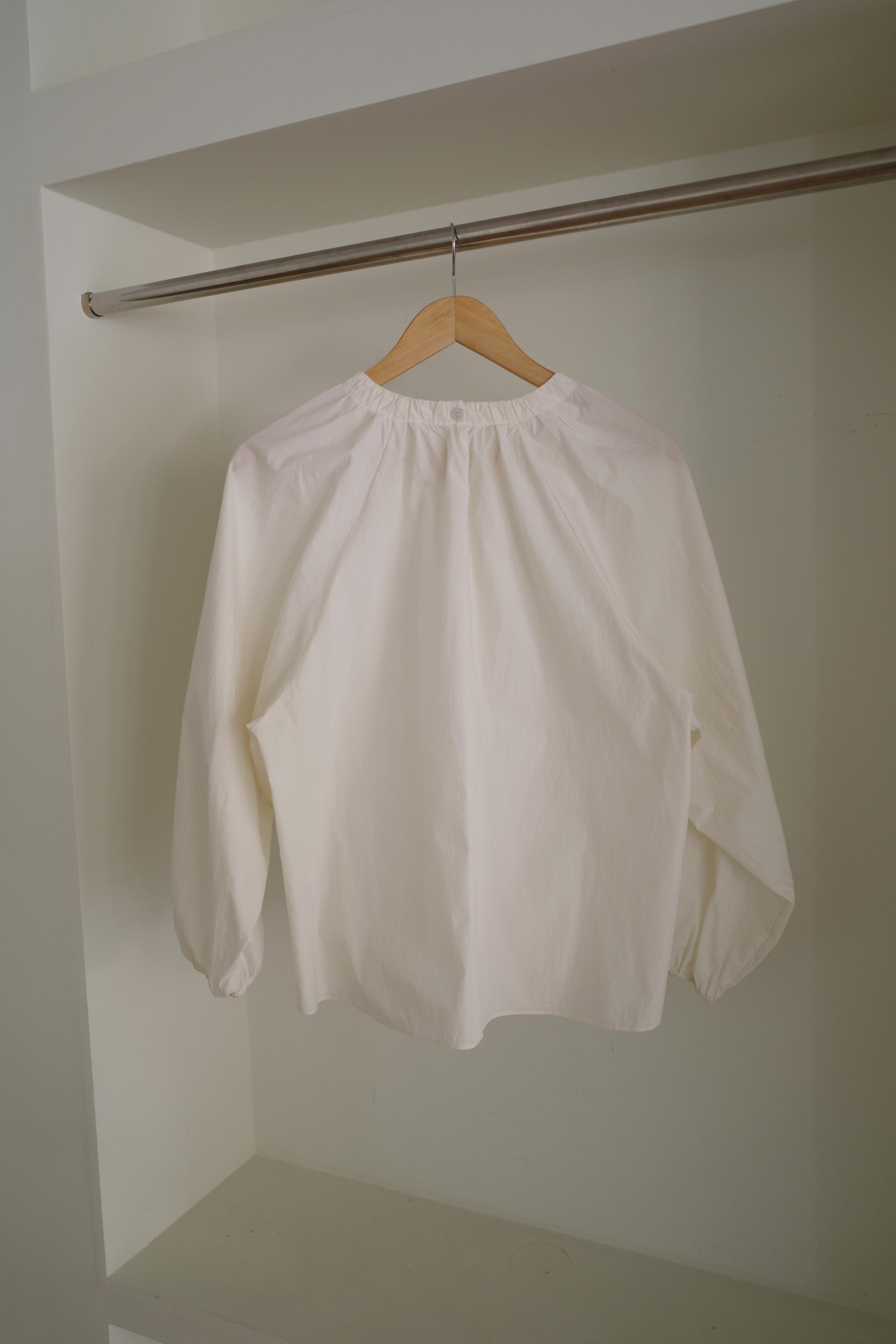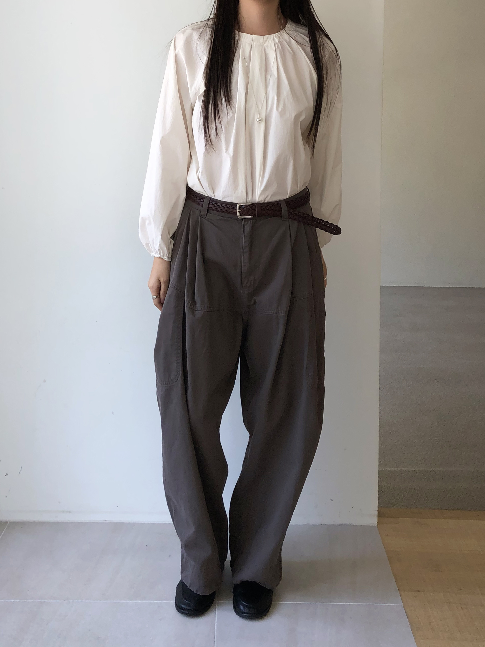 넥라인을 따라 잡힌 디테일에서부터 전체적으로 볼륨감있는 실루엣이 이어집니다. 잔잔한 주름이 잡힌 넥의 가운데 부분을 따라 핀턱을 잡았어요.