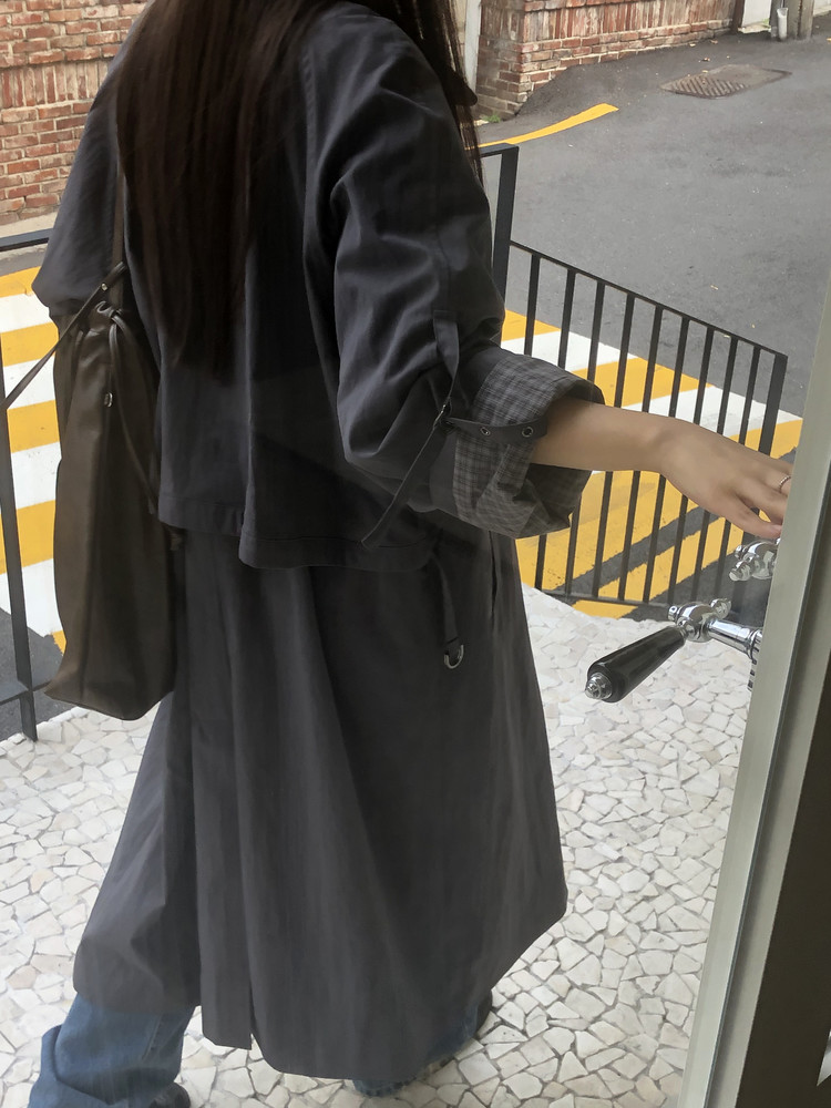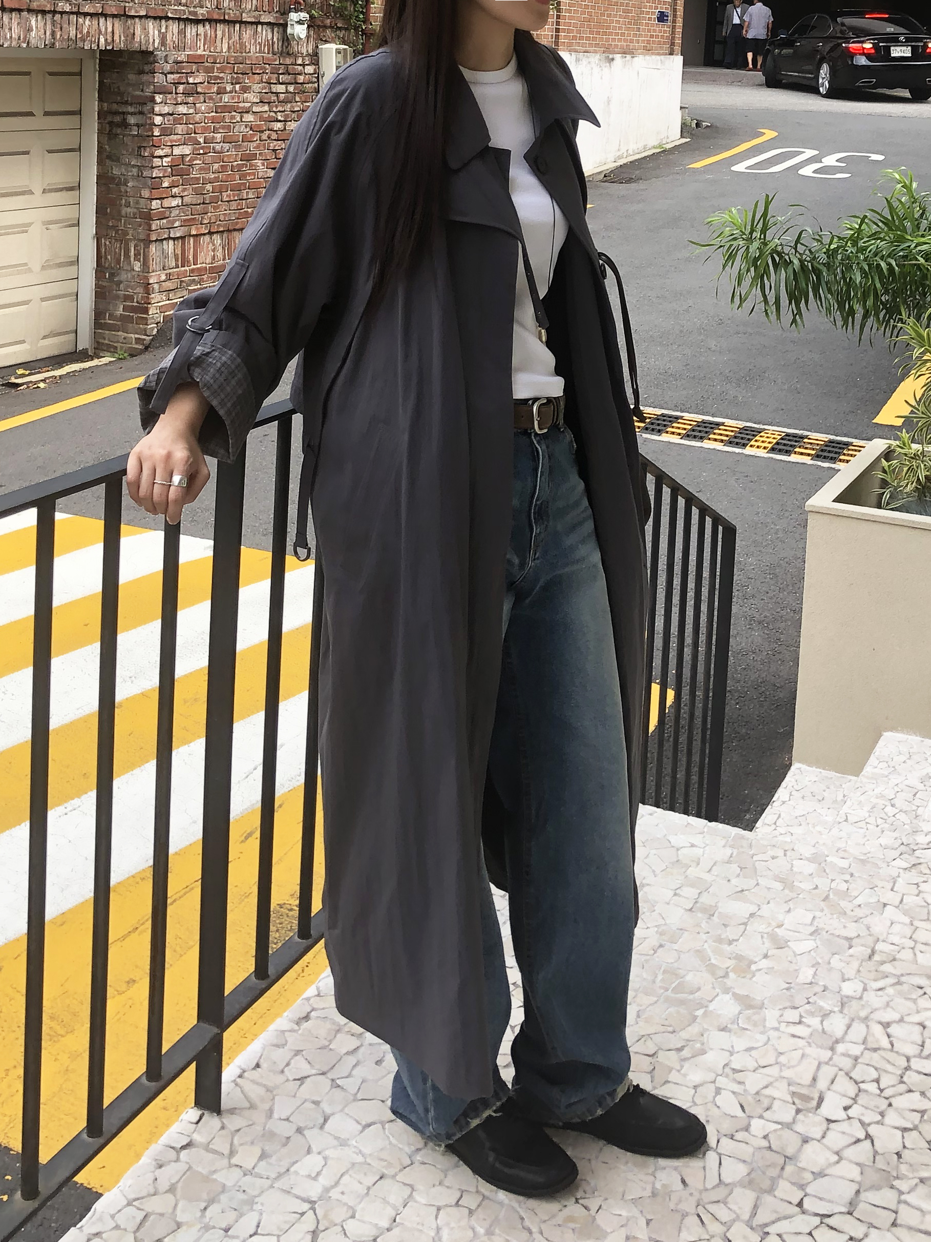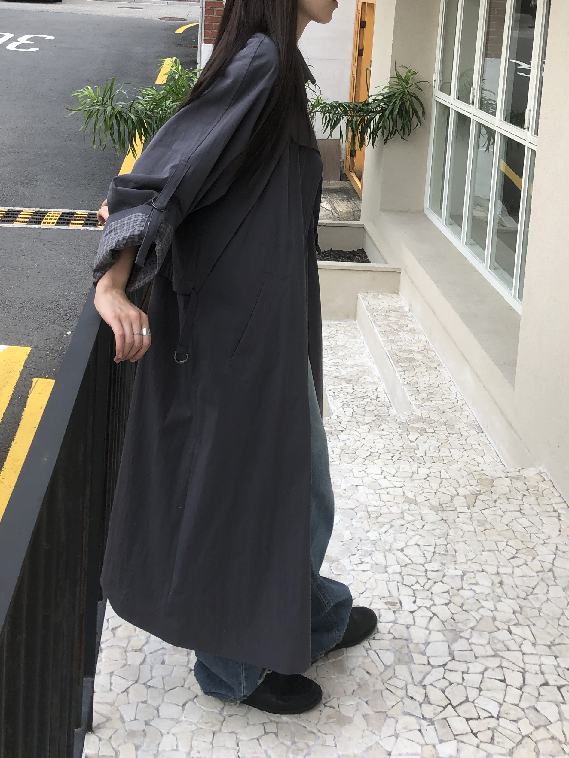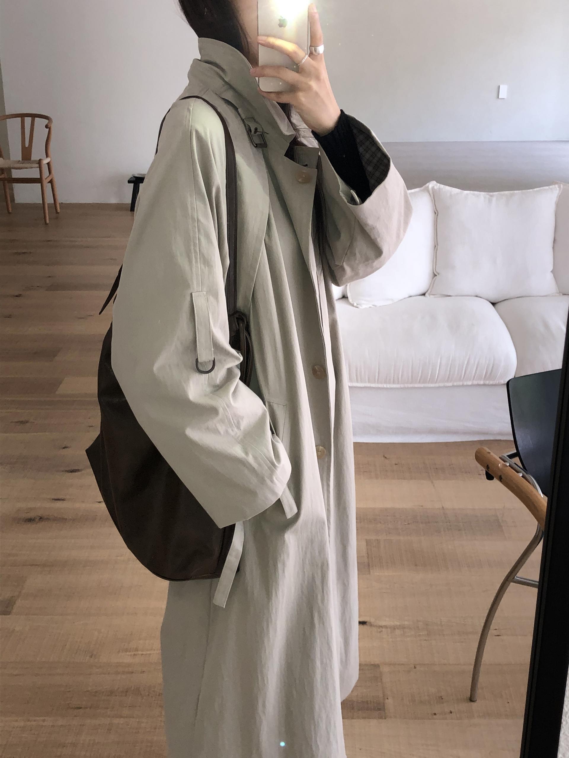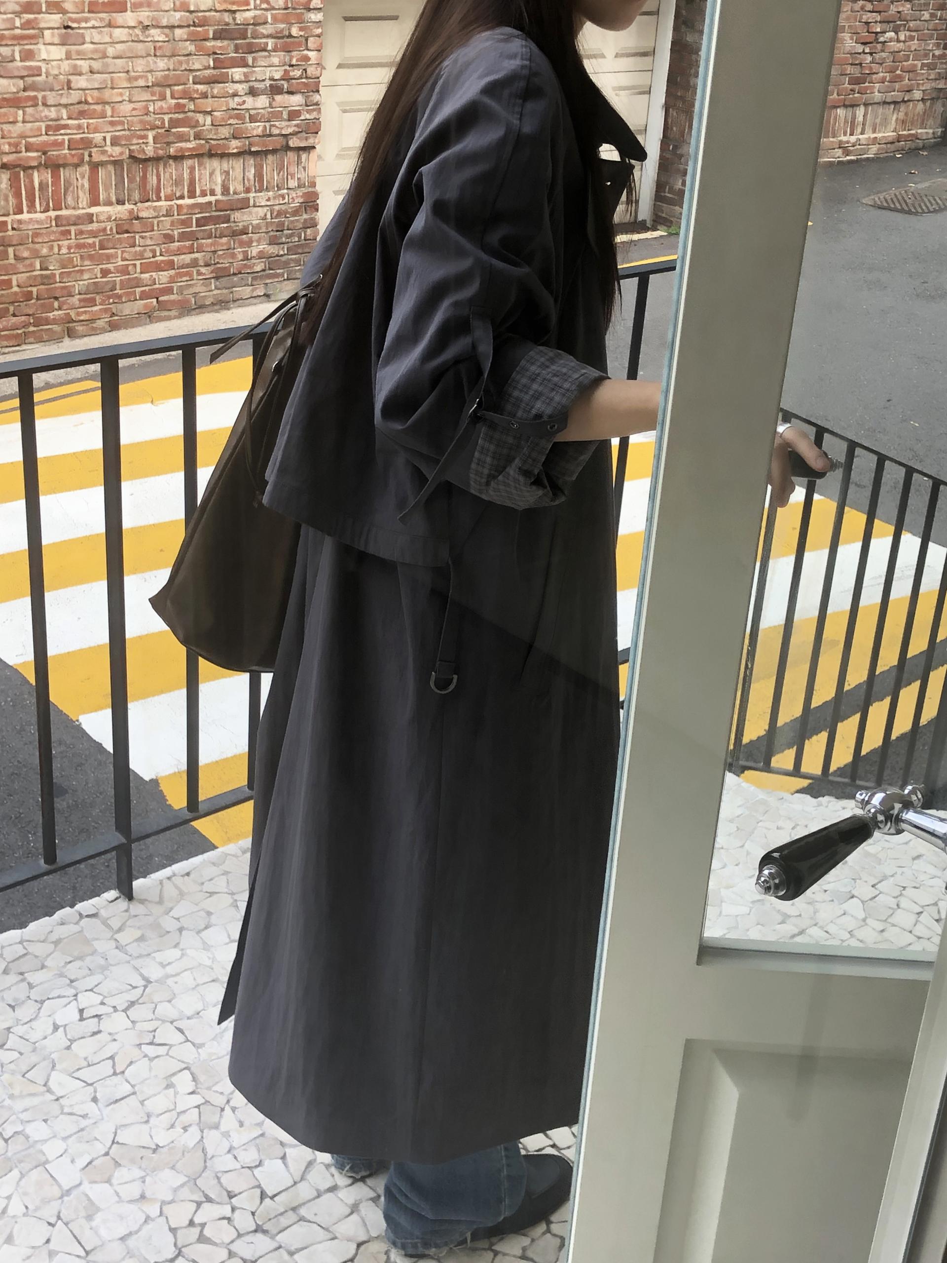 면+나일론 혼방의 살짝 매트한 질감을 가지고 있고, 전체적인 디자인이 도시적인 분위기를 풍기지만 체크 패턴의 안감이 슬쩍 드러나면 빈티지함이 더해져 더욱 매력적인 트렌치입니다.