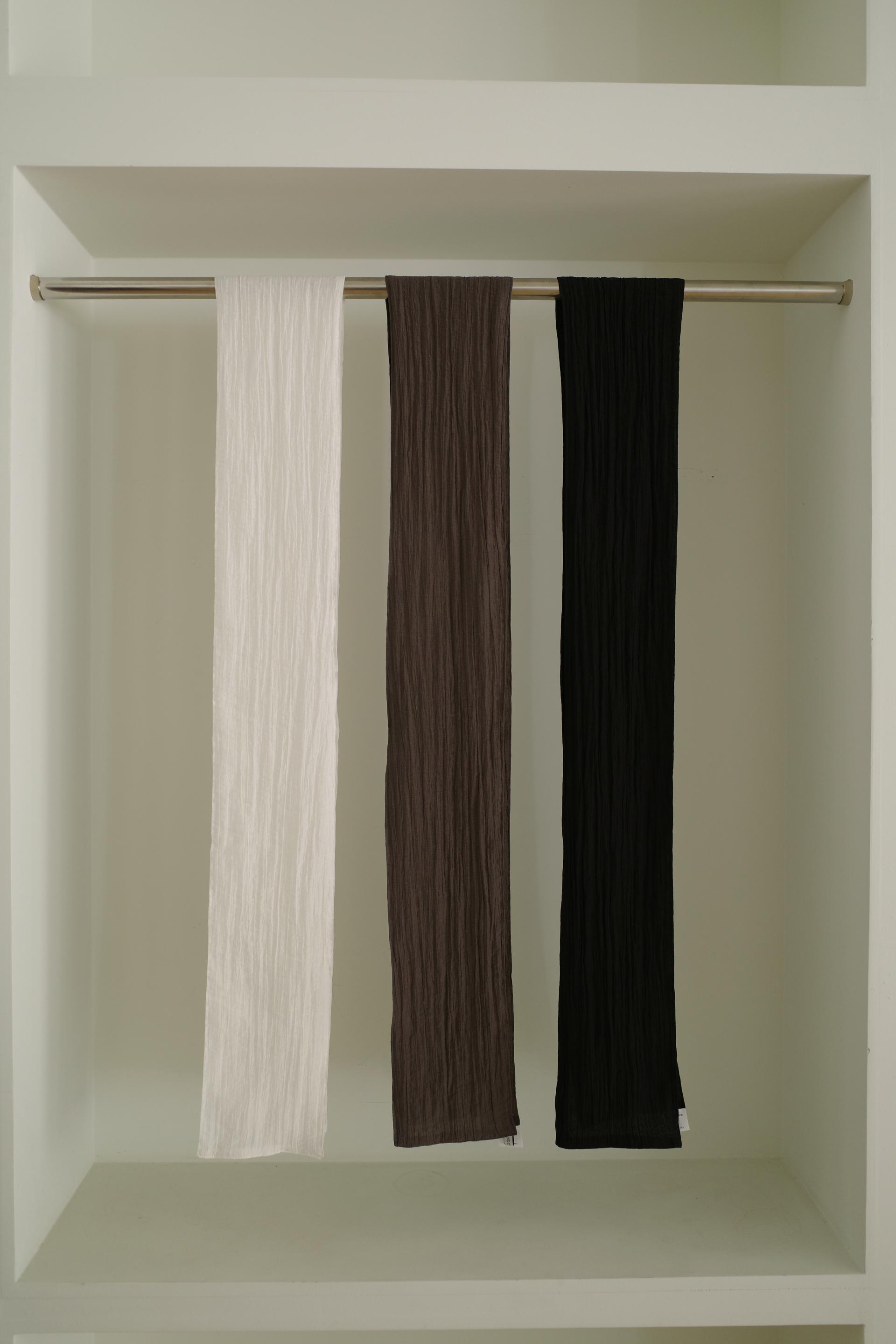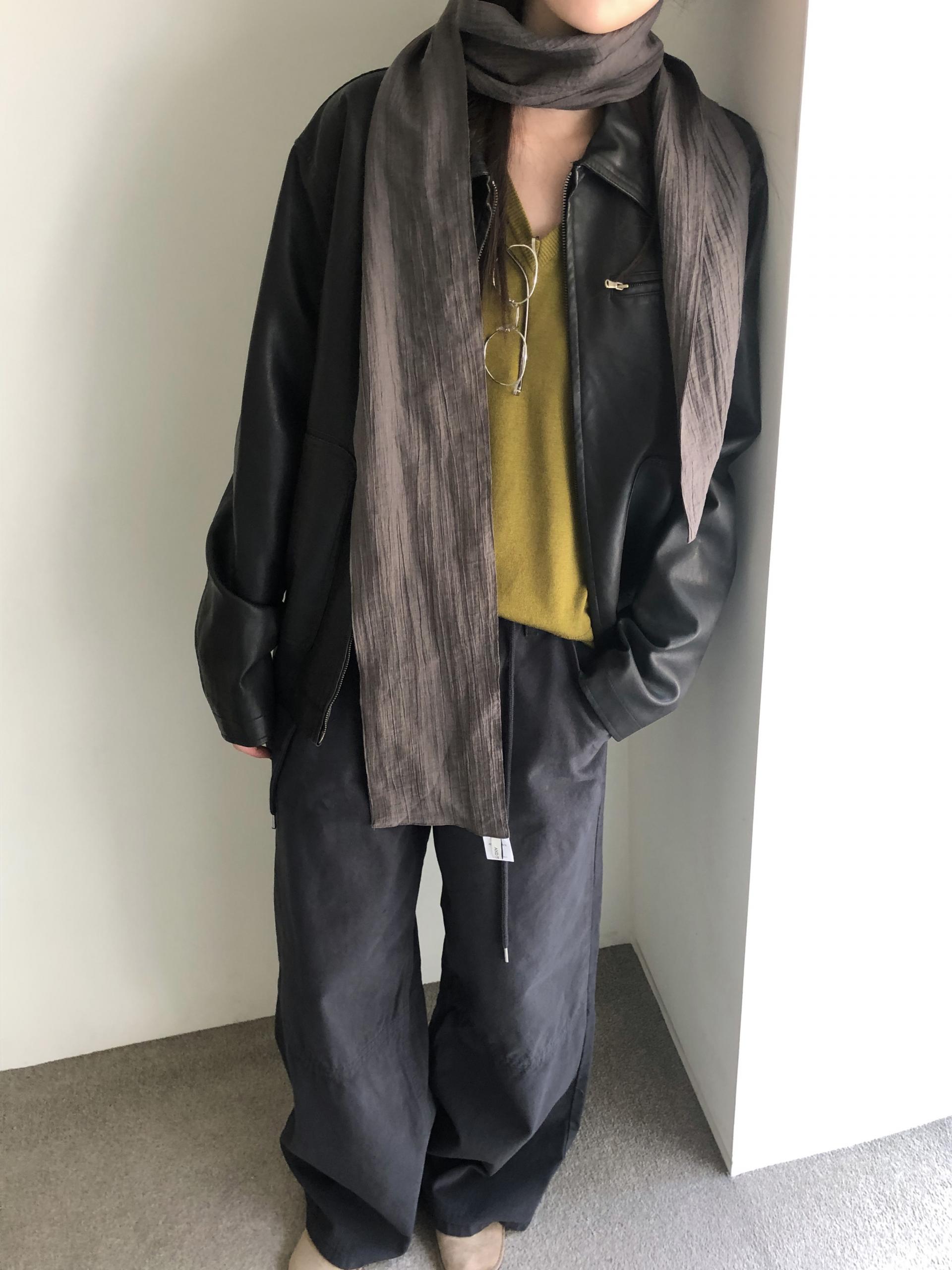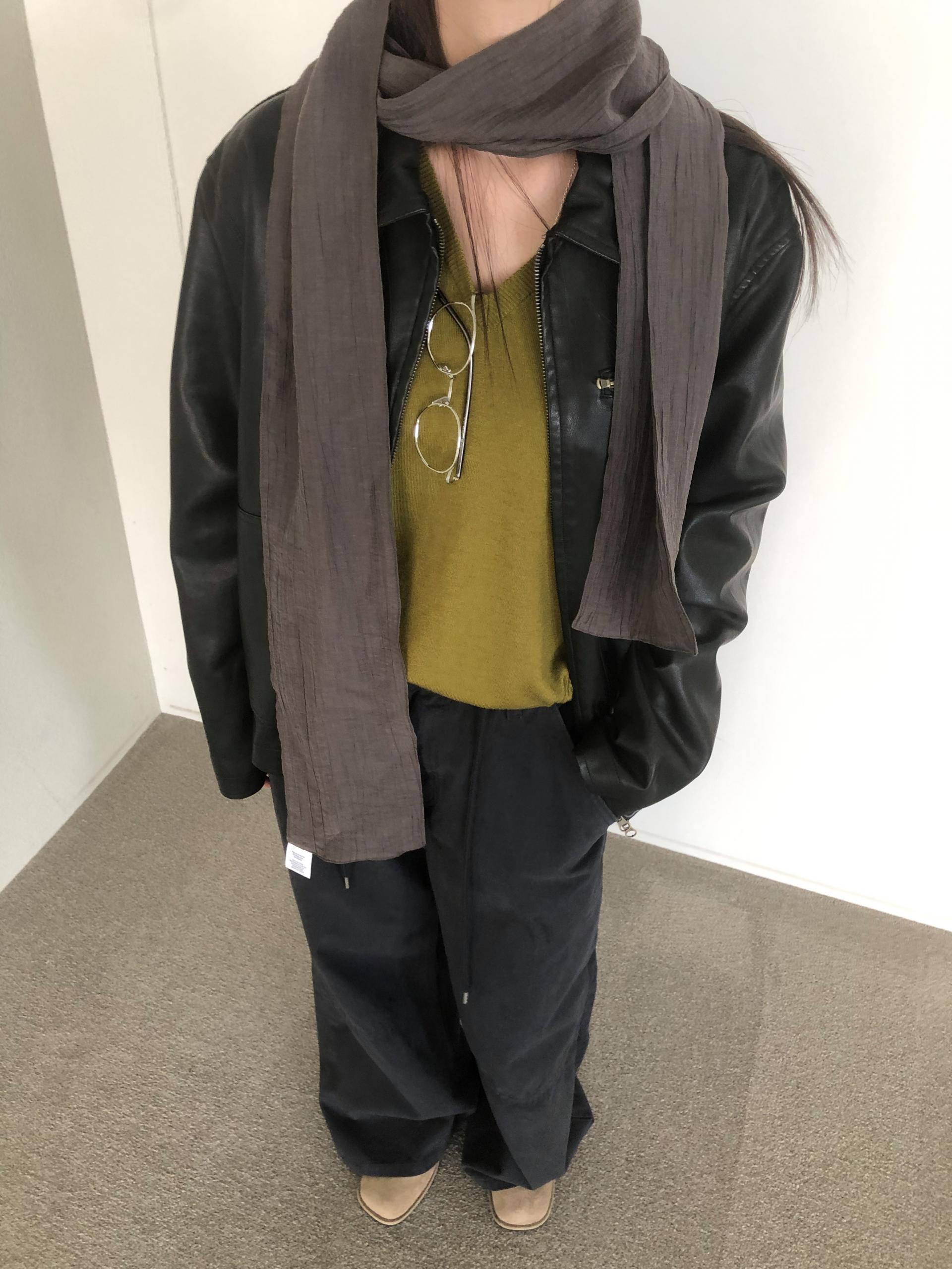링클 소재로 제작되어 자연스러운 멋이 느껴집니다. 충분히 긴 길이로 여러 번 감아 연출하기 좋으나 한번 툭 둘러주는 게 가장 멋있었어요.