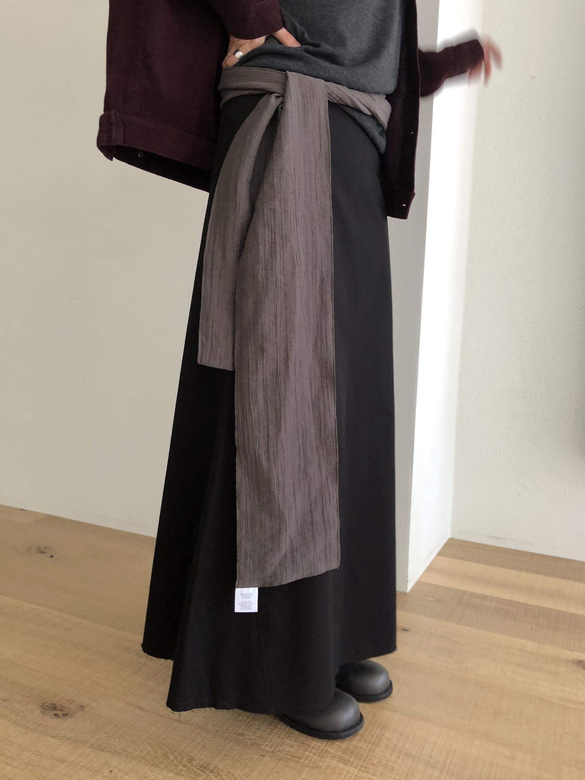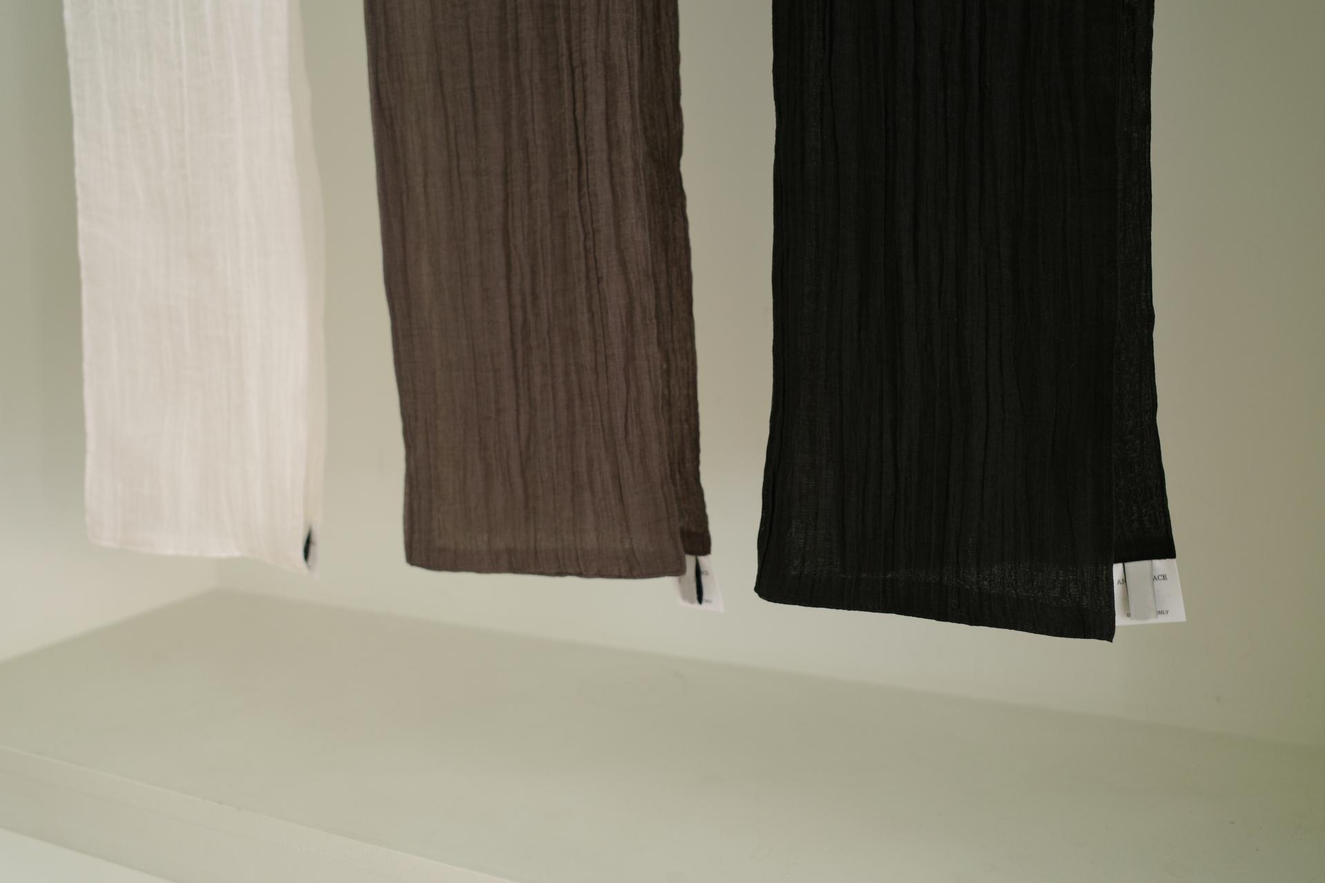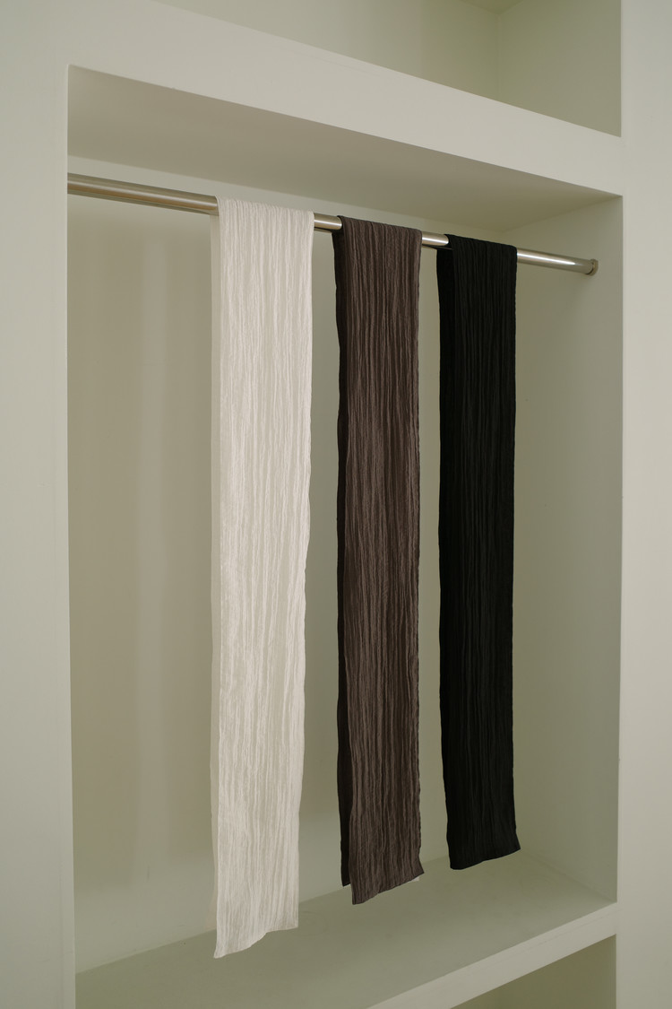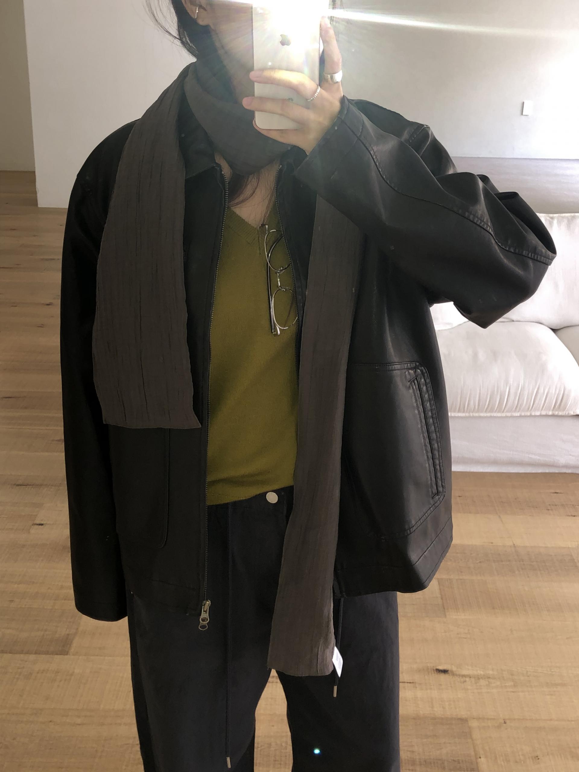 링클 소재로 제작되어 자연스러운 멋이 느껴집니다. 충분히 긴 길이로 여러 번 감아 연출하기 좋으나 한번 툭 둘러주는 게 가장 멋있었어요.