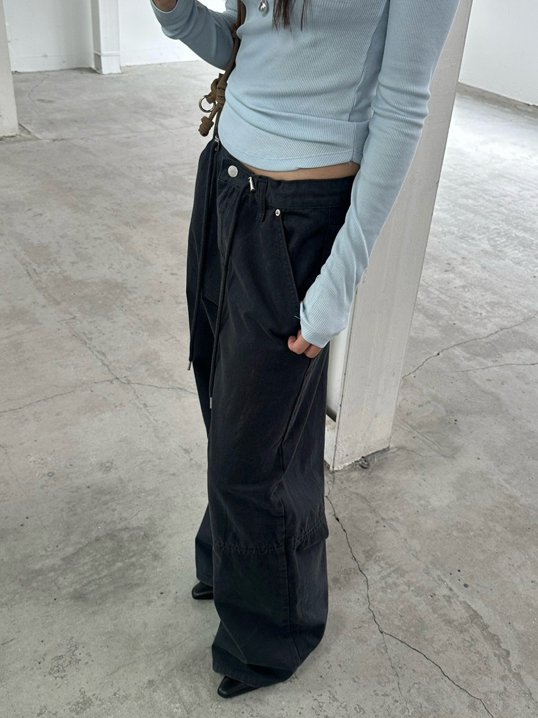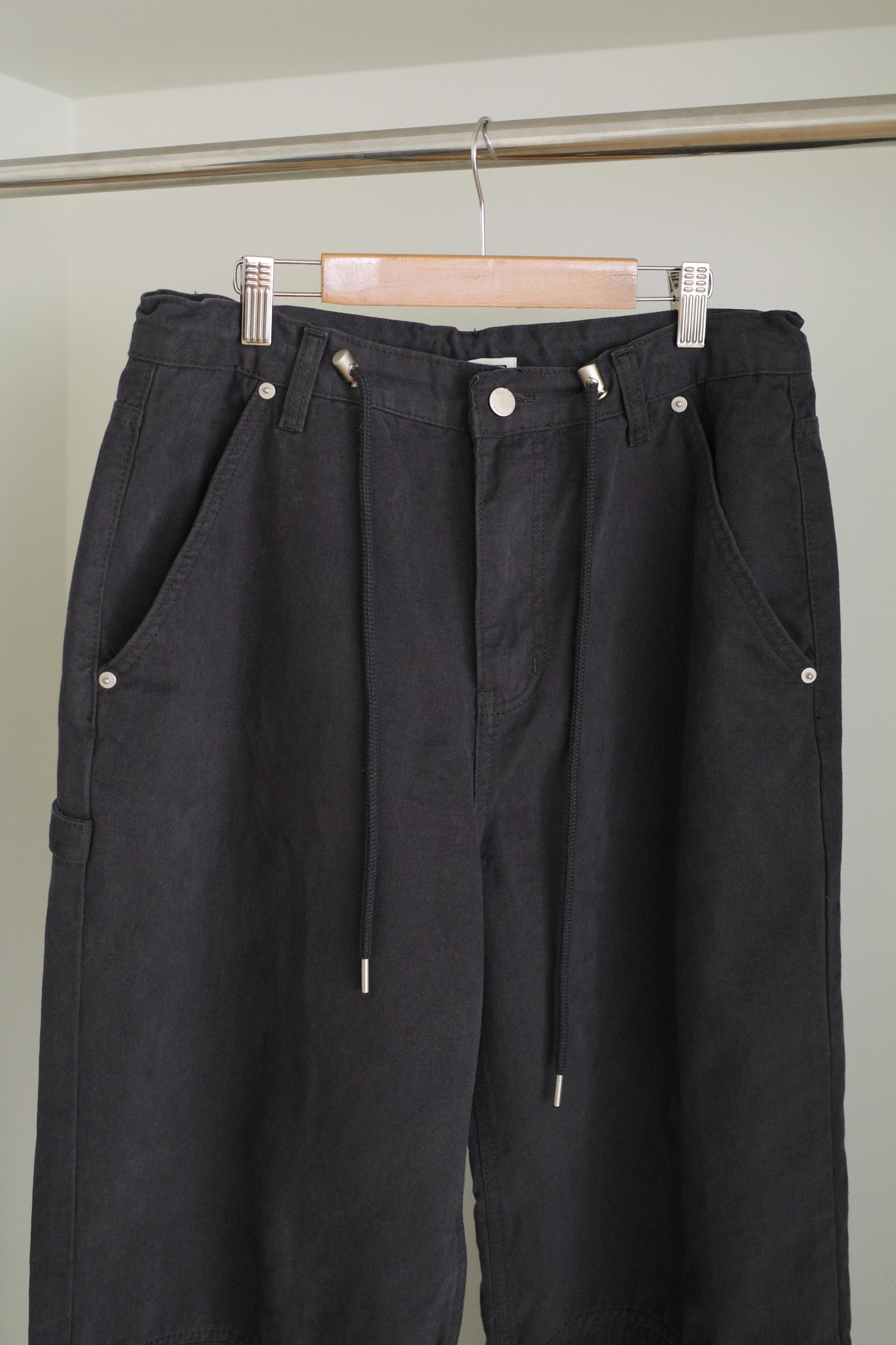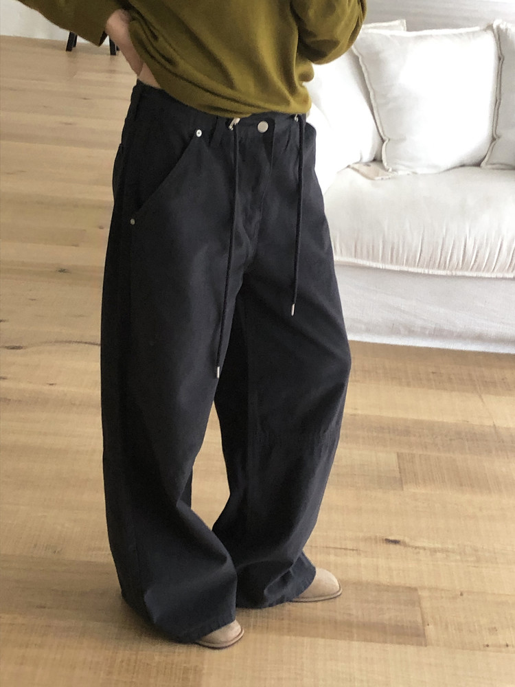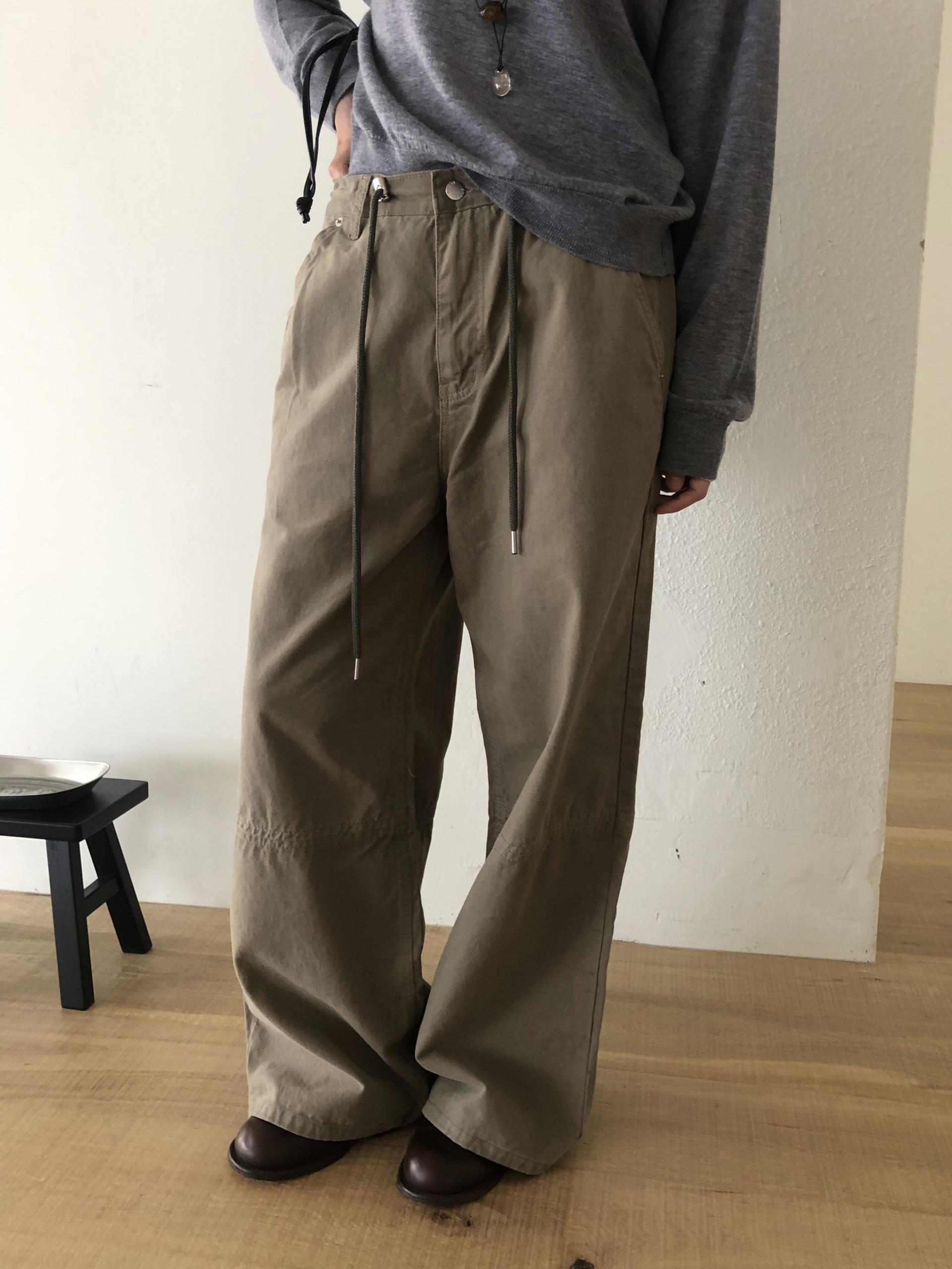 피치 원단 느낌으로 제작되어 터치감이 부드럽고 포근합니다. 여유로운 오버핏에 스트링으로 조절이 가능한 프리사이즈라 내추럴한 무드가 느껴져요. 지퍼와 단추로 1차 클로징이 되며, 프리 사이즈인 허리는 스토퍼로 고정이 됩니다. 스토퍼와 도톰한 스트링 디테일도 퀄리티에 힘을 더해줍니다.