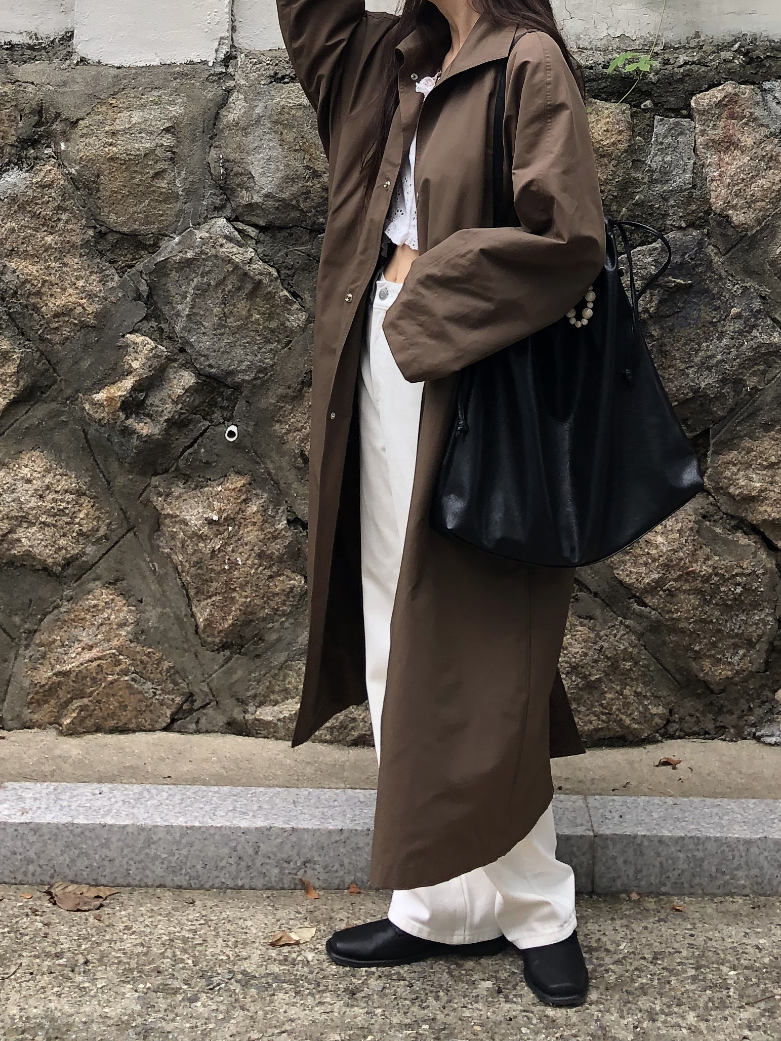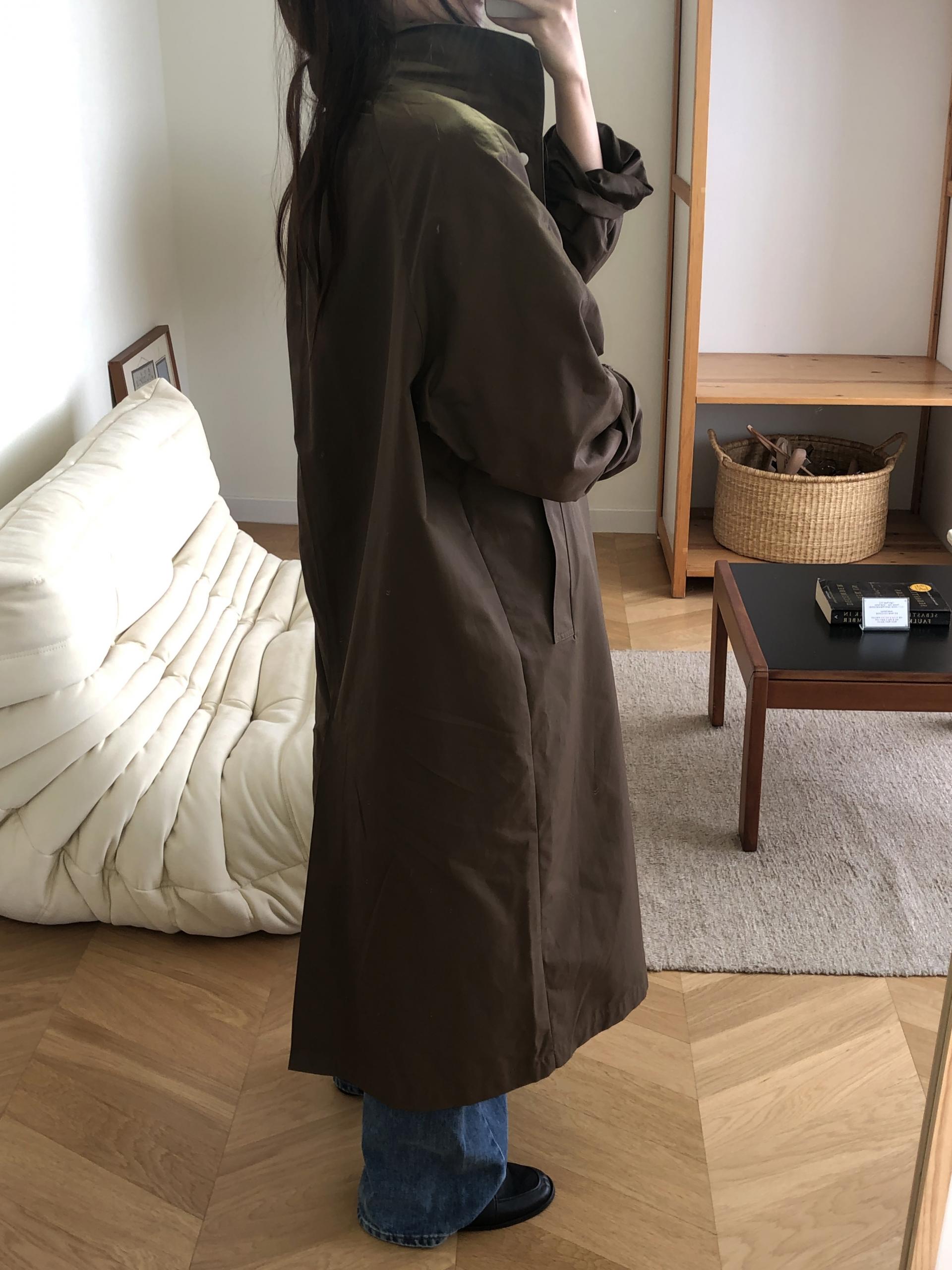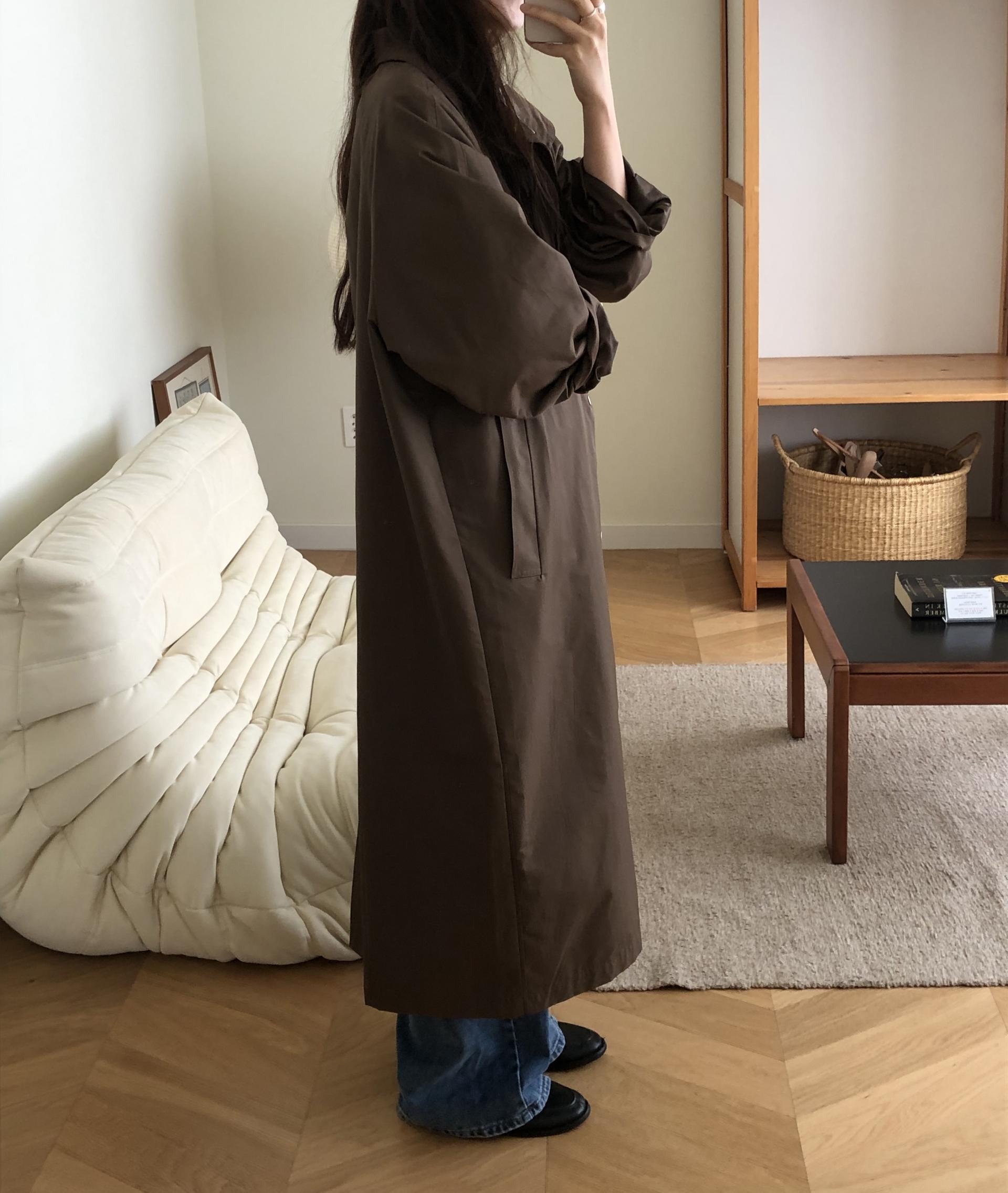 맥시한 기장과 담백한 디자인의 메이플 트렌치 코트입니다.