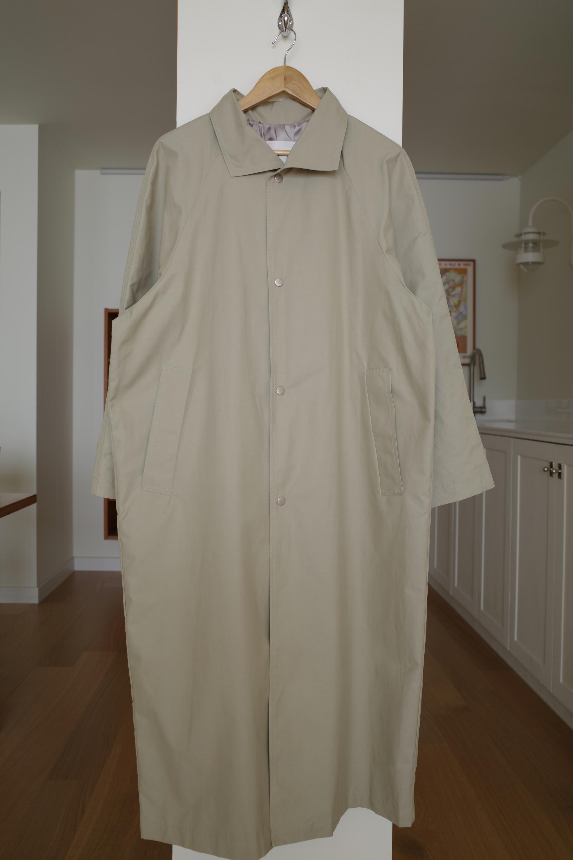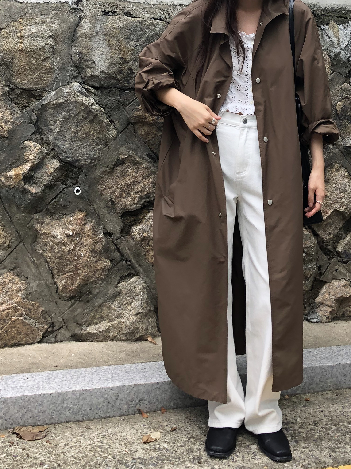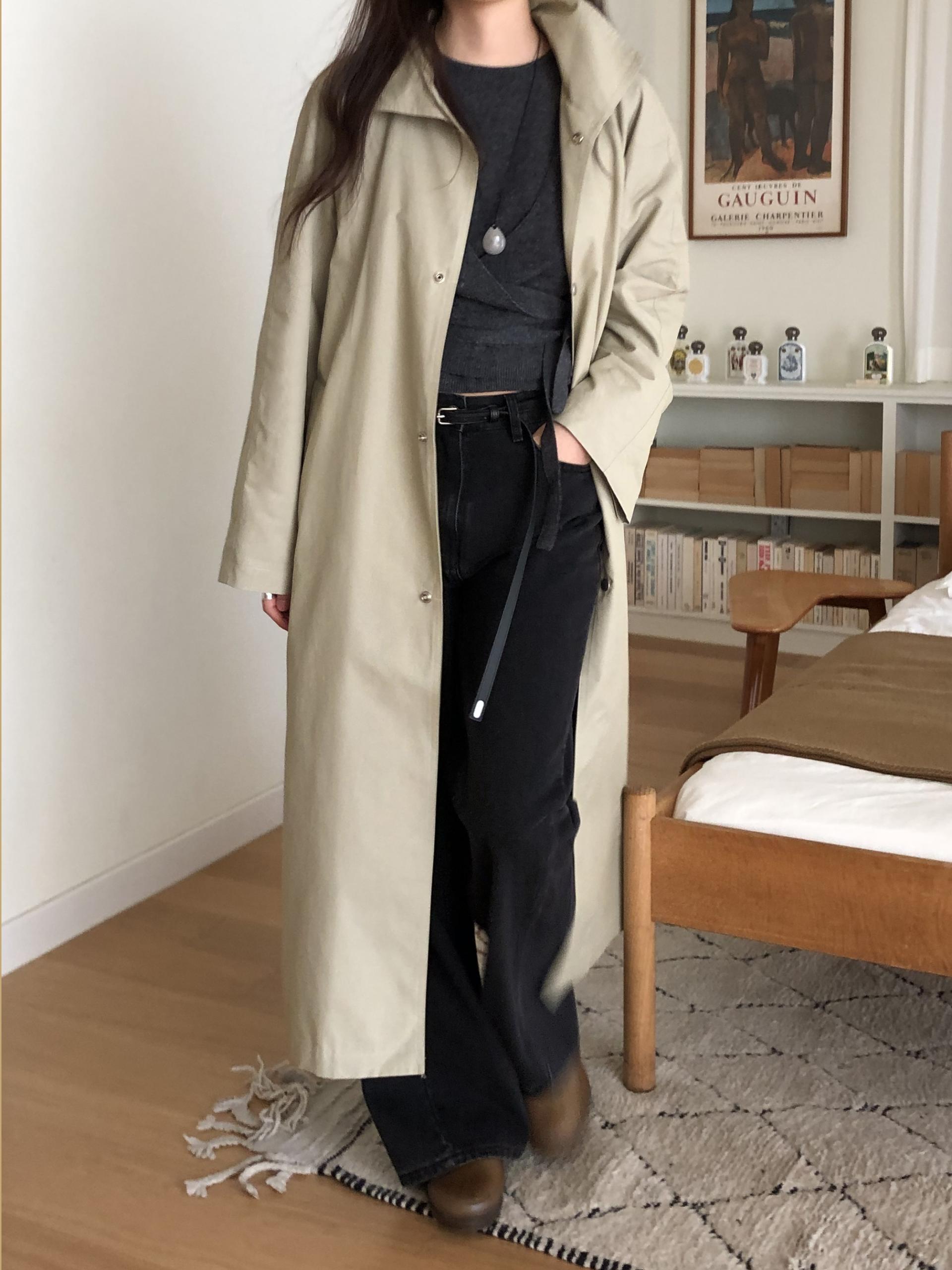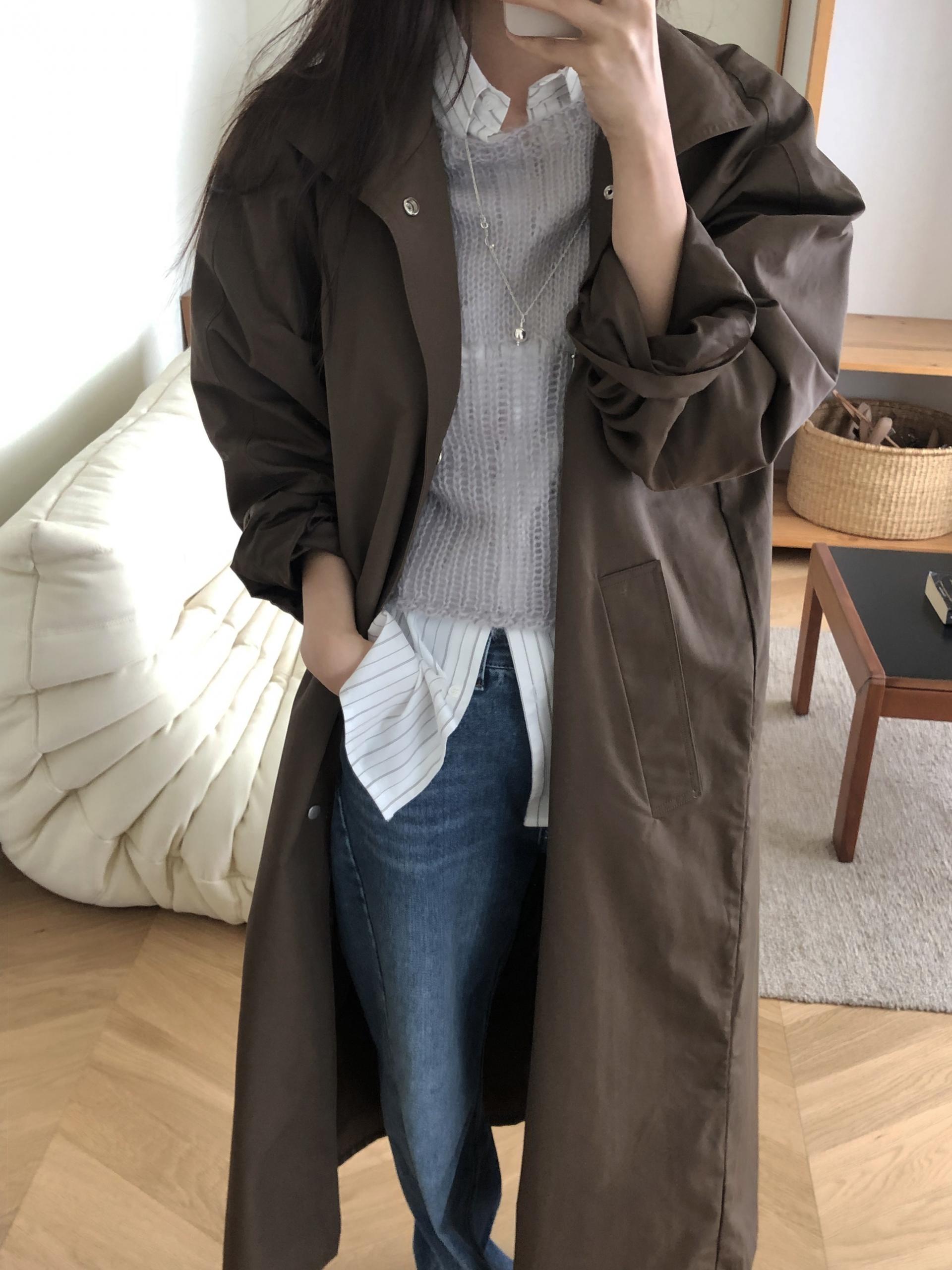 맥시한 기장과 담백한 디자인의 메이플 트렌치 코트입니다.