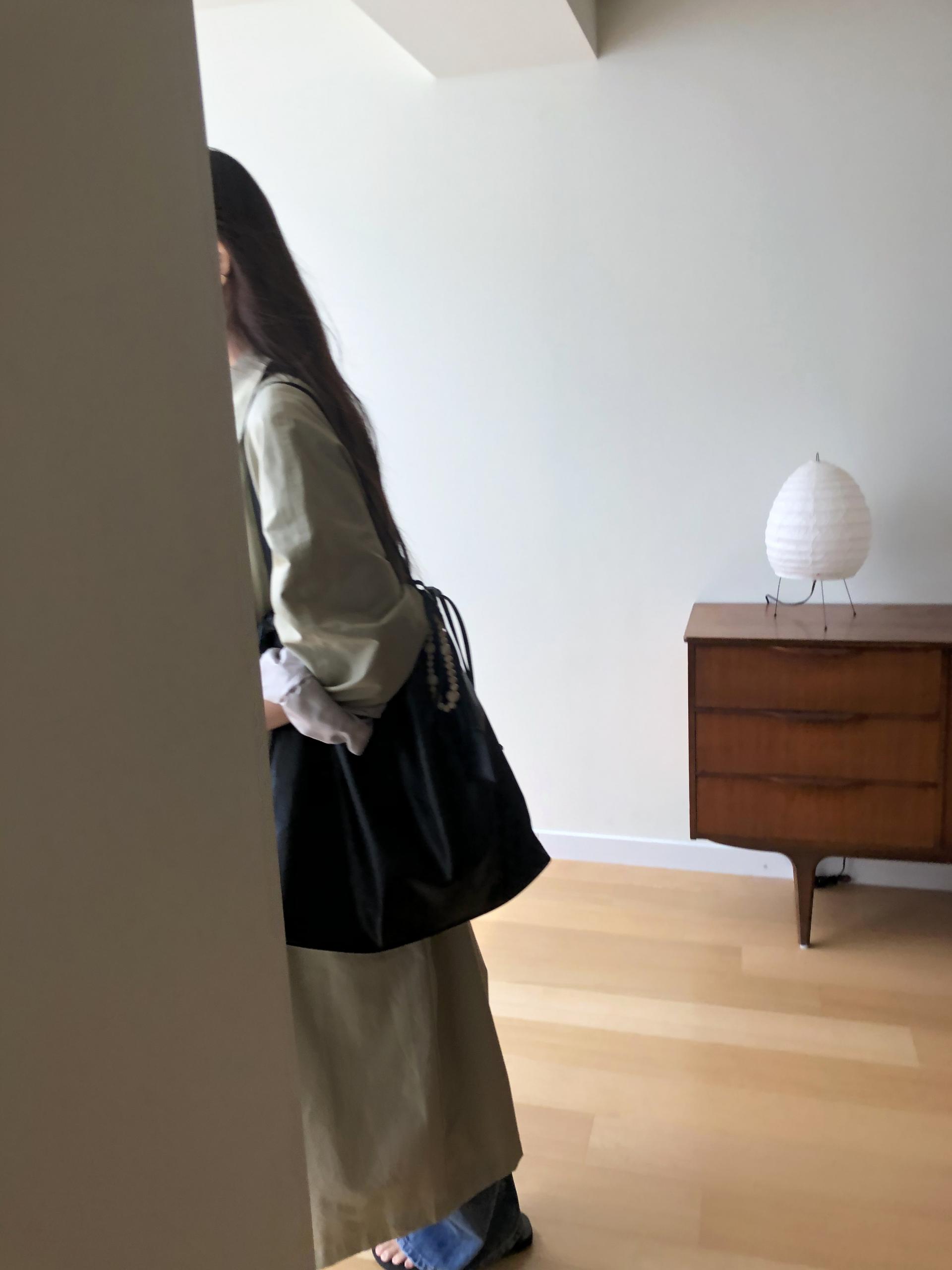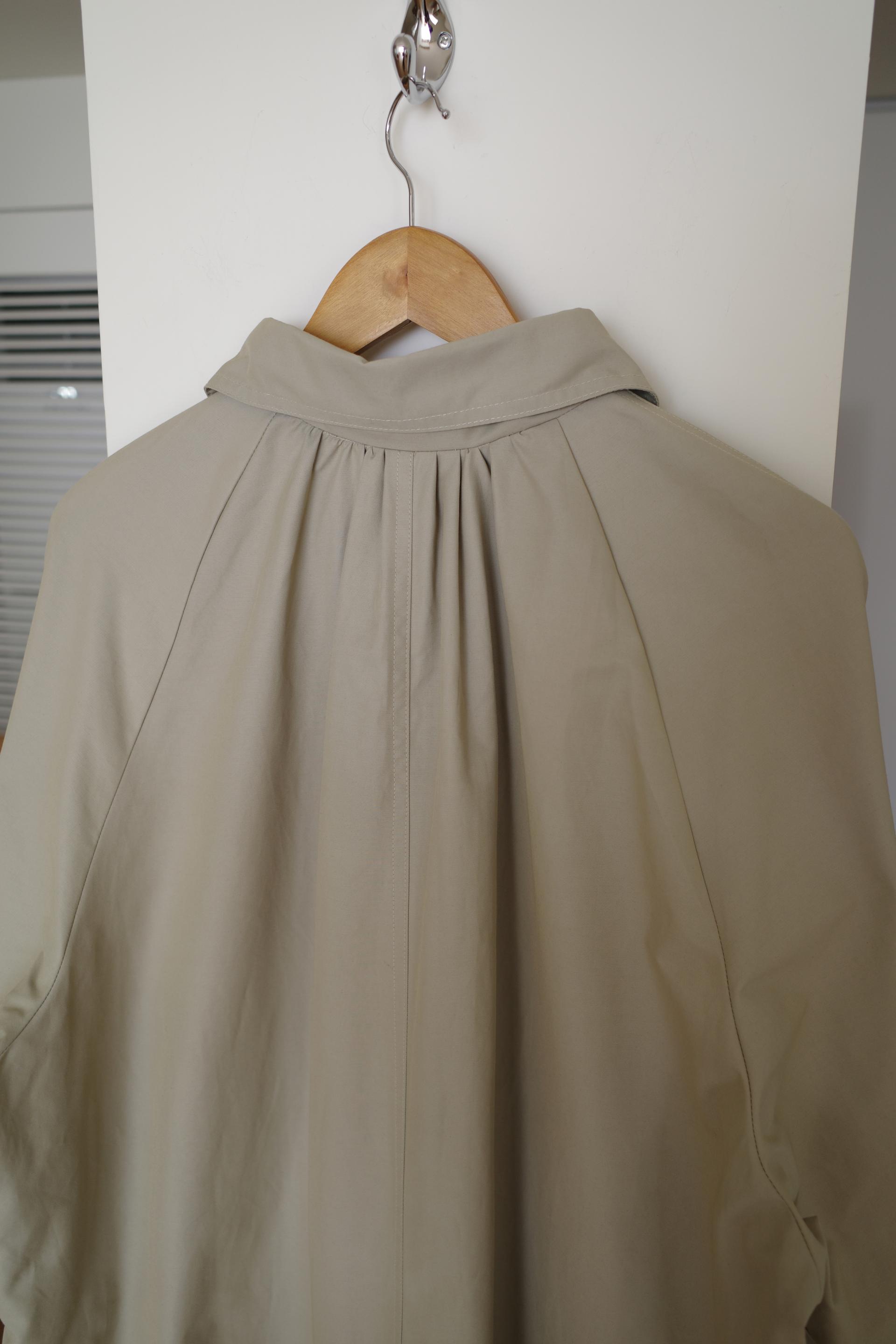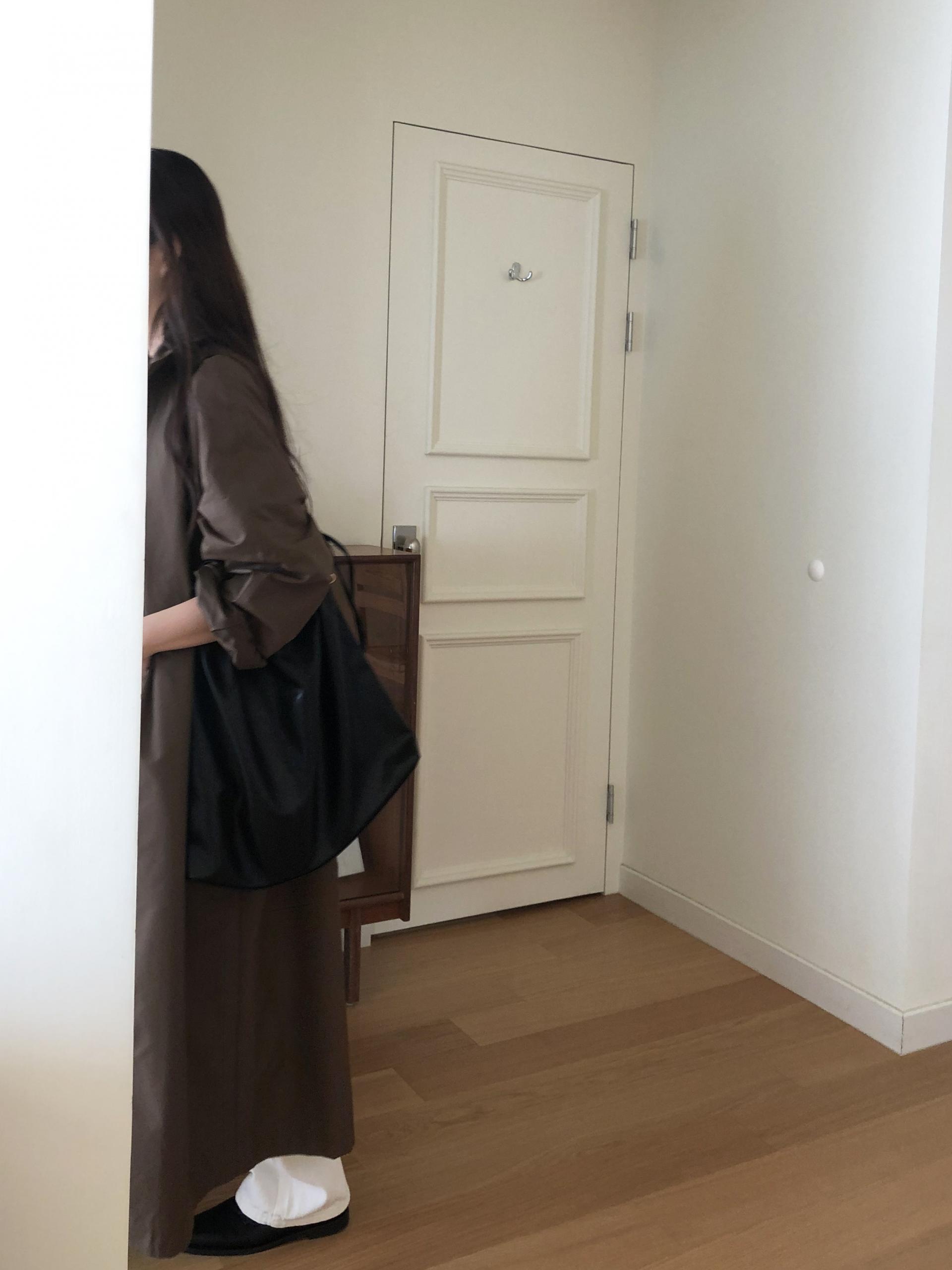 이 트렌치의 가장 예쁜 점은 뒷네크라인의 조밀한 셔링이었어요. 이게 뭐라고 뒷모습이 이렇게 예쁜지...!@ 한쪽만 무심하게 툭 세워 연출하는 하이넥도 멋스러워요.