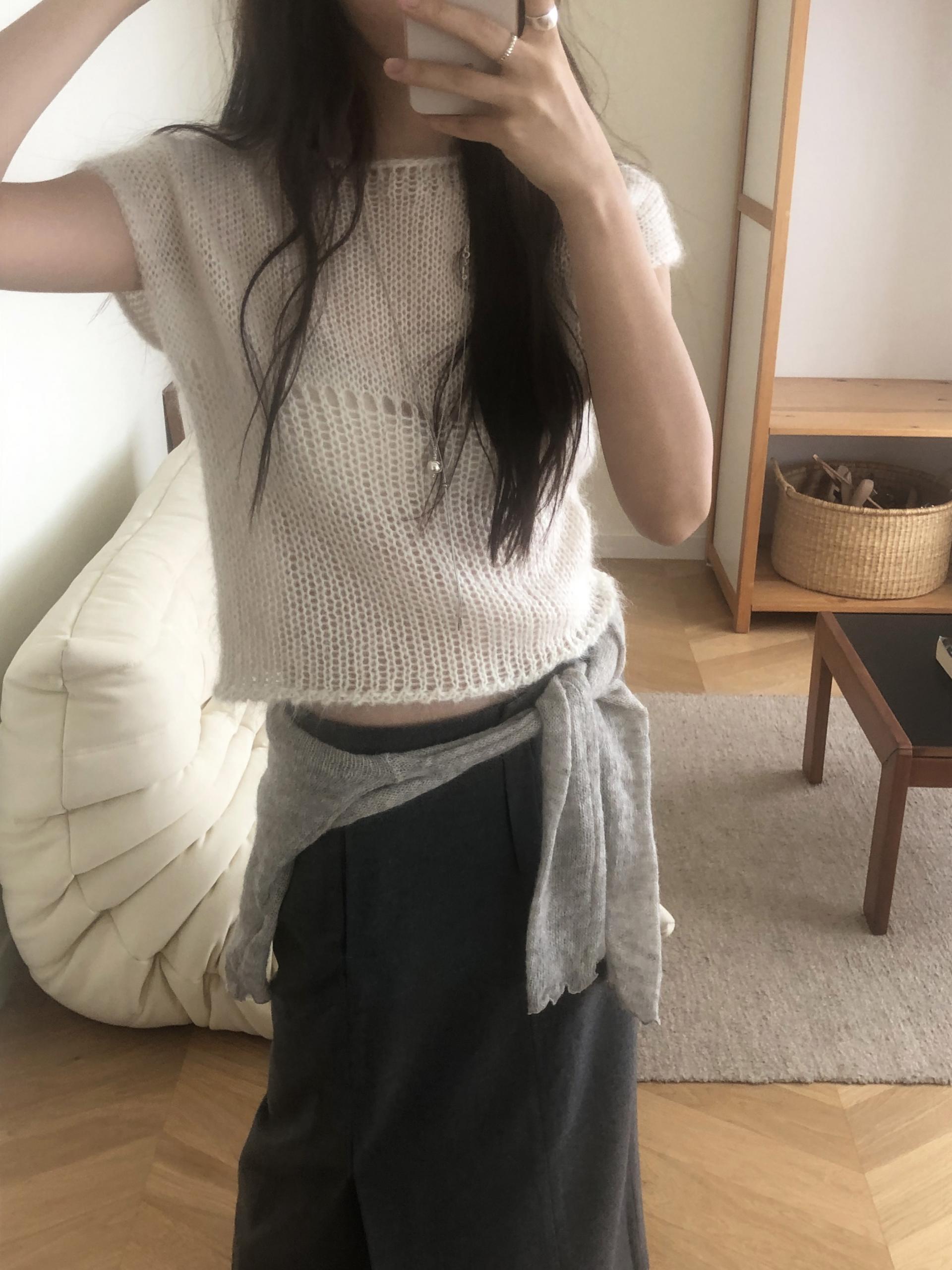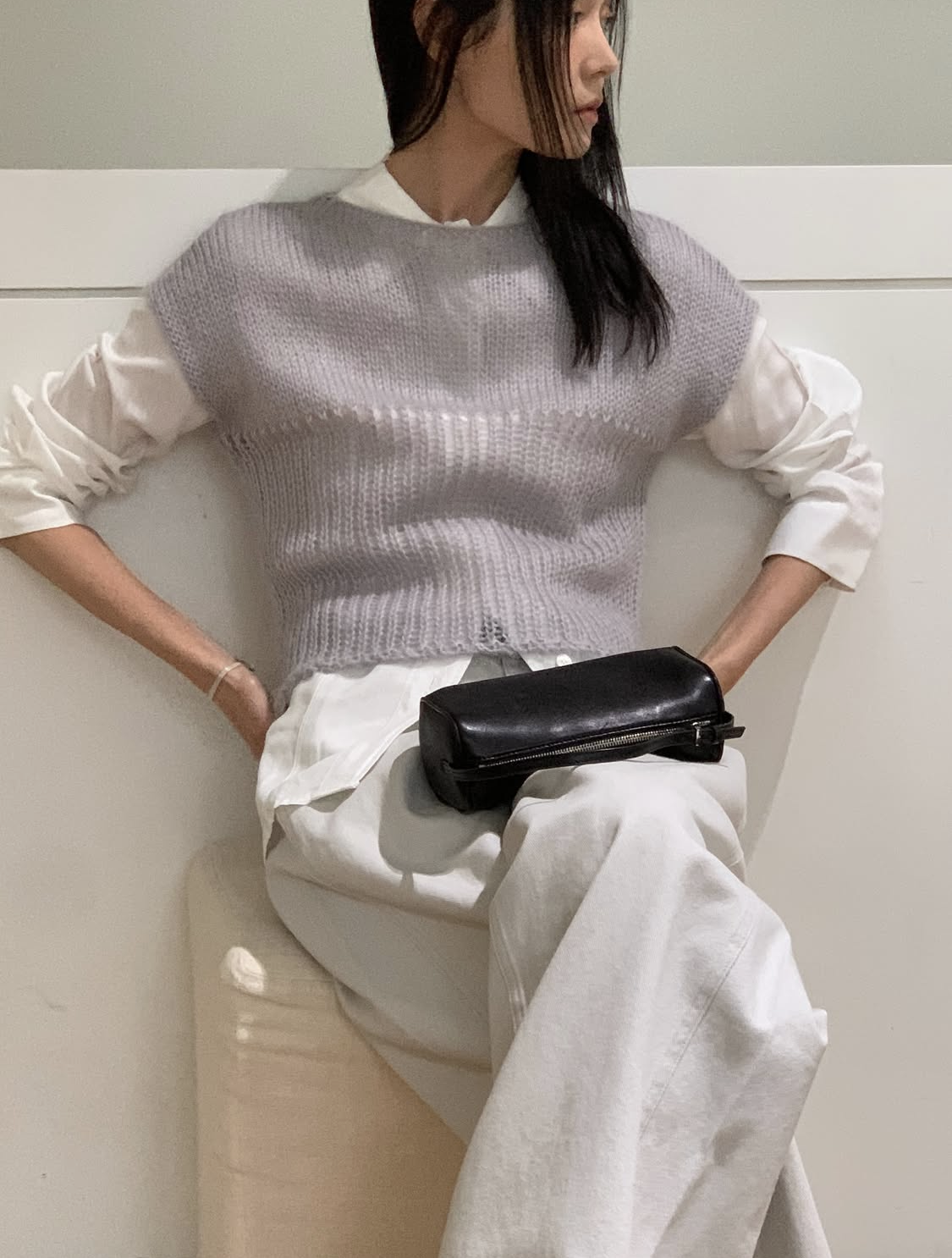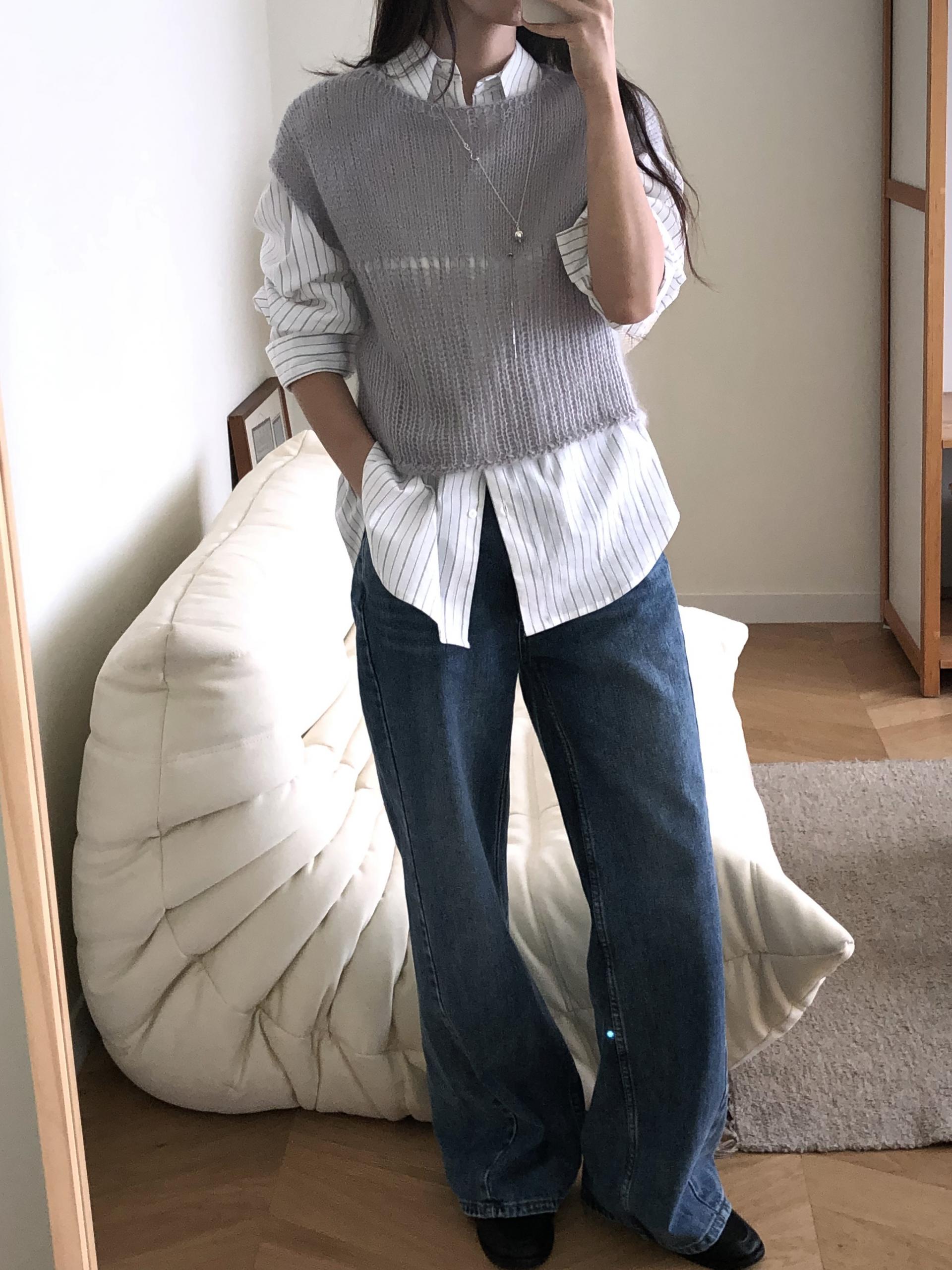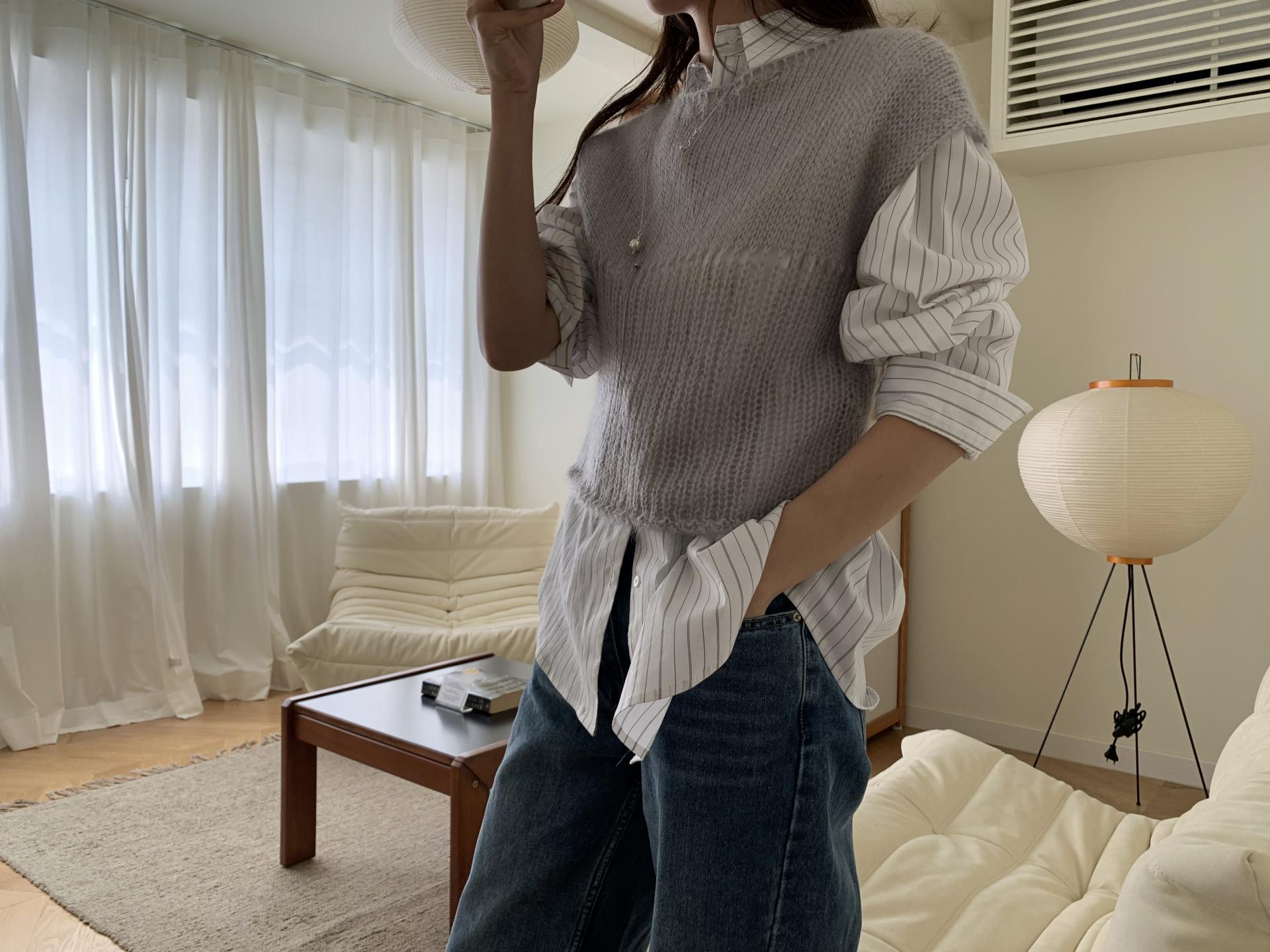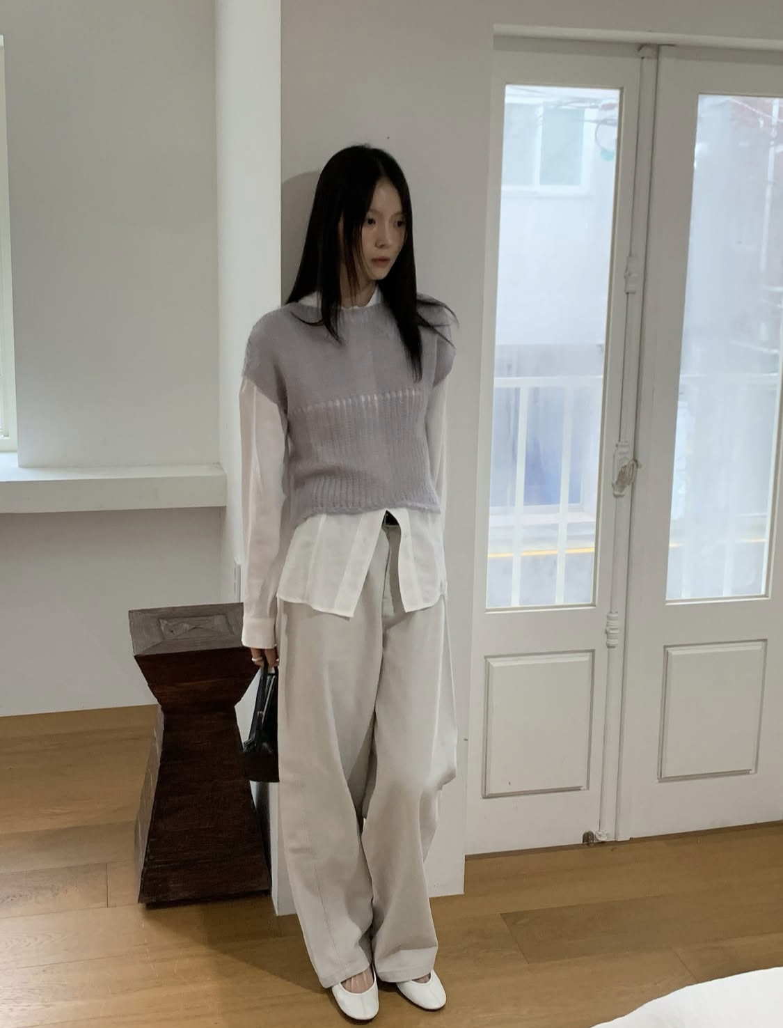 성근 짜임과 가벼운 무게감으로 답답함 없이 입어지는 점이 좋았어요. 일반적인 니트 베스트하면 꽉 채운 니팅이 많은데 은은하게 비침이 있기 때문에 이너와 베스트 모두 사는 시너지를 느낄 수 있습니다.