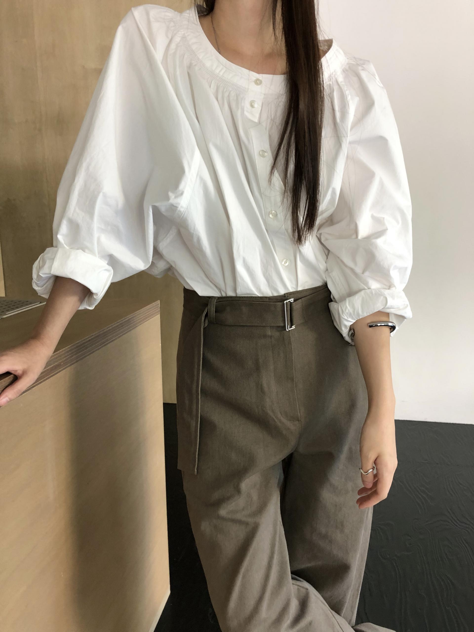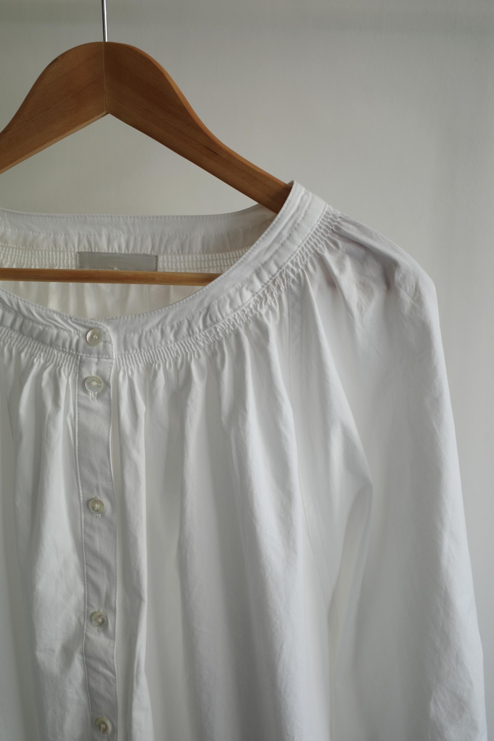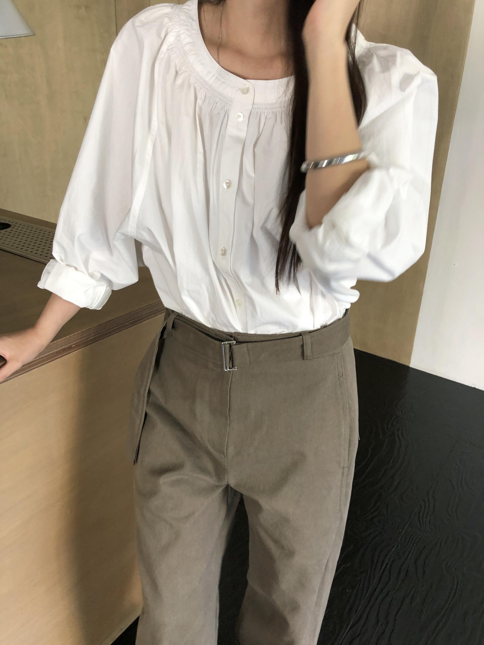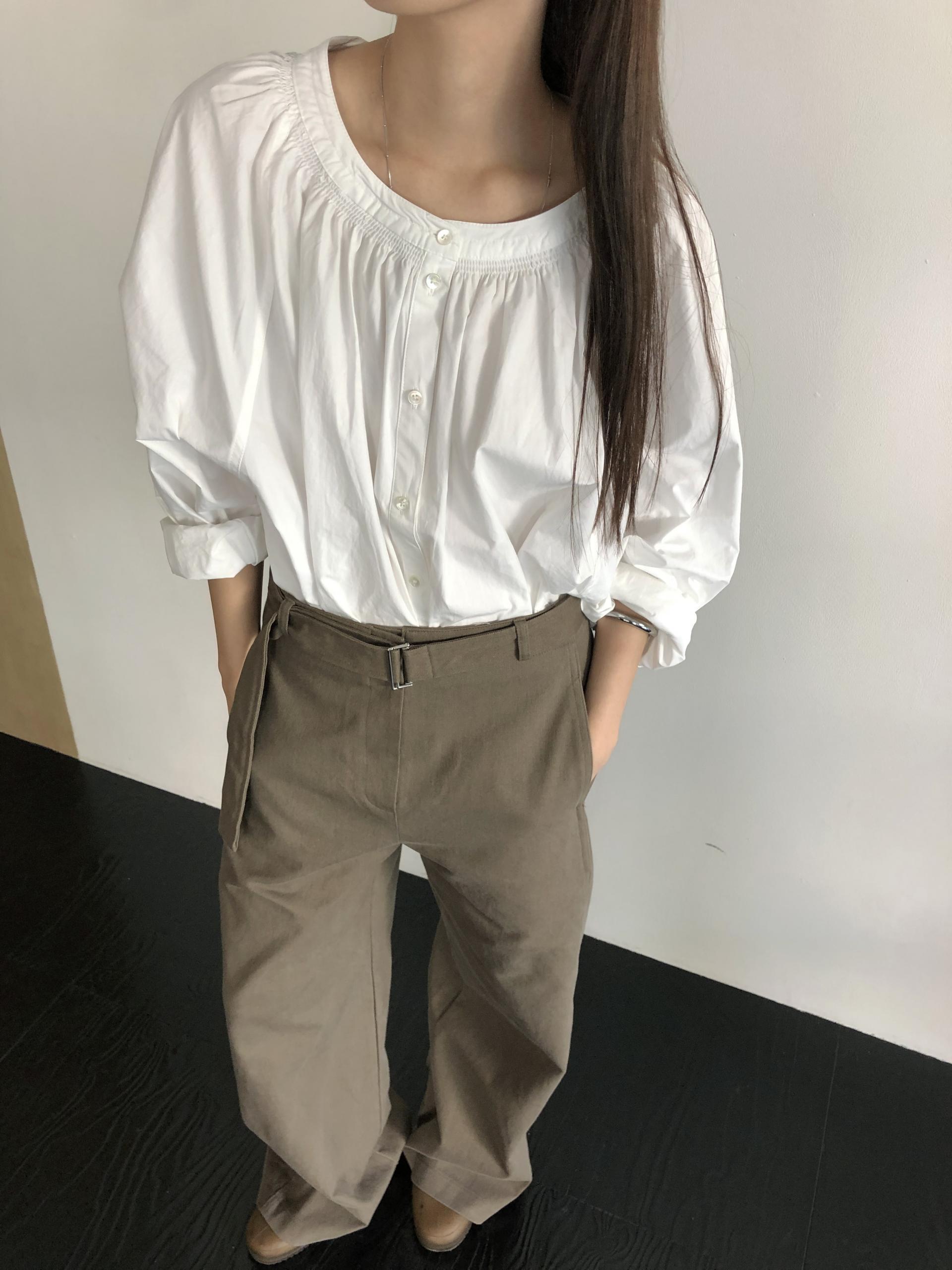 넥라인을 따라 아주 촘촘하게 잡힌 셔링이 블라우스의 느낌을 연출해주어요. 또한 어느정도 힘있는 코튼 소재 덕분에 이 셔링이 크게 무너지지 않고 고급스러운 드레이핑을 만들어줍니다.