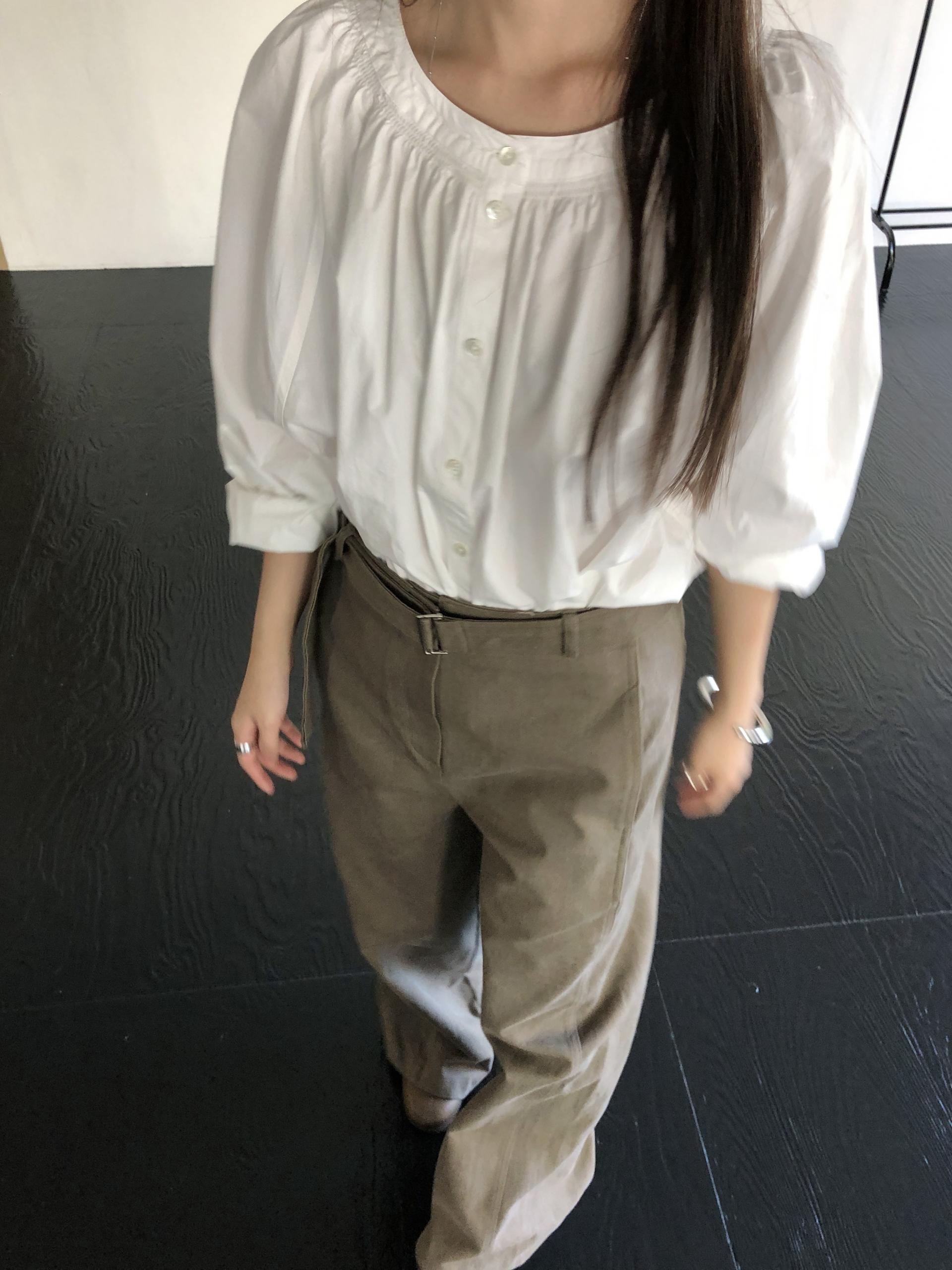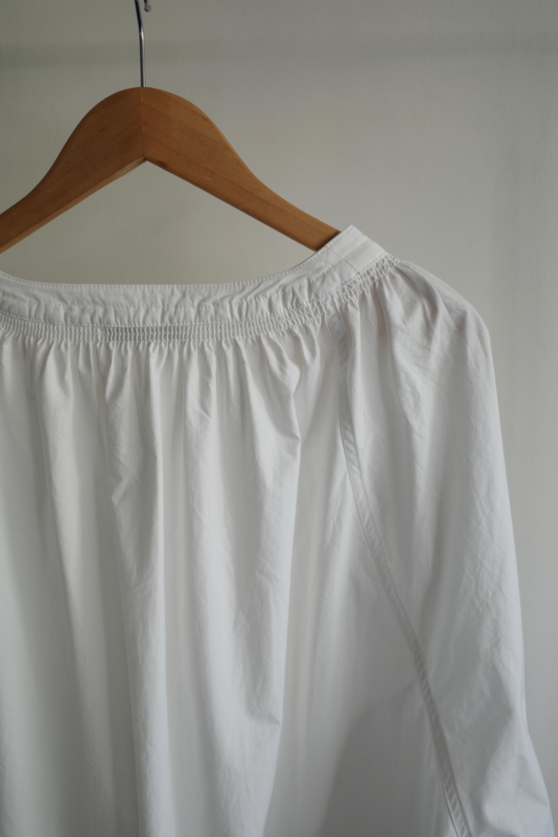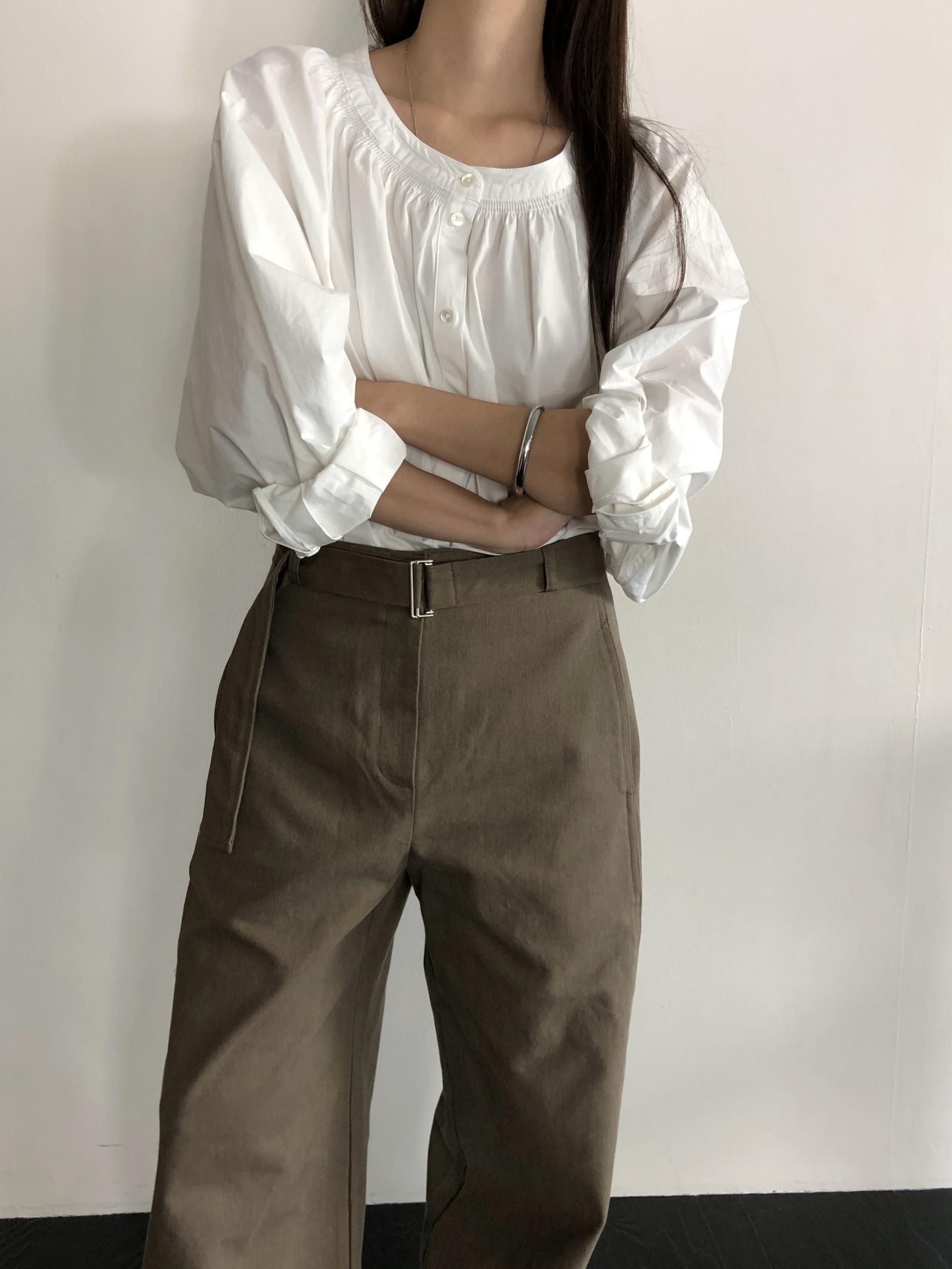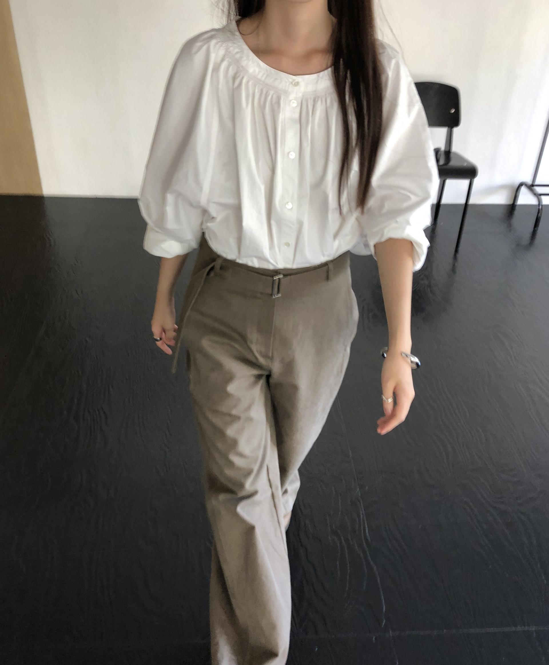 넥라인을 따라 아주 촘촘하게 잡힌 셔링이 블라우스의 느낌을 연출해주어요. 또한 어느정도 힘있는 코튼 소재 덕분에 이 셔링이 크게 무너지지 않고 고급스러운 드레이핑을 만들어줍니다.