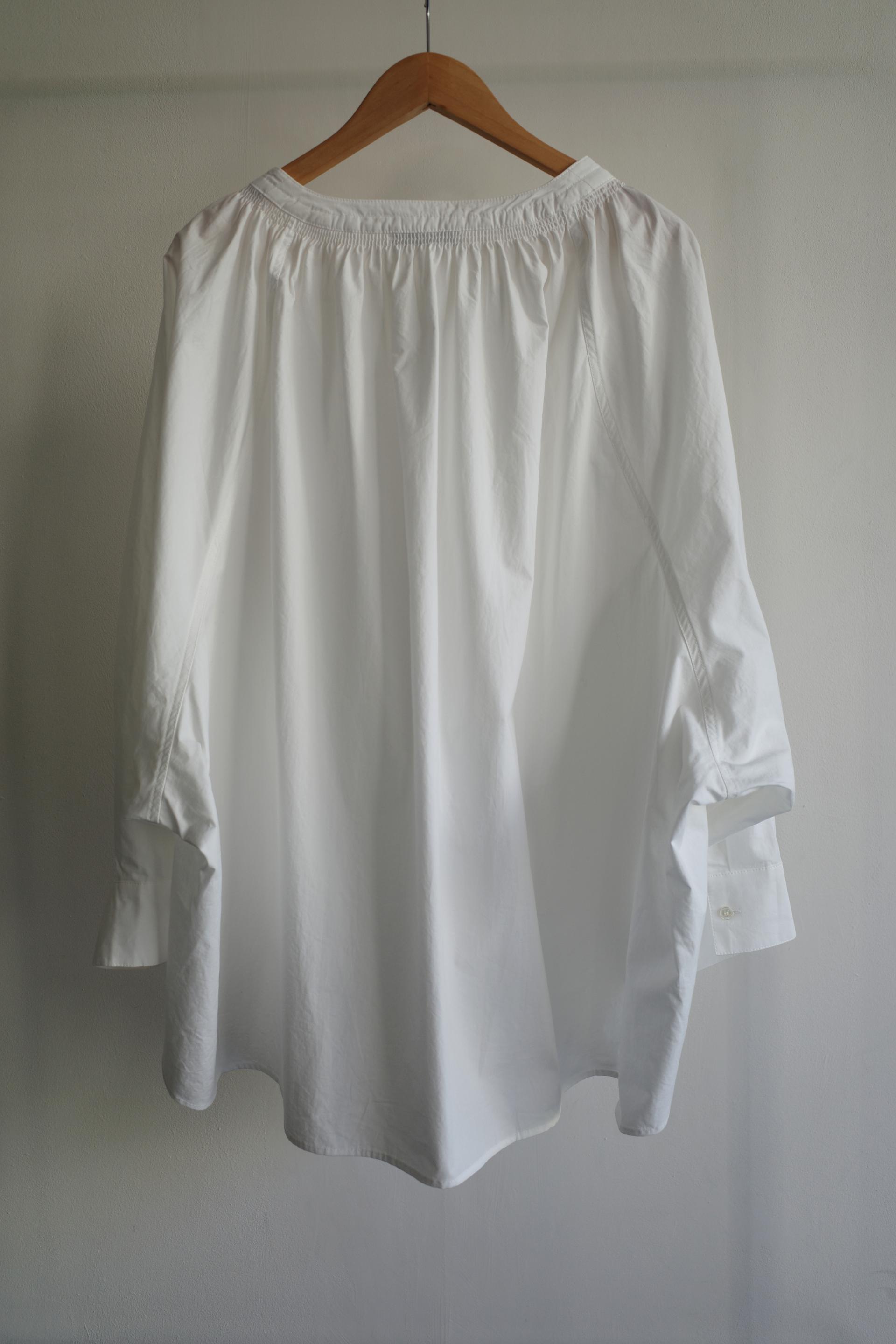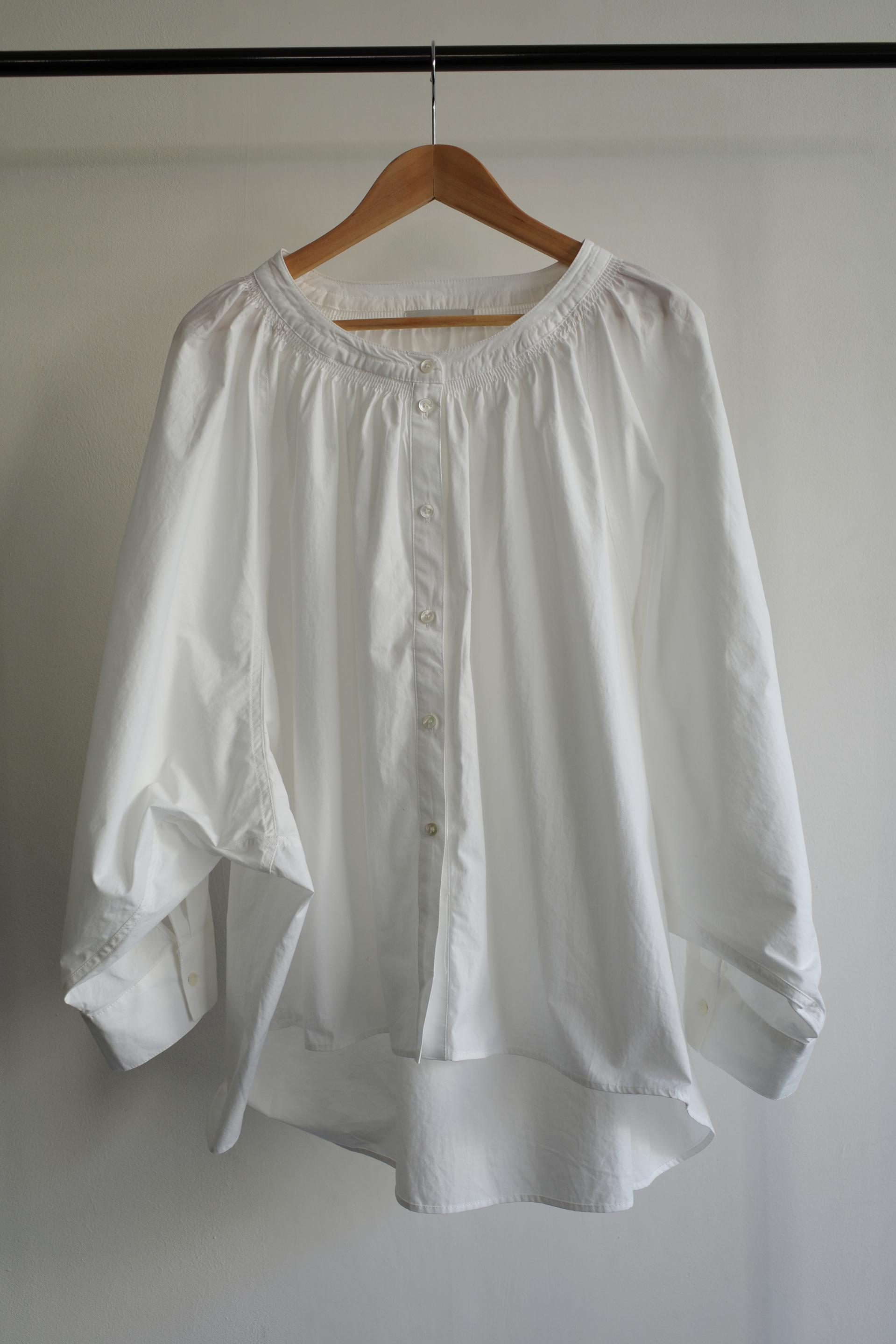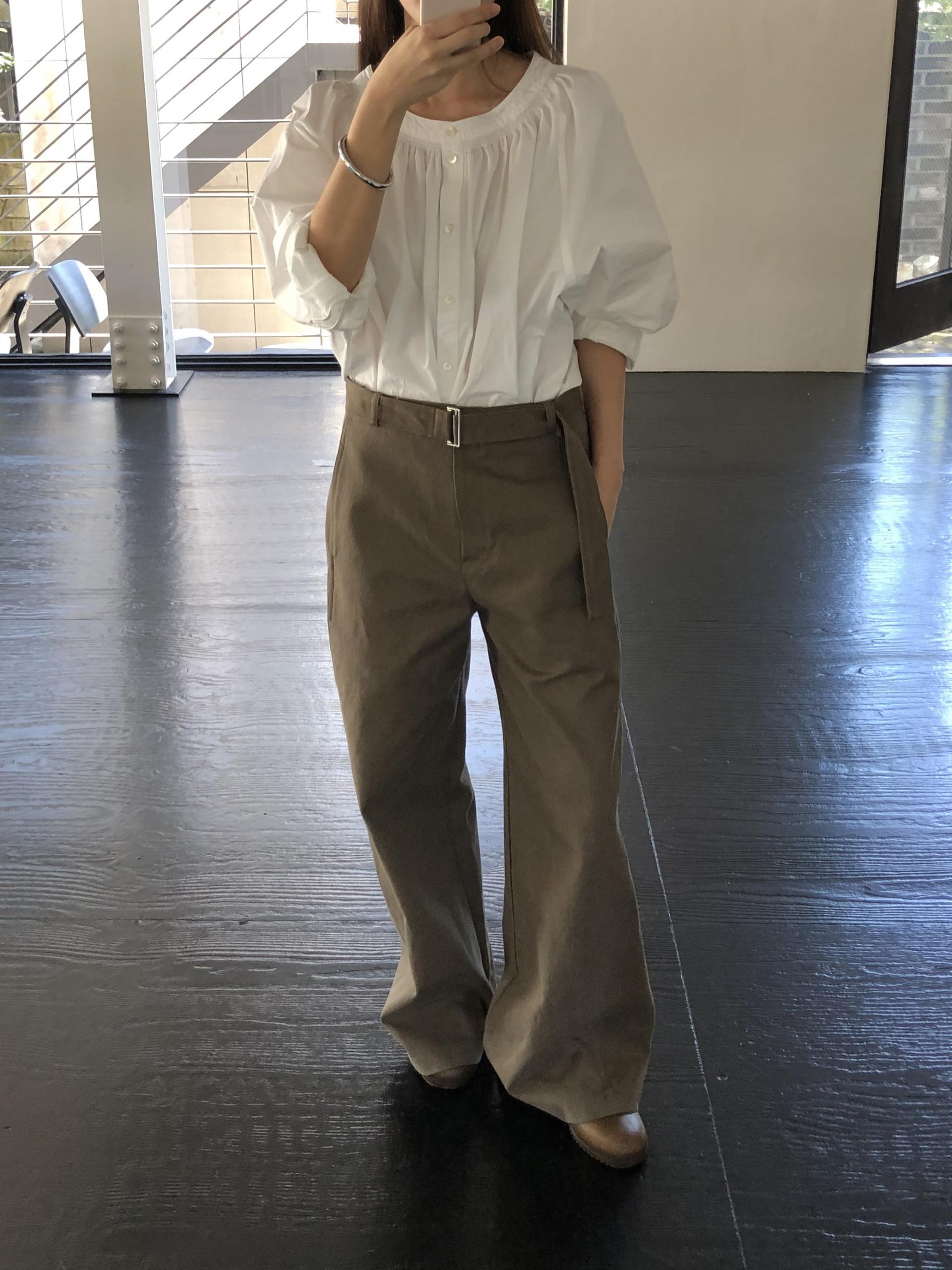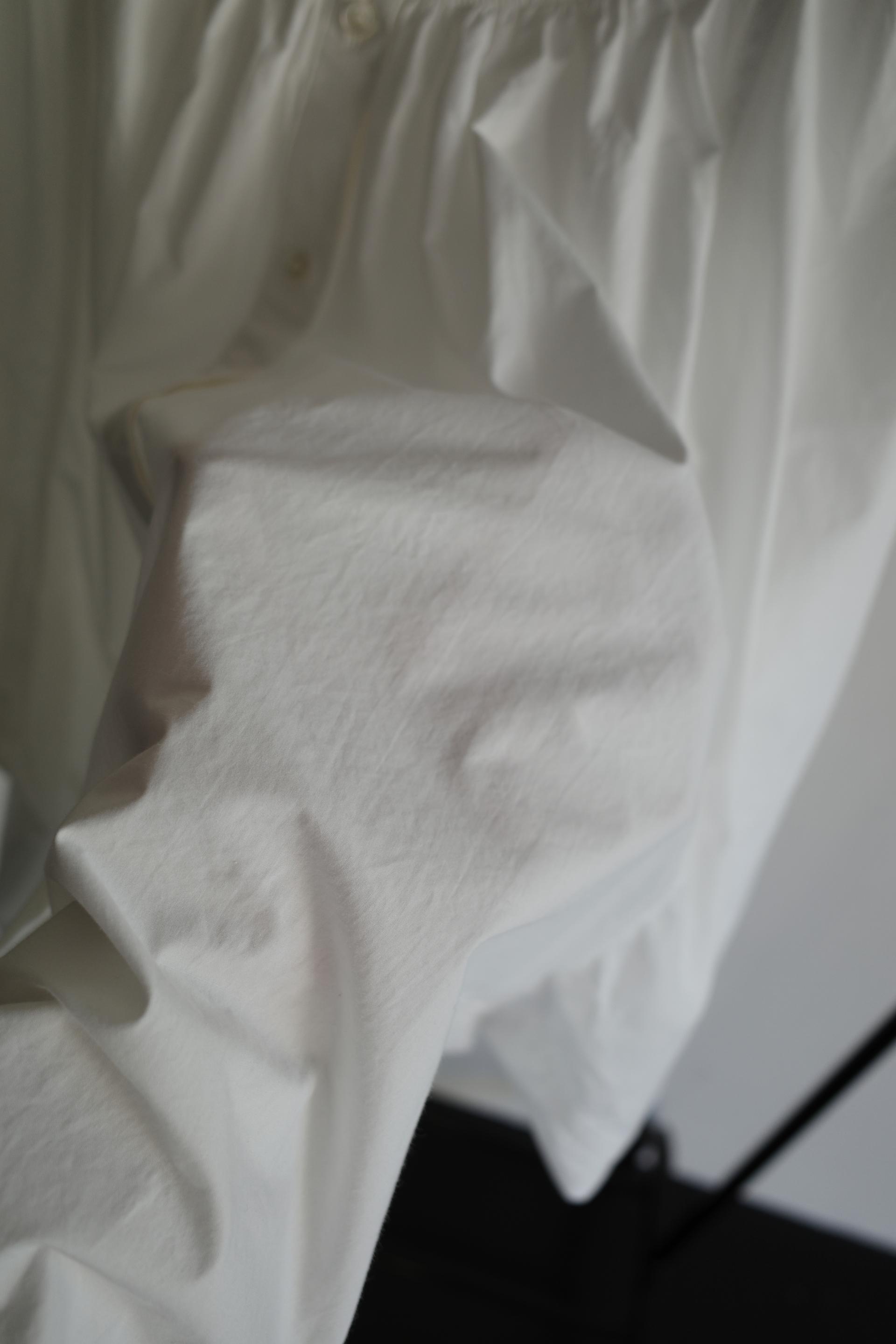 넥라인을 따라 아주 촘촘하게 잡힌 셔링이 블라우스의 느낌을 연출해주어요. 또한 어느정도 힘있는 코튼 소재 덕분에 이 셔링이 크게 무너지지 않고 고급스러운 드레이핑을 만들어줍니다.