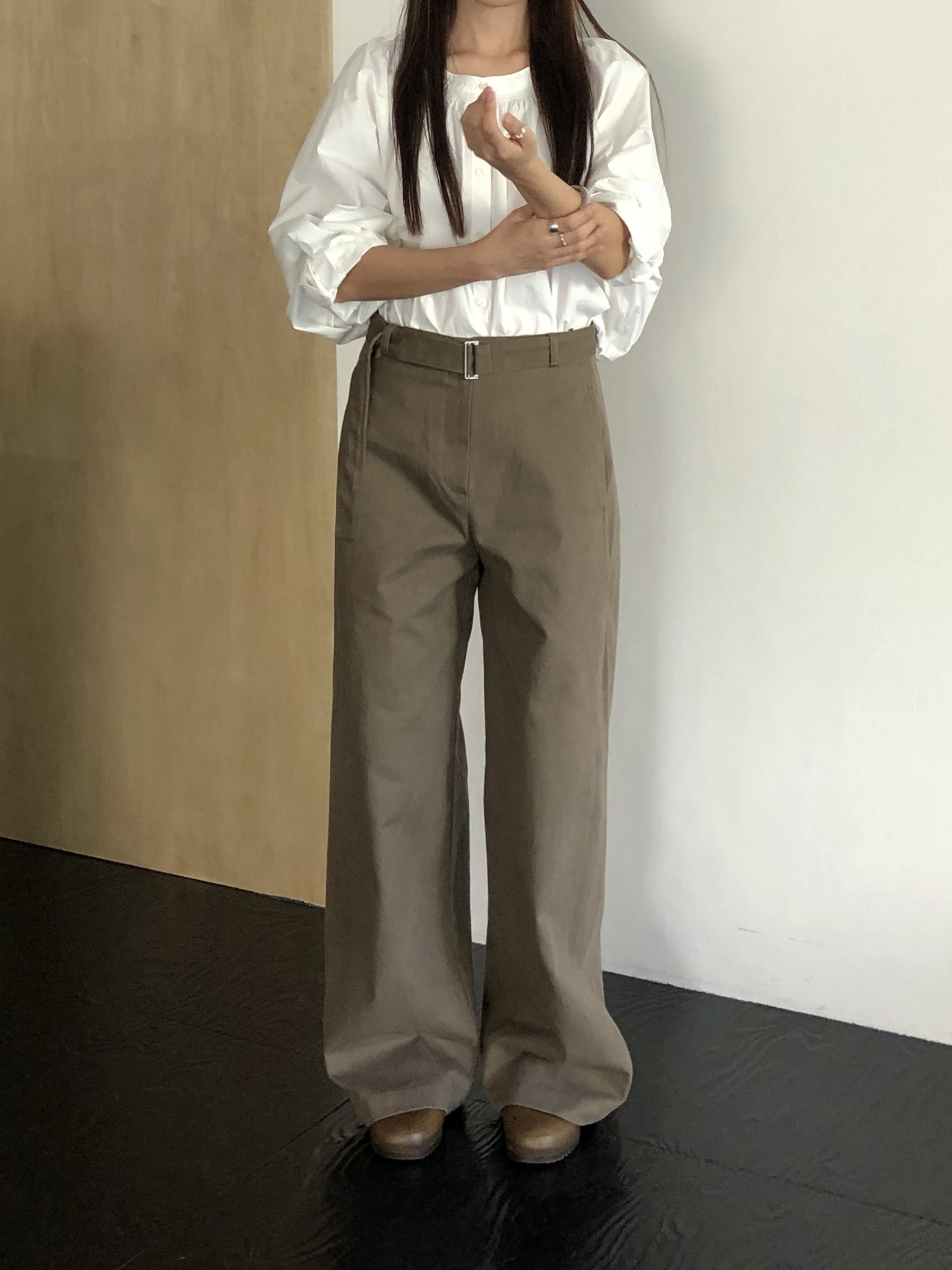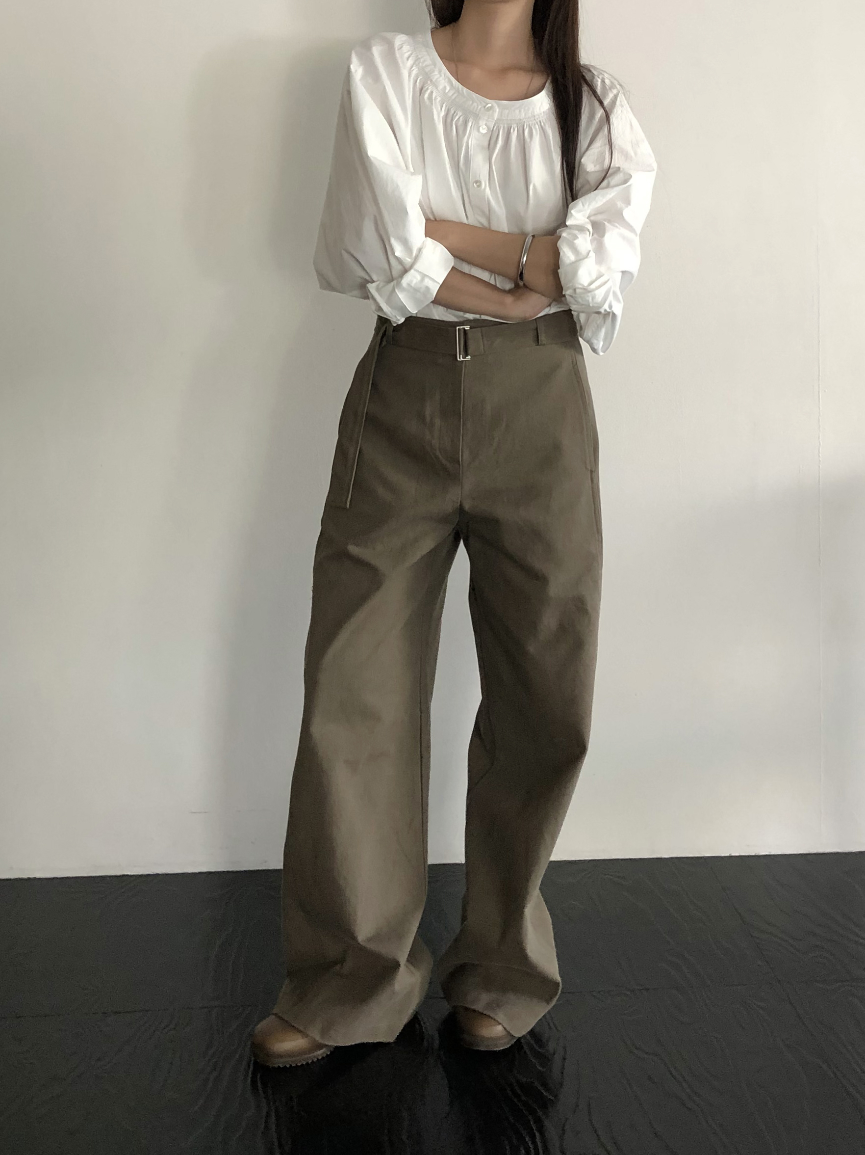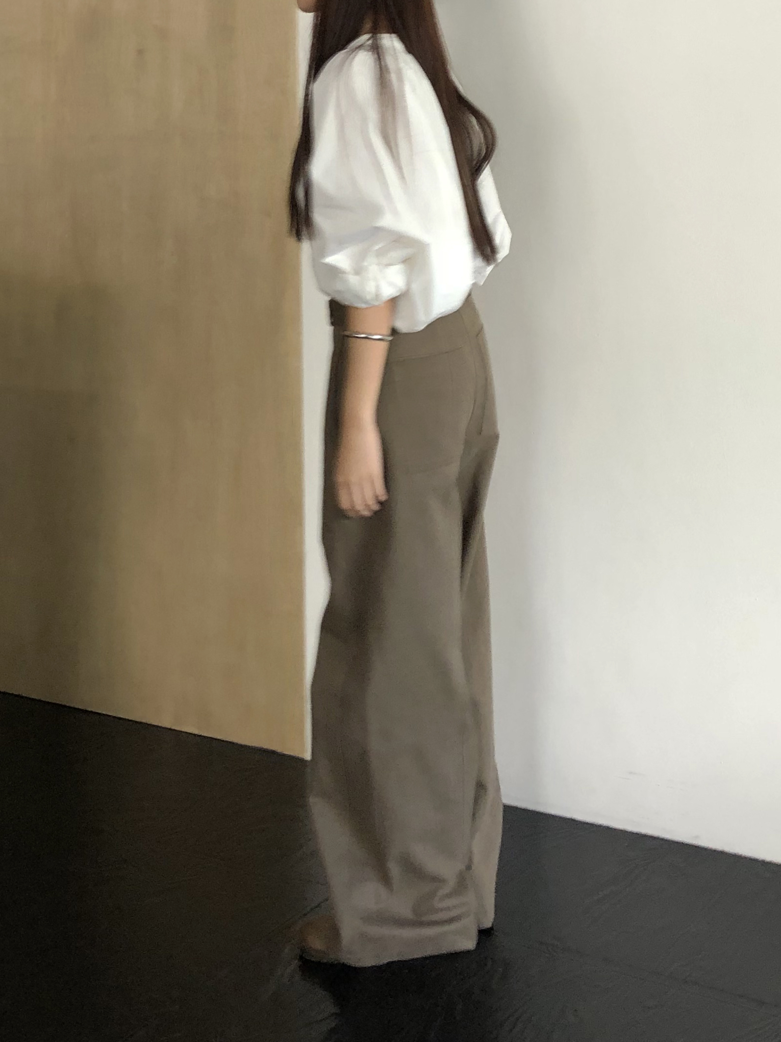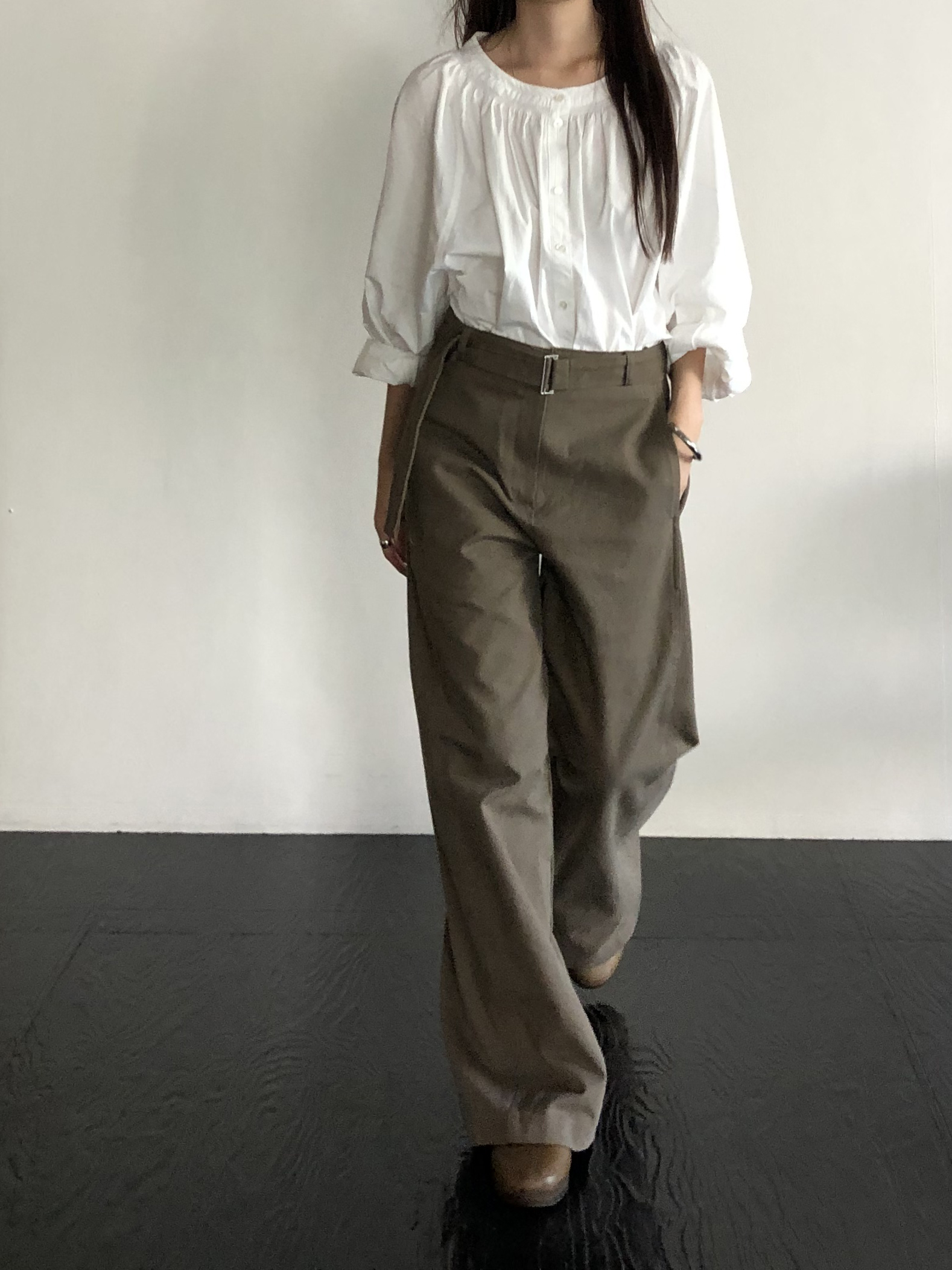 넥라인을 따라 아주 촘촘하게 잡힌 셔링이 블라우스의 느낌을 연출해주어요. 또한 어느정도 힘있는 코튼 소재 덕분에 이 셔링이 크게 무너지지 않고 고급스러운 드레이핑을 만들어줍니다.