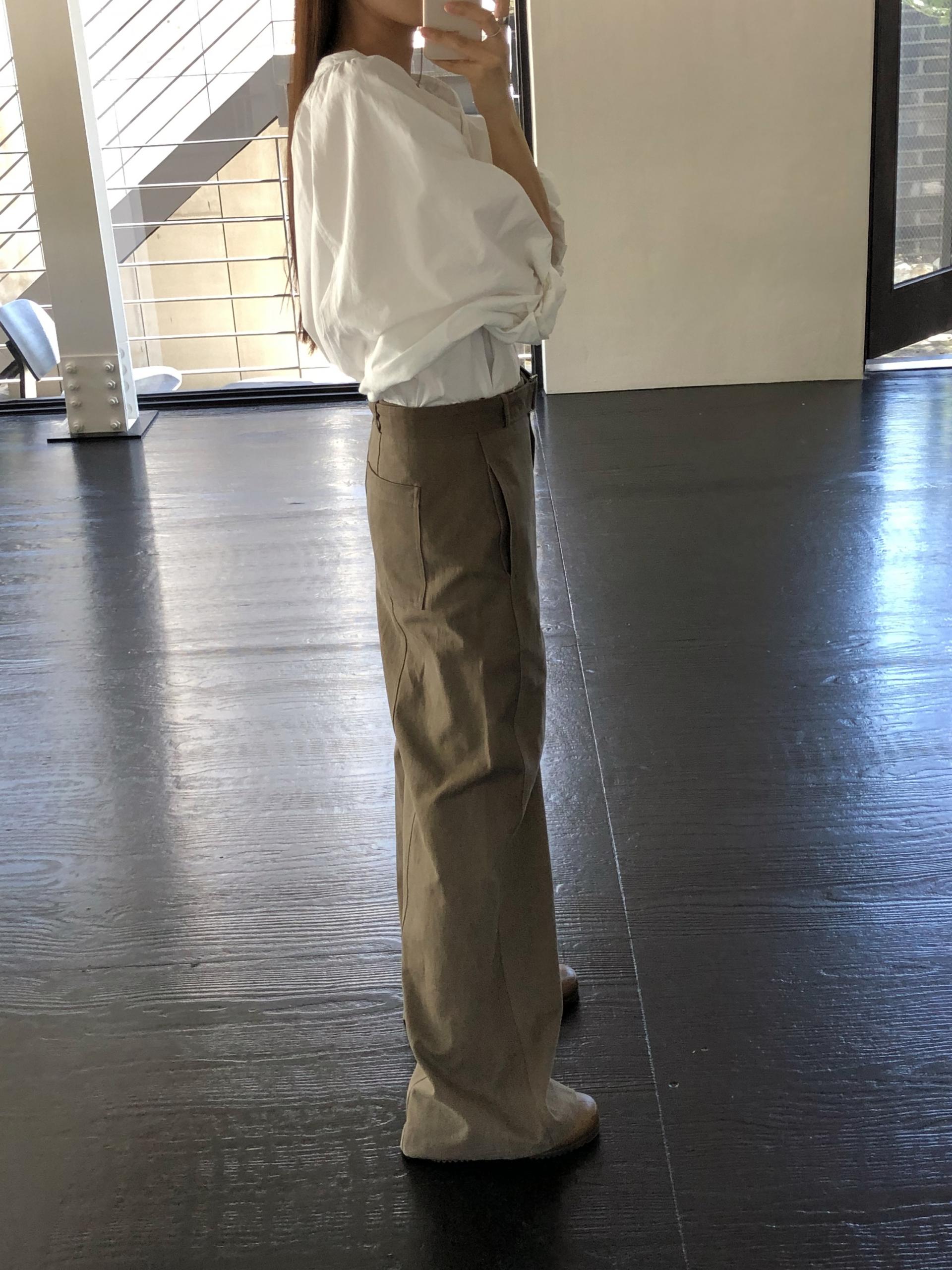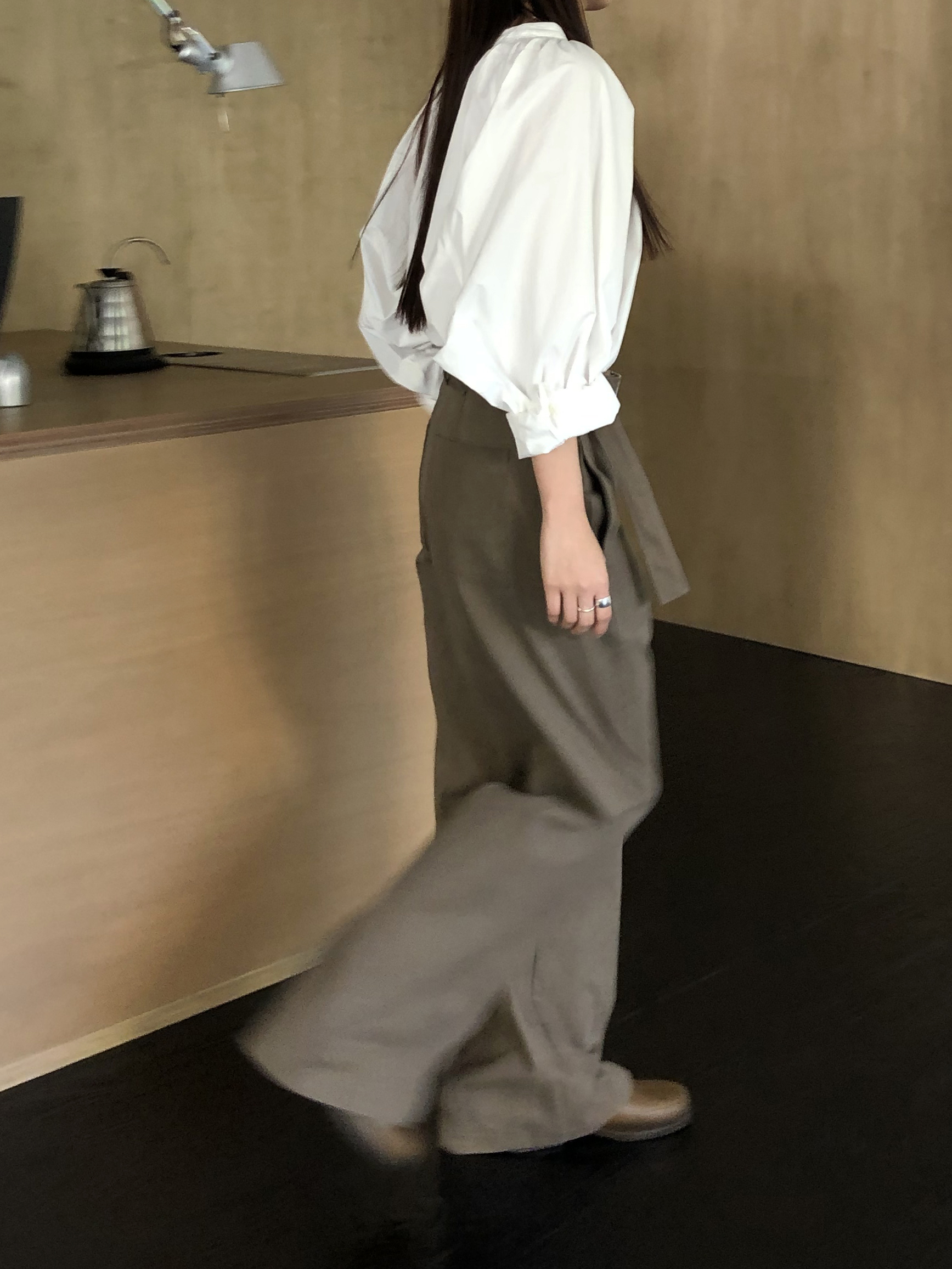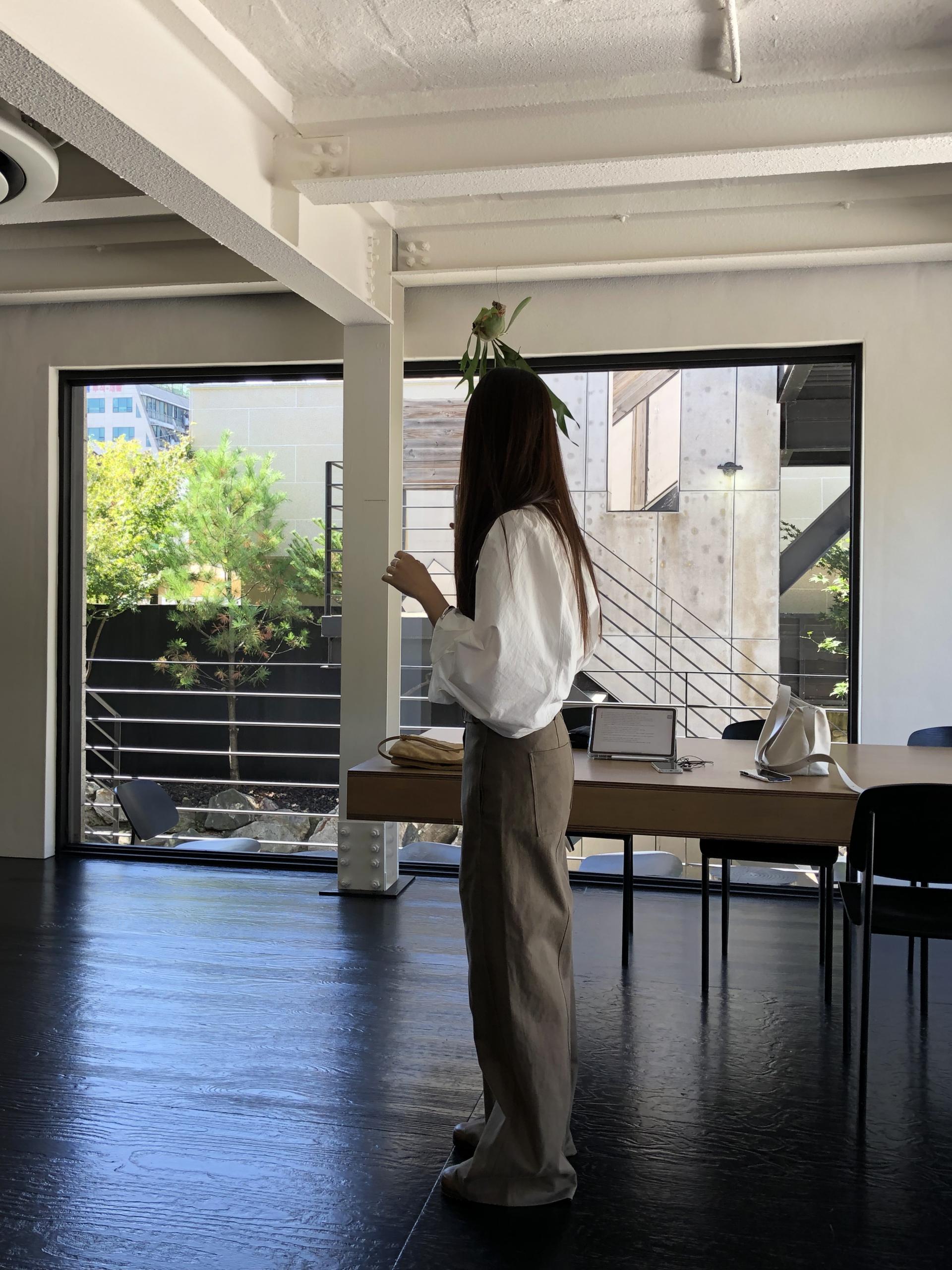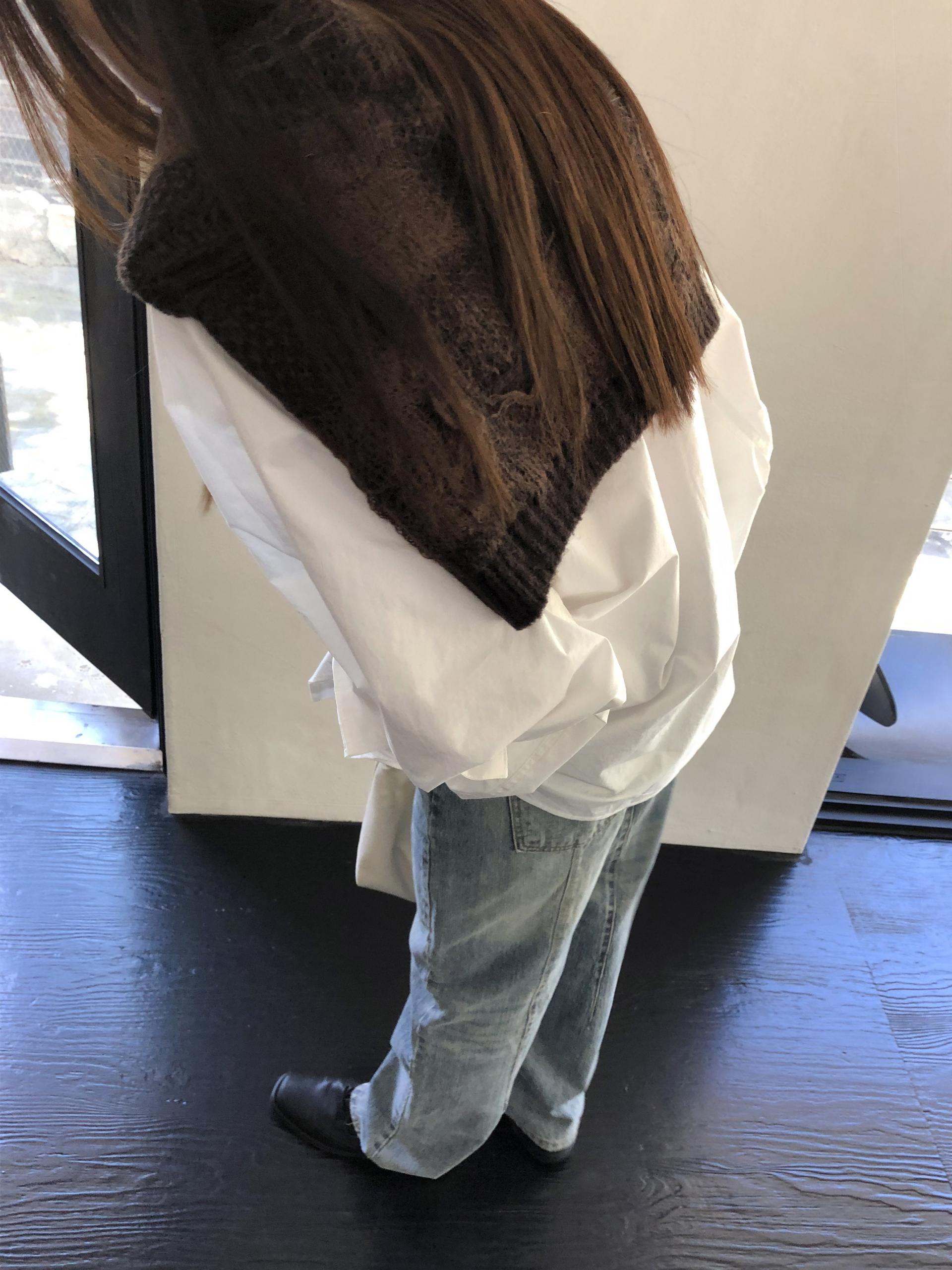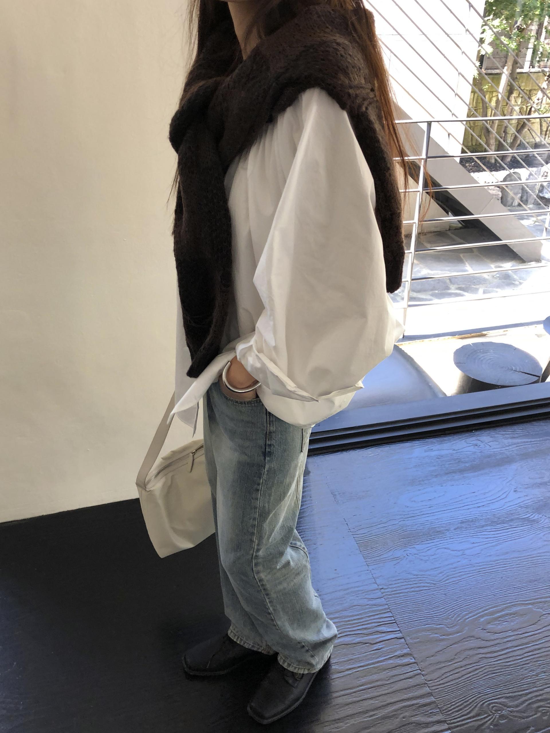 어깨선이 없는 완전히 길게 늘어진 래글런 소매와 여유로운 품이 더해져 살짝 가오리핏을 연출해요. 그래서 특히나 옆모습의 소매라인이 너무 너무나 예쁩니다.. 요척이 크기 때문에 넣어입고자 할 때는 슬림한 팬츠보다는 여유로운 핏의 팬츠를 선택해주시구요, 실루엣 자체가 큰 매력이라 사실 그냥 빼서 입는 것도 예쁩니다. 가을시즌에 특히 가디건 툭 둘러 입어주세요 <3