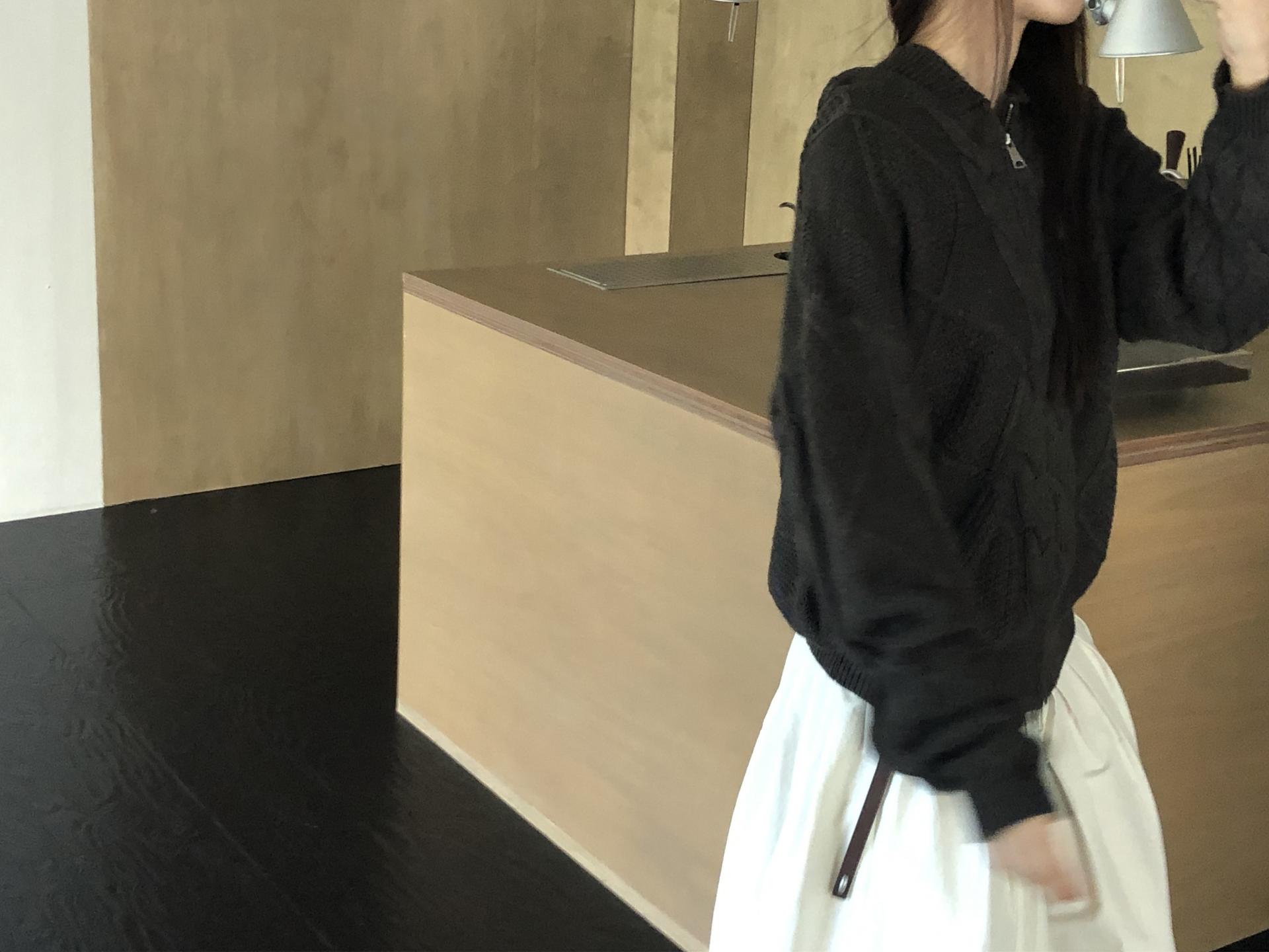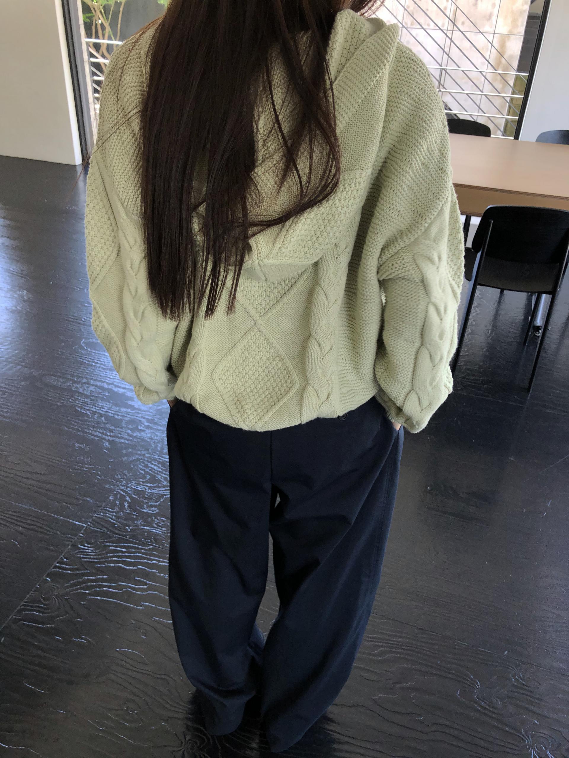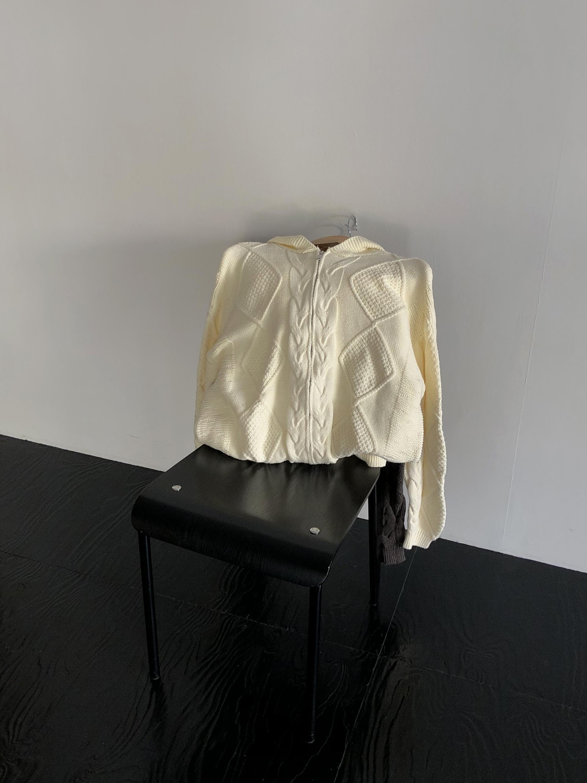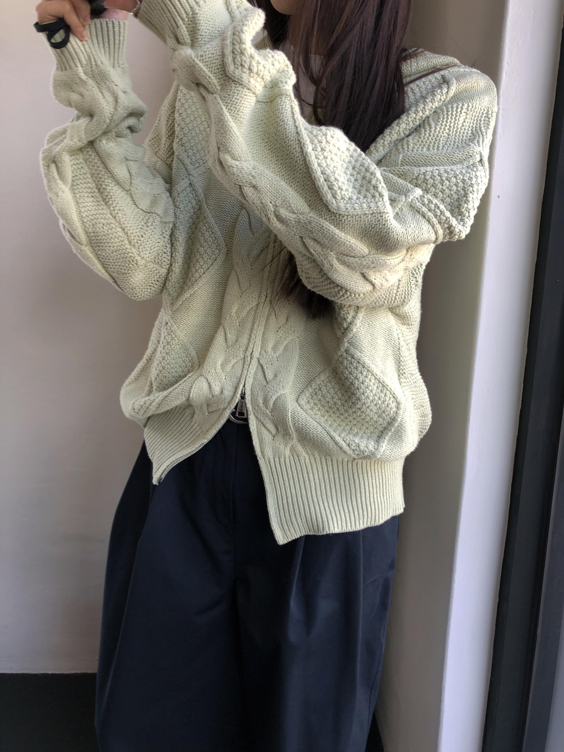 케이블 짜임을 베이스로 섹션마다 다른 짜임이라 단조롭지 않고 더 예쁩니다. 전체적으로는 루즈한 핏을 가졌지만 소매와 밑단의 립조직이 탄탄하게 잡아주어 지퍼를 잠갔을 때는 꽤나 안정감있게 실루엣을 만질 수 있어요.