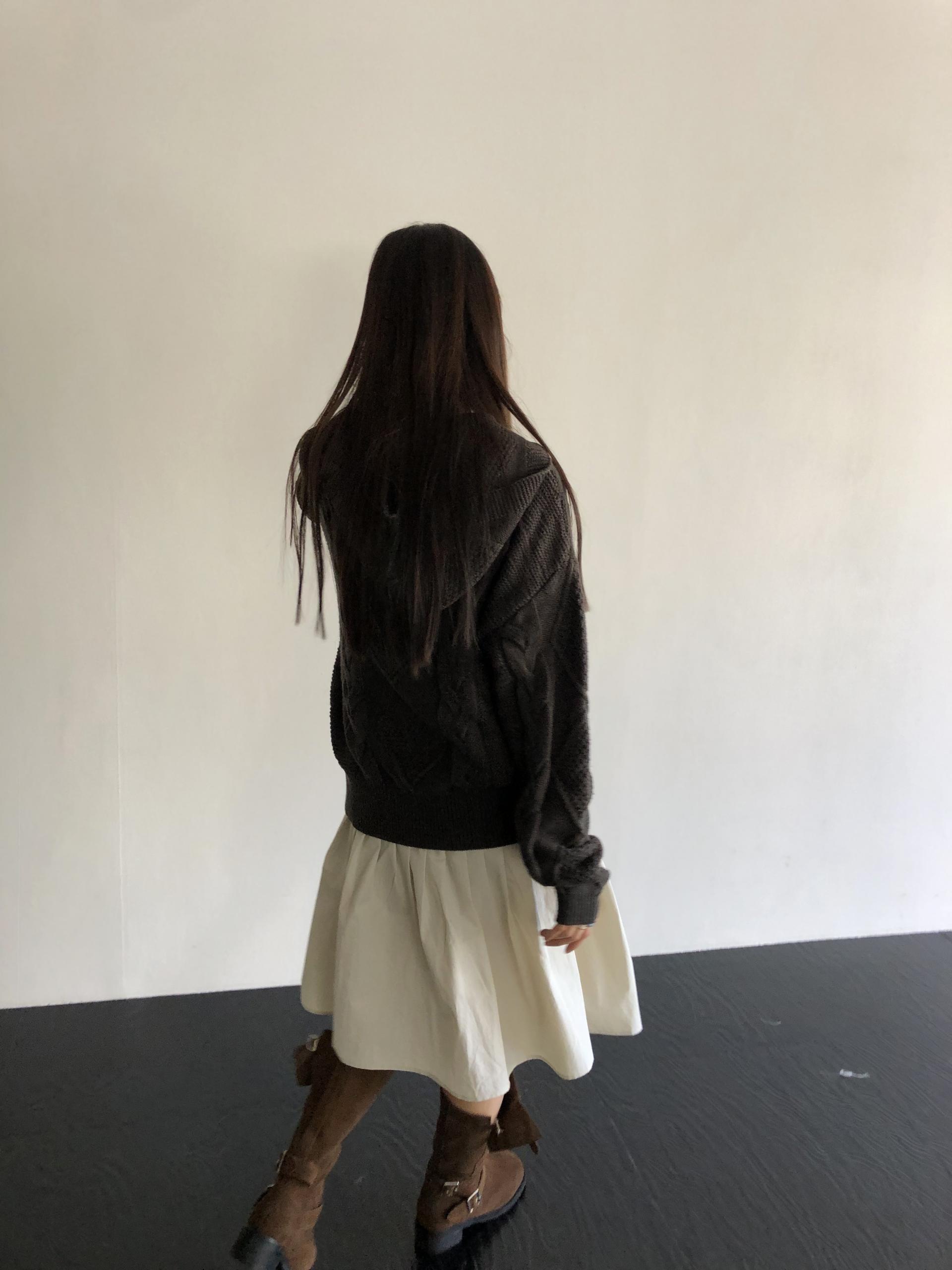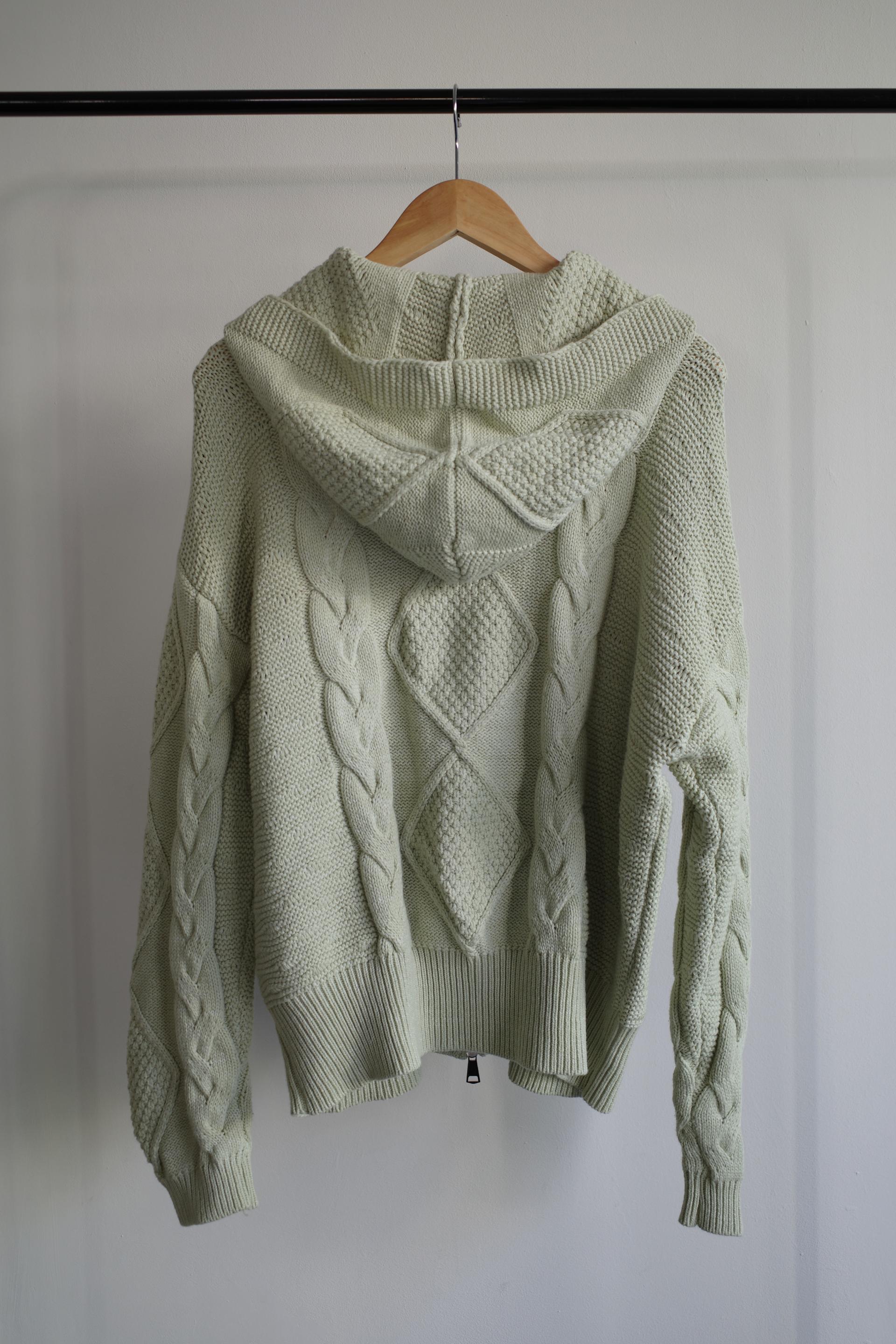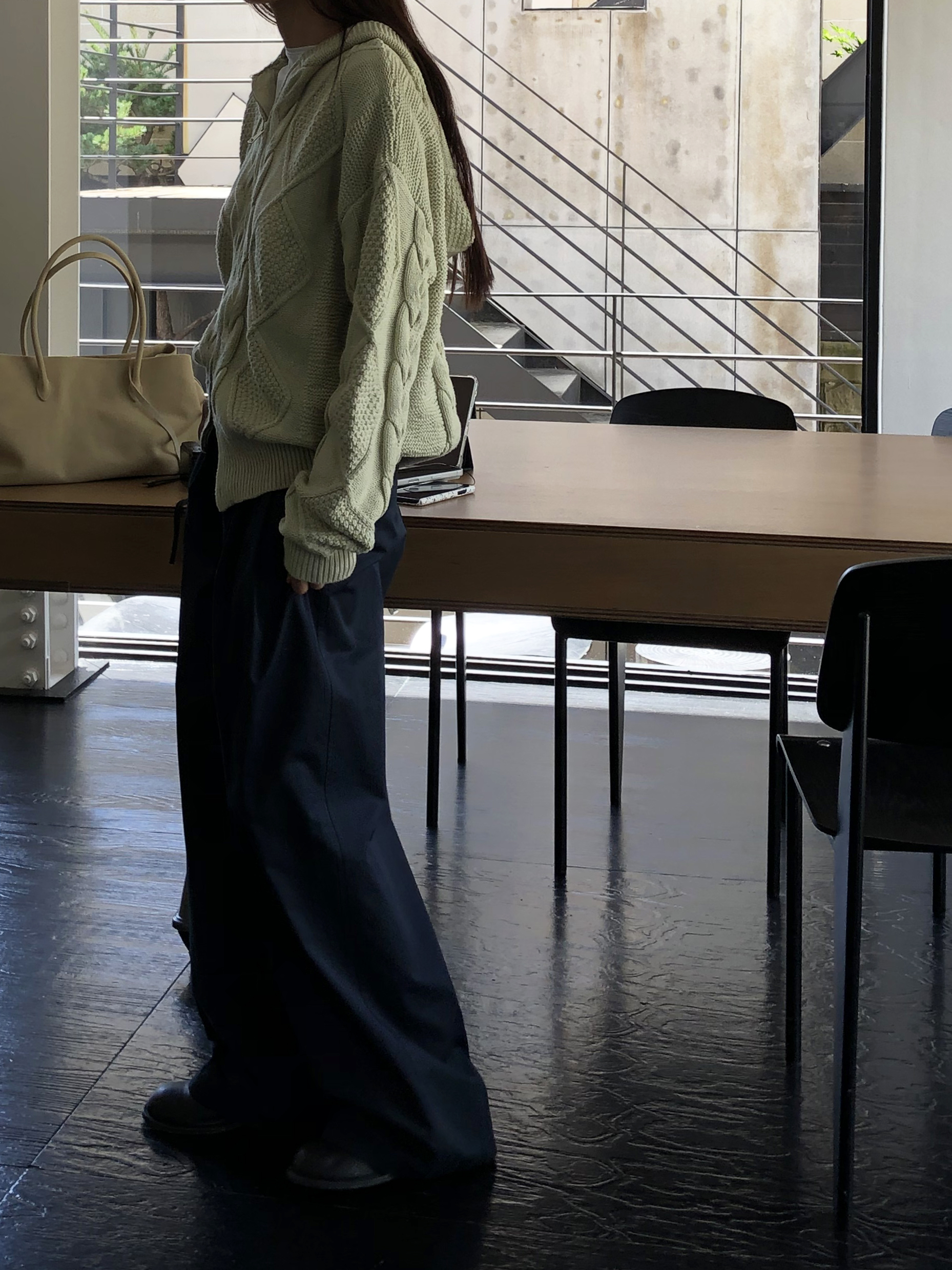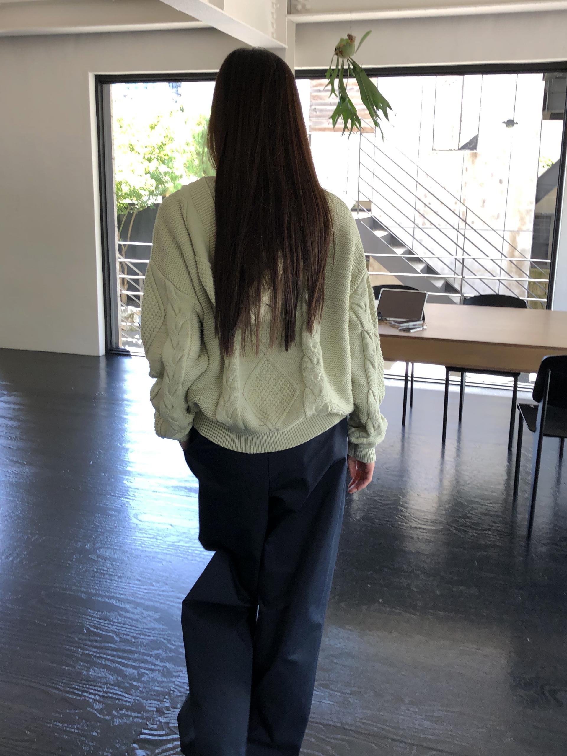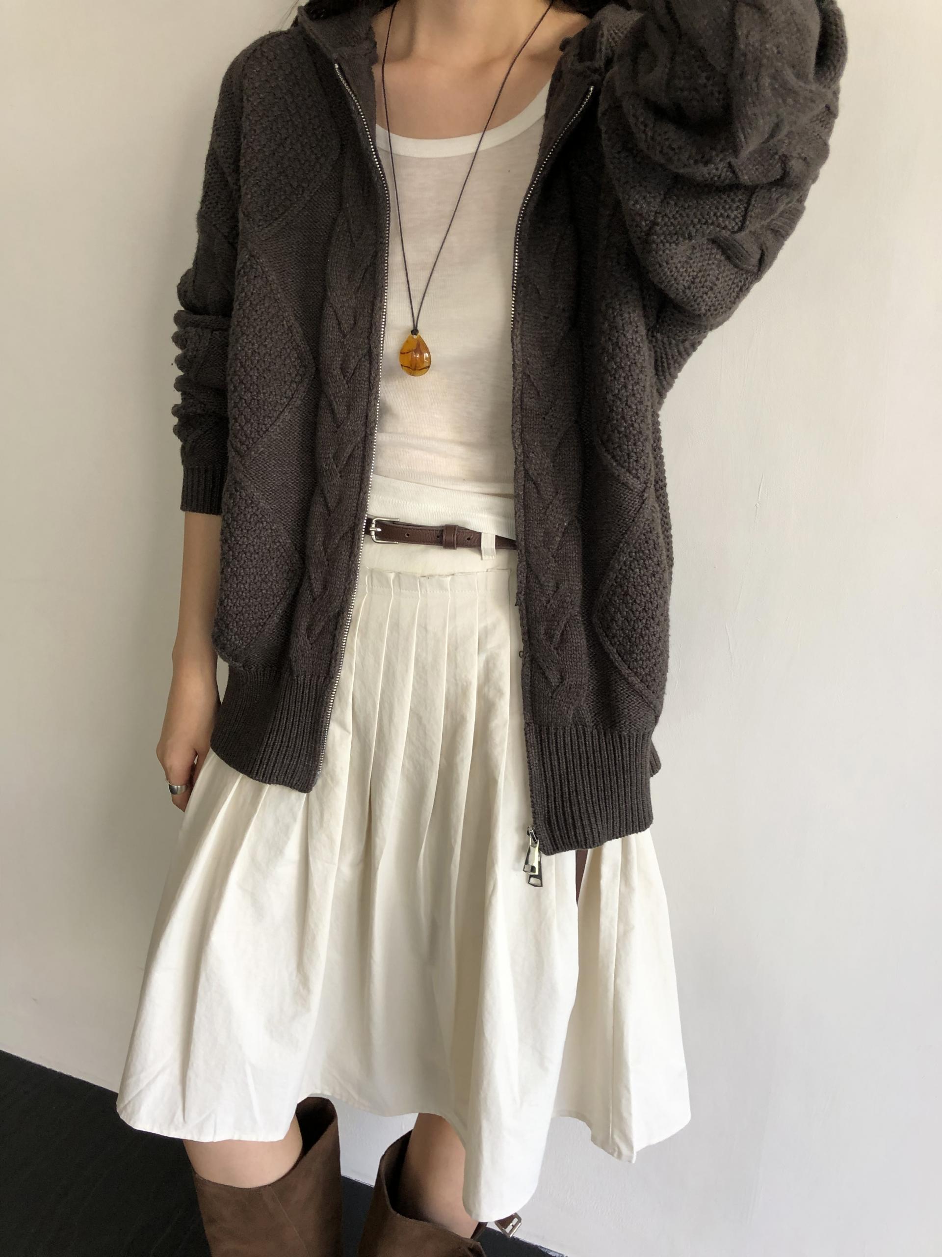 케이블 짜임을 베이스로 섹션마다 다른 짜임이라 단조롭지 않고 더 예쁩니다. 전체적으로는 루즈한 핏을 가졌지만 소매와 밑단의 립조직이 탄탄하게 잡아주어 지퍼를 잠갔을 때는 꽤나 안정감있게 실루엣을 만질 수 있어요.