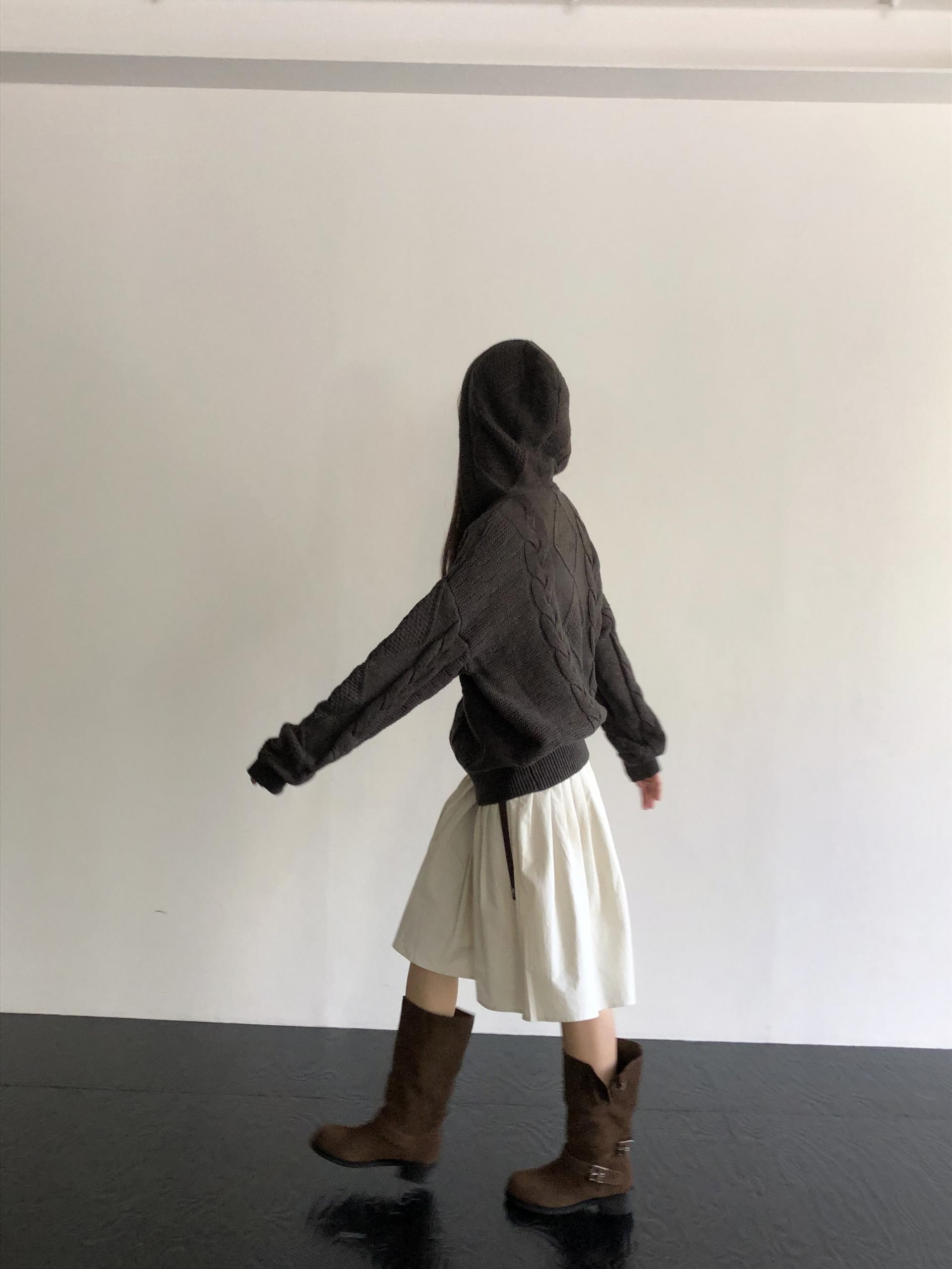 이런 루즈한 핏의 케이블 니트 후디,,, 뭔가 옛날 미드에서 본 거 같은 빈티지하고 컴피한 느낌이에요. 가까운 친구네 갈 때 파자마 팬츠 입고 이 후디 걸치고 나가는 듯한 .. 그런 웨어러블하면서 러블리한 스웨터입니다.