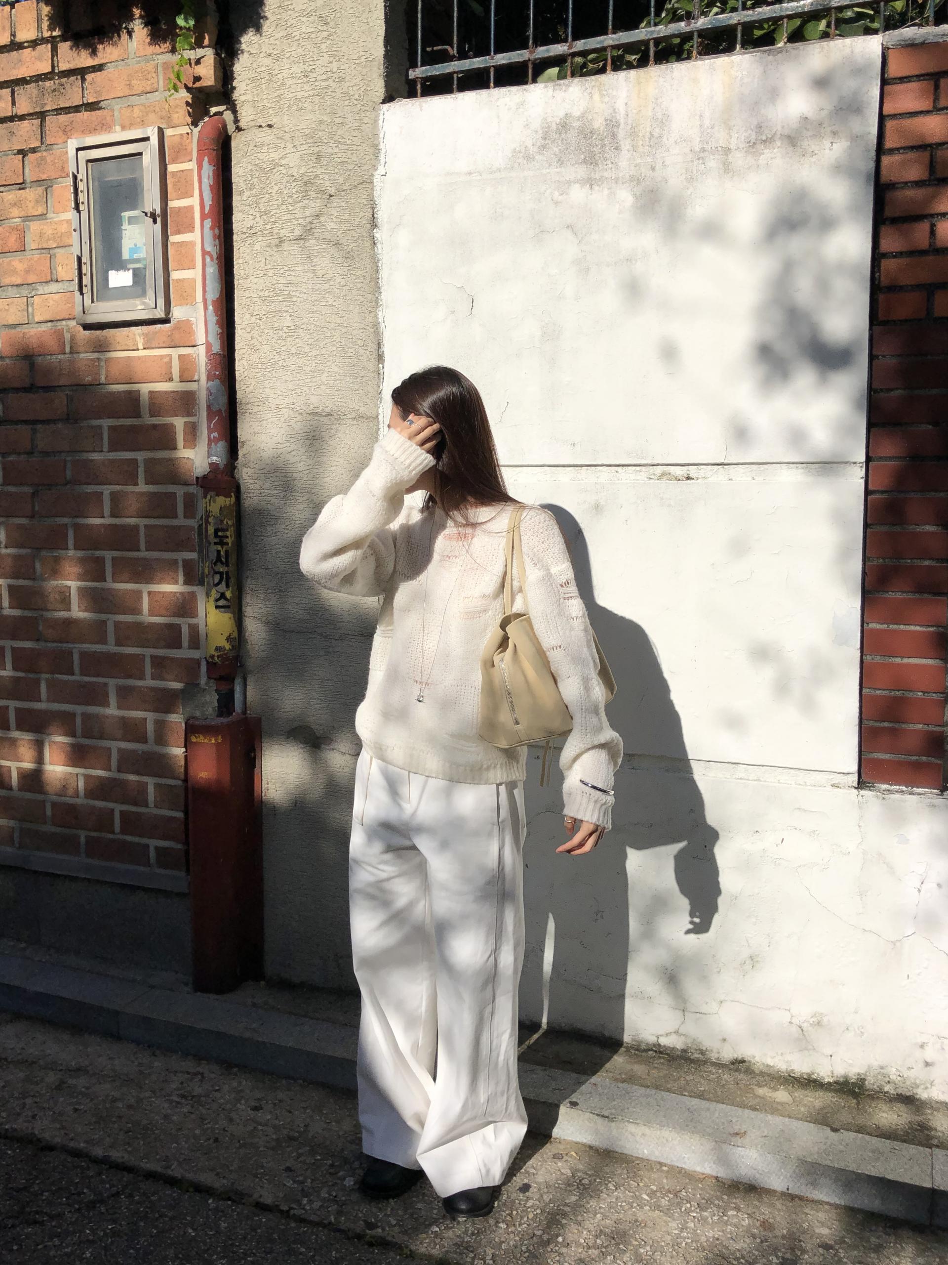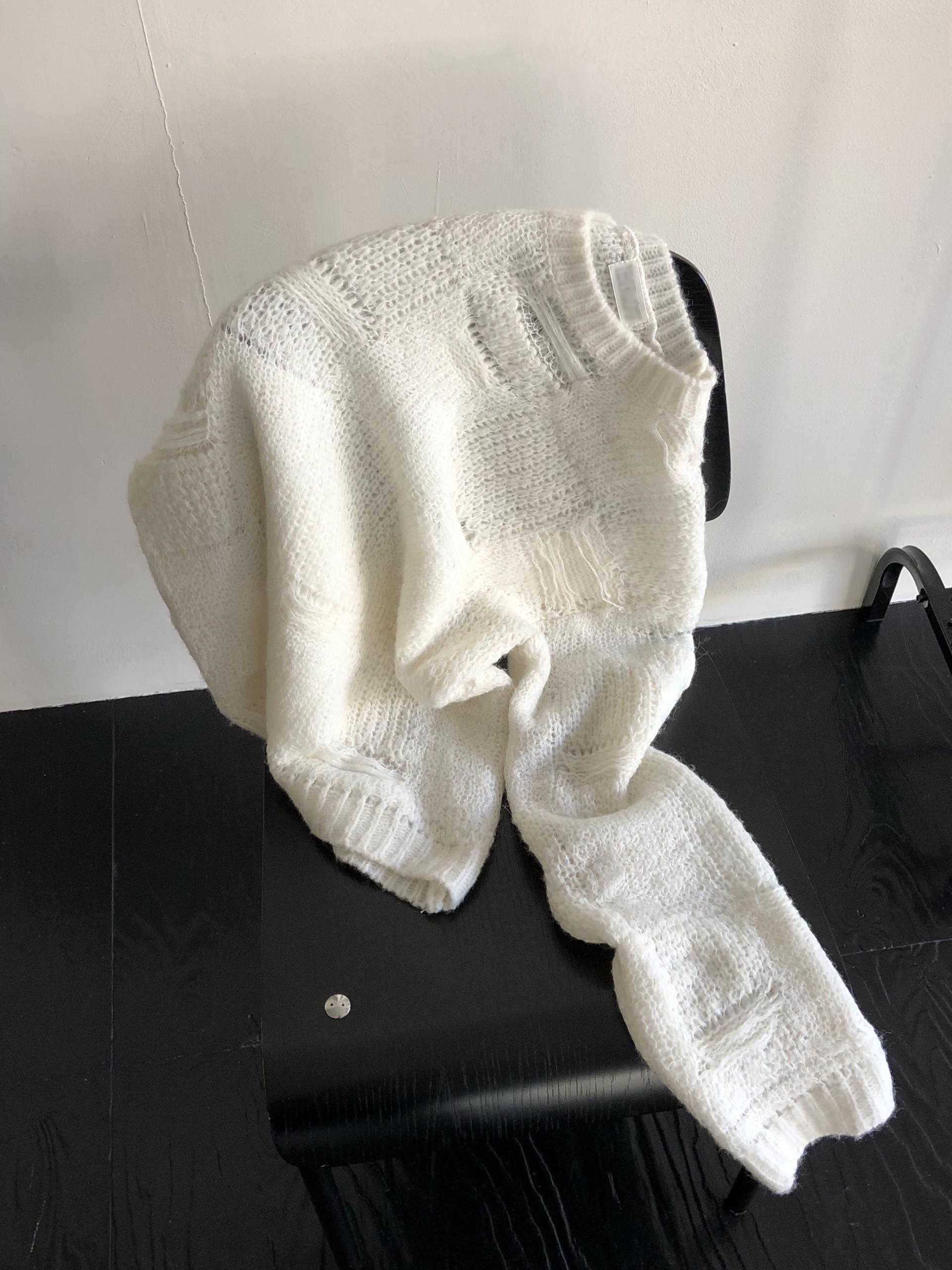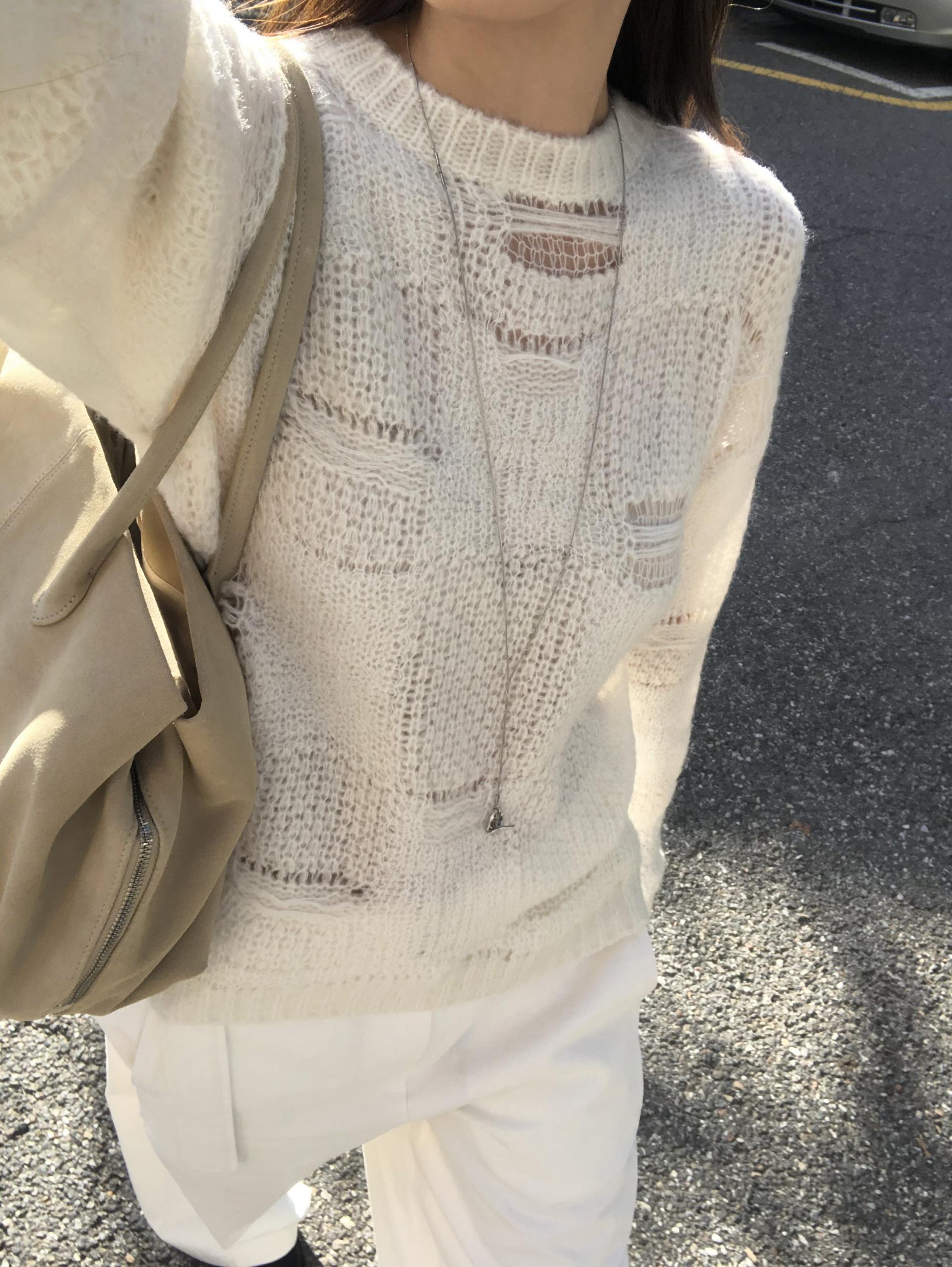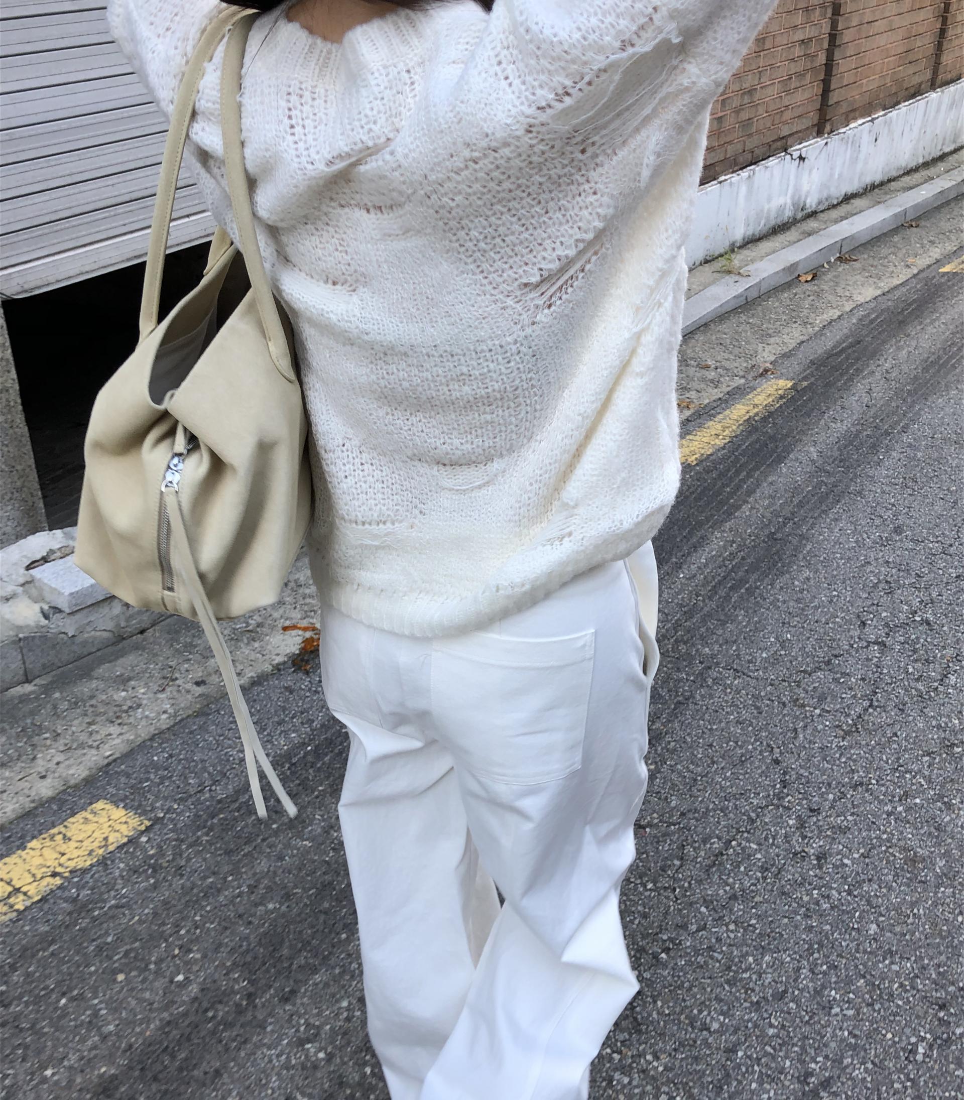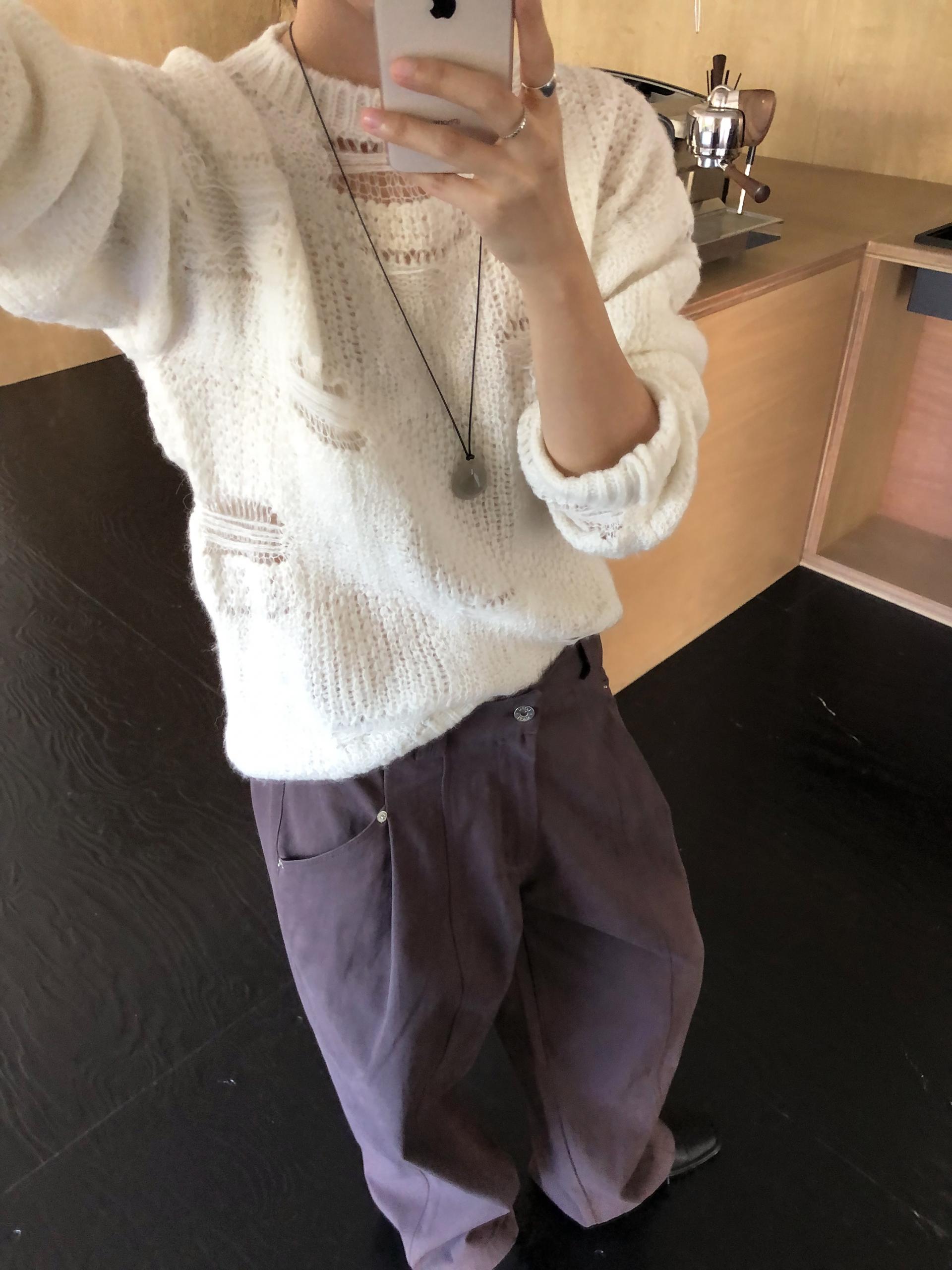 섹션별로 다른 밀도로 짜인 니팅과, 데미지 디테일이 배치되어 독특하고 특별합니다. 그렇지만 절대 과하지 않아요. 딱 포인트 스웨터로 연출하기 좋은 정도라 적극 추천드립니다.