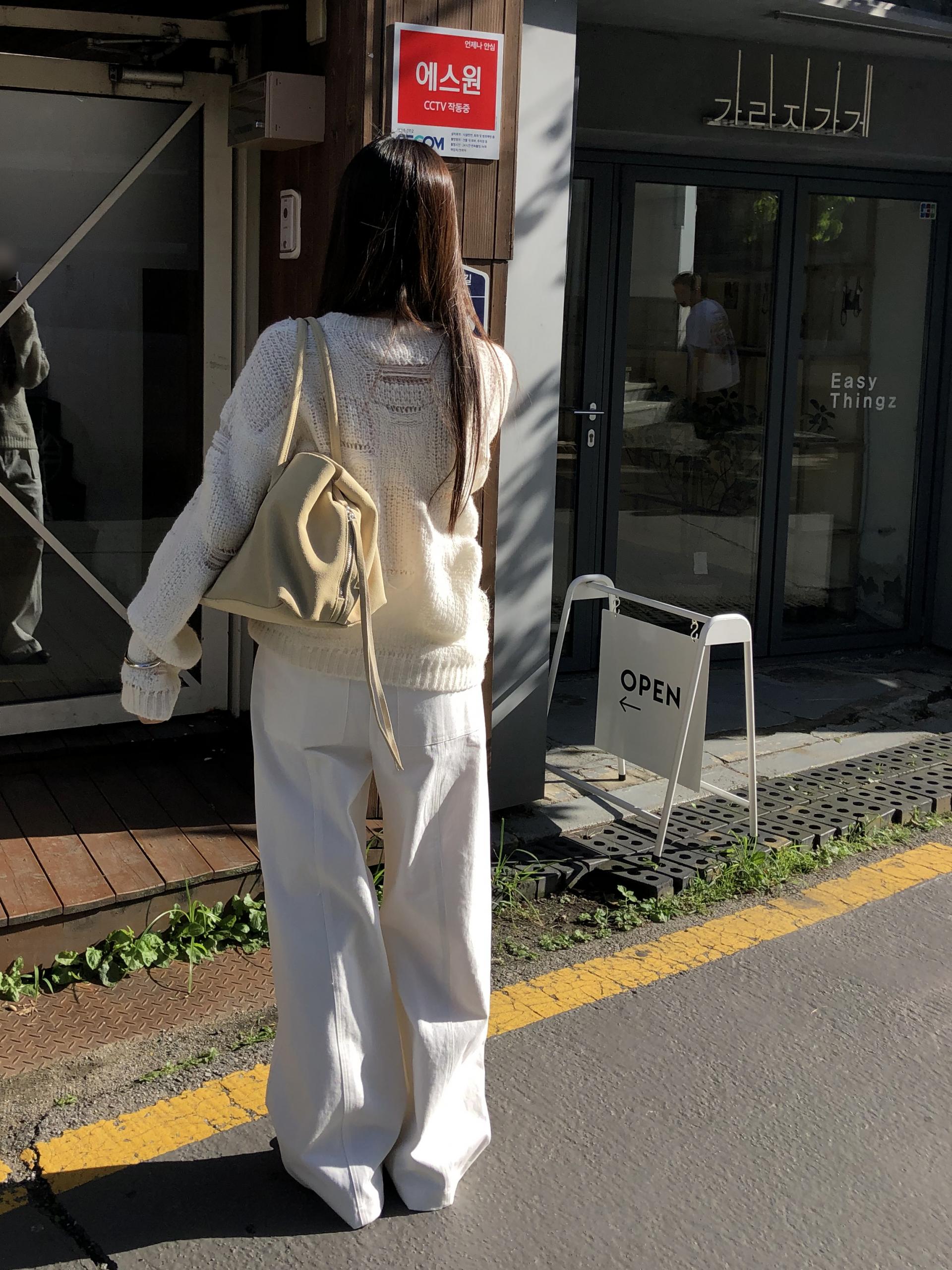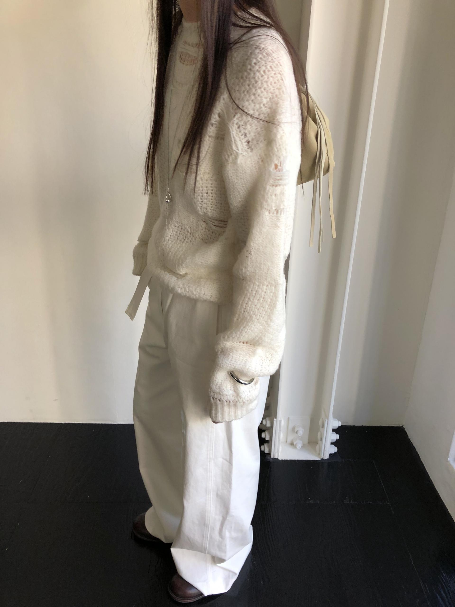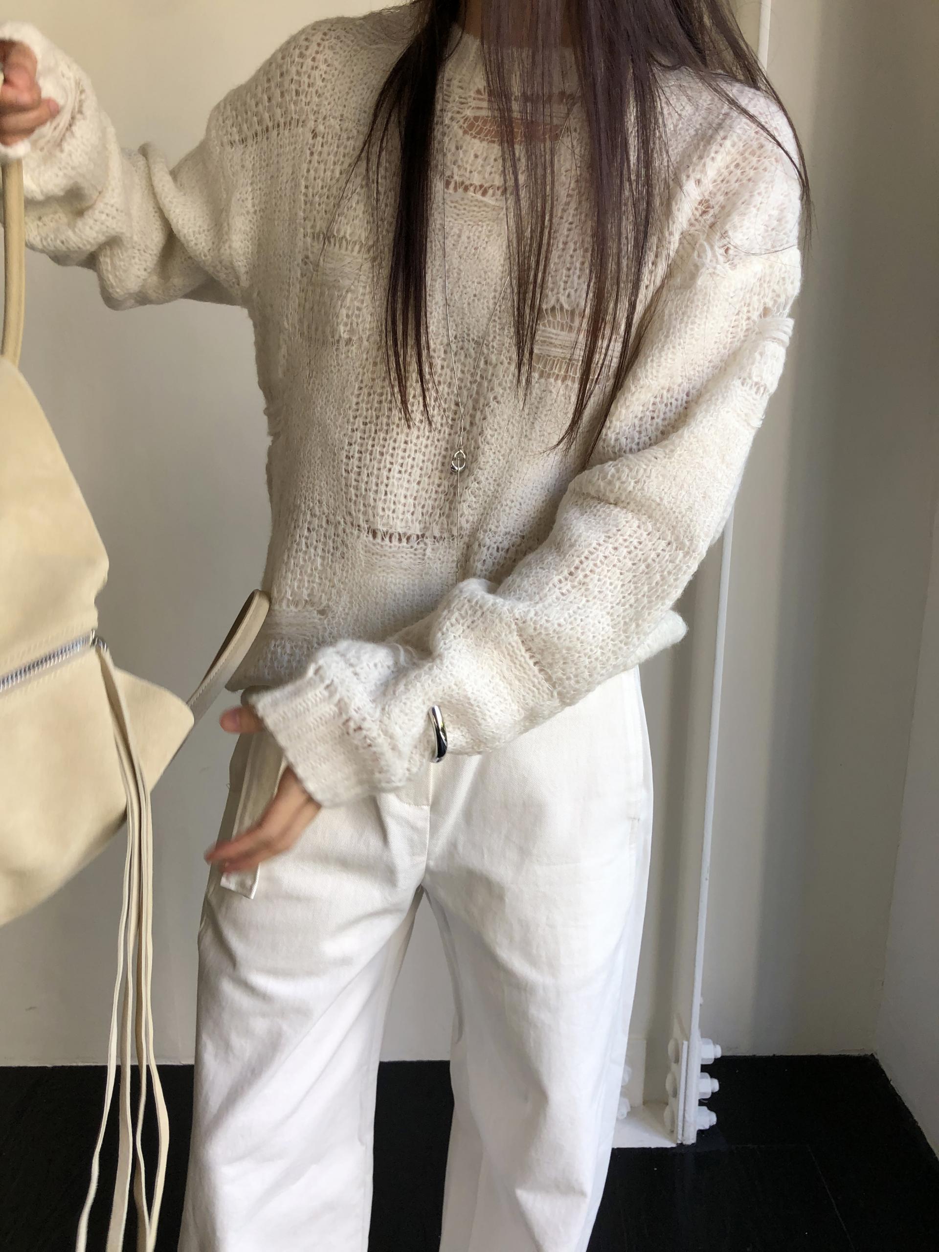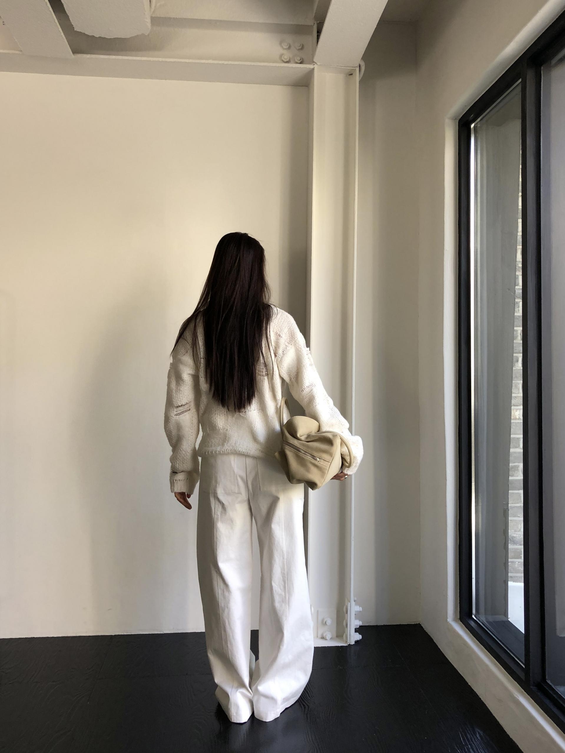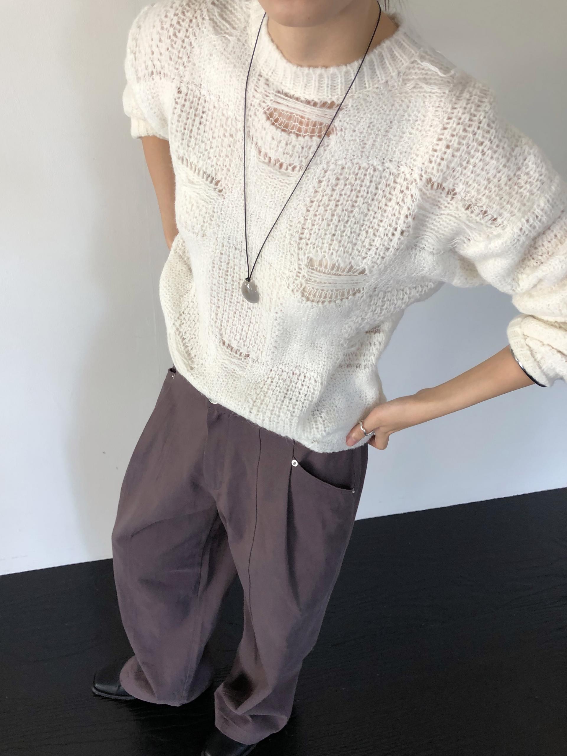 섹션별로 다른 밀도로 짜인 니팅과, 데미지 디테일이 배치되어 독특하고 특별합니다. 그렇지만 절대 과하지 않아요. 딱 포인트 스웨터로 연출하기 좋은 정도라 적극 추천드립니다.
