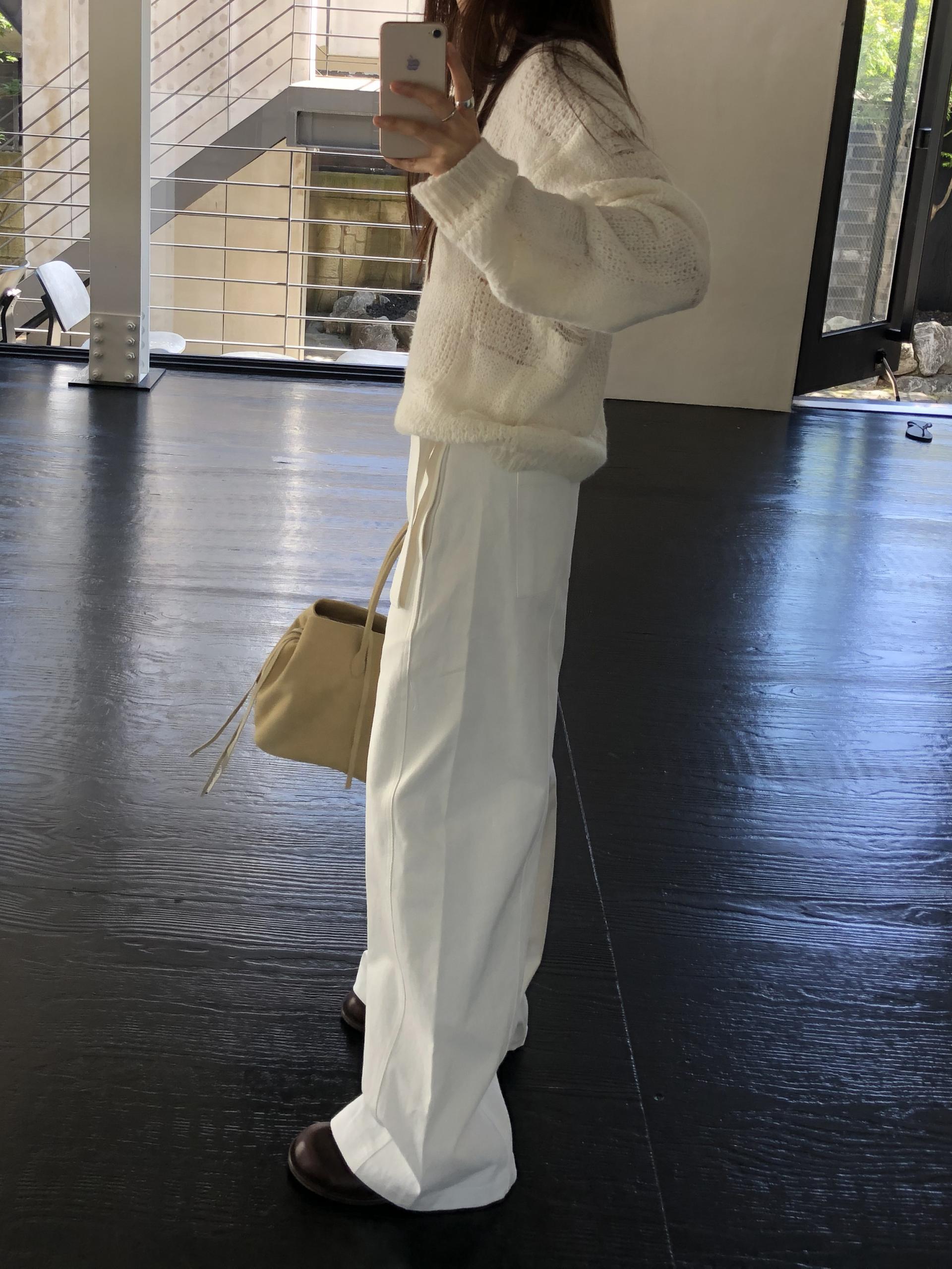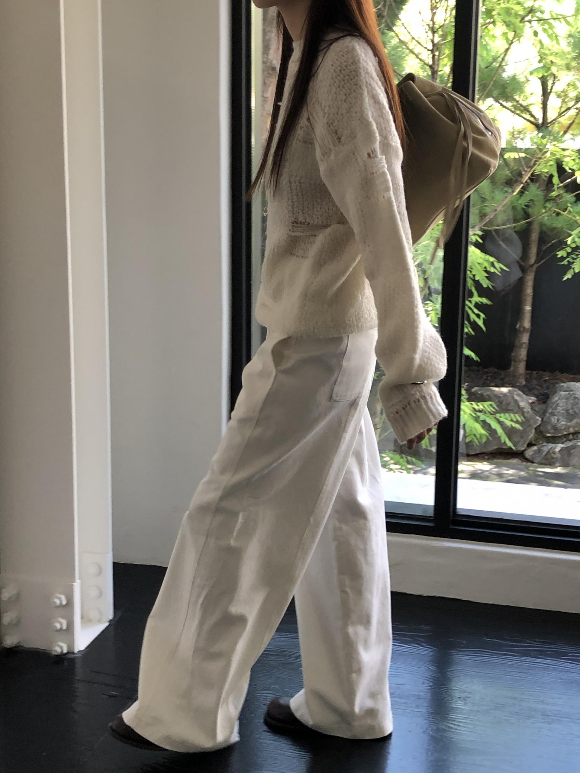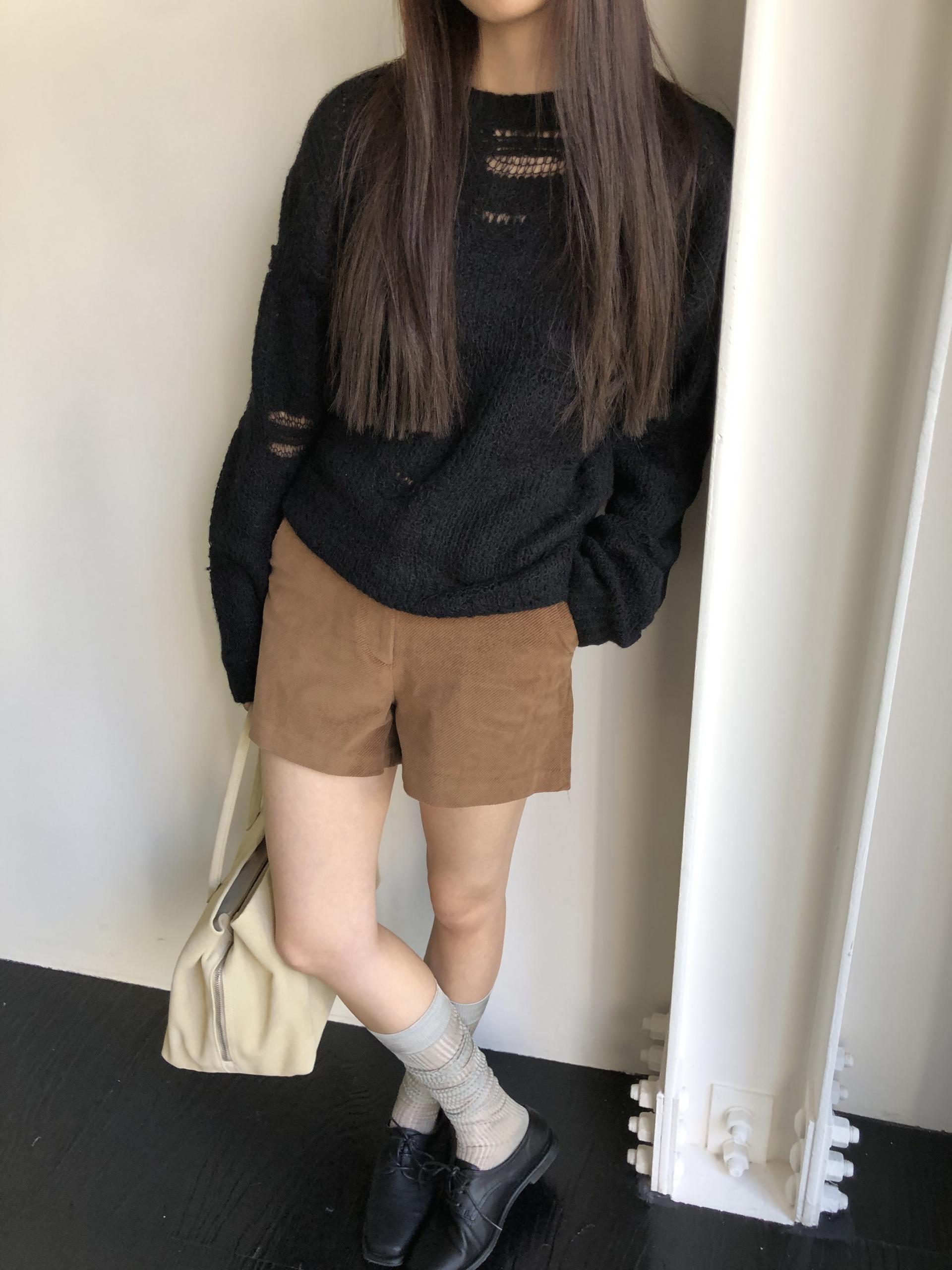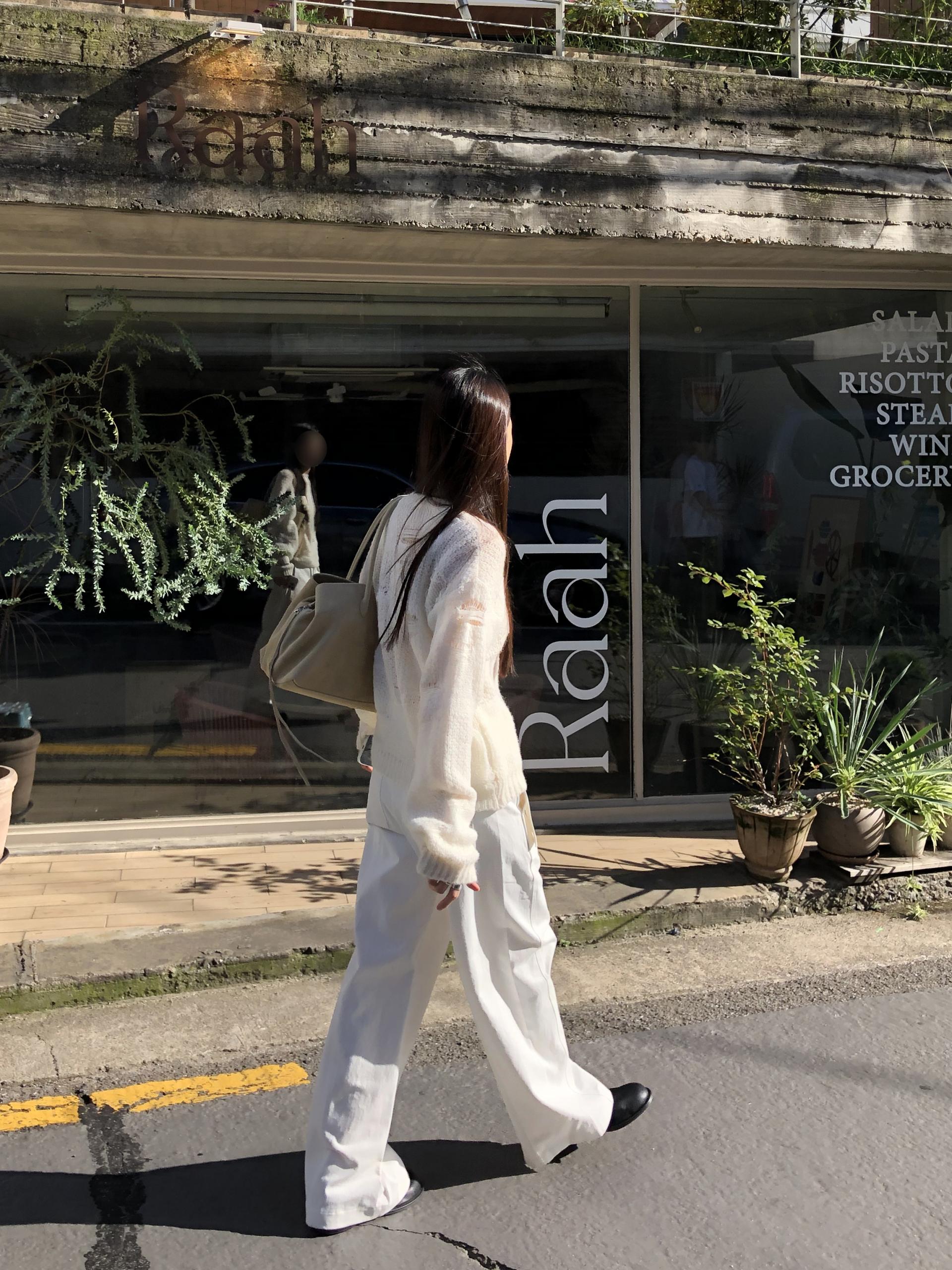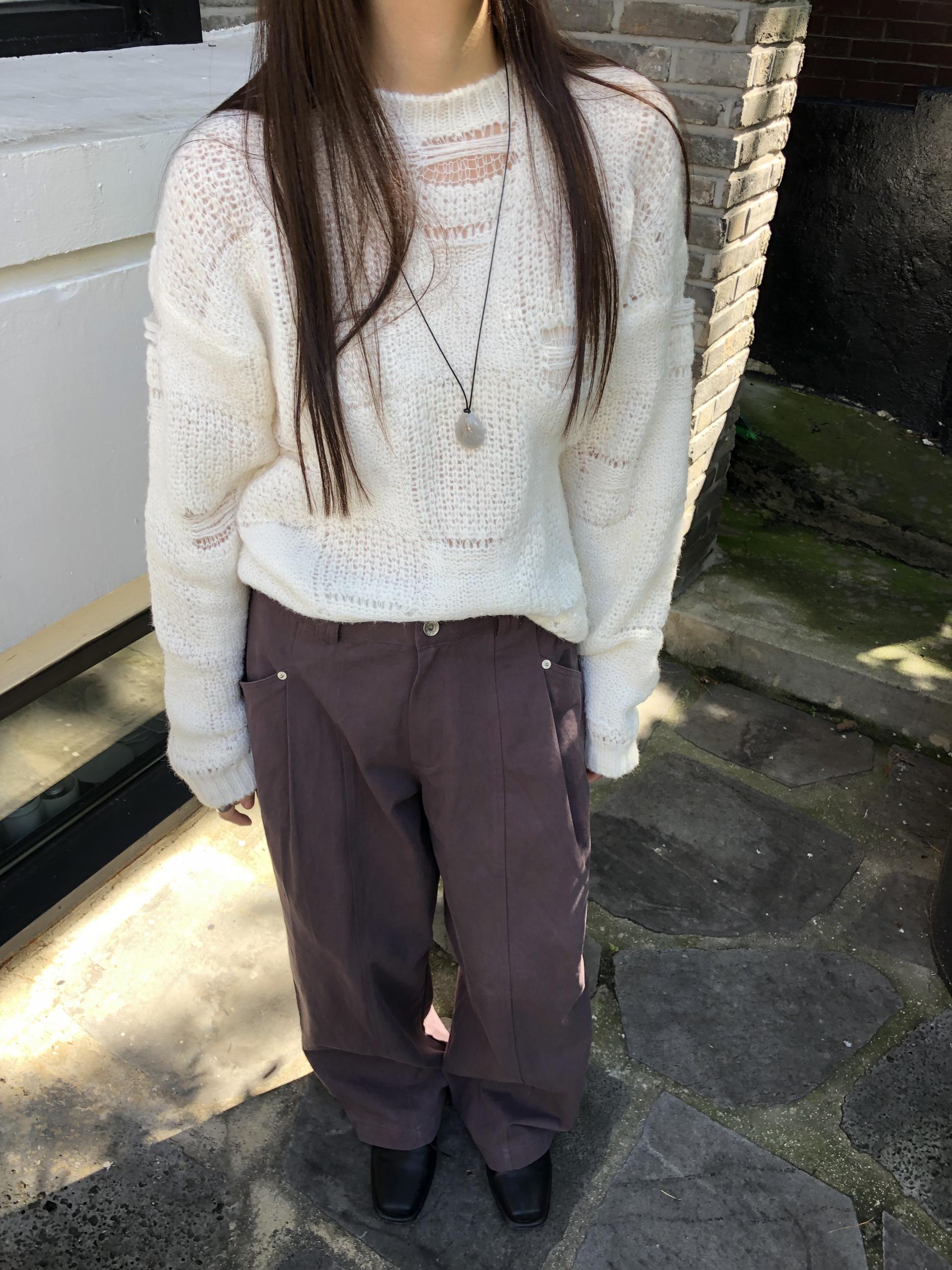 섹션별로 다른 밀도로 짜인 니팅과, 데미지 디테일이 배치되어 독특하고 특별합니다. 그렇지만 절대 과하지 않아요. 딱 포인트 스웨터로 연출하기 좋은 정도라 적극 추천드립니다.
