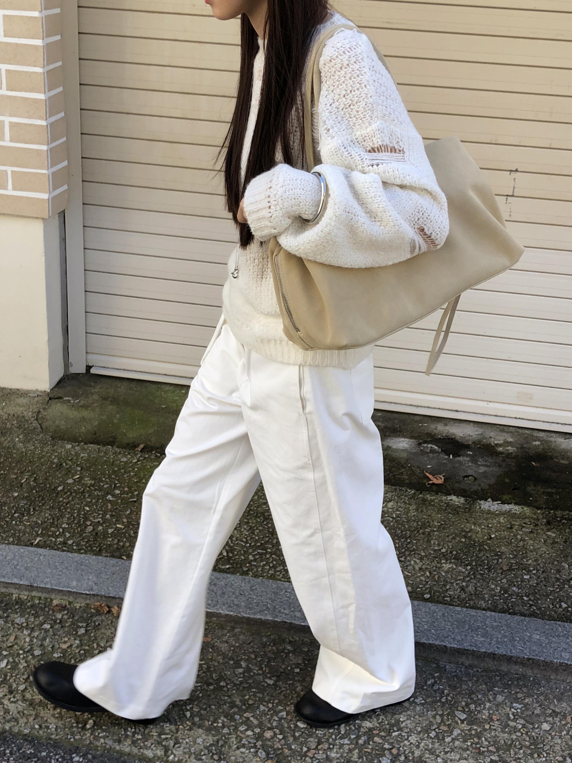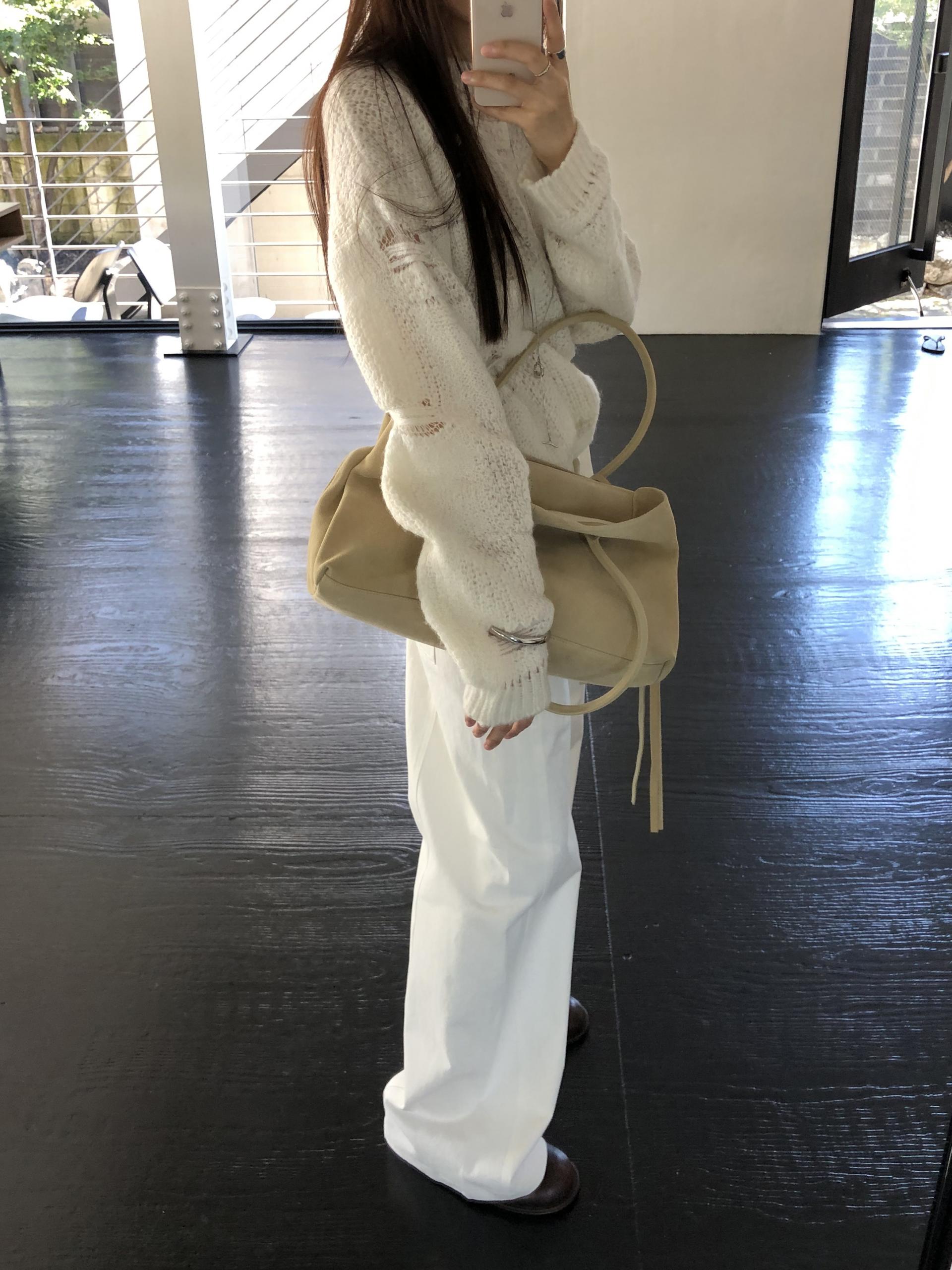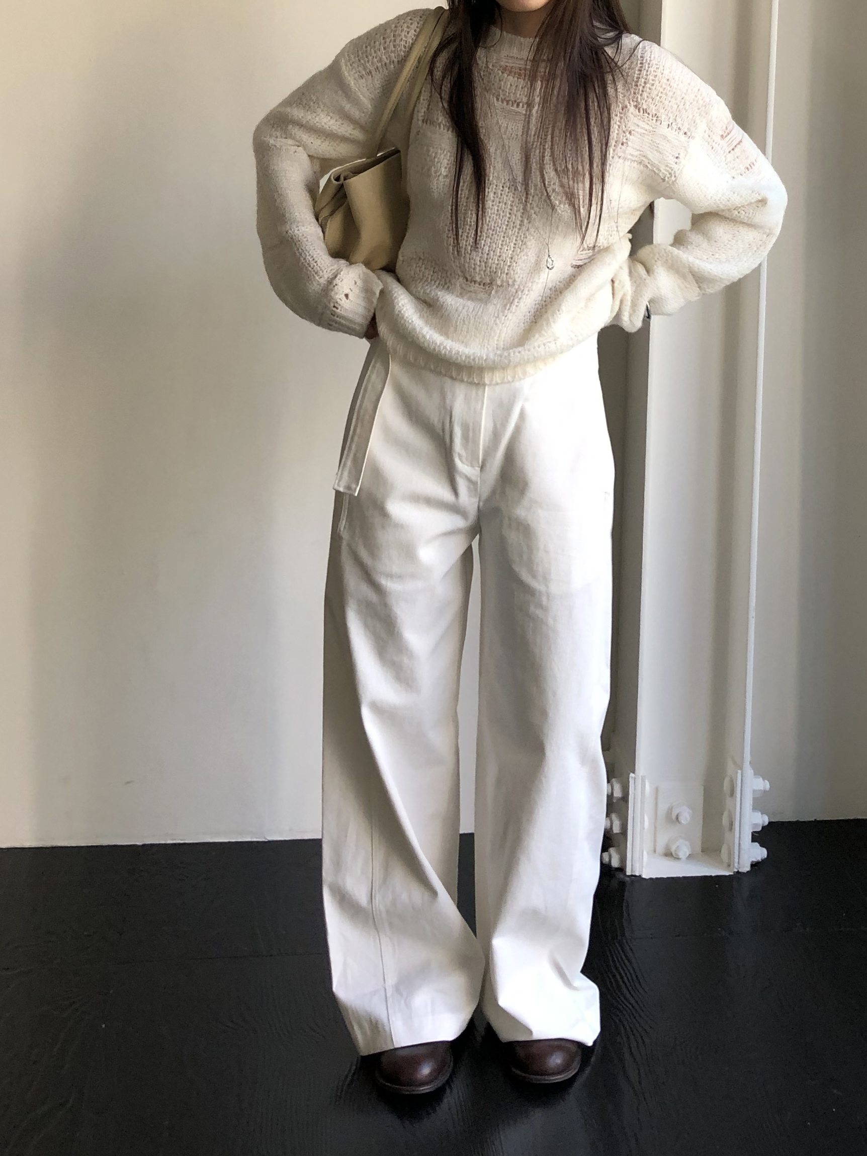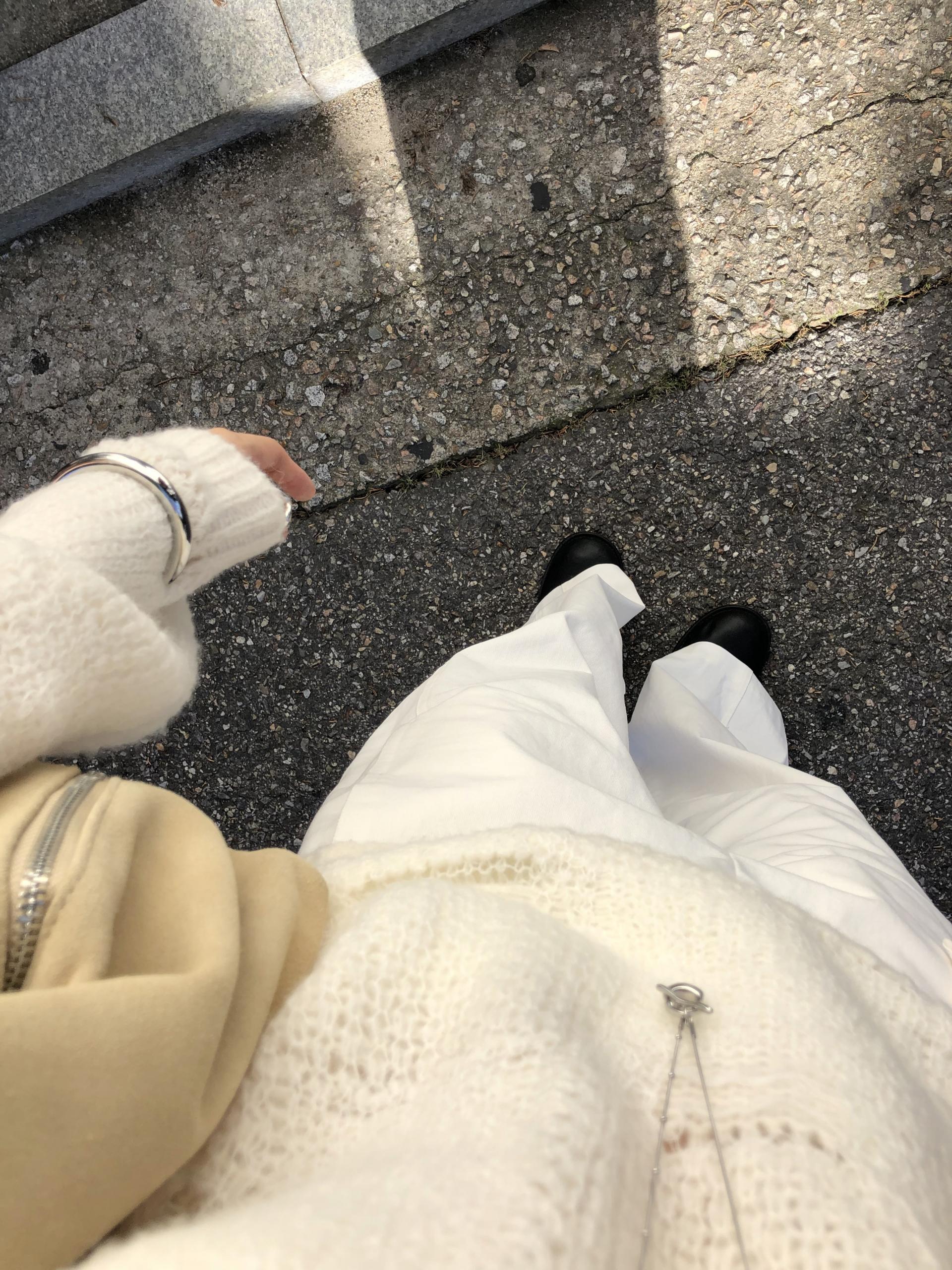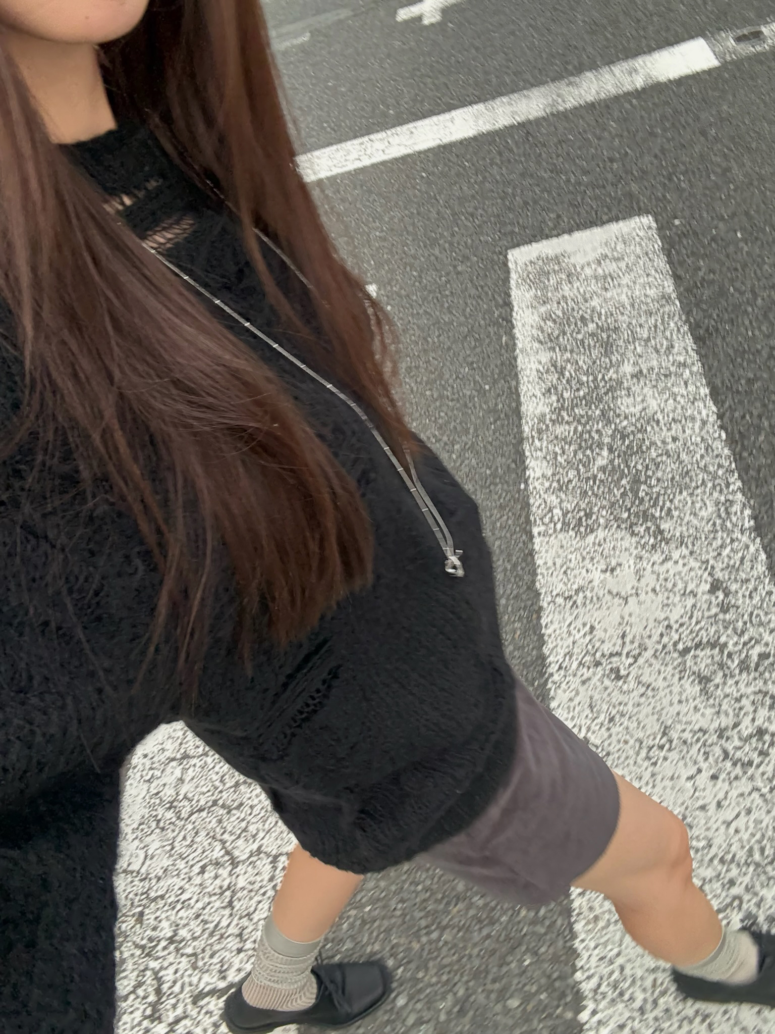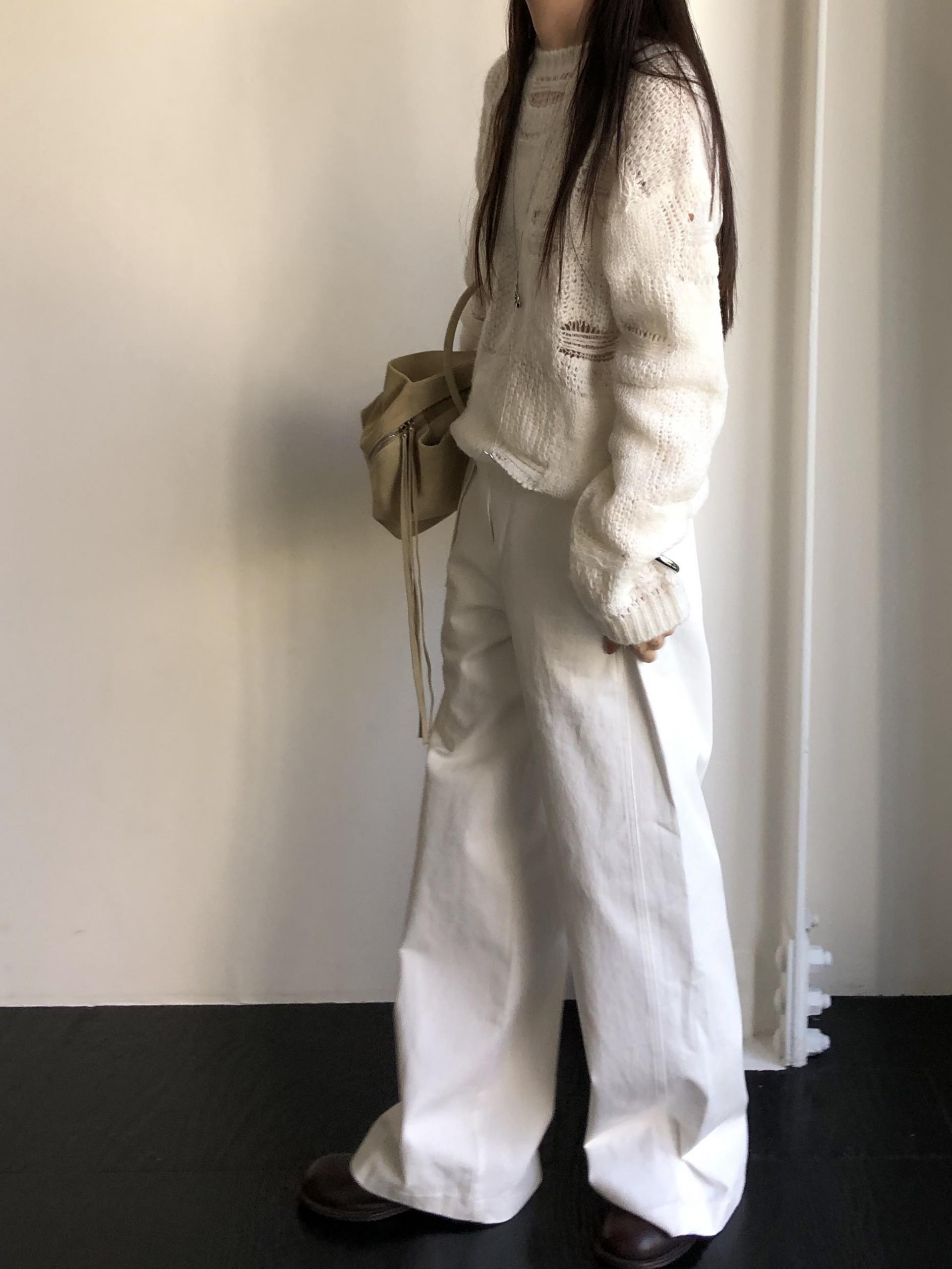 섹션별로 다른 밀도로 짜인 니팅과, 데미지 디테일이 배치되어 독특하고 특별합니다. 그렇지만 절대 과하지 않아요. 딱 포인트 스웨터로 연출하기 좋은 정도라 적극 추천드립니다.