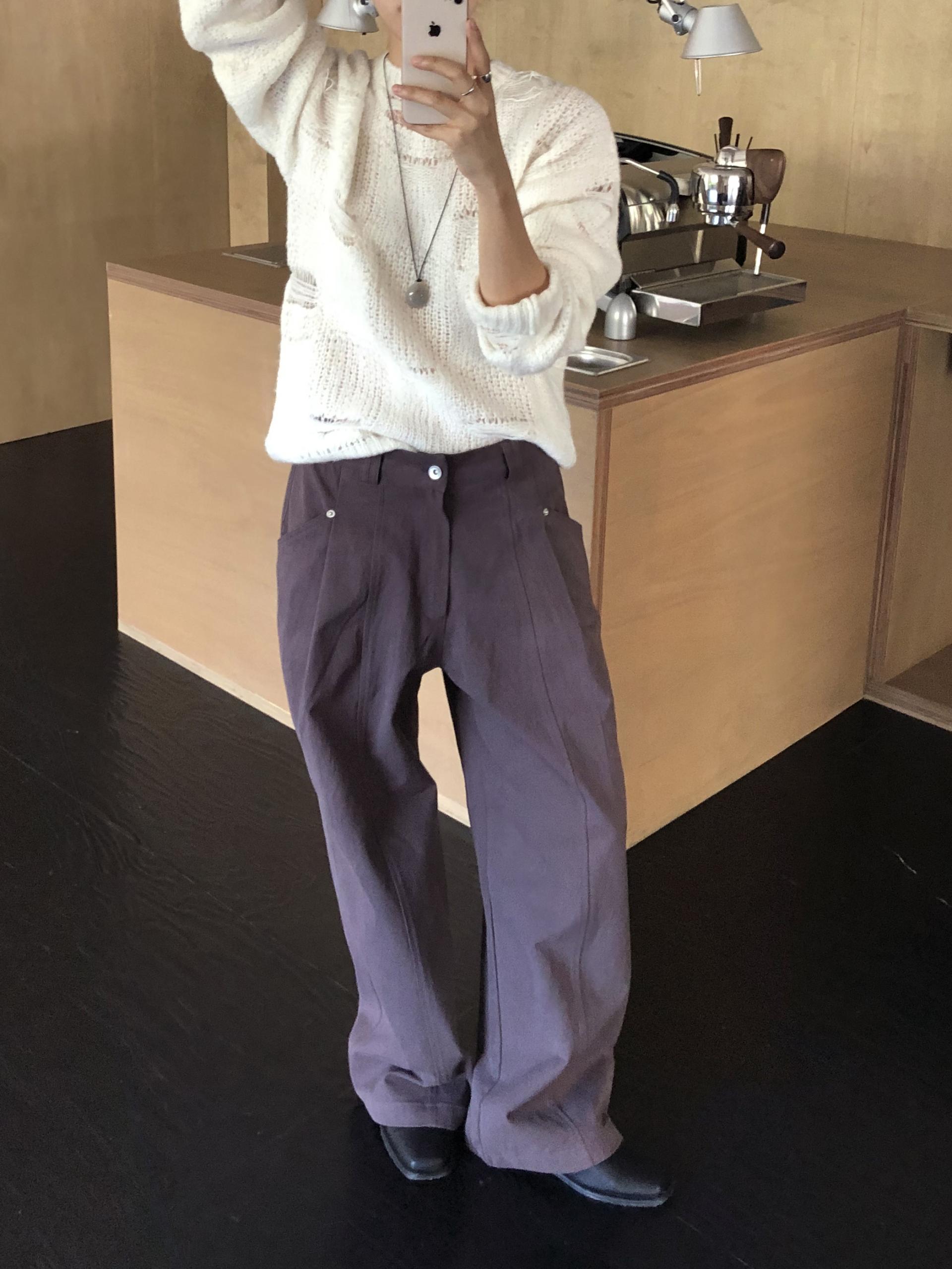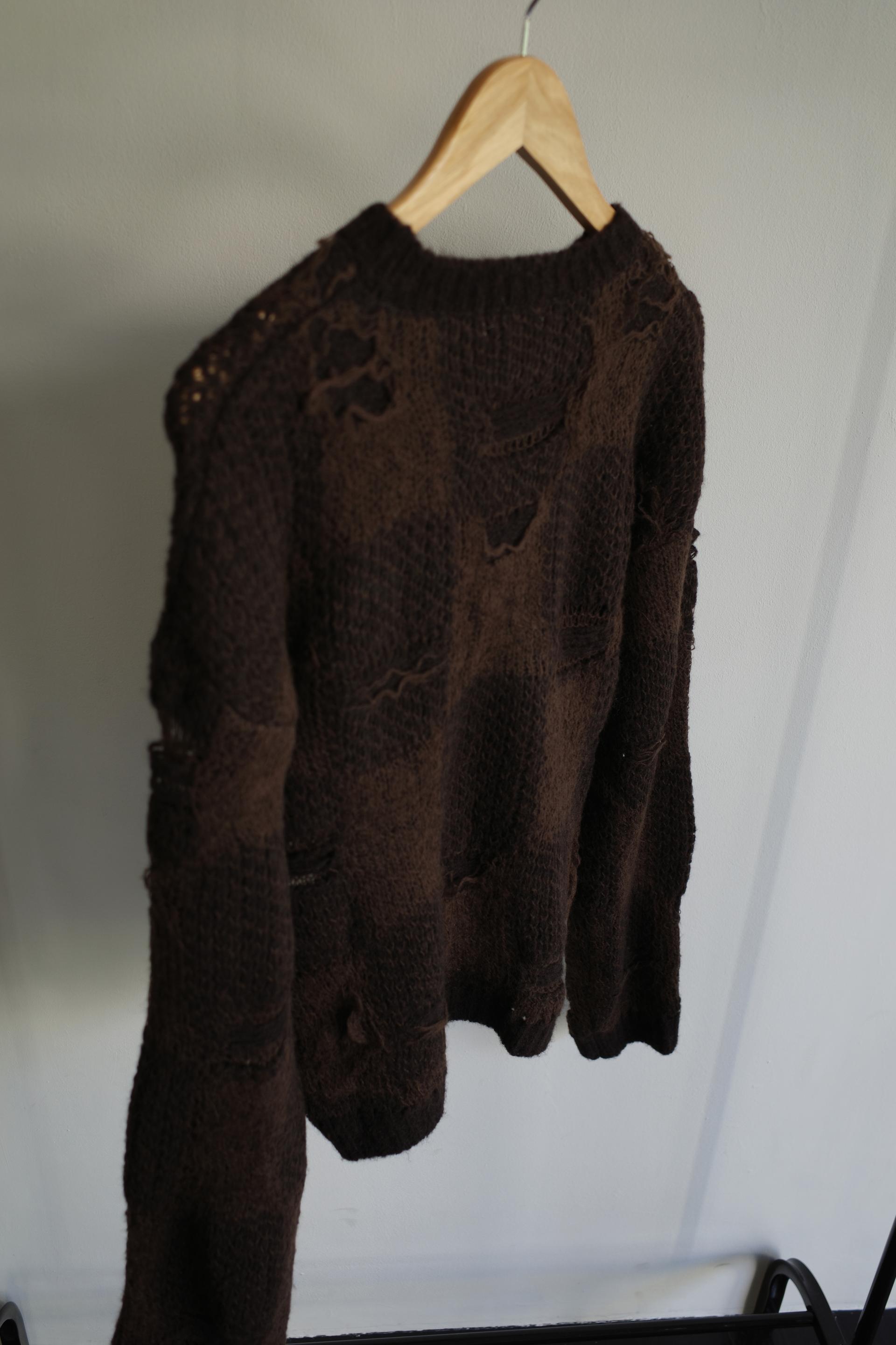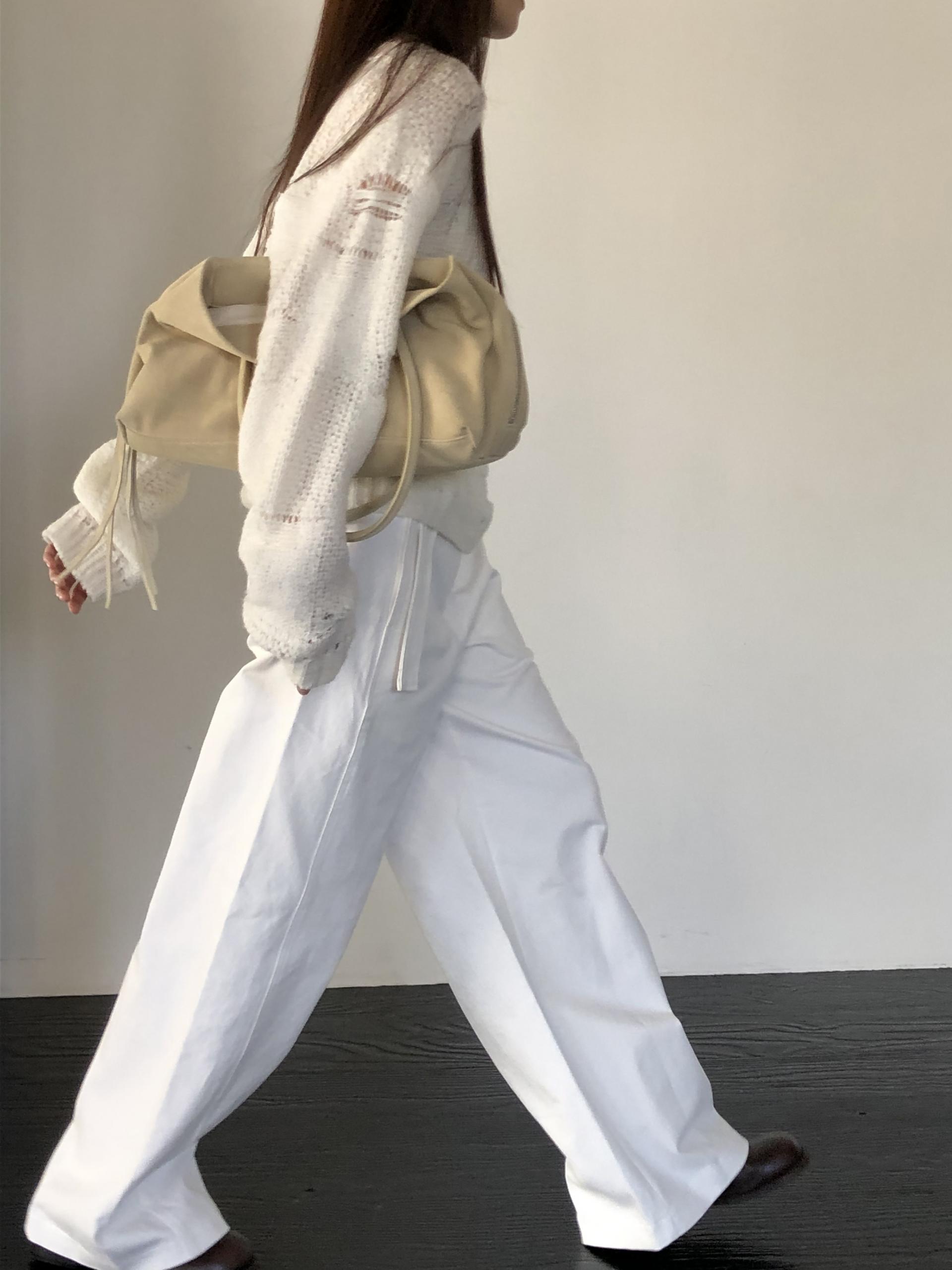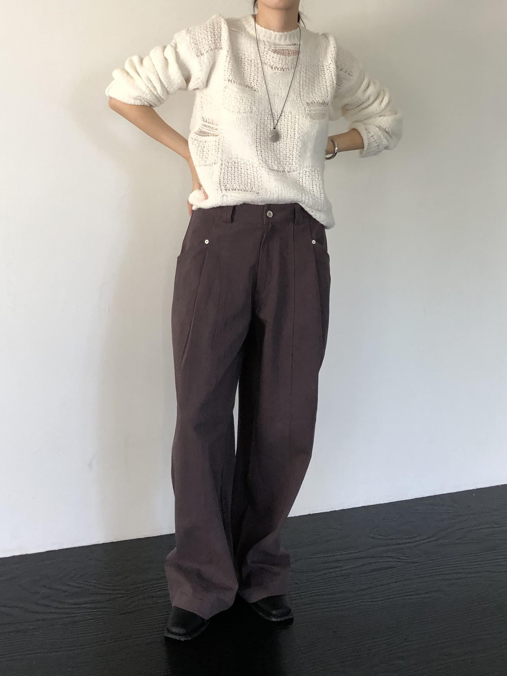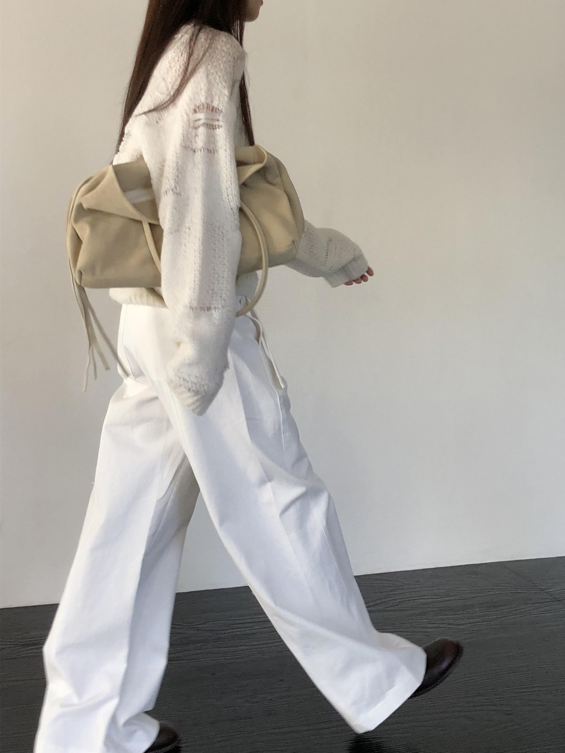 섹션별로 다른 밀도로 짜인 니팅과, 데미지 디테일이 배치되어 독특하고 특별합니다. 그렇지만 절대 과하지 않아요. 딱 포인트 스웨터로 연출하기 좋은 정도라 적극 추천드립니다.