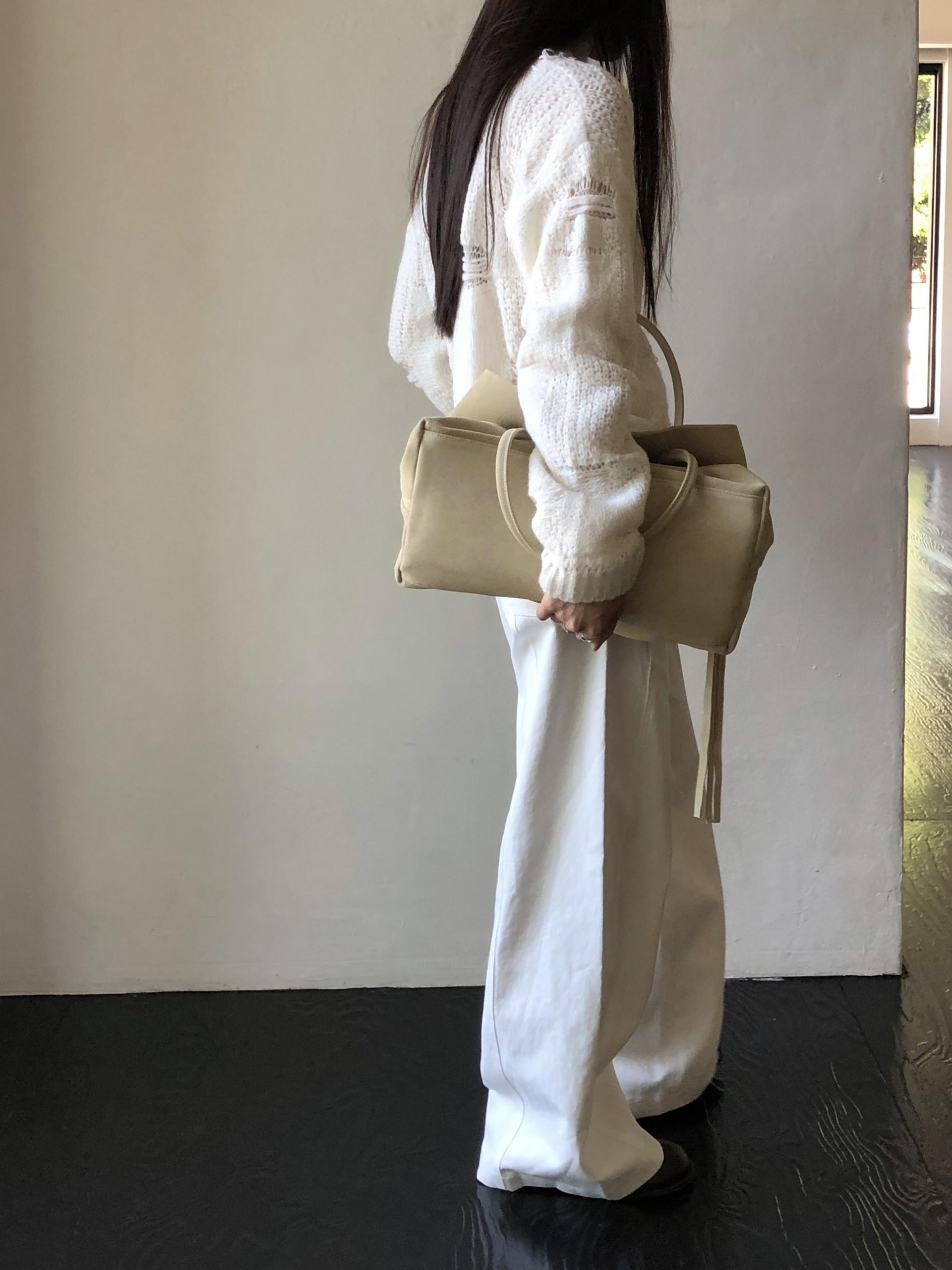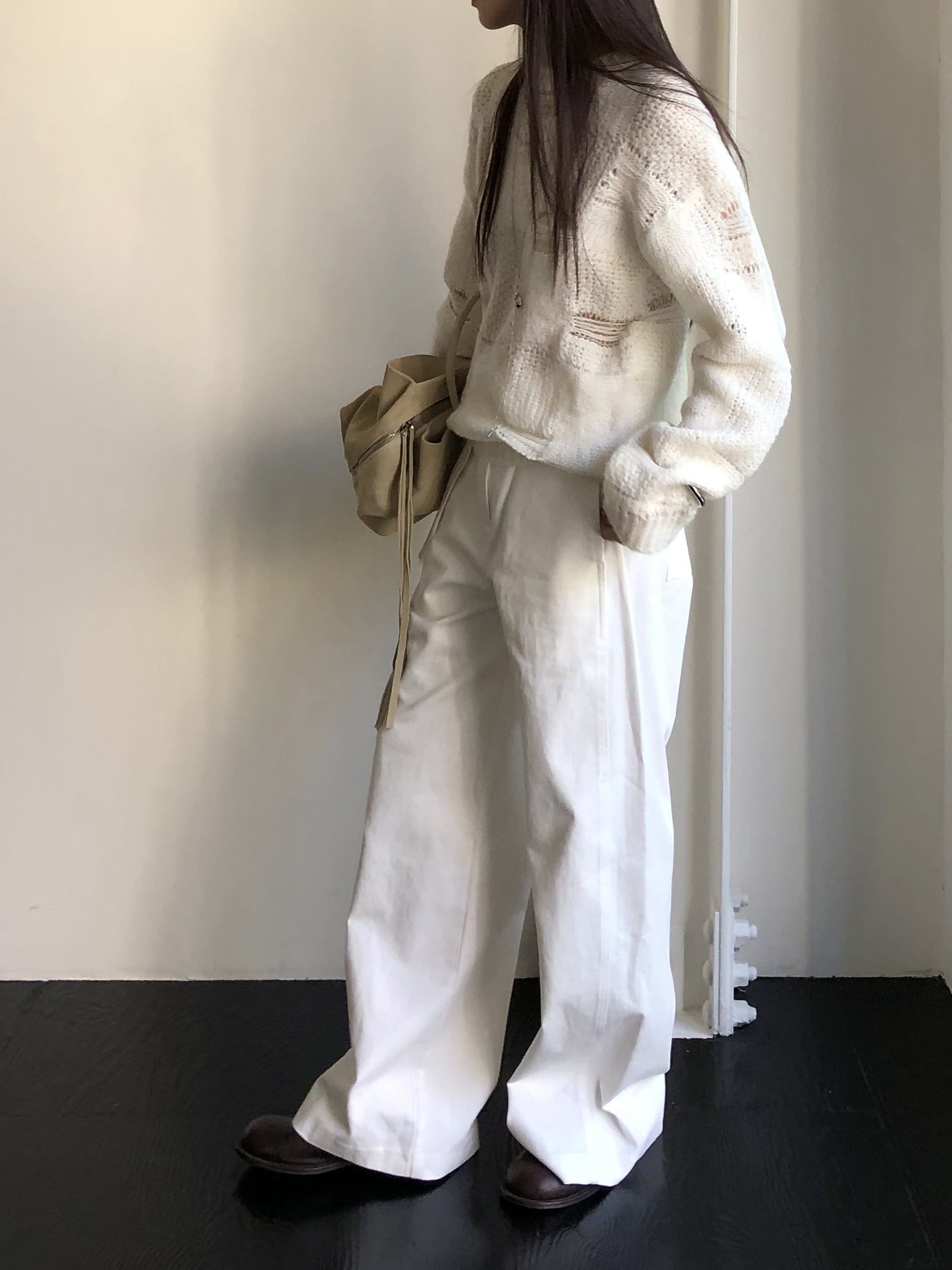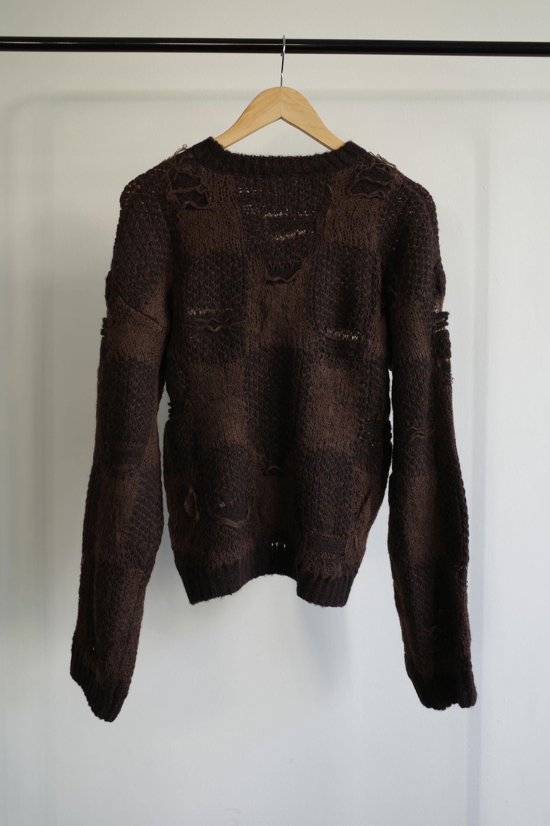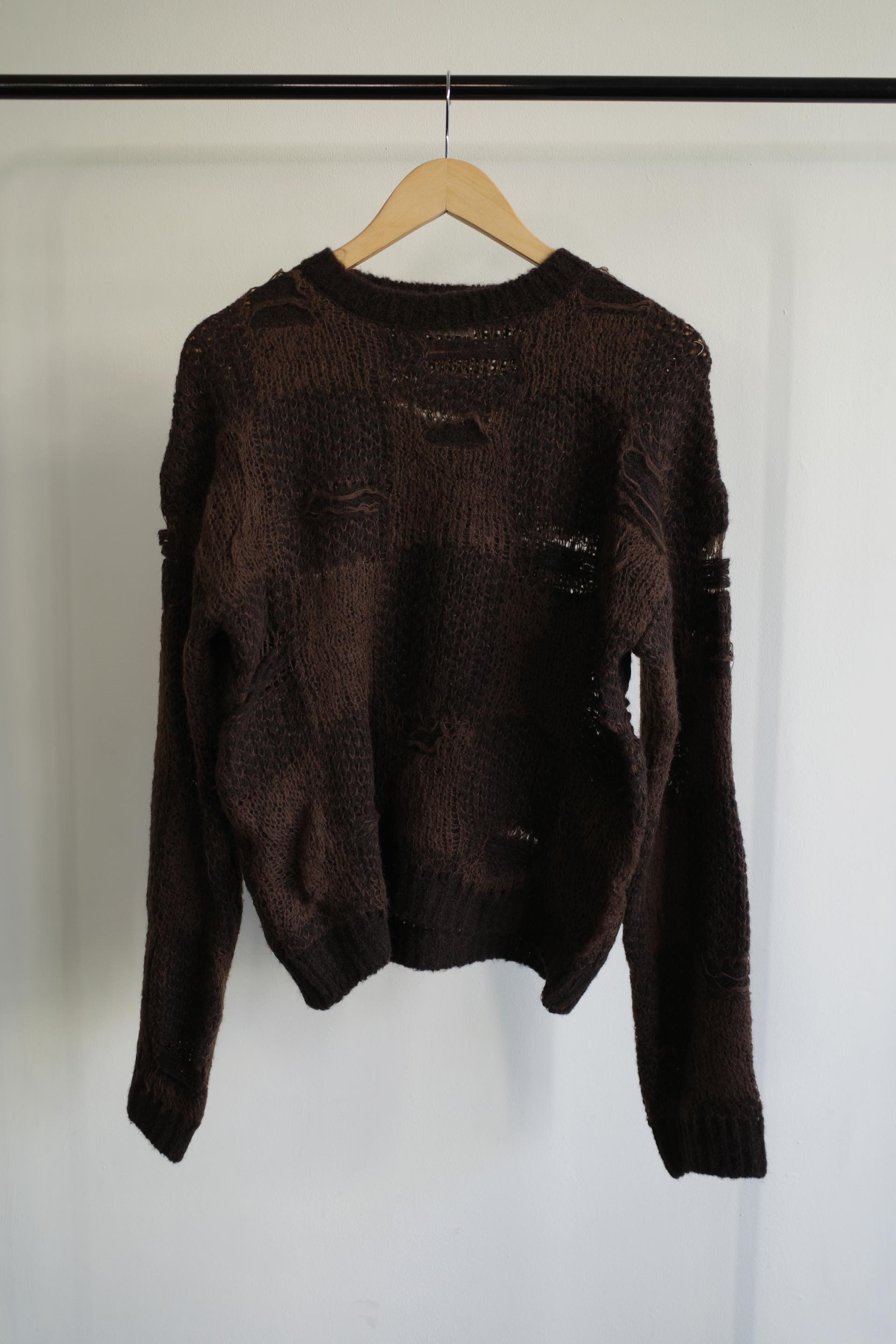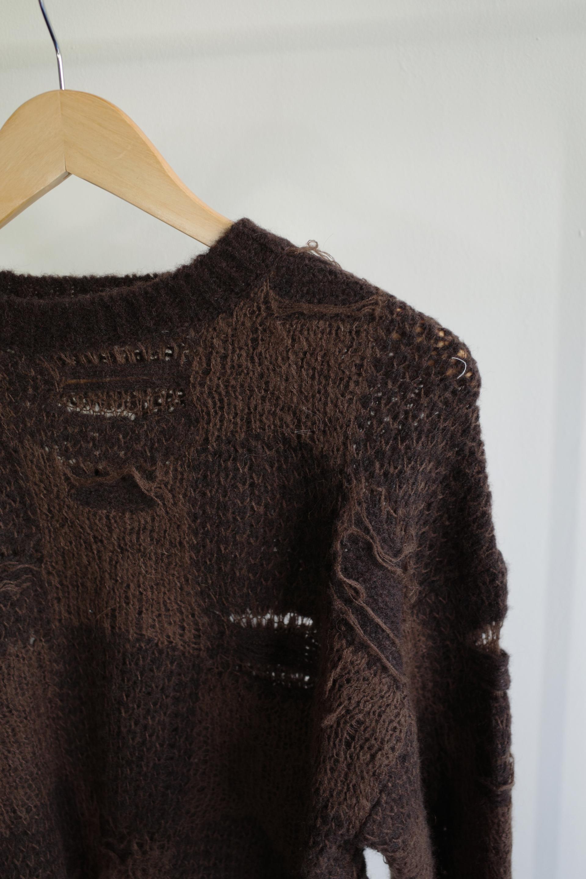 섹션별로 다른 밀도로 짜인 니팅과, 데미지 디테일이 배치되어 독특하고 특별합니다. 그렇지만 절대 과하지 않아요. 딱 포인트 스웨터로 연출하기 좋은 정도라 적극 추천드립니다.
