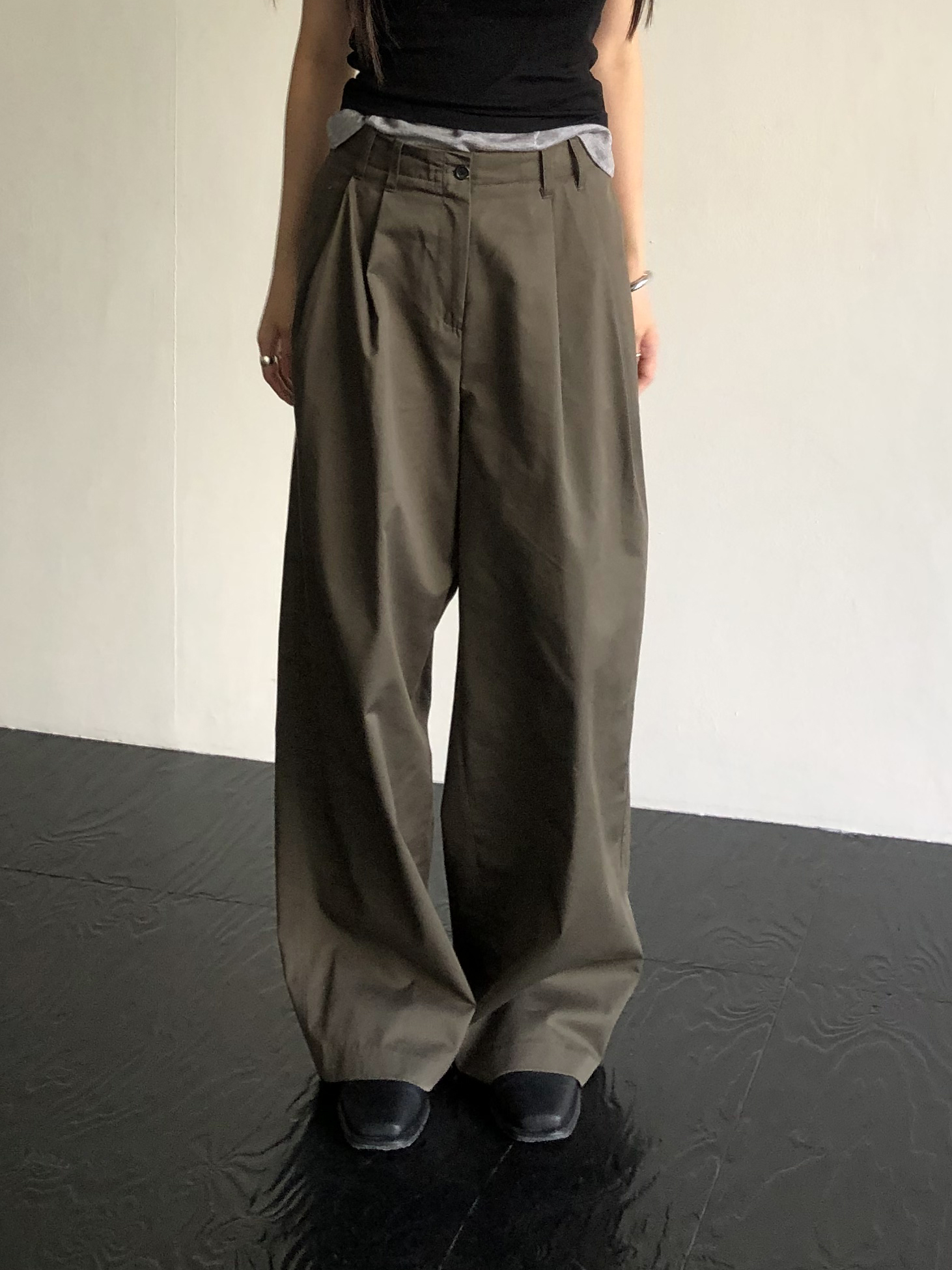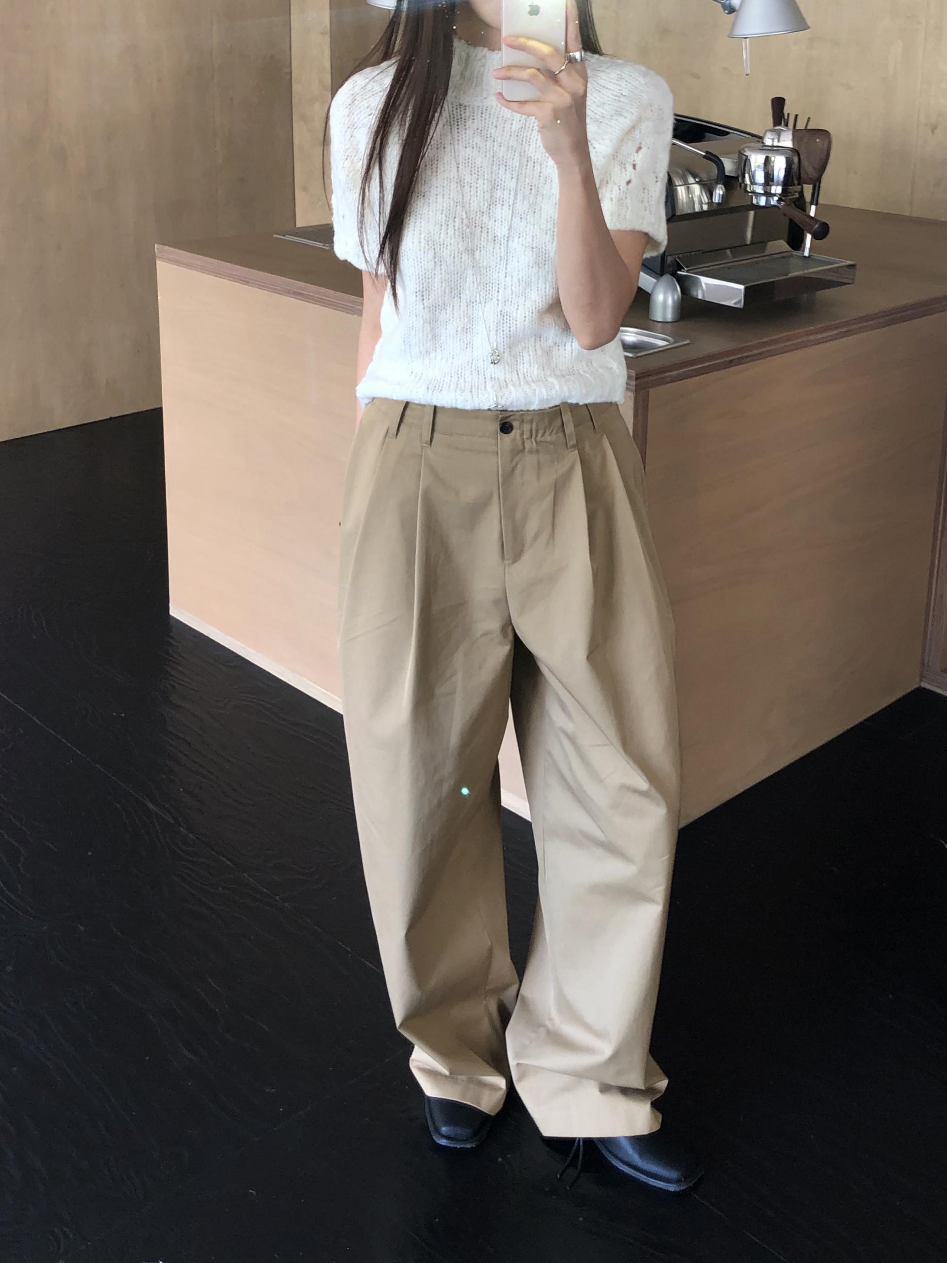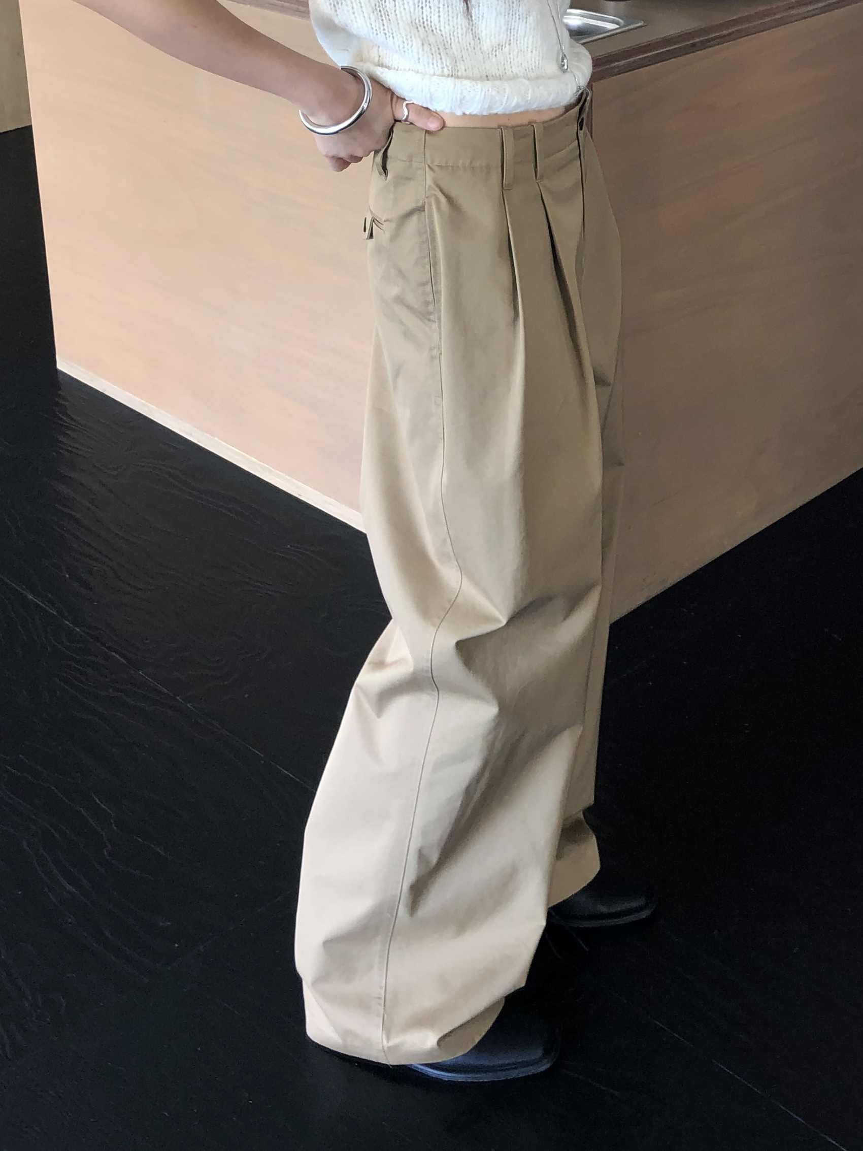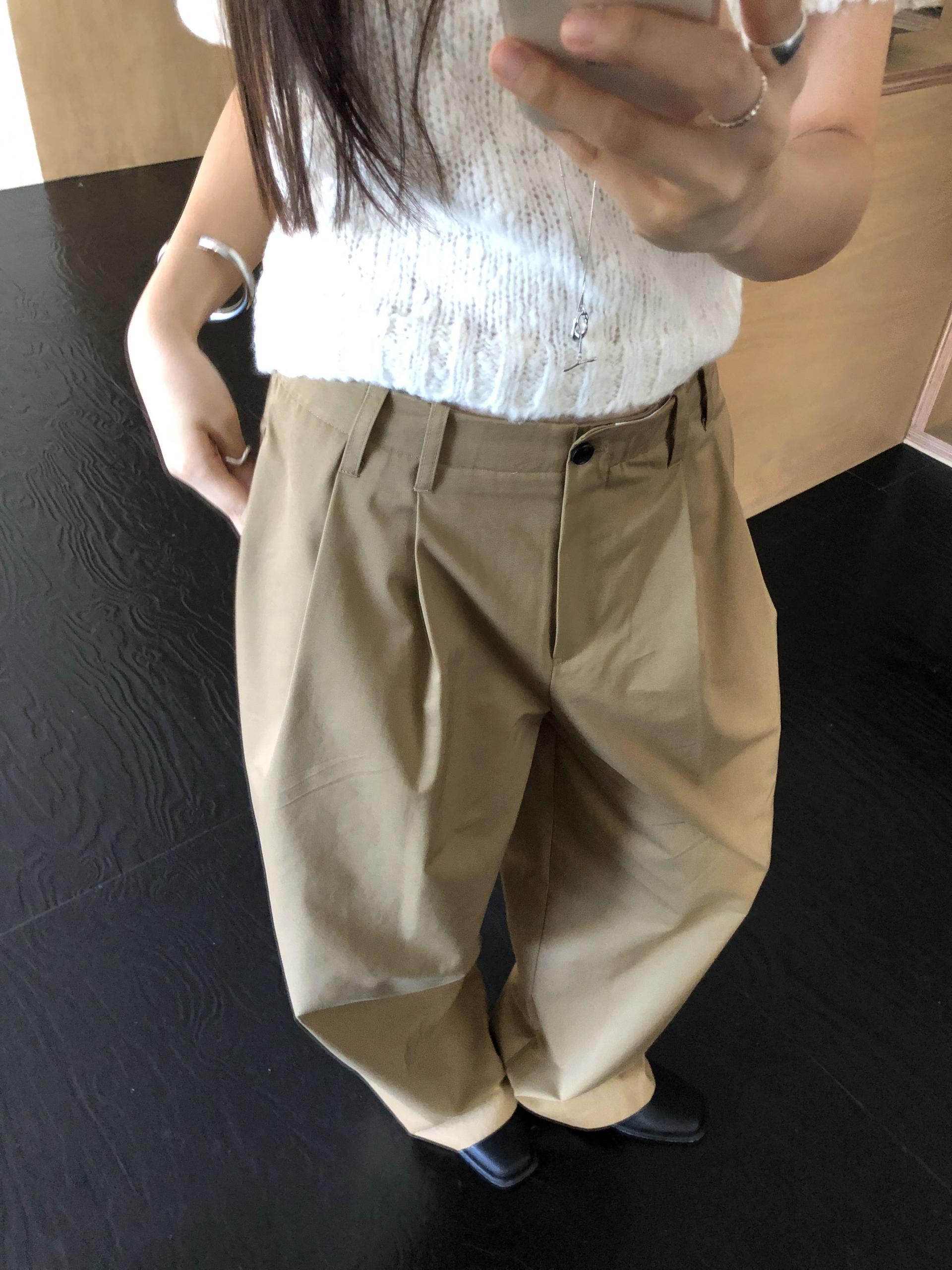 원단 자체는 두껍지 않은 코튼+나일론 혼방으로 부드럽고 매끈하면서 내추럴한 느낌을 줍니다. 100 코튼보다는 구김도 덜하고 착용감도 좋아요. 두개의 핀턱 디테일이 있으며 와이드한 실루엣에서 멋짐이 느껴집니다.