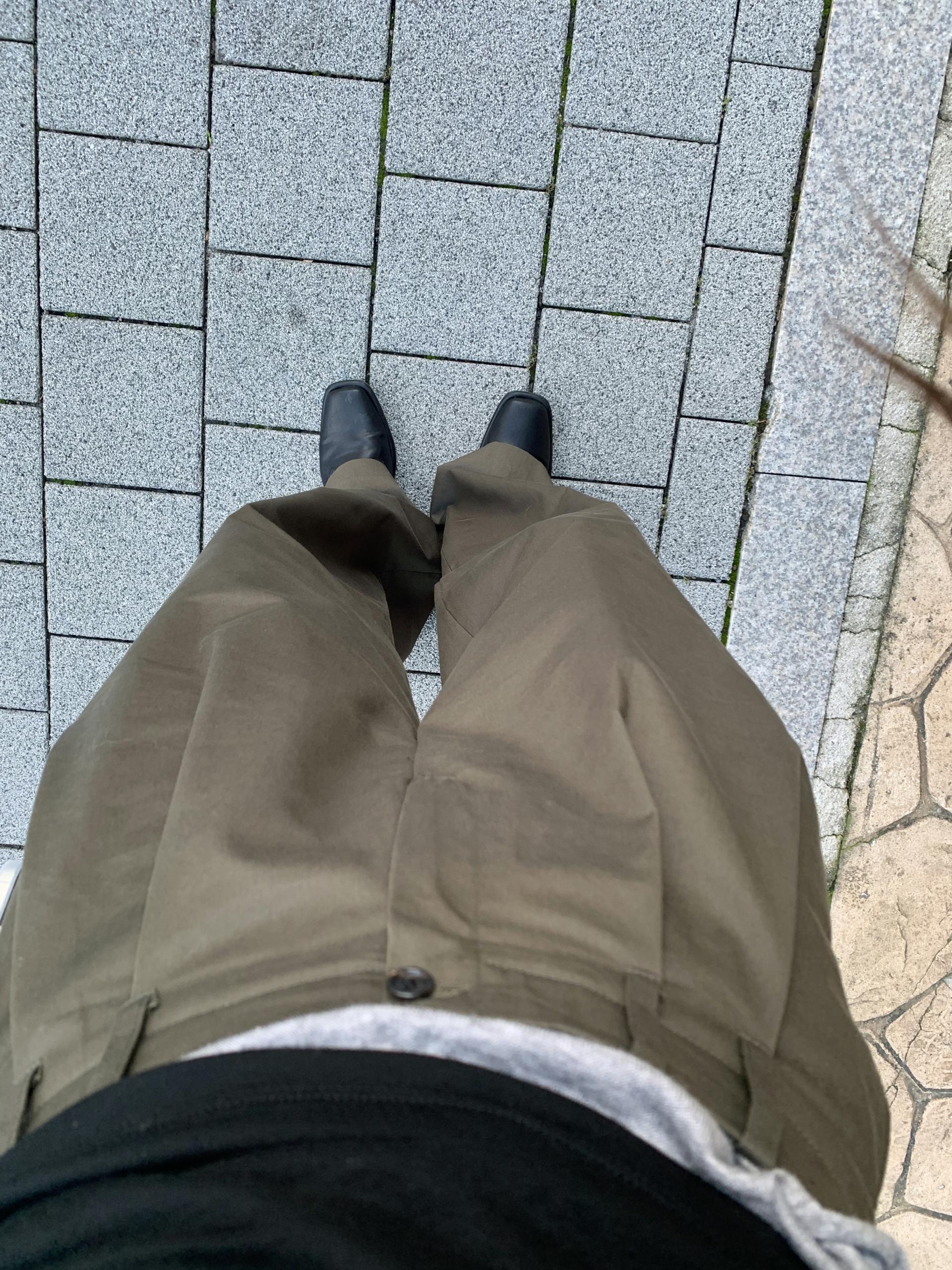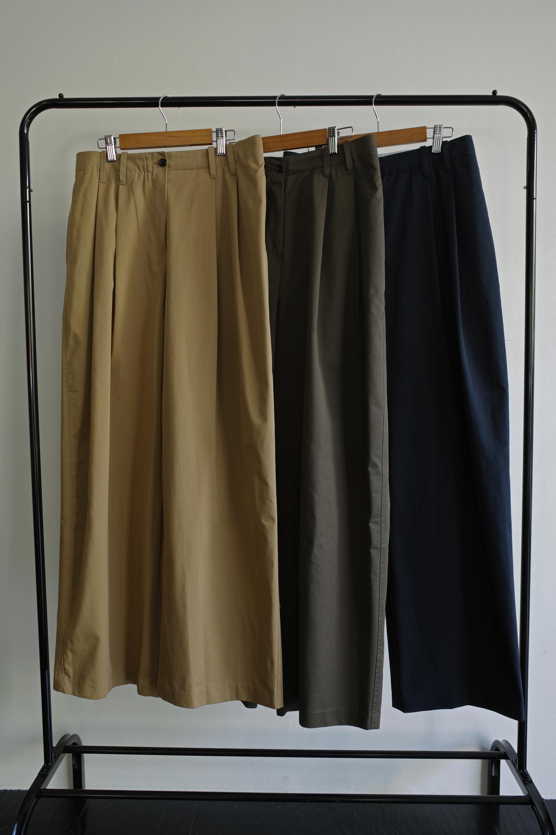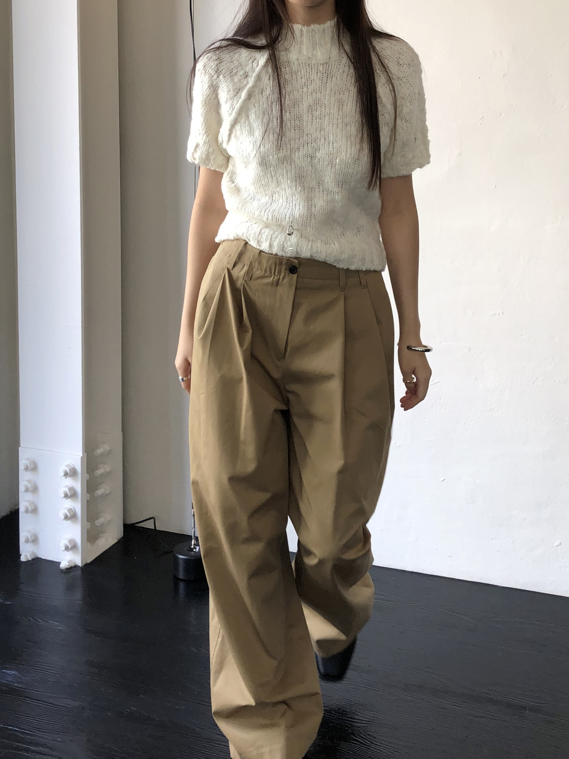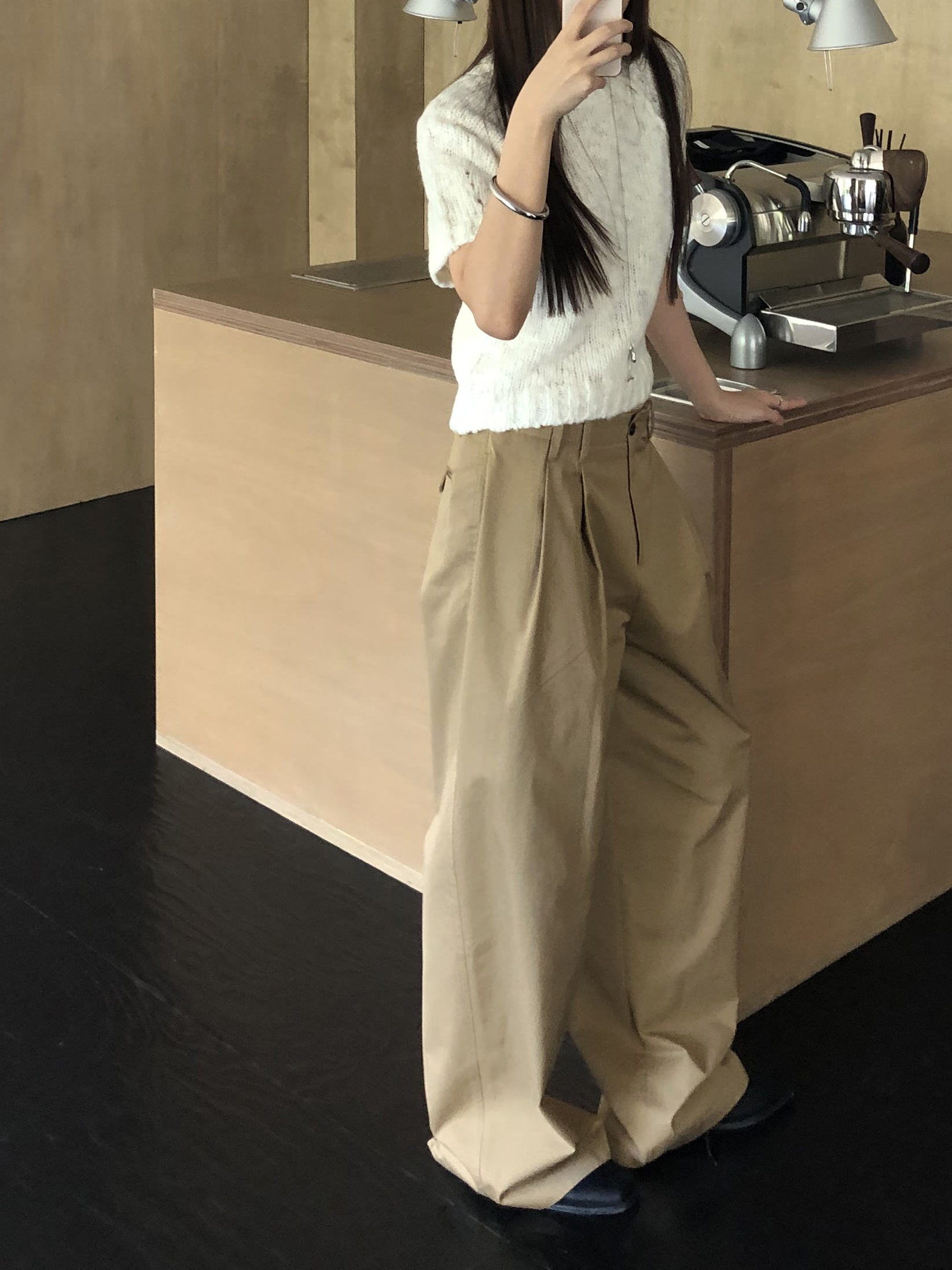 원단 자체는 두껍지 않은 코튼+나일론 혼방으로 부드럽고 매끈하면서 내추럴한 느낌을 줍니다. 100 코튼보다는 구김도 덜하고 착용감도 좋아요. 두개의 핀턱 디테일이 있으며 와이드한 실루엣에서 멋짐이 느껴집니다.