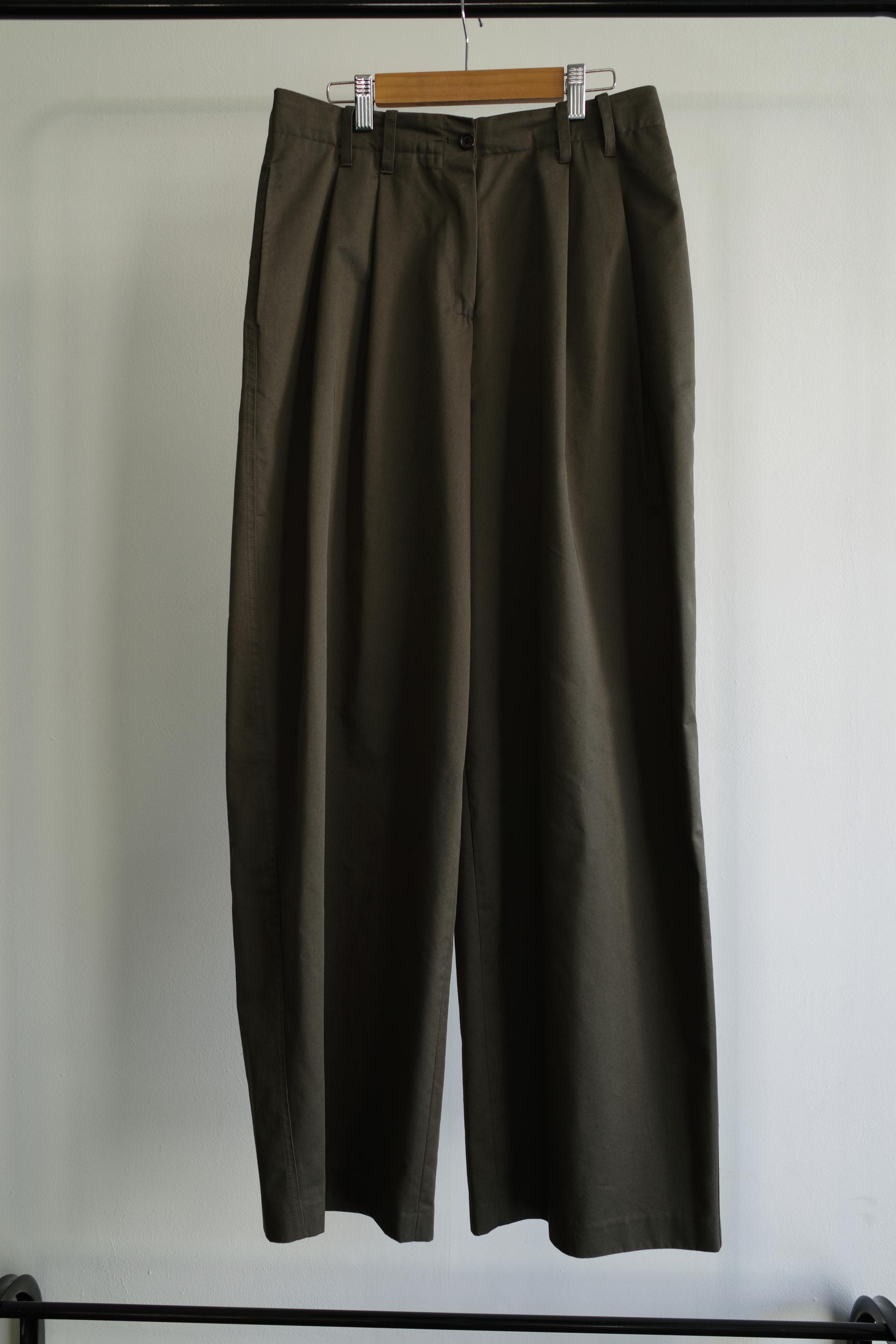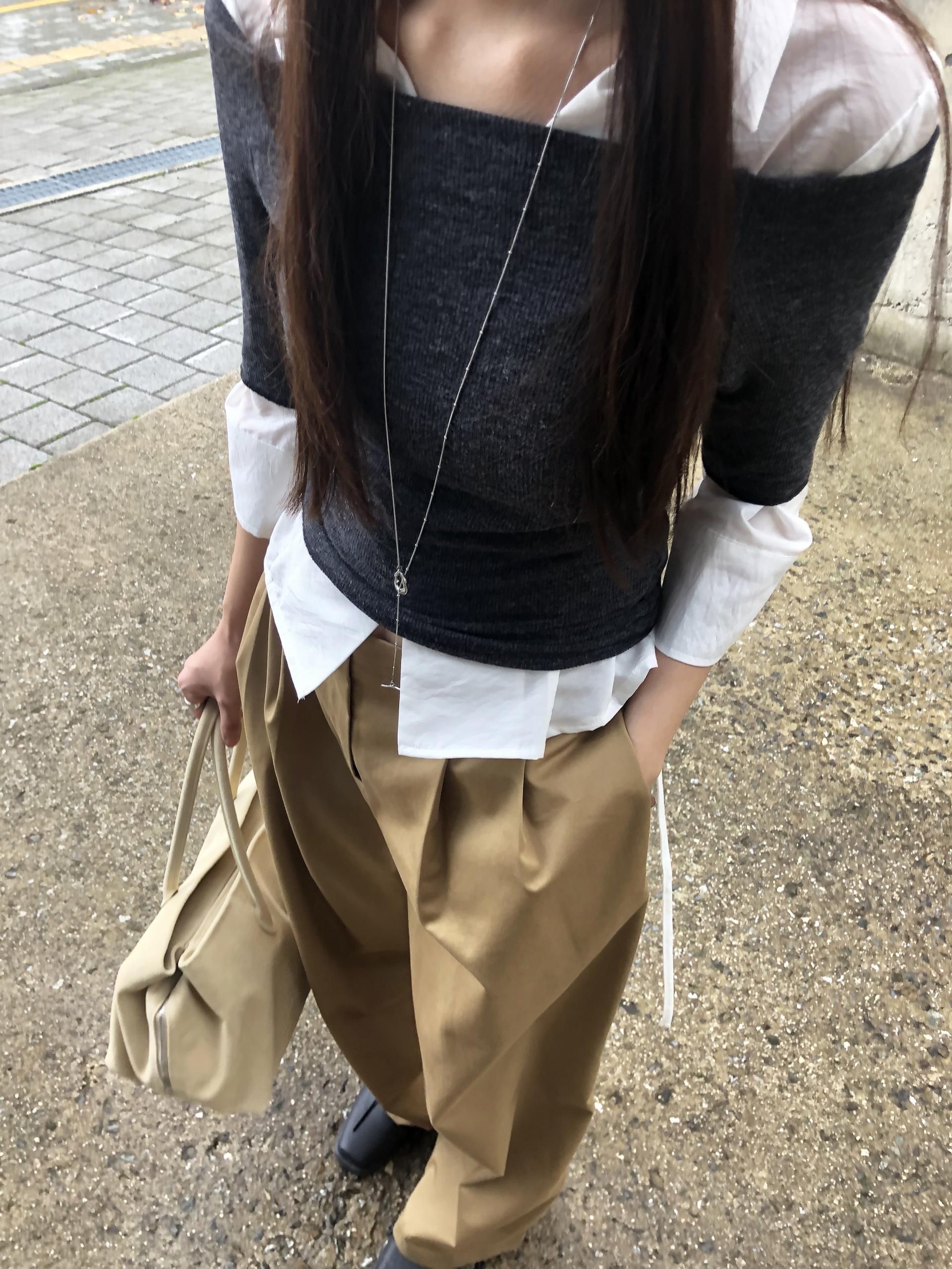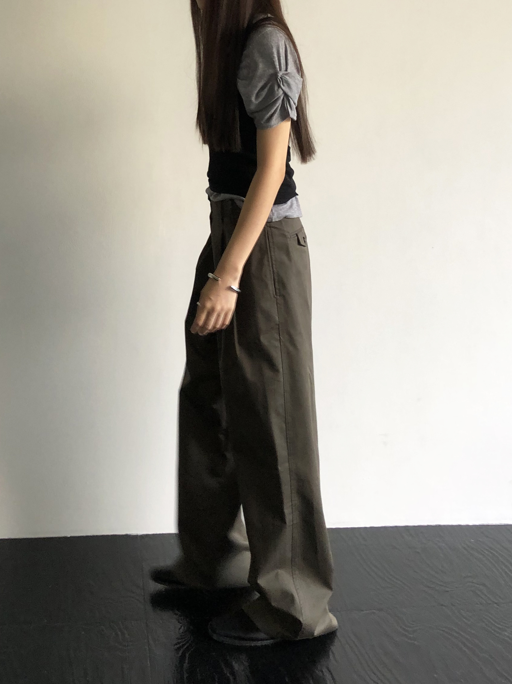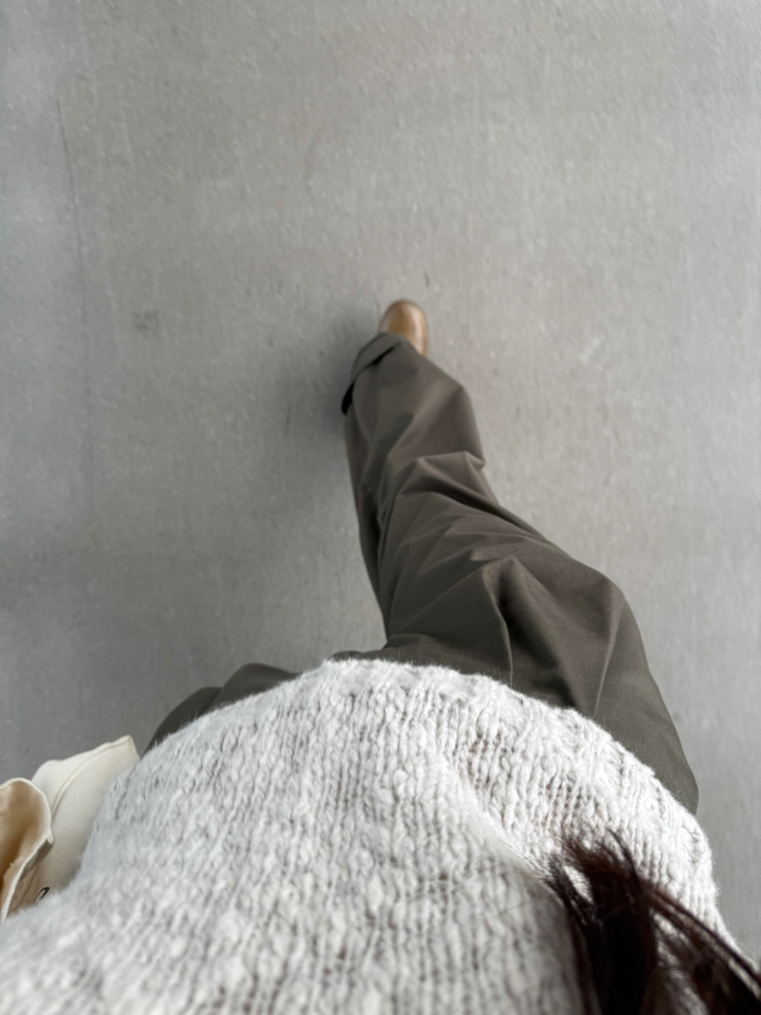 원단 자체는 두껍지 않은 코튼+나일론 혼방으로 부드럽고 매끈하면서 내추럴한 느낌을 줍니다. 100 코튼보다는 구김도 덜하고 착용감도 좋아요. 두개의 핀턱 디테일이 있으며 와이드한 실루엣에서 멋짐이 느껴집니다.