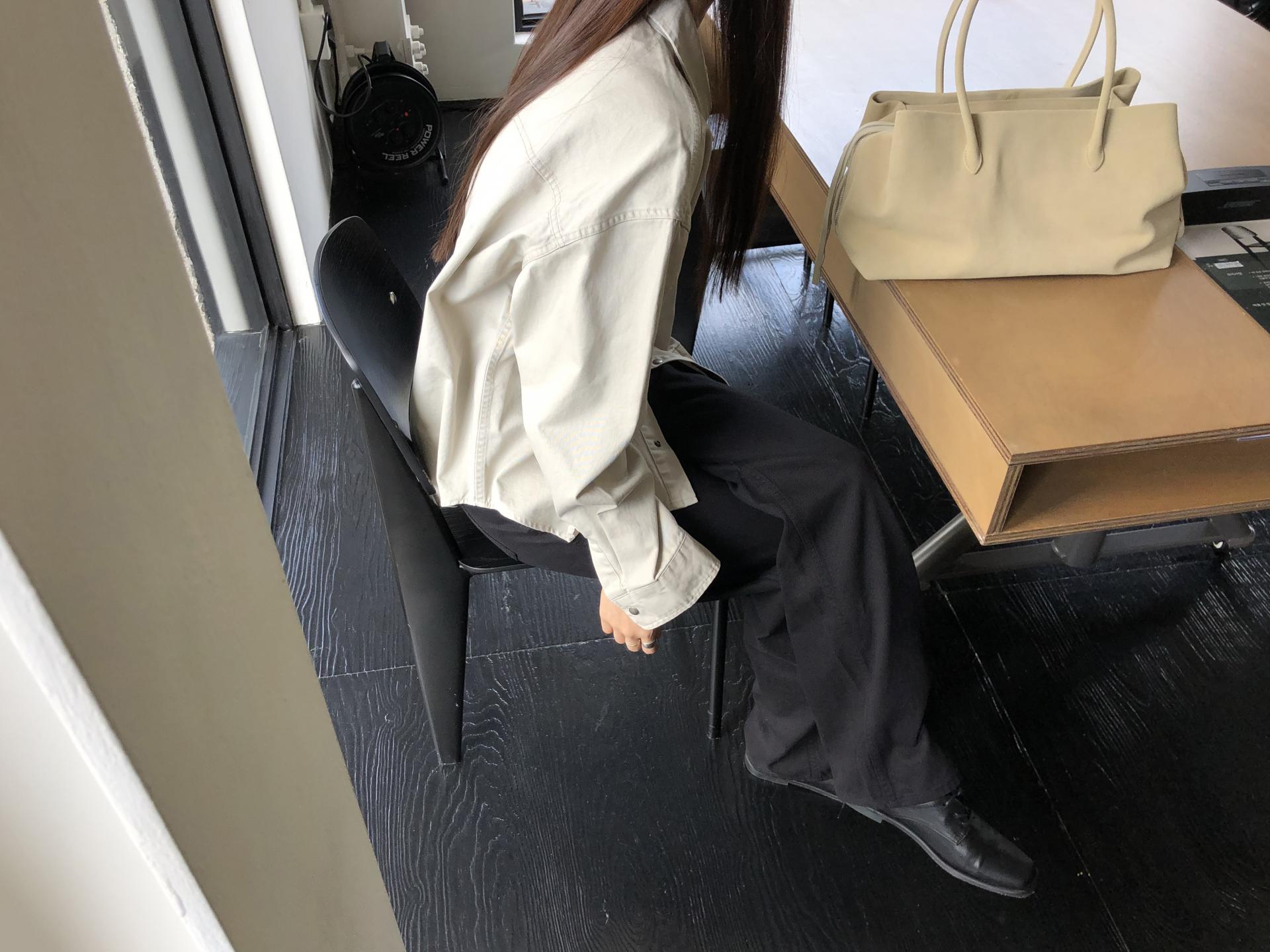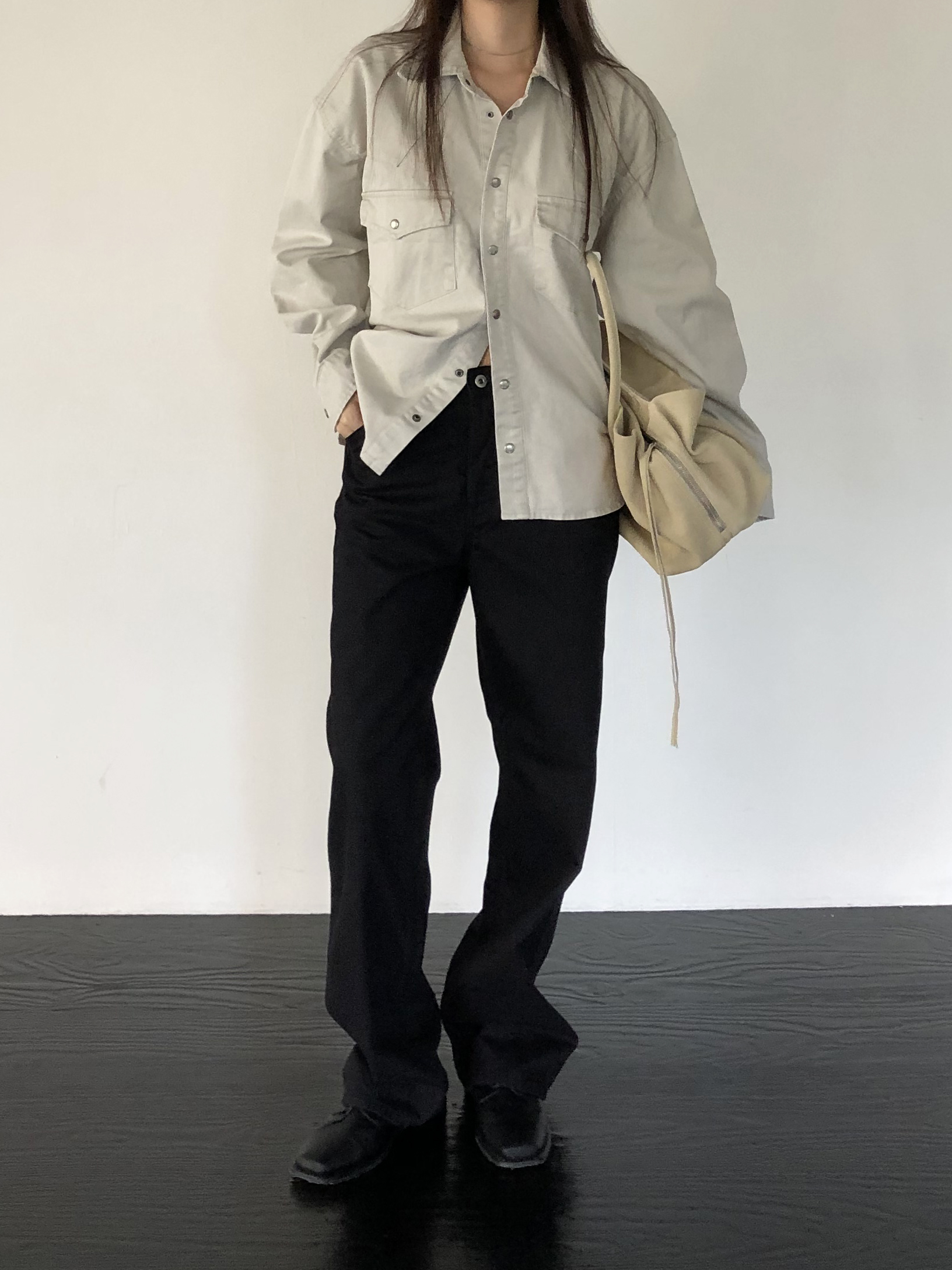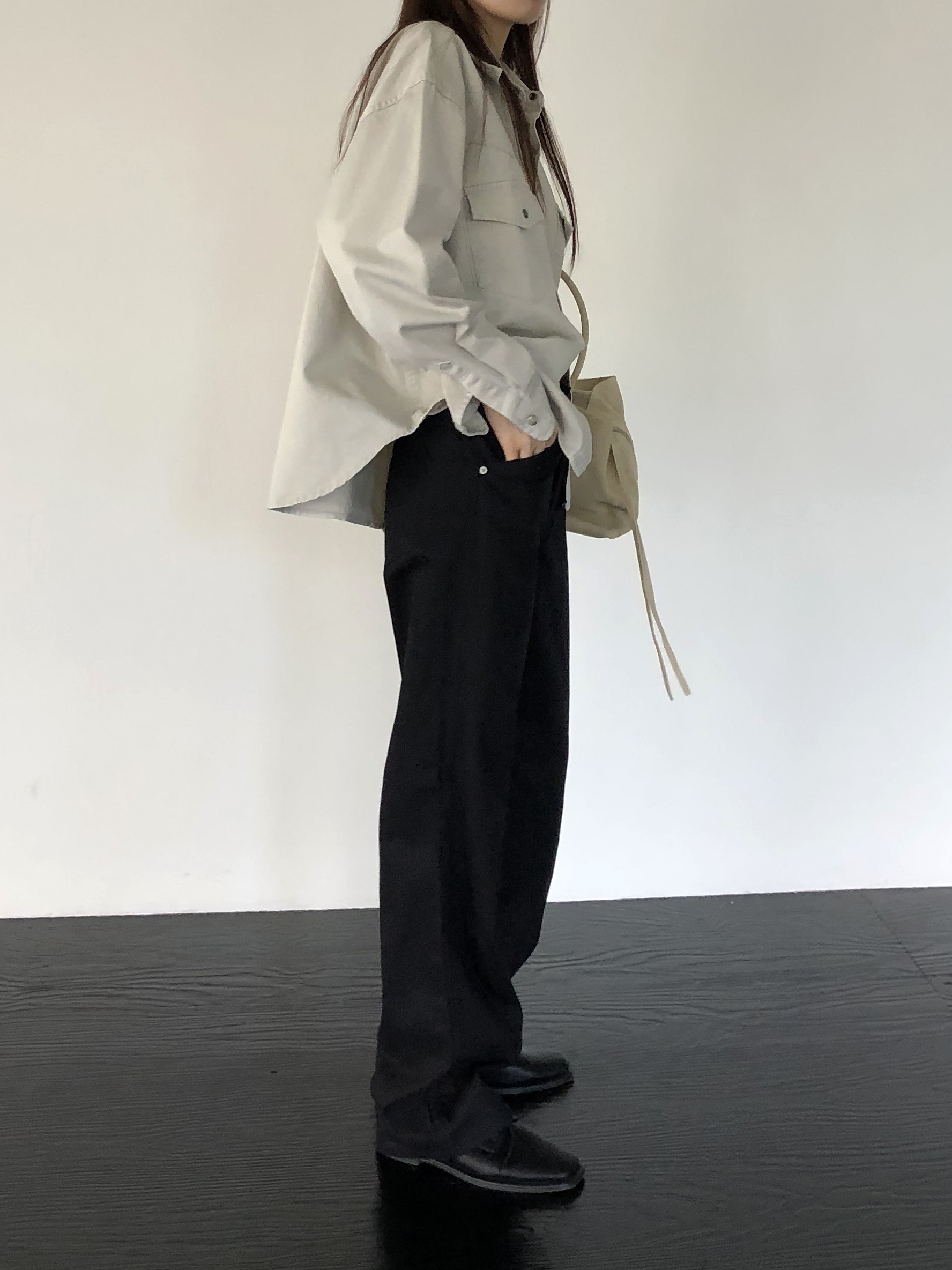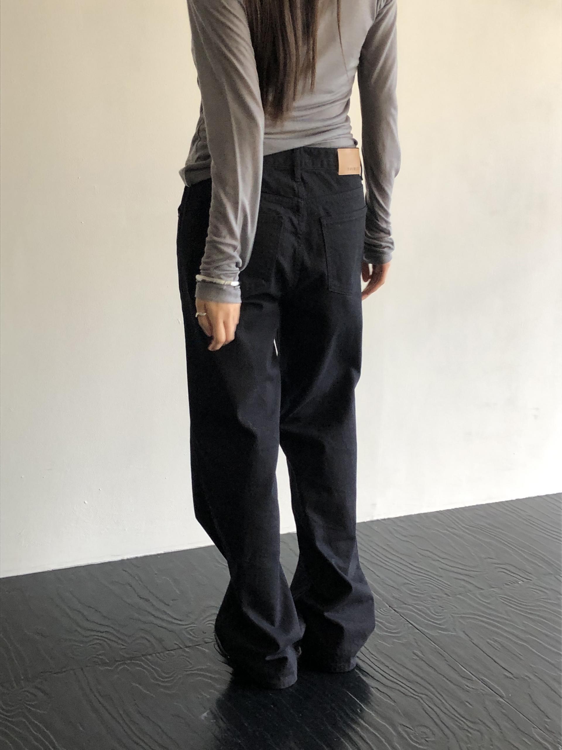 약간 루즈하게 스트레이트로 뚝 떨어지는 핏입니다. 탄탄한 코튼 원단인데요, 유심히 보면 골지 짜임이랍니다. 입체감이 느껴지진 않고 플랫해요. 그래서 시크한 무드를 해치지 않습니다.