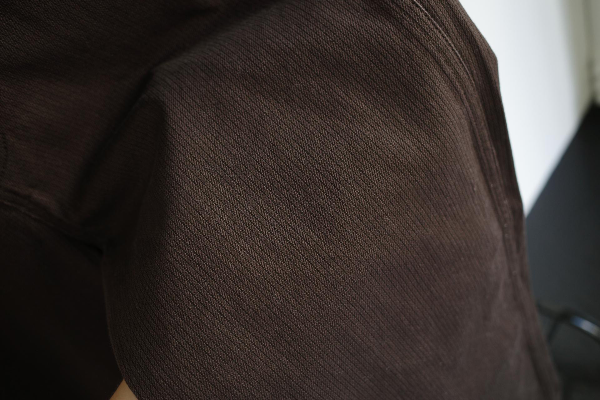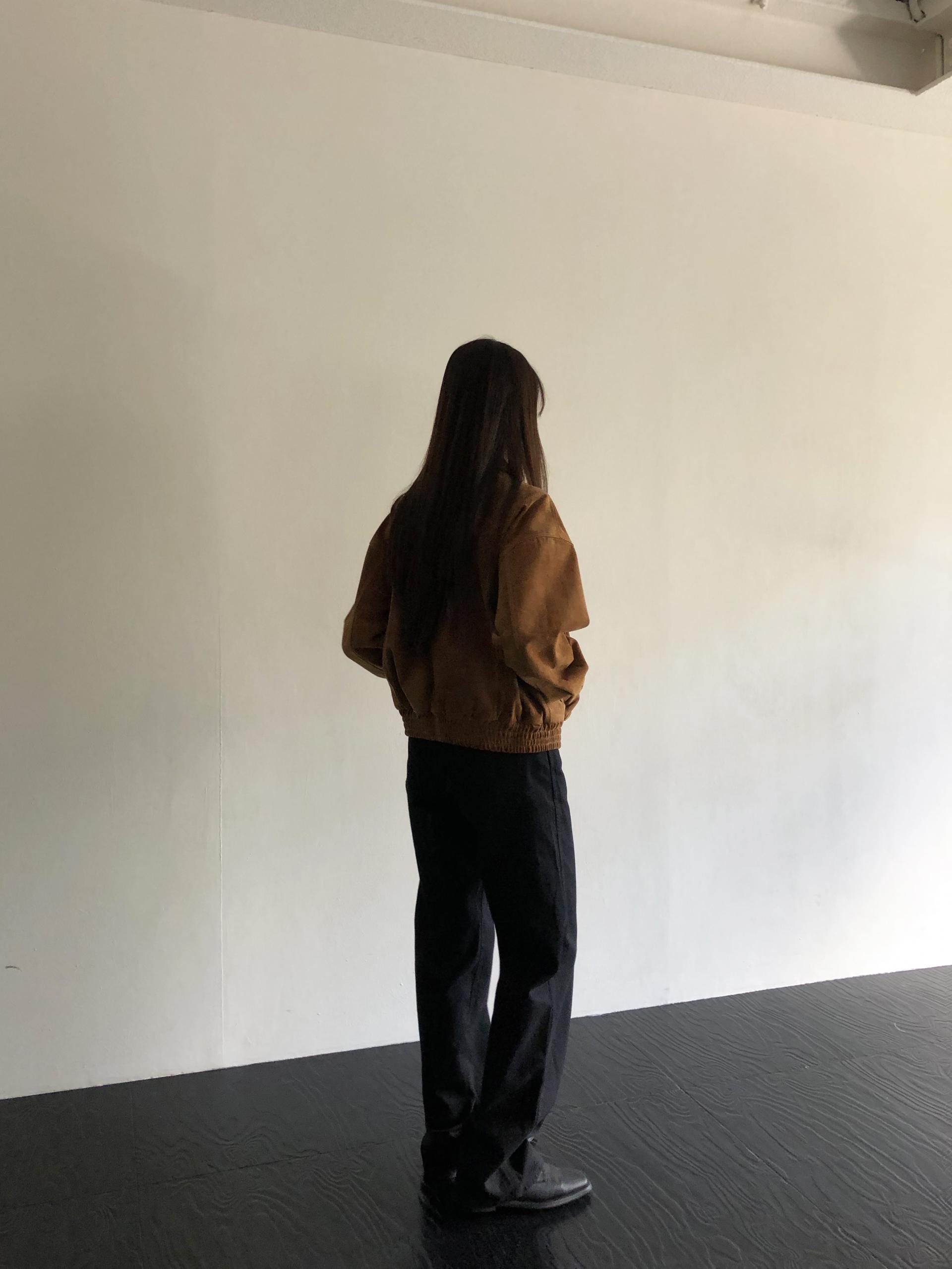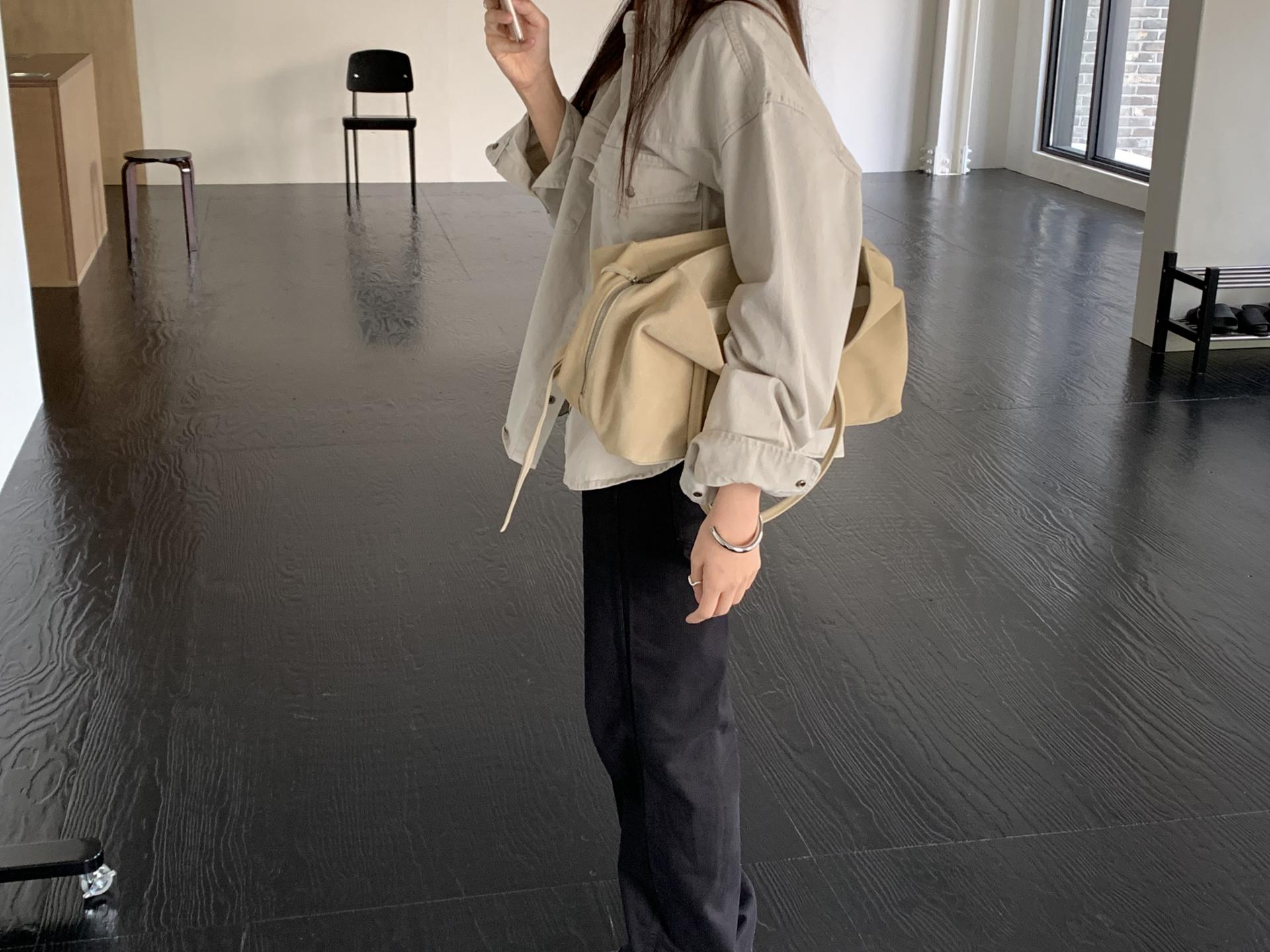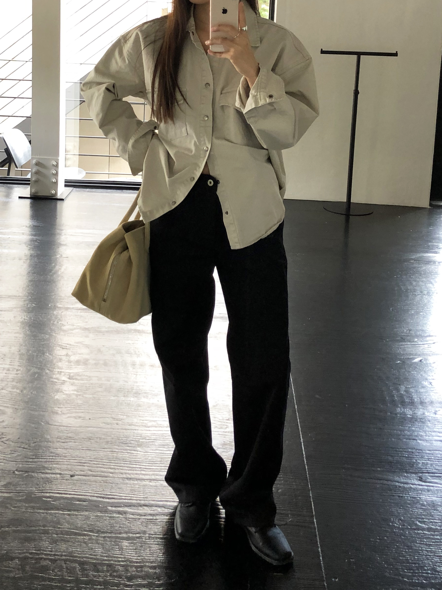 약간 루즈하게 스트레이트로 뚝 떨어지는 핏입니다. 탄탄한 코튼 원단인데요, 유심히 보면 골지 짜임이랍니다. 입체감이 느껴지진 않고 플랫해요. 그래서 시크한 무드를 해치지 않습니다.